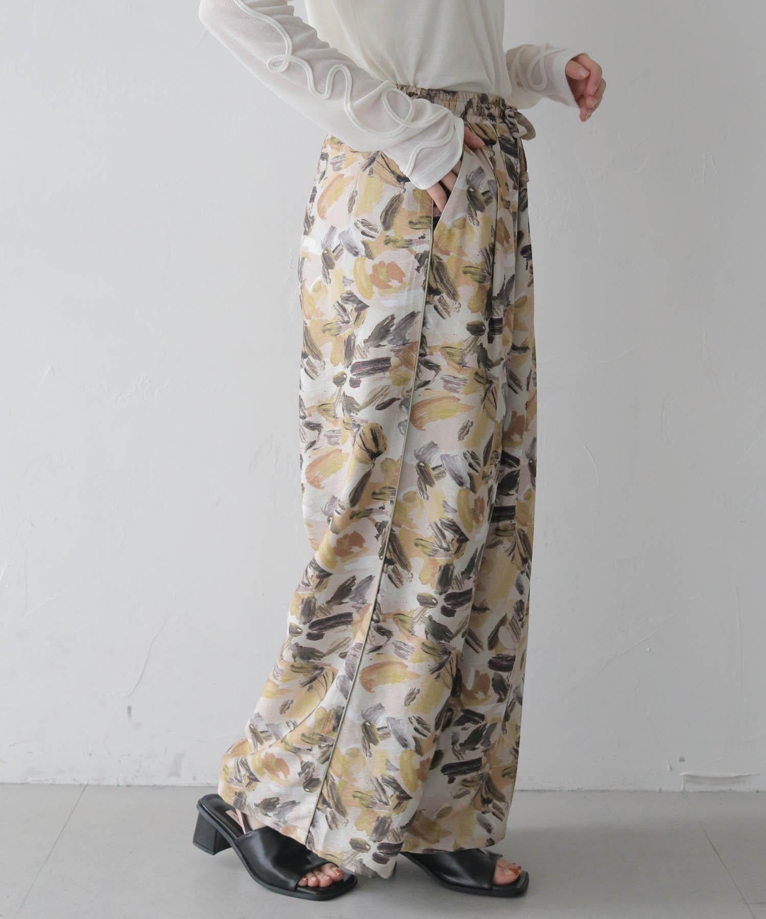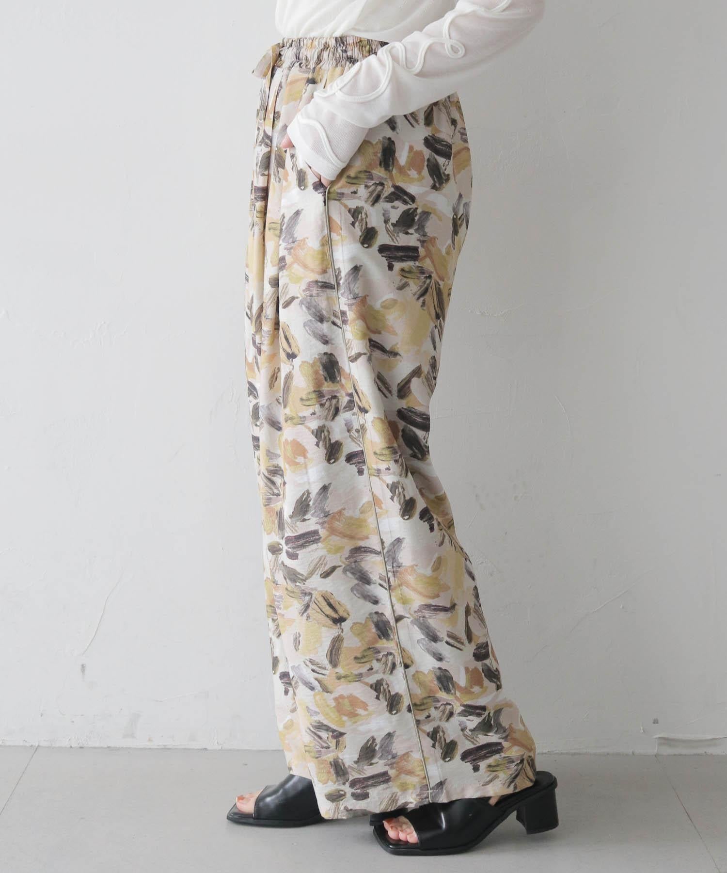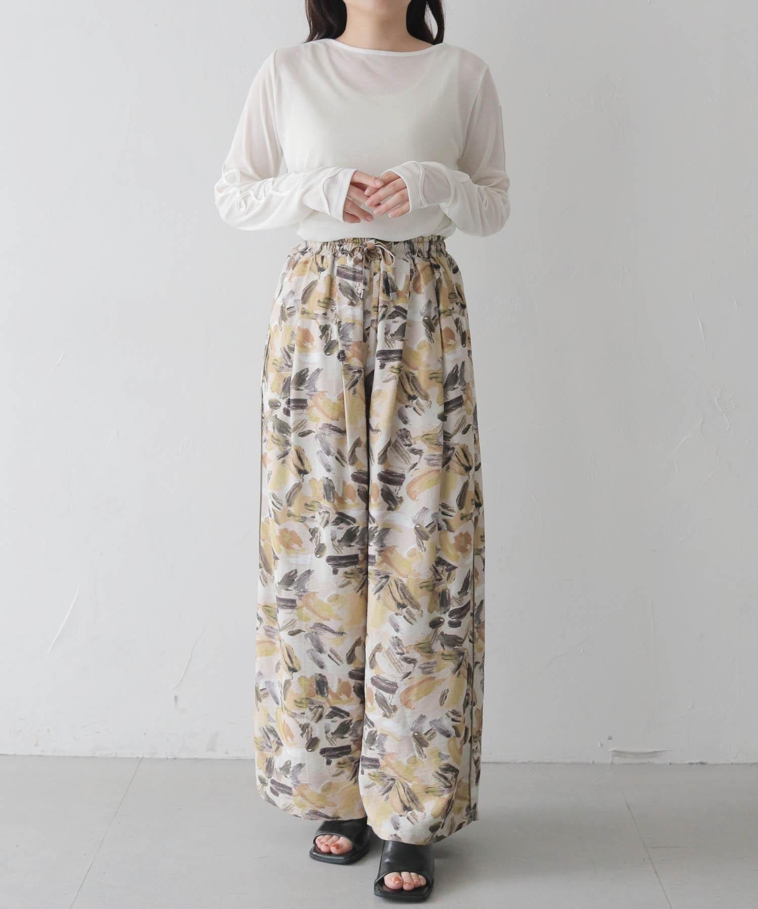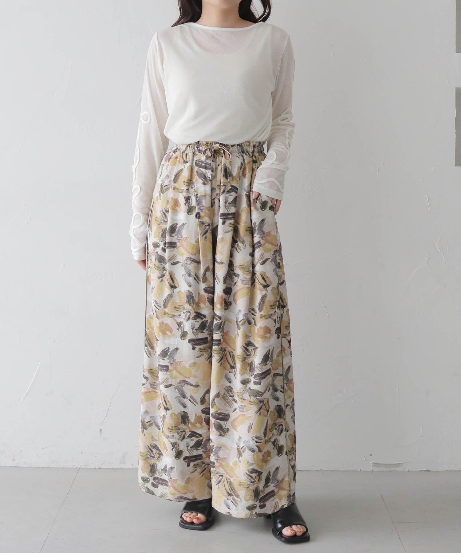アートのような大柄のニュアンス花柄が、都会的なムードを醸し出す主役級のワイドパンツ。