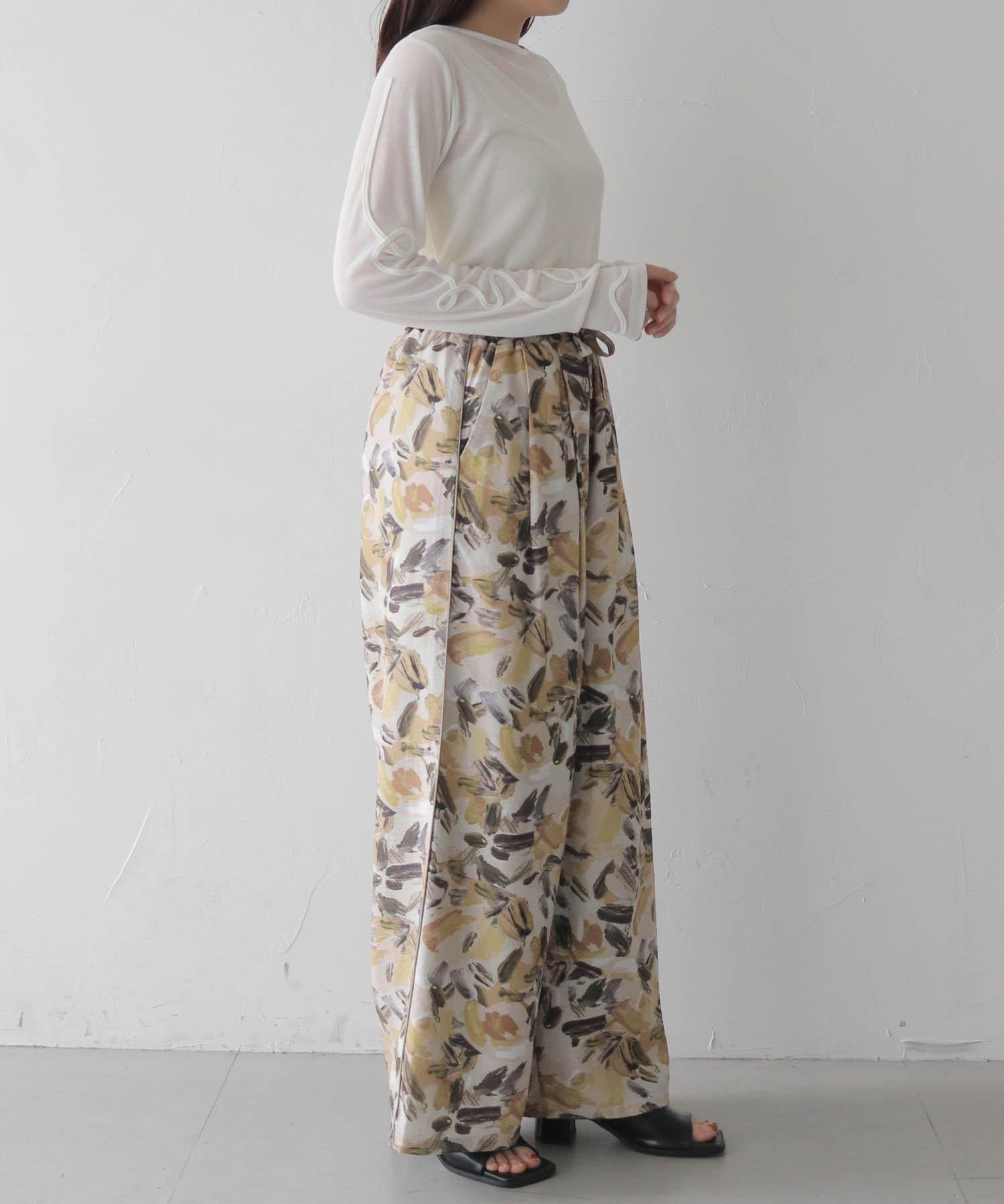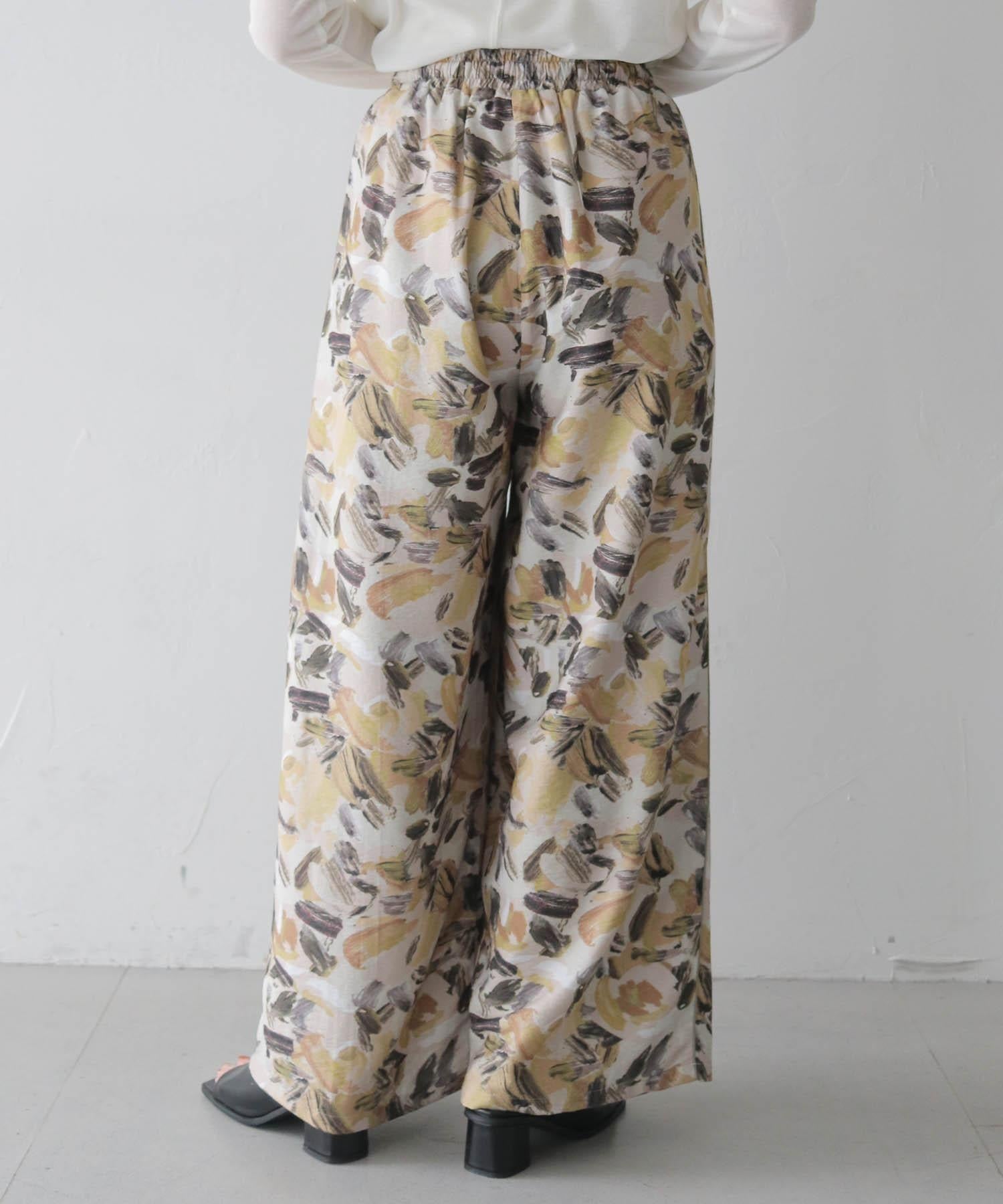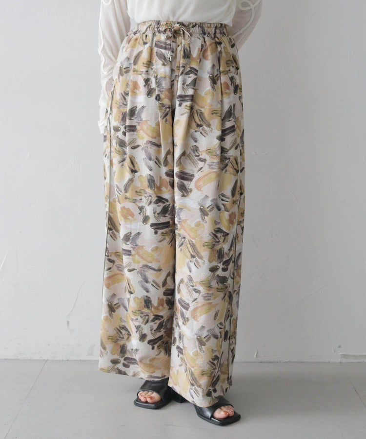 アートのような大柄のニュアンス花柄が、都会的なムードを醸し出す主役級のワイドパンツ。