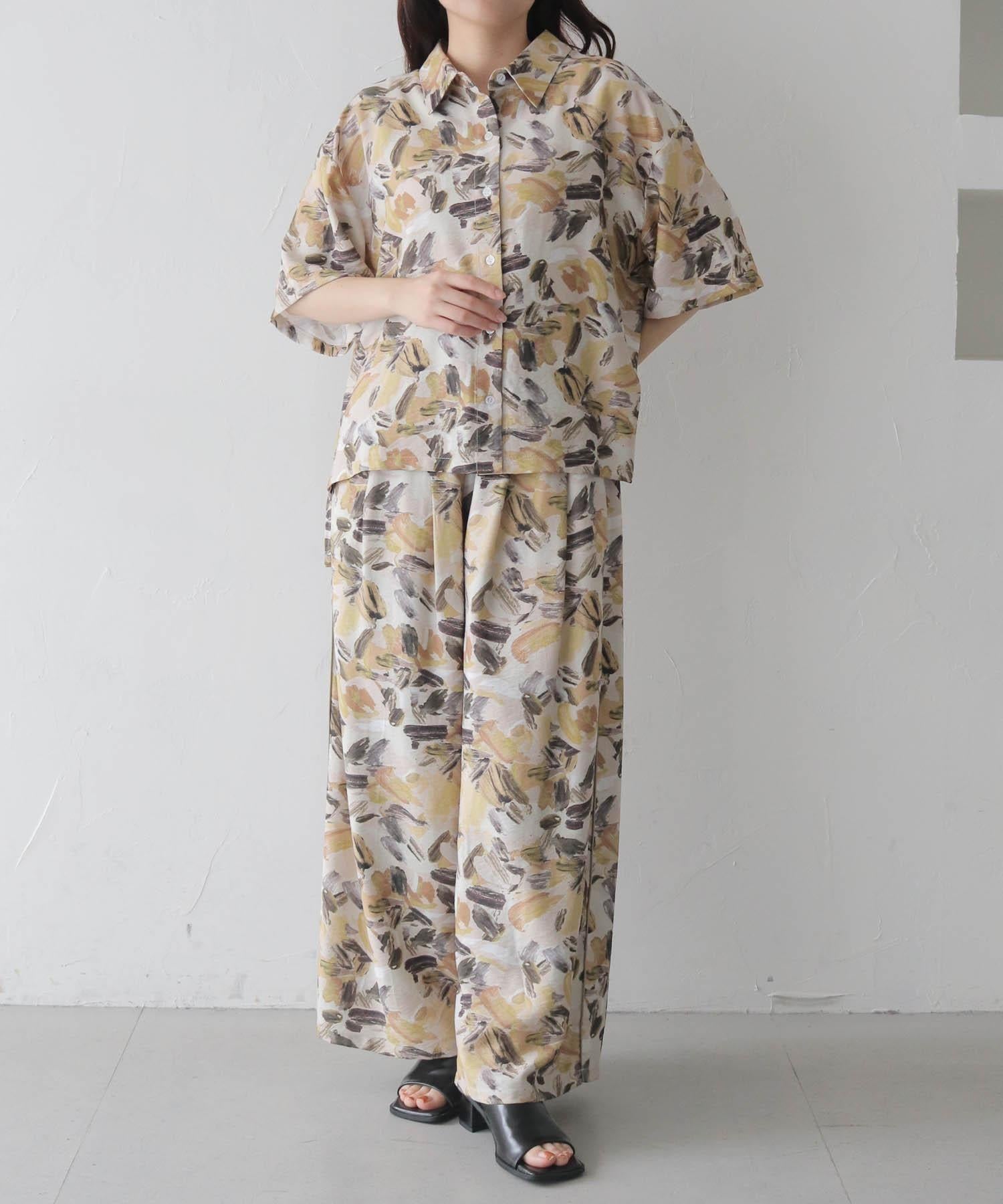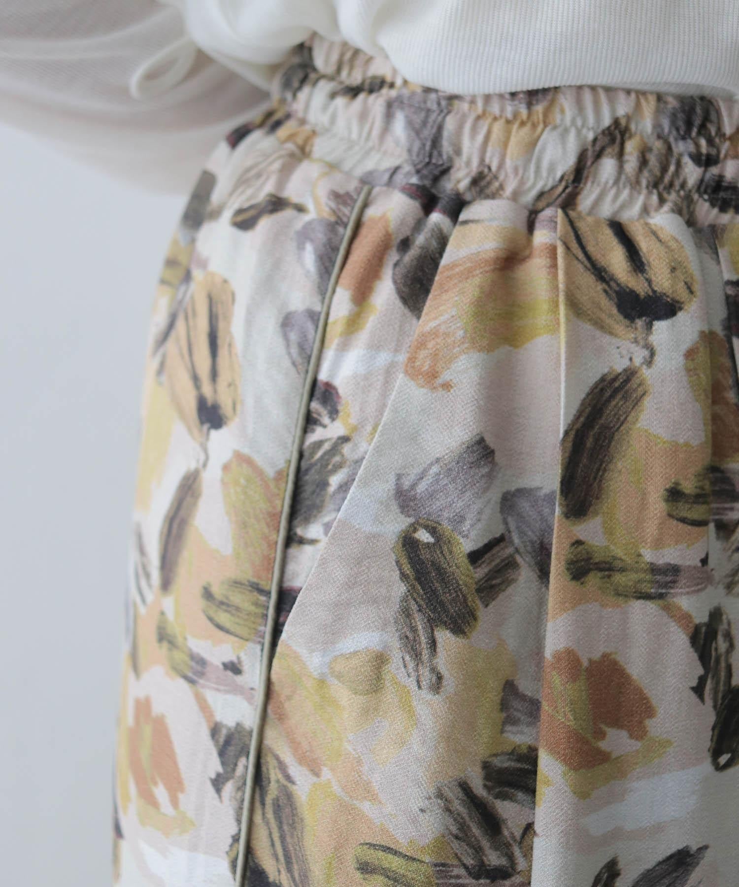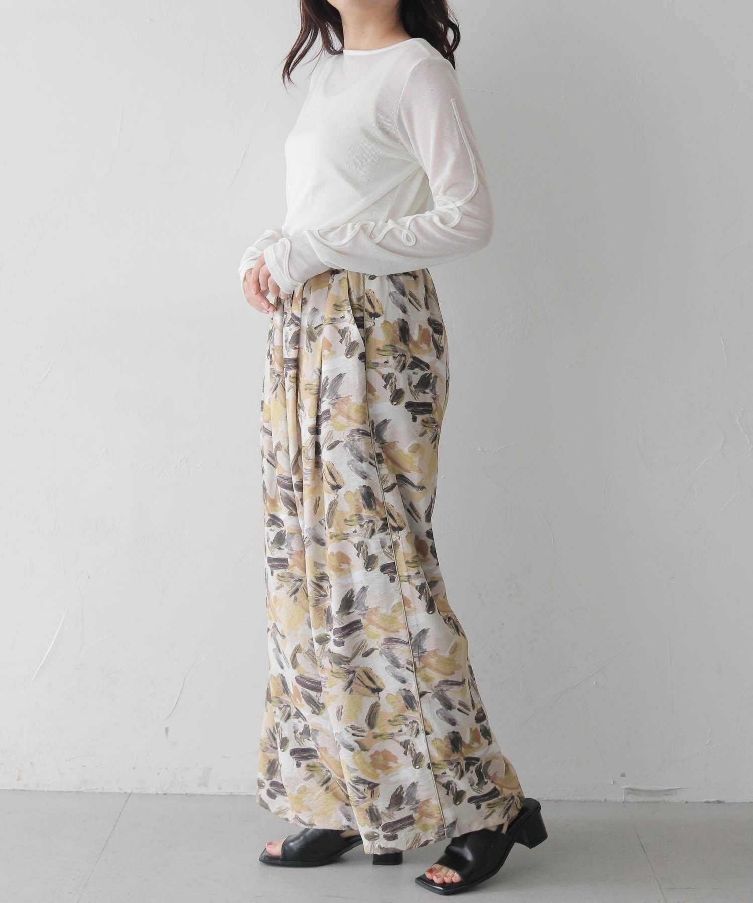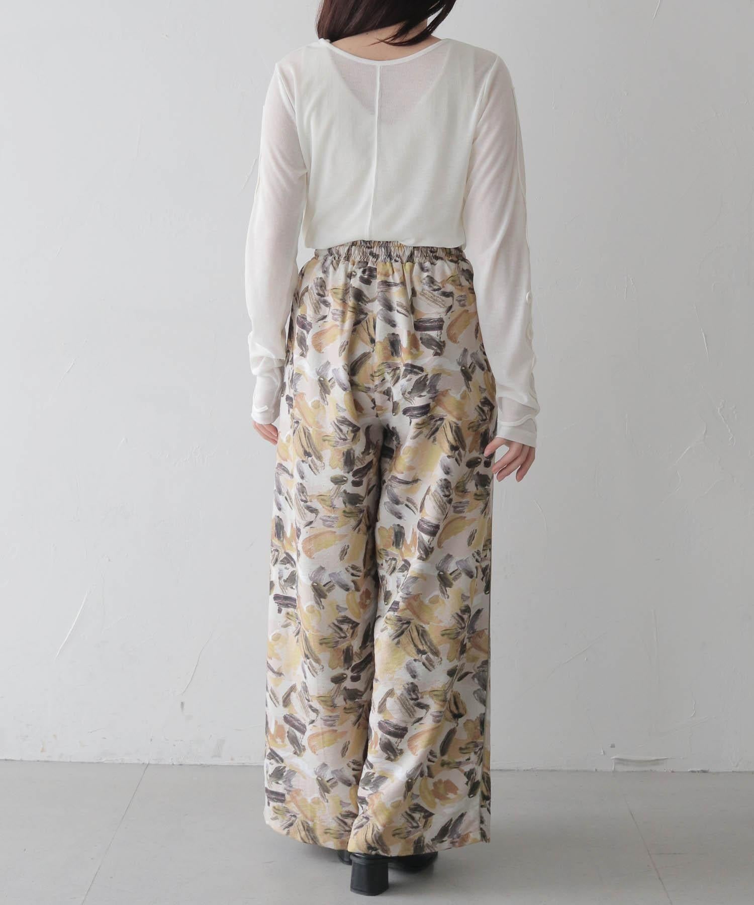 アートのような大柄のニュアンス花柄が、都会的なムードを醸し出す主役級のワイドパンツ。