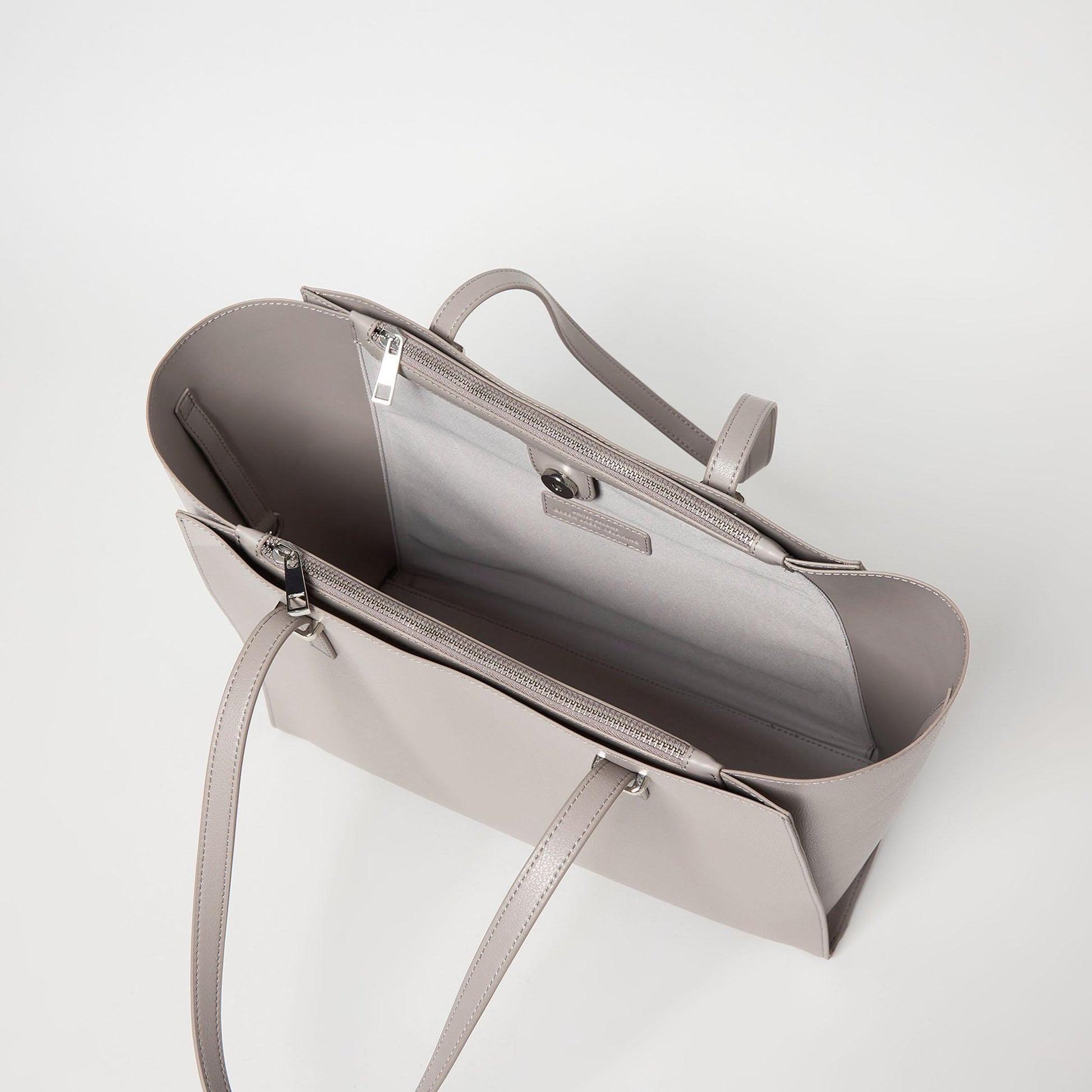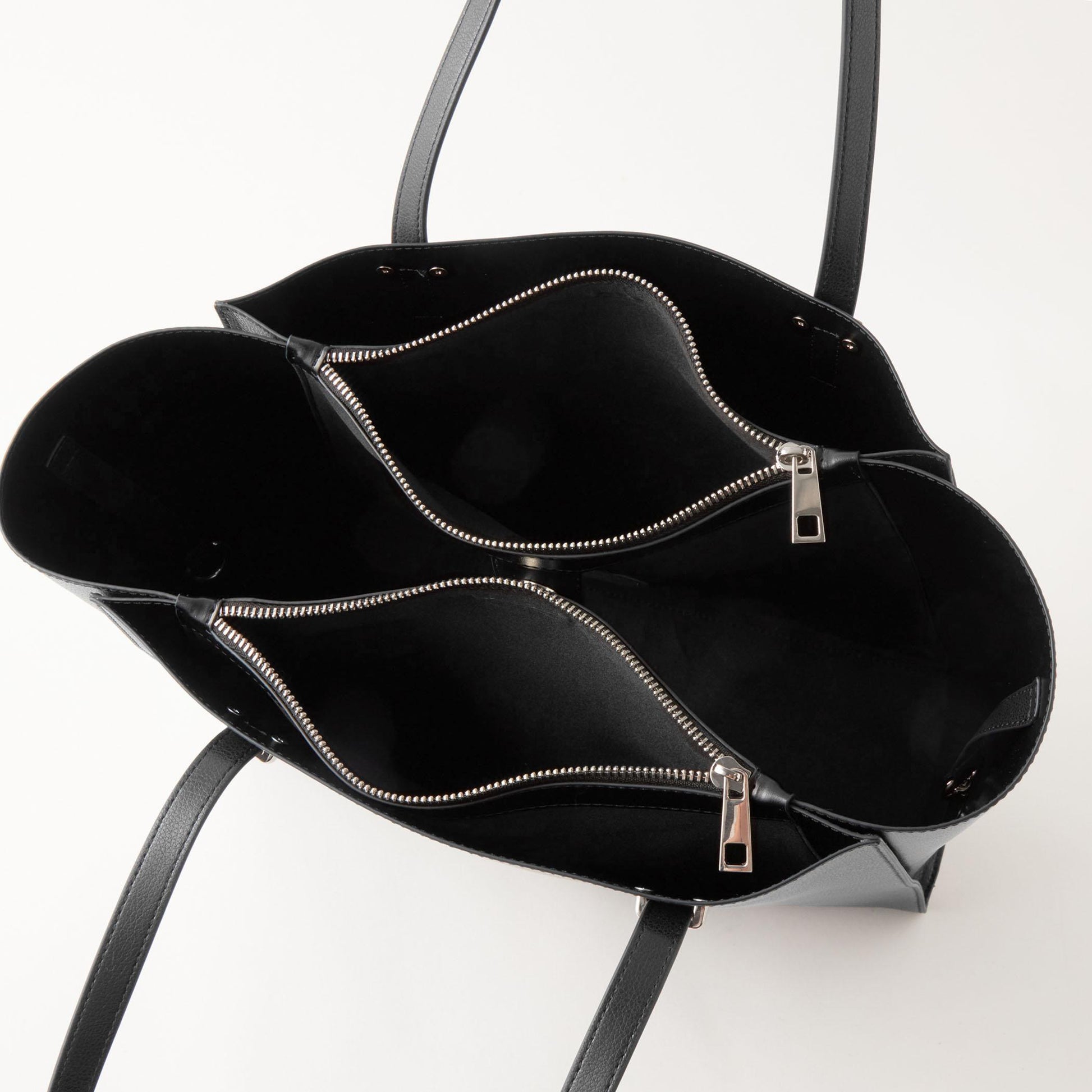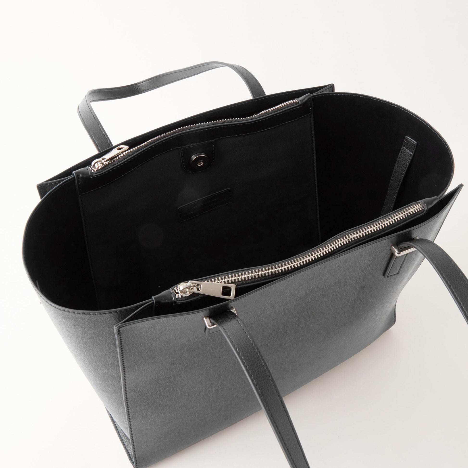 バッグ内側の金具を留めることで形状を変化させることができ、気分やスタイルで楽しめるのもポイント。