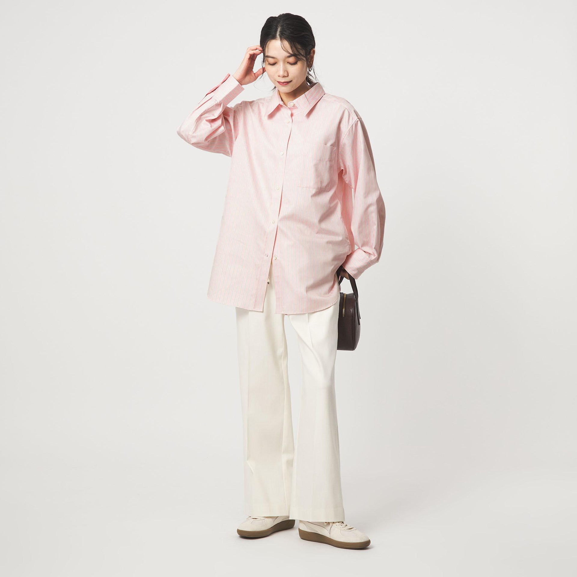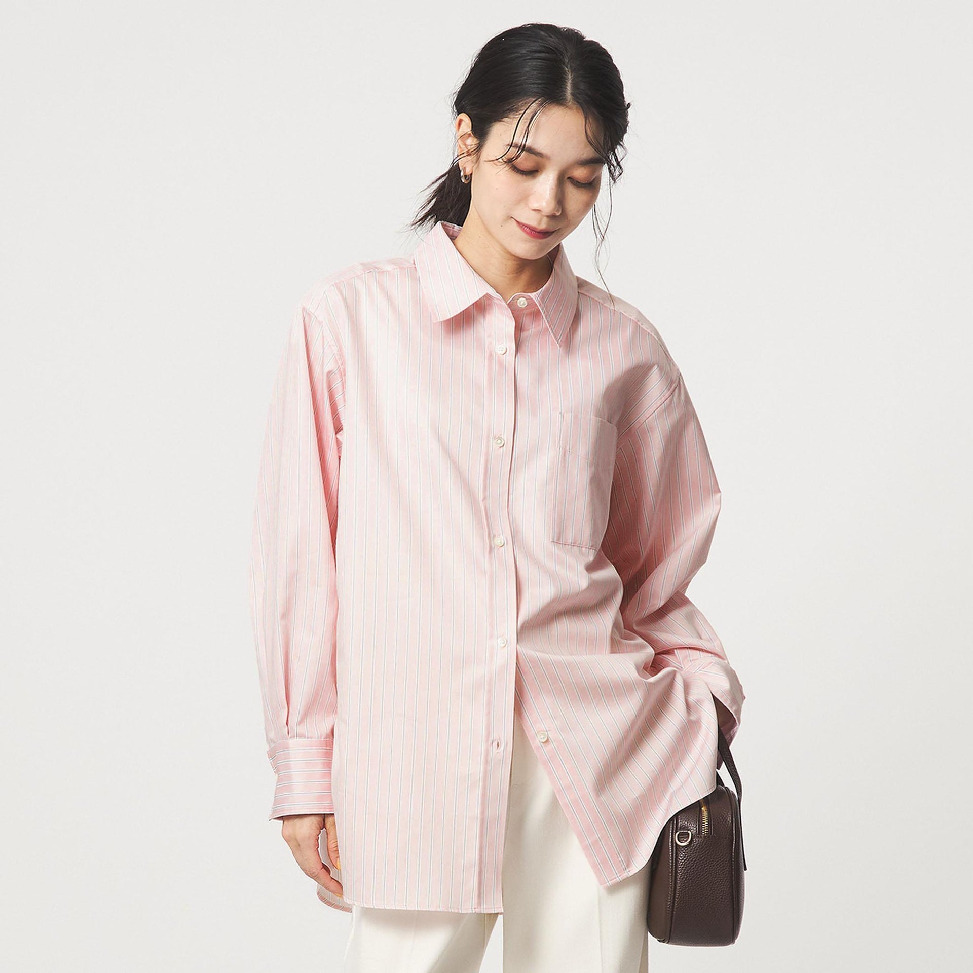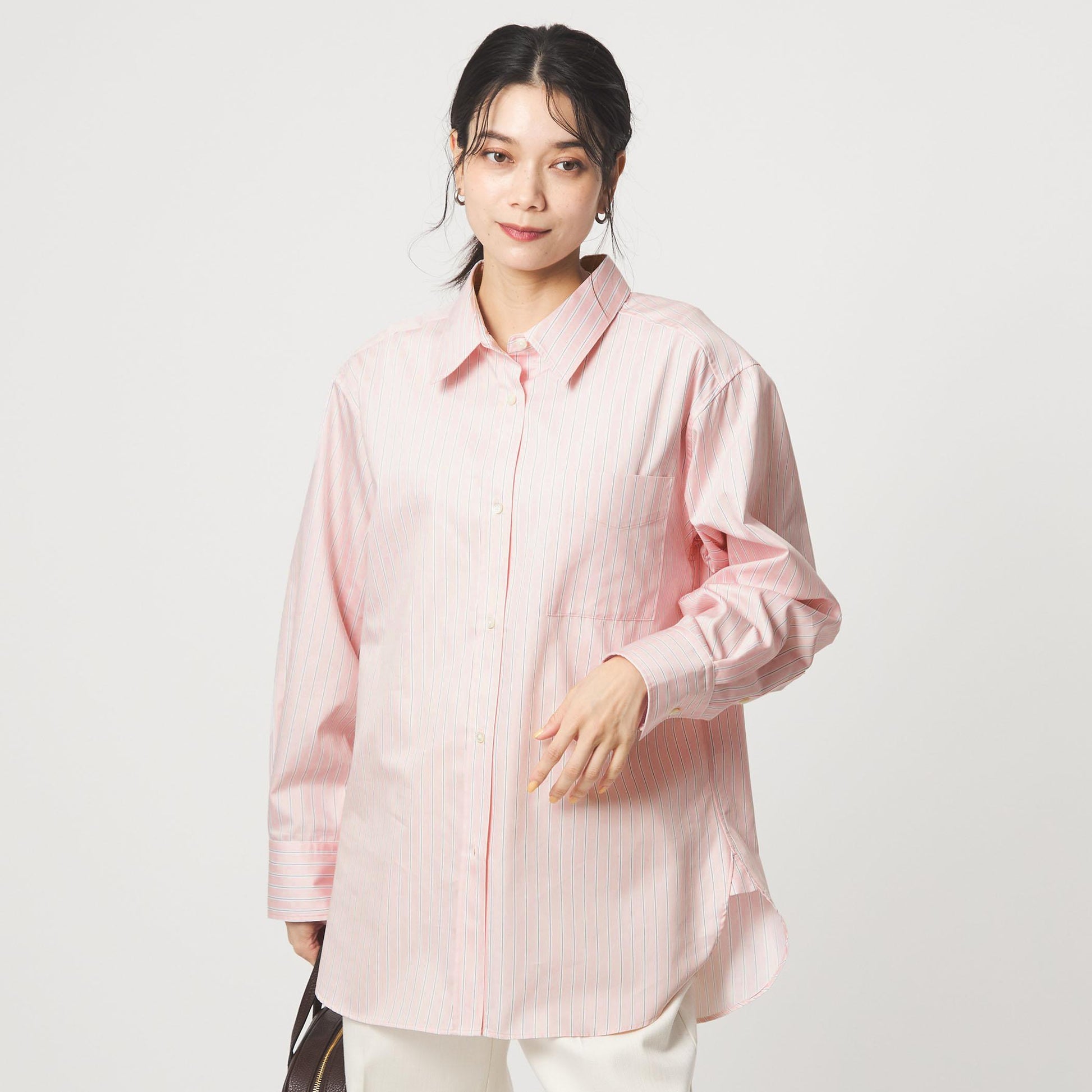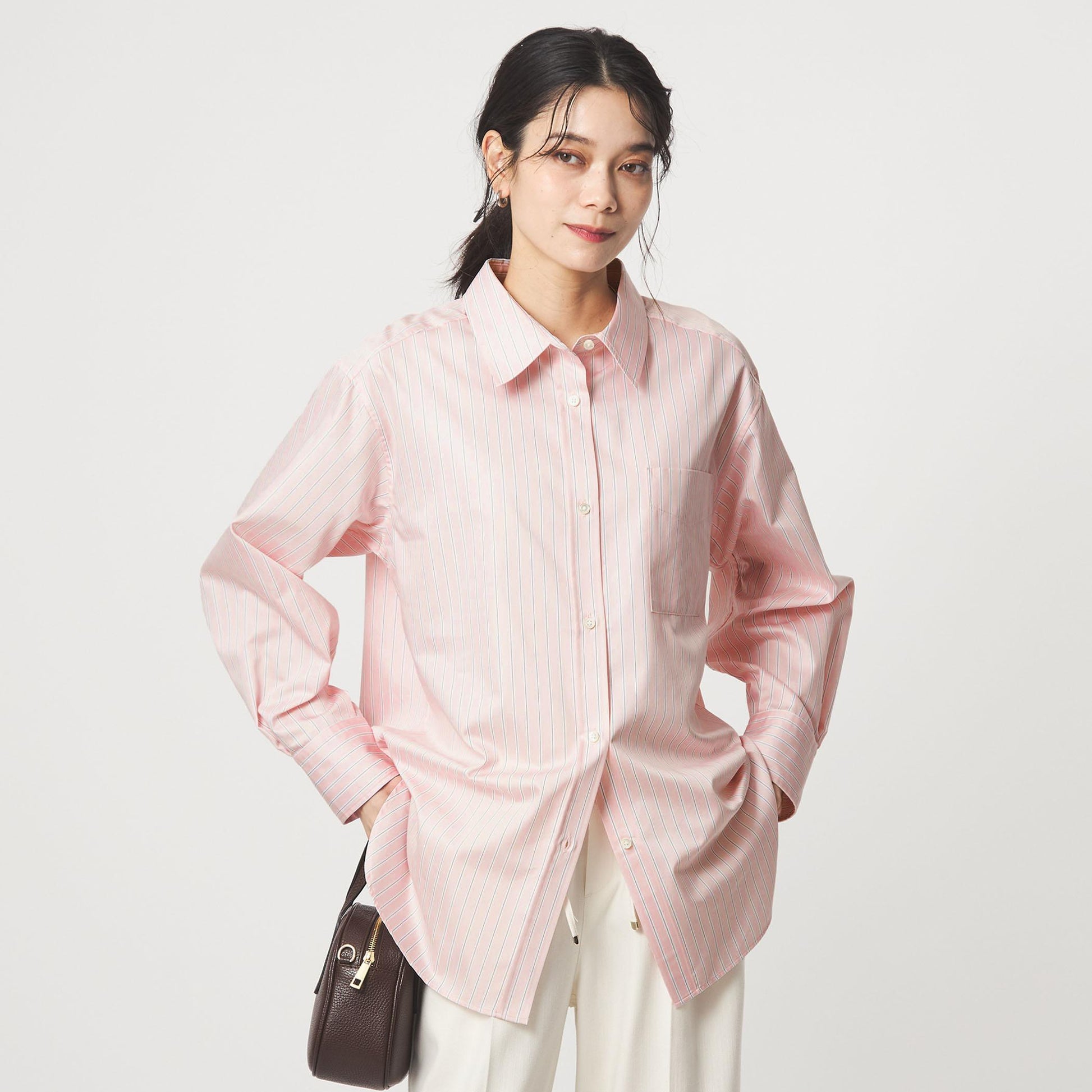 着回しに便利な無地2色に加え、スタイリングのアクセントになるライトピンクのストライプ柄をご用意しました。