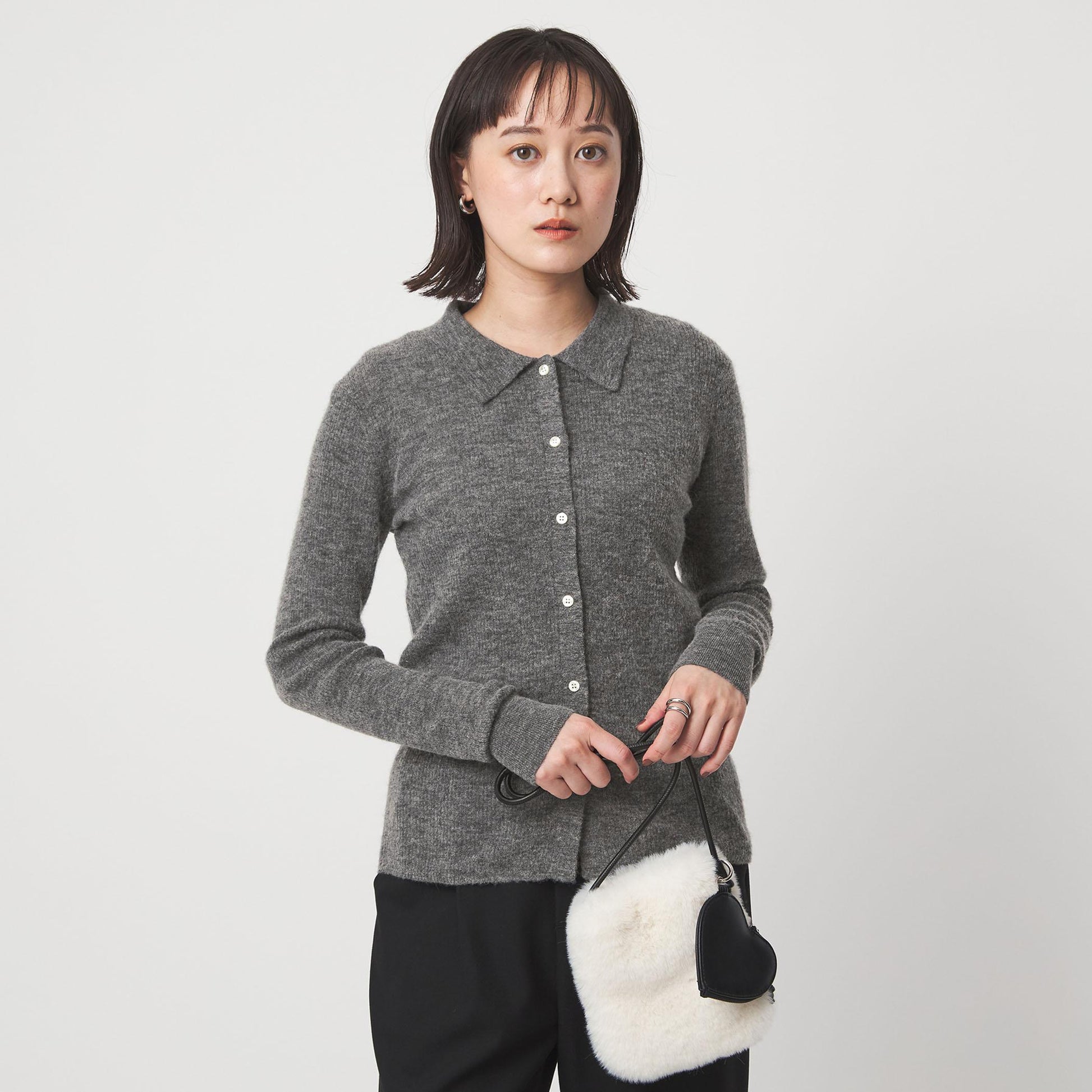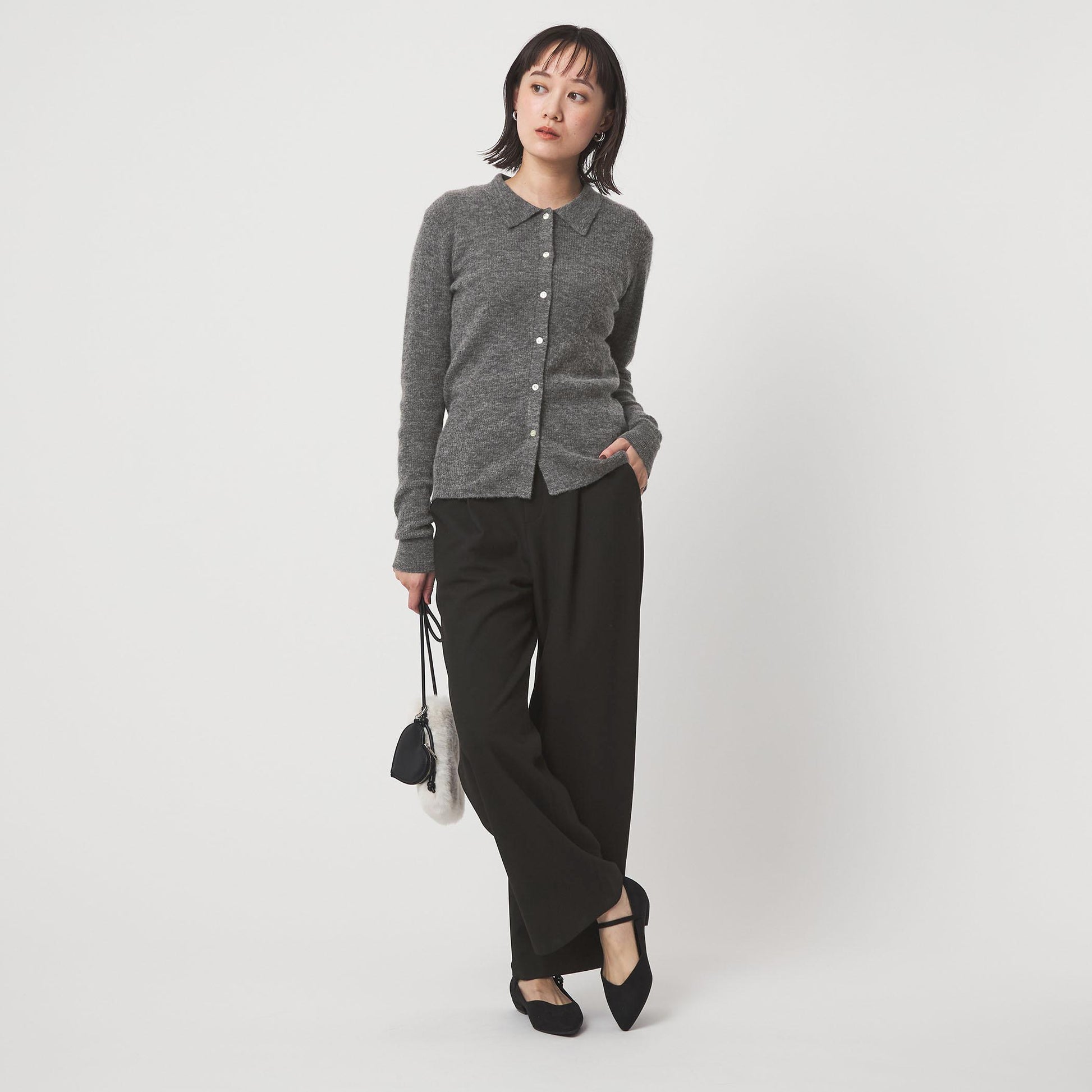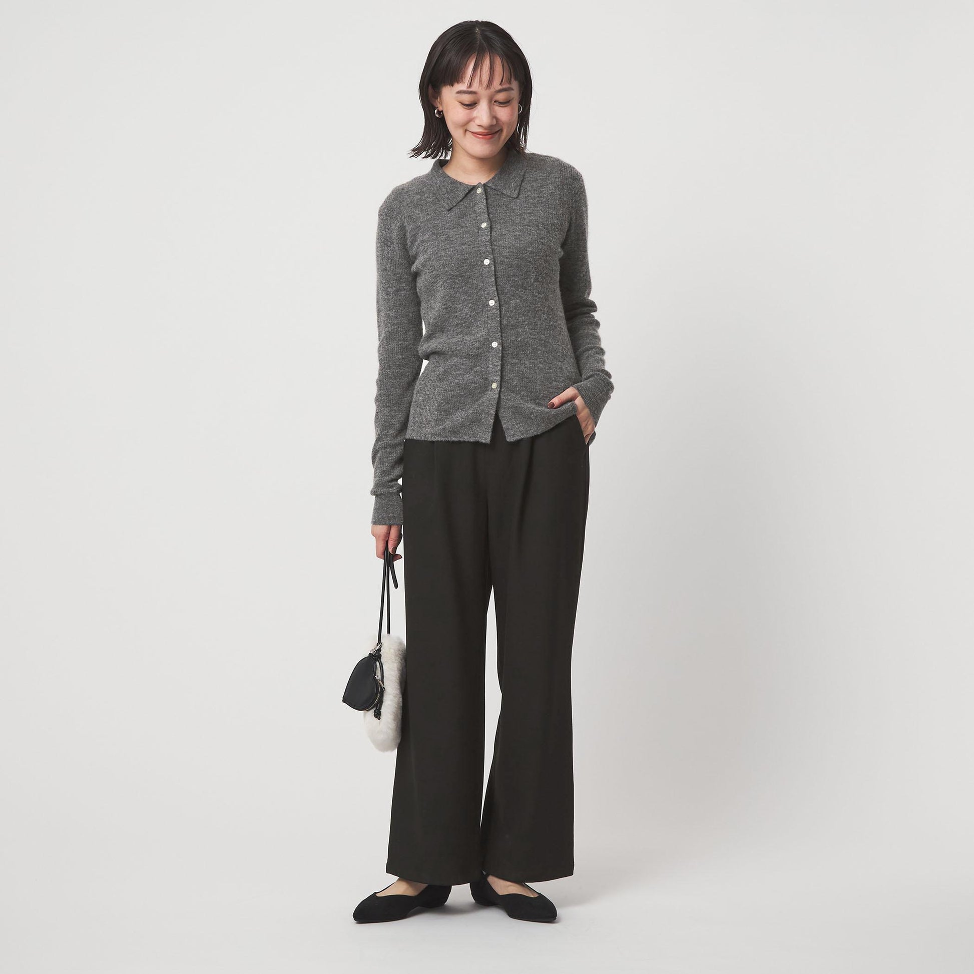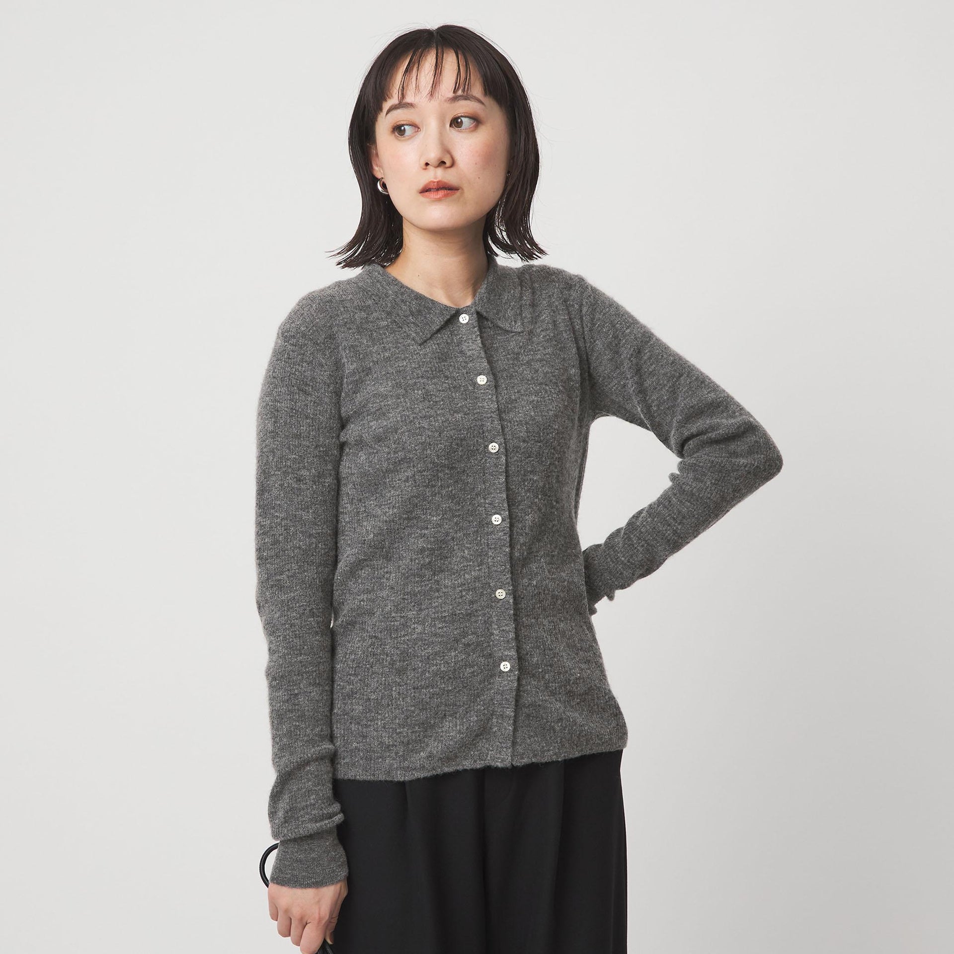 カーディガンの一番下のボタンをあえて外した、抜け感のある着こなしもおすすめです。