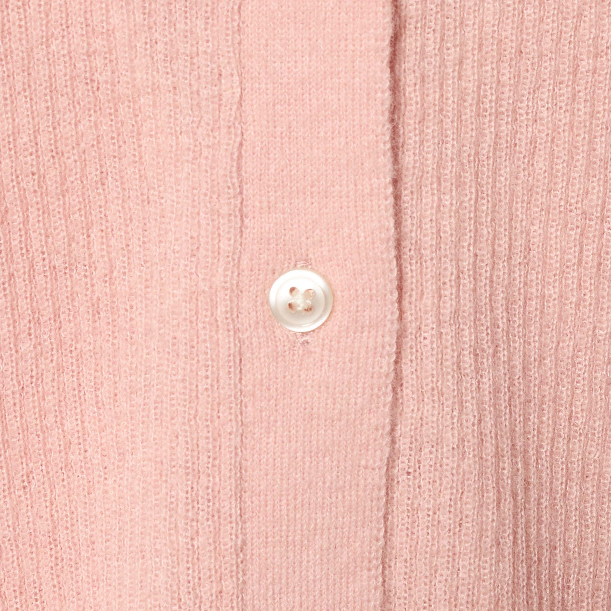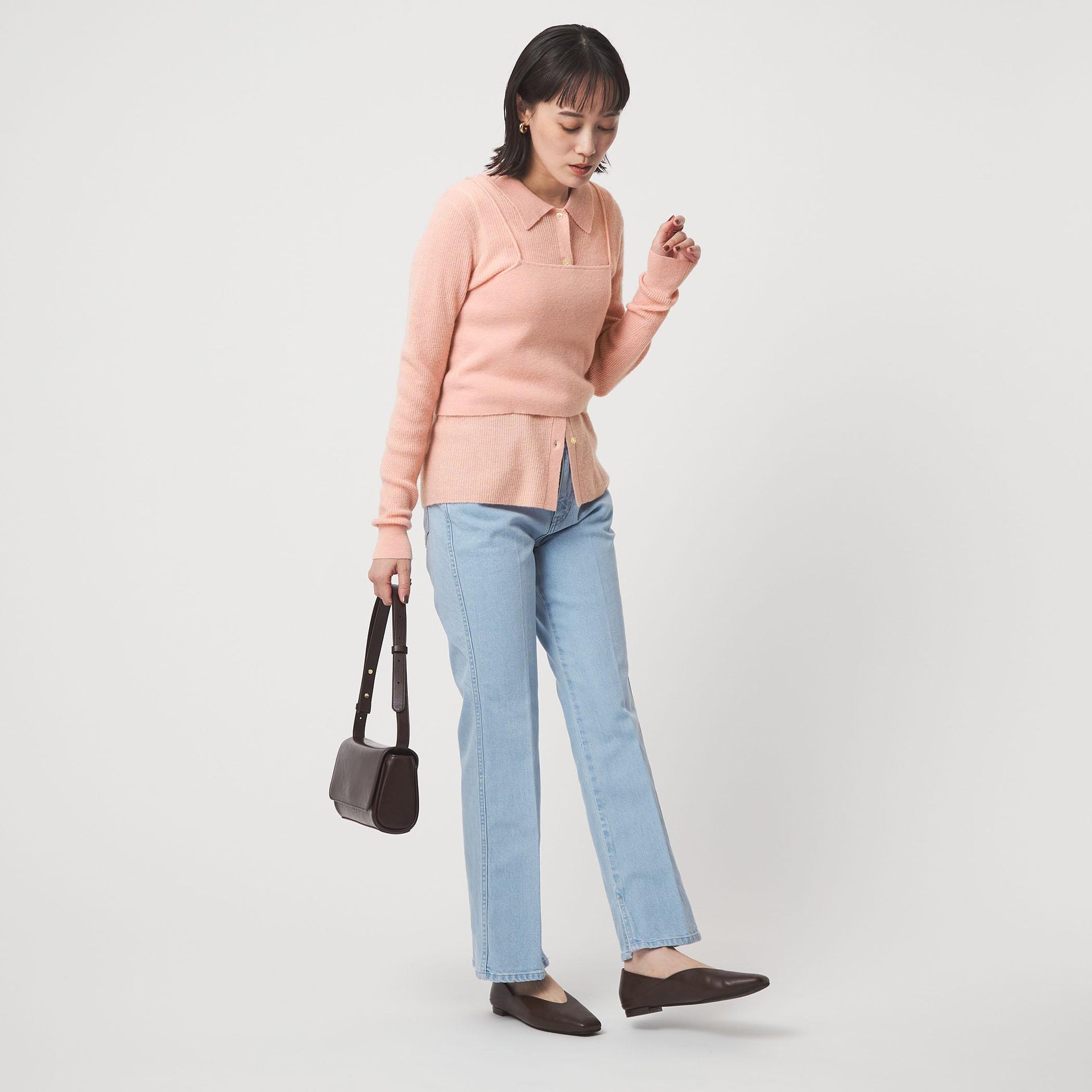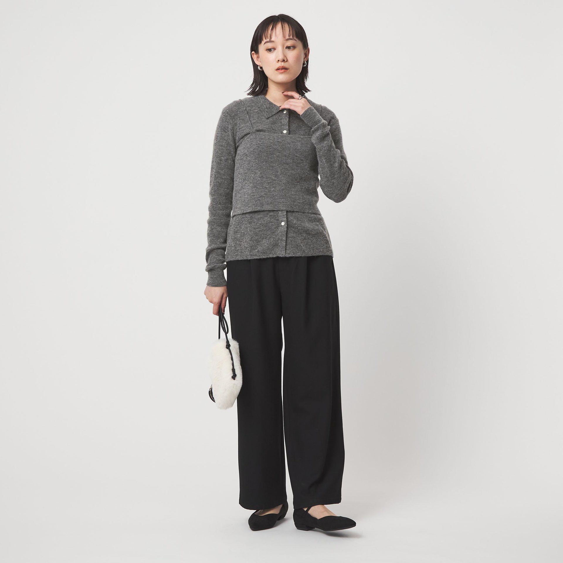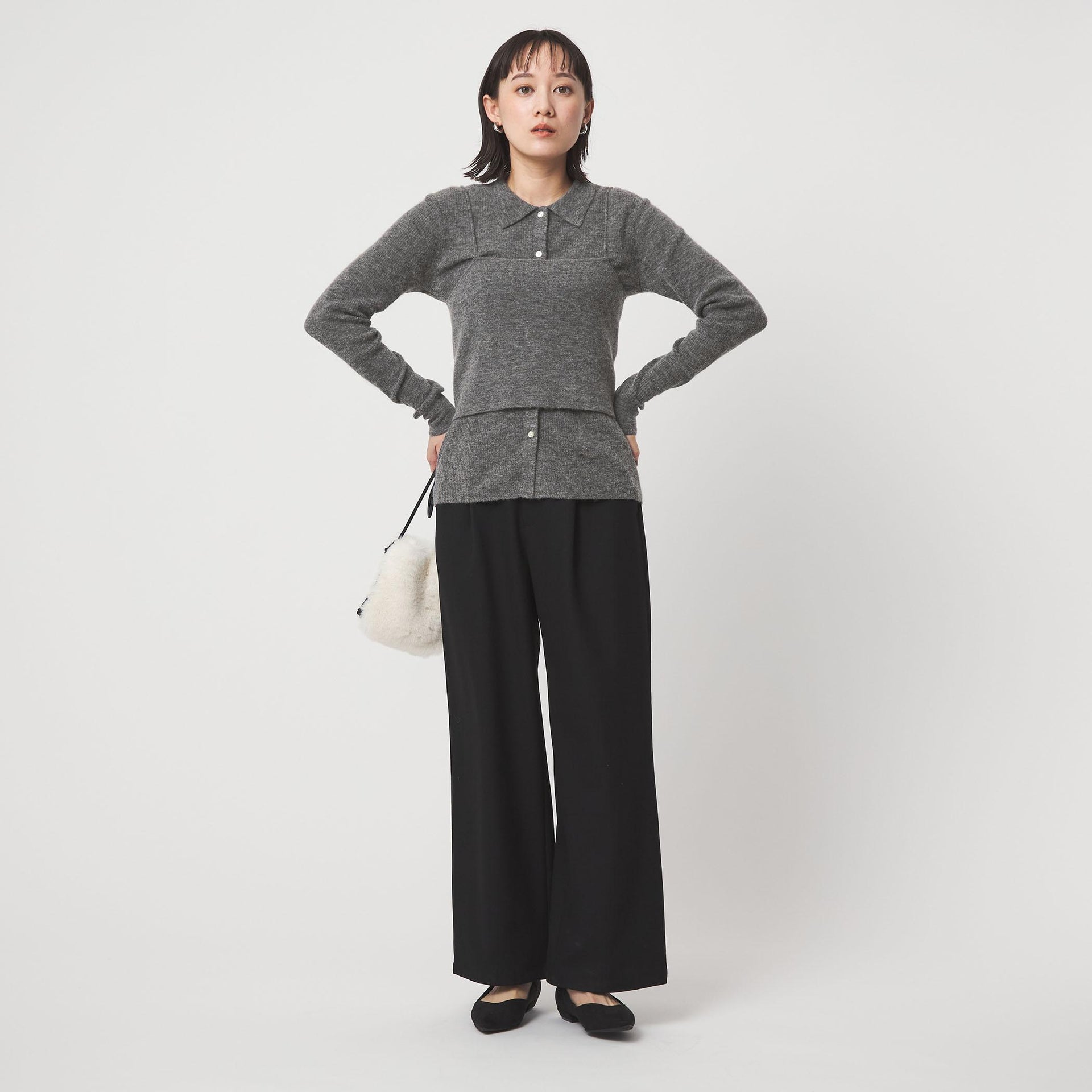 カーディガンの一番下のボタンをあえて外した、抜け感のある着こなしもおすすめです。