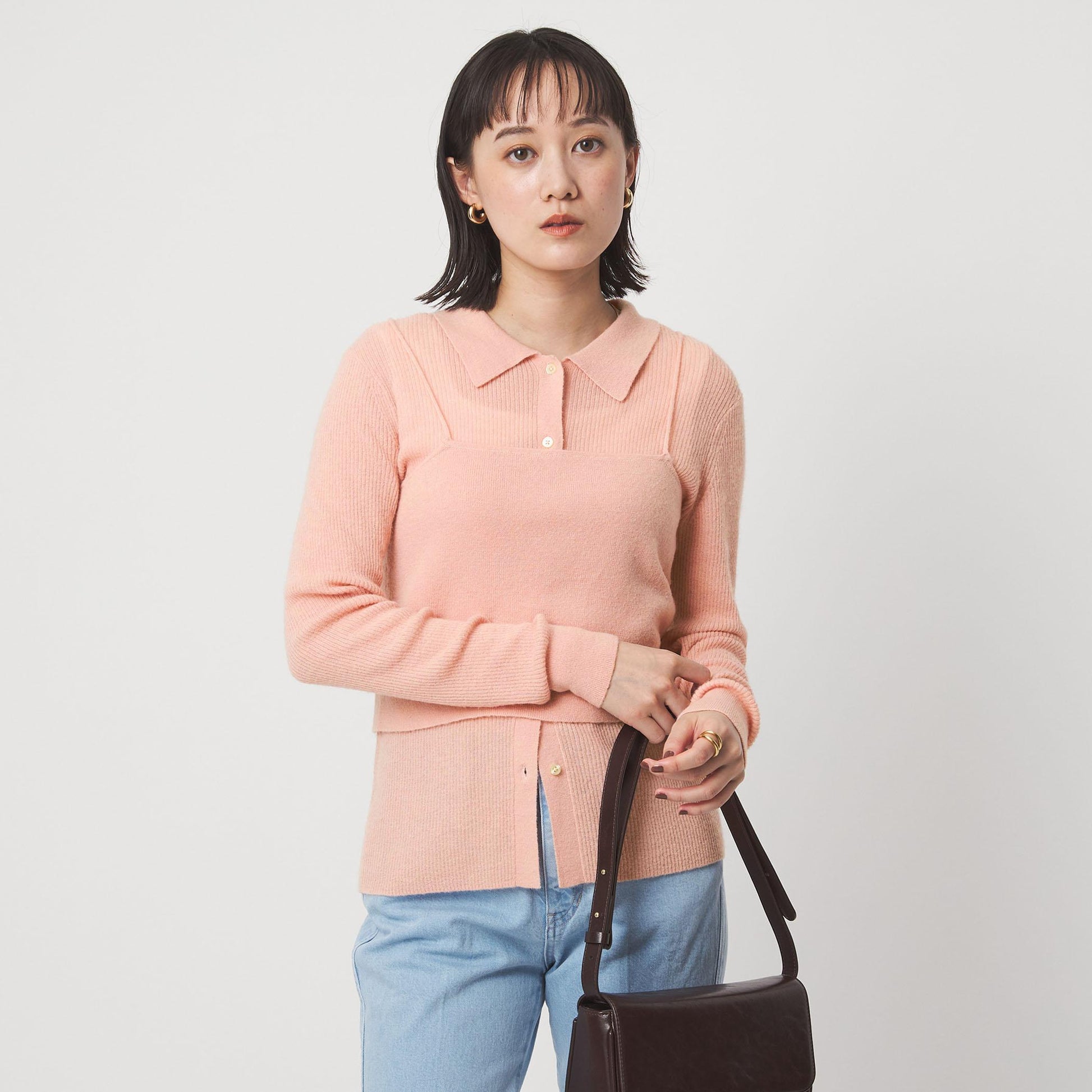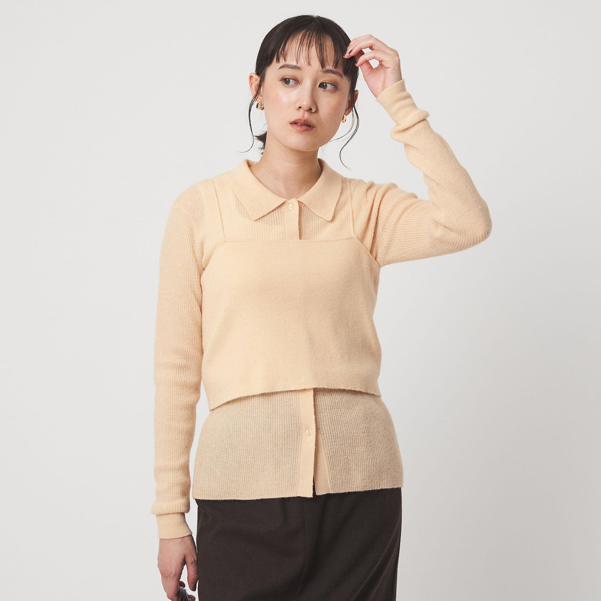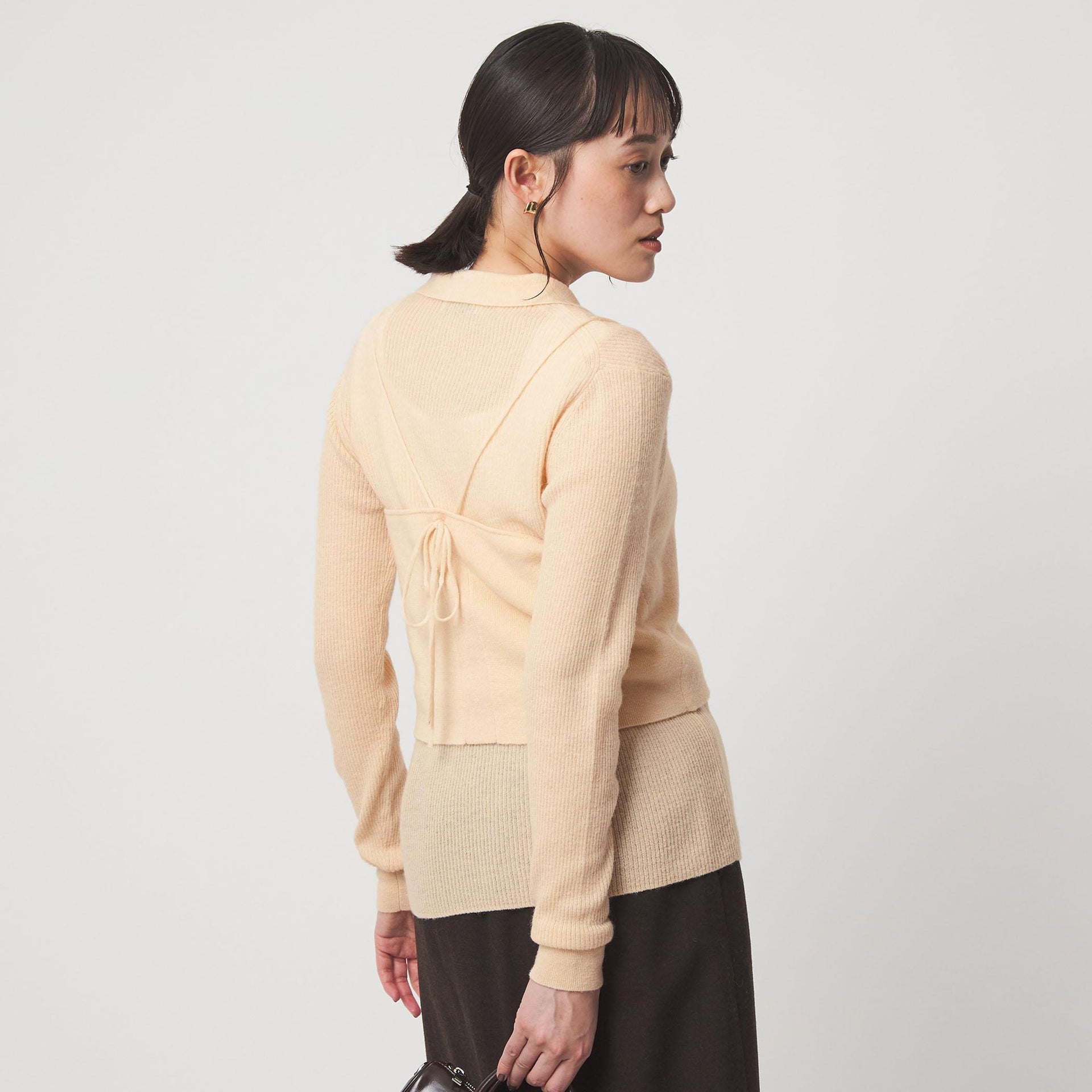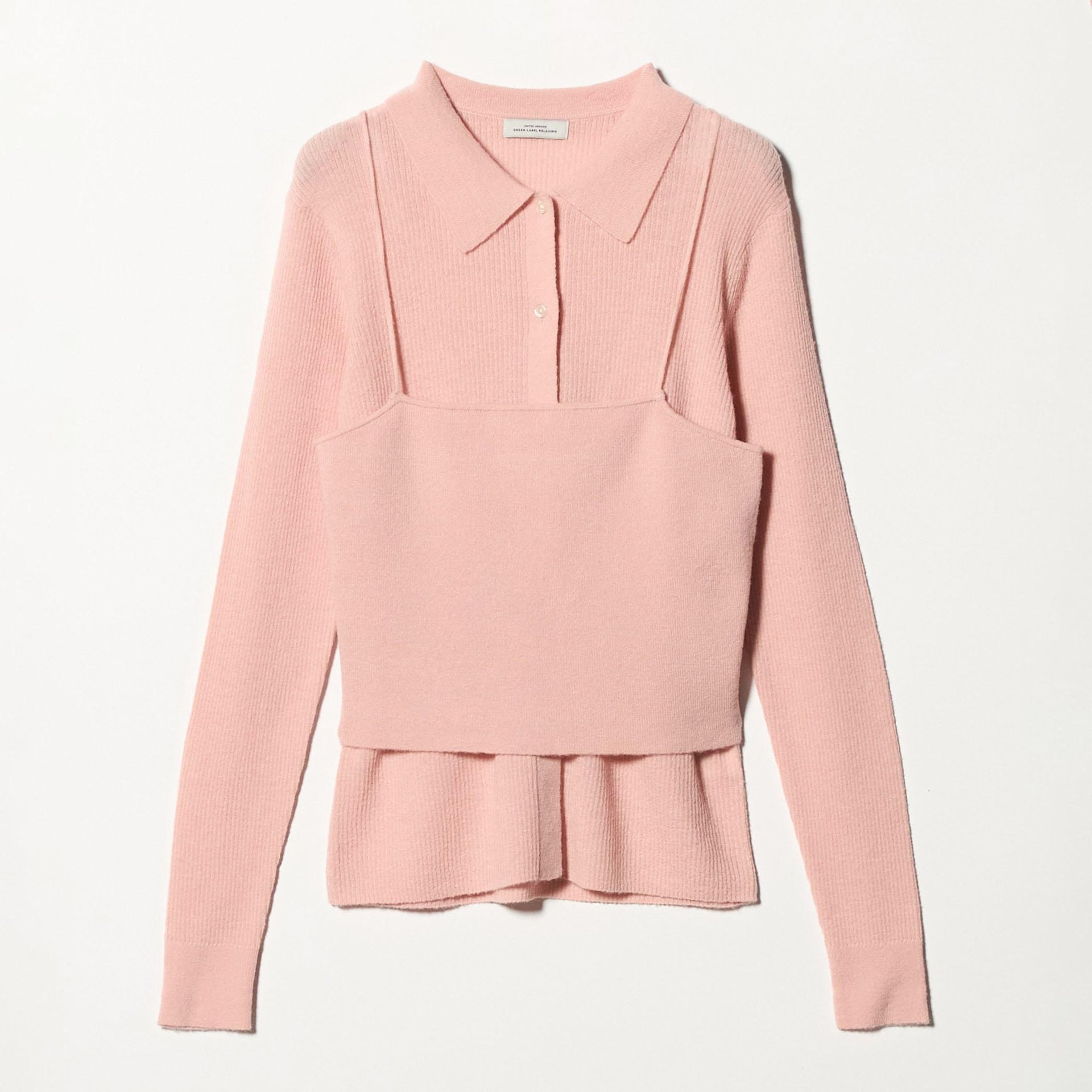 少し透け感のある襟付きリブカーディガンと、編地が異なるキャミソールのセットアイテム。