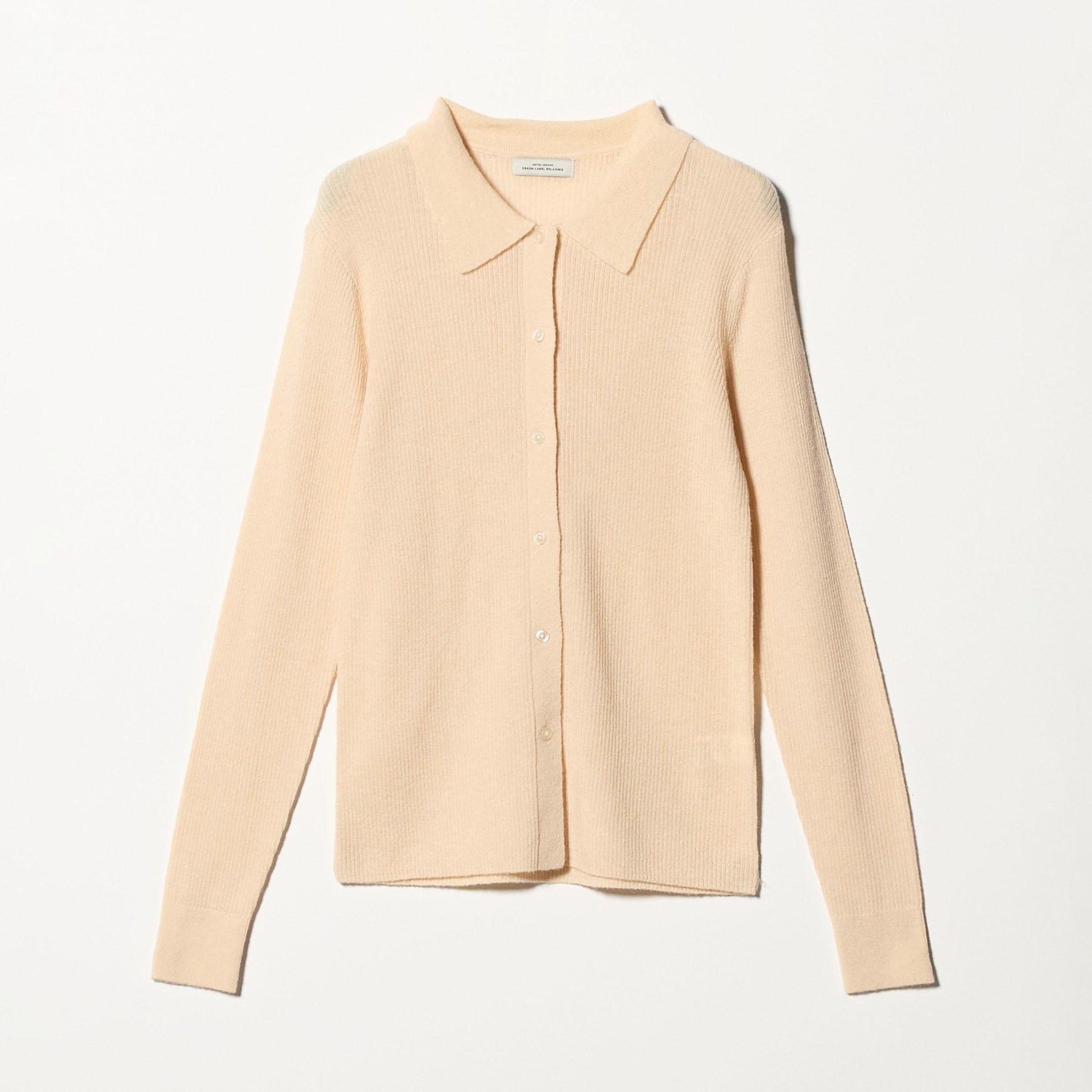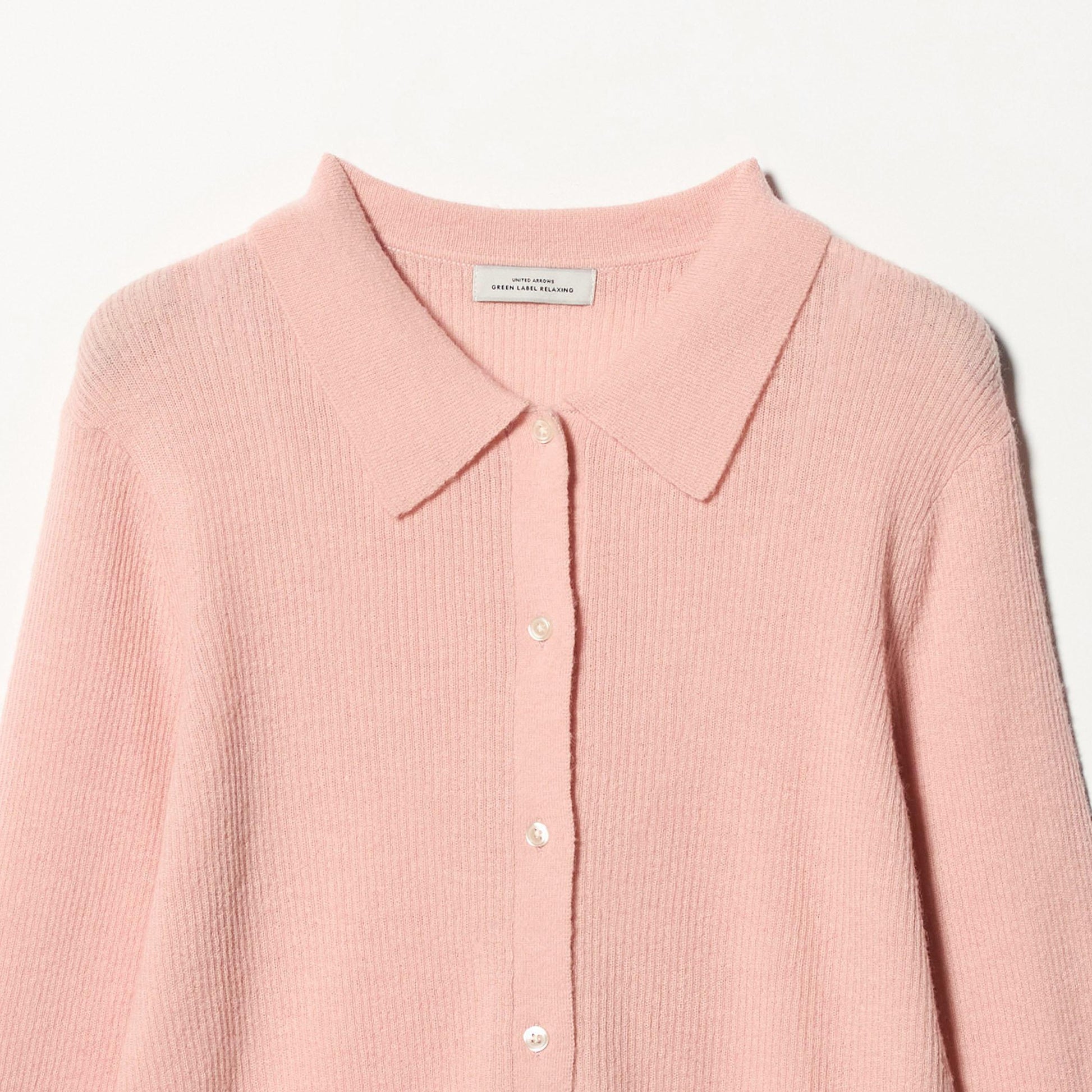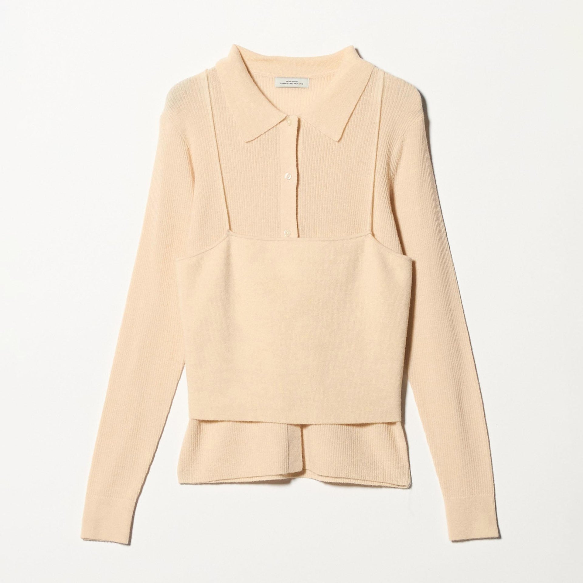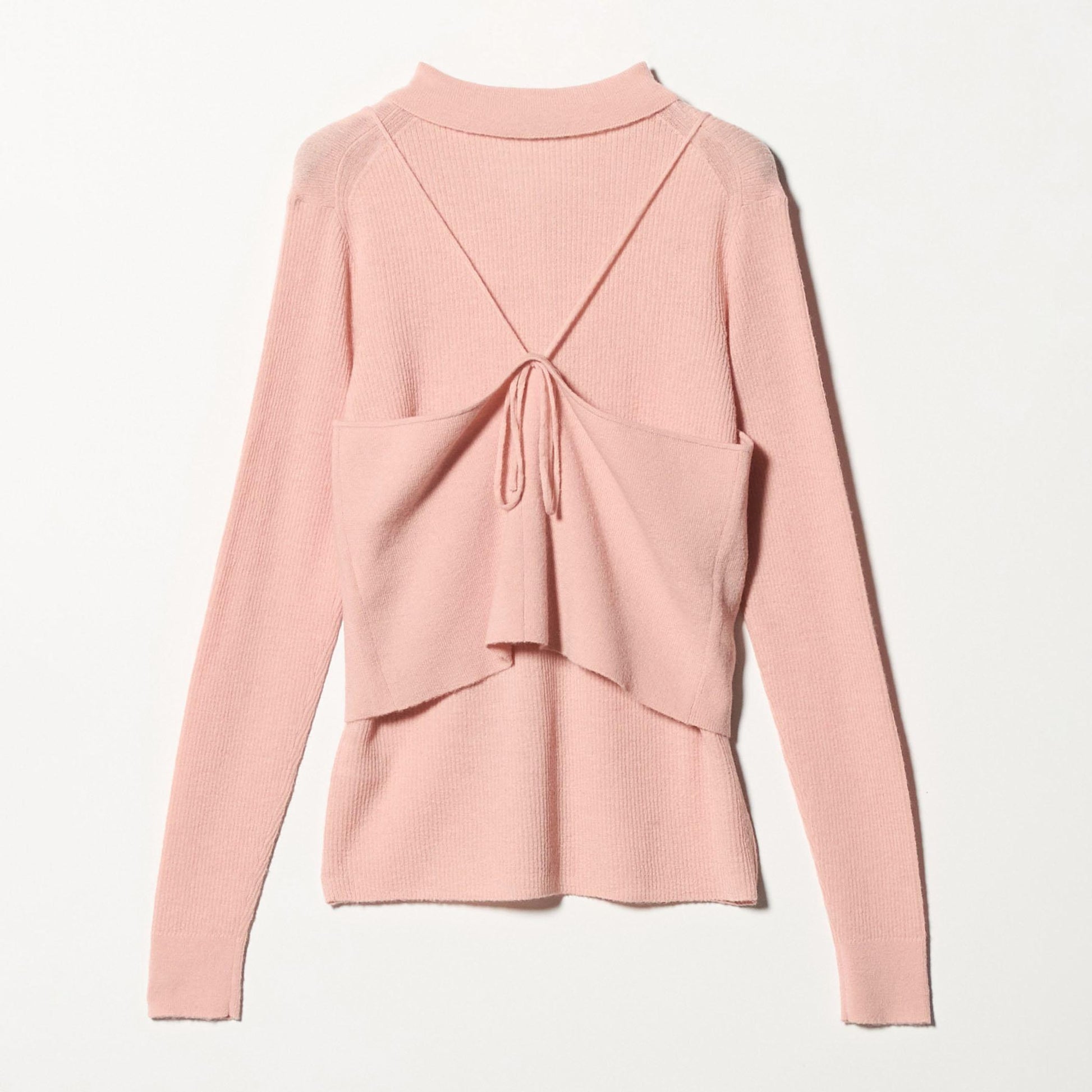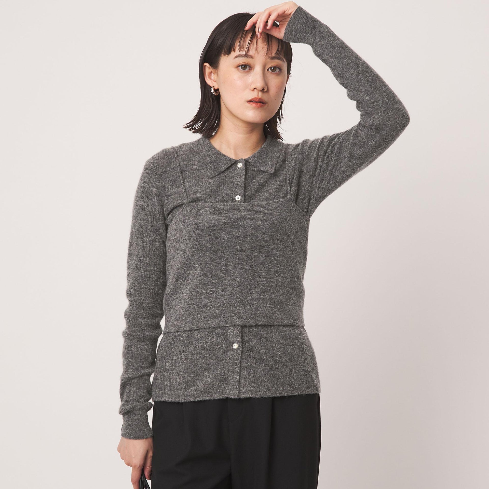 少し透け感のある襟付きリブカーディガンと、編地が異なるキャミソールのセットアイテム。