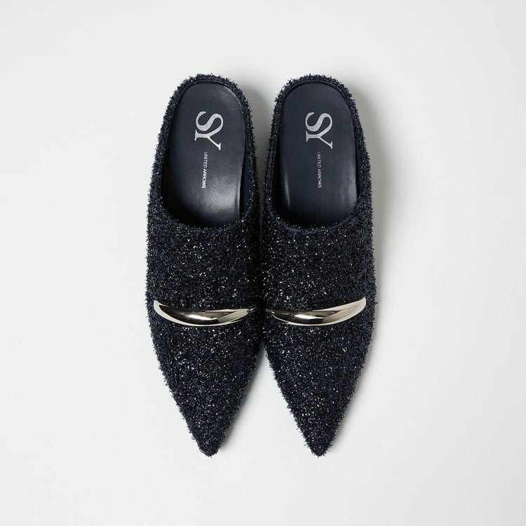 シルバーカラーのモチーフが目を惹くインヒールのウェッジミュール。