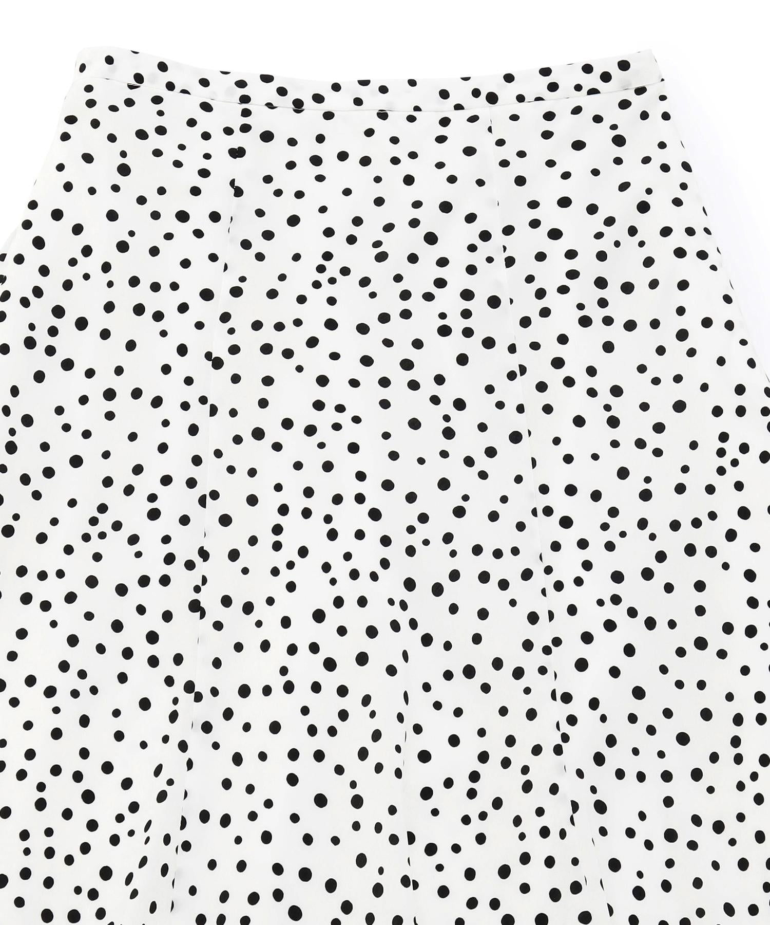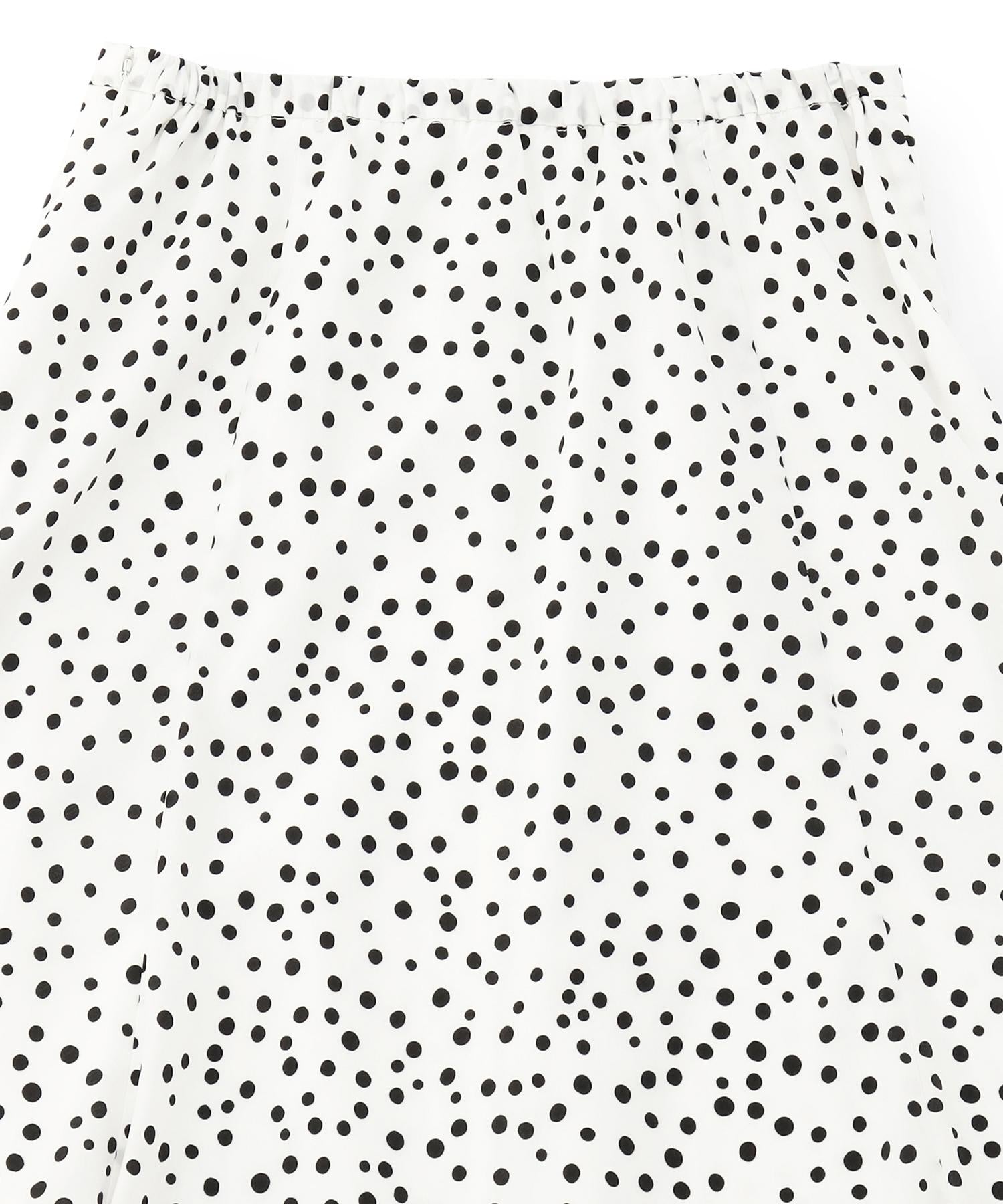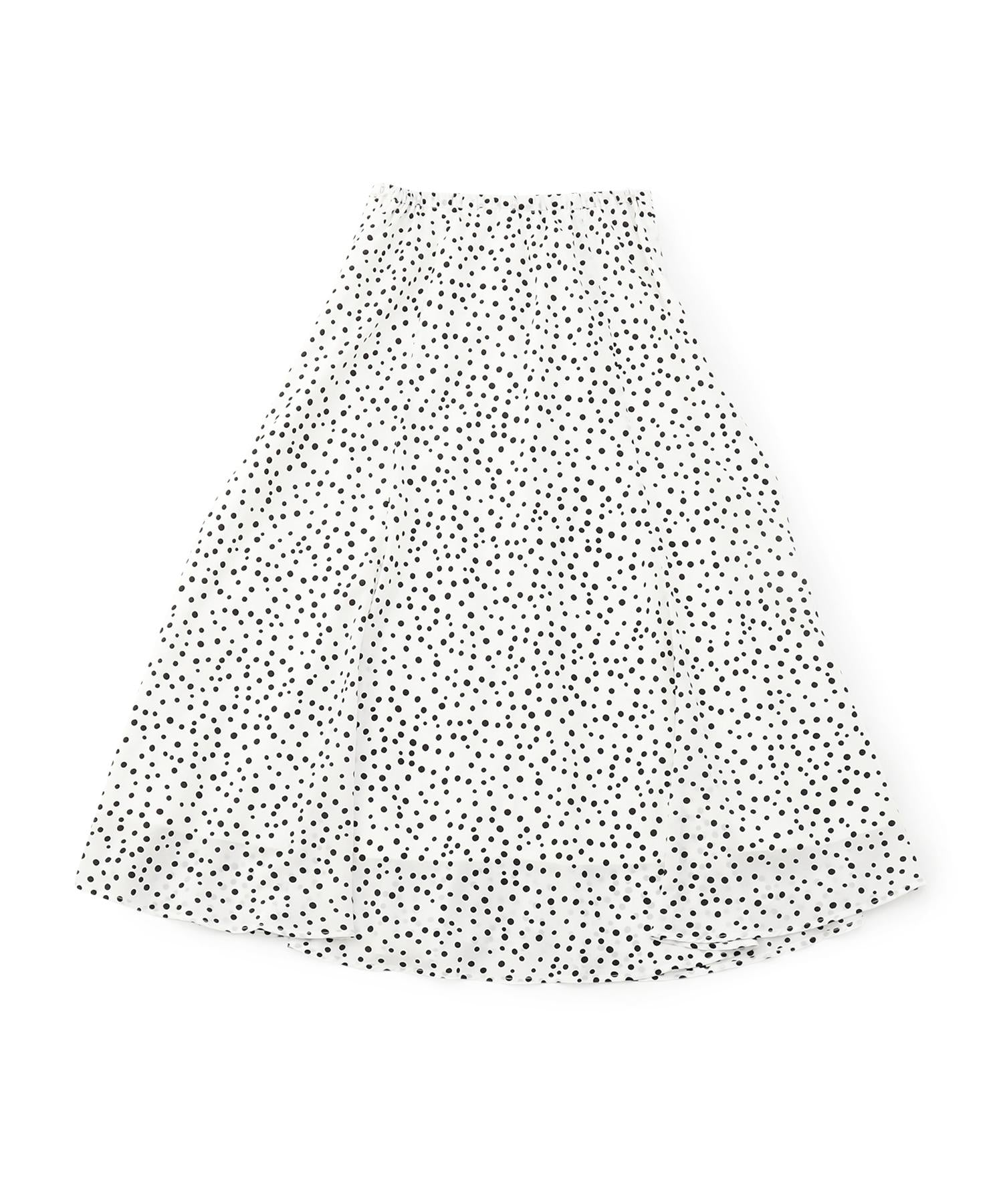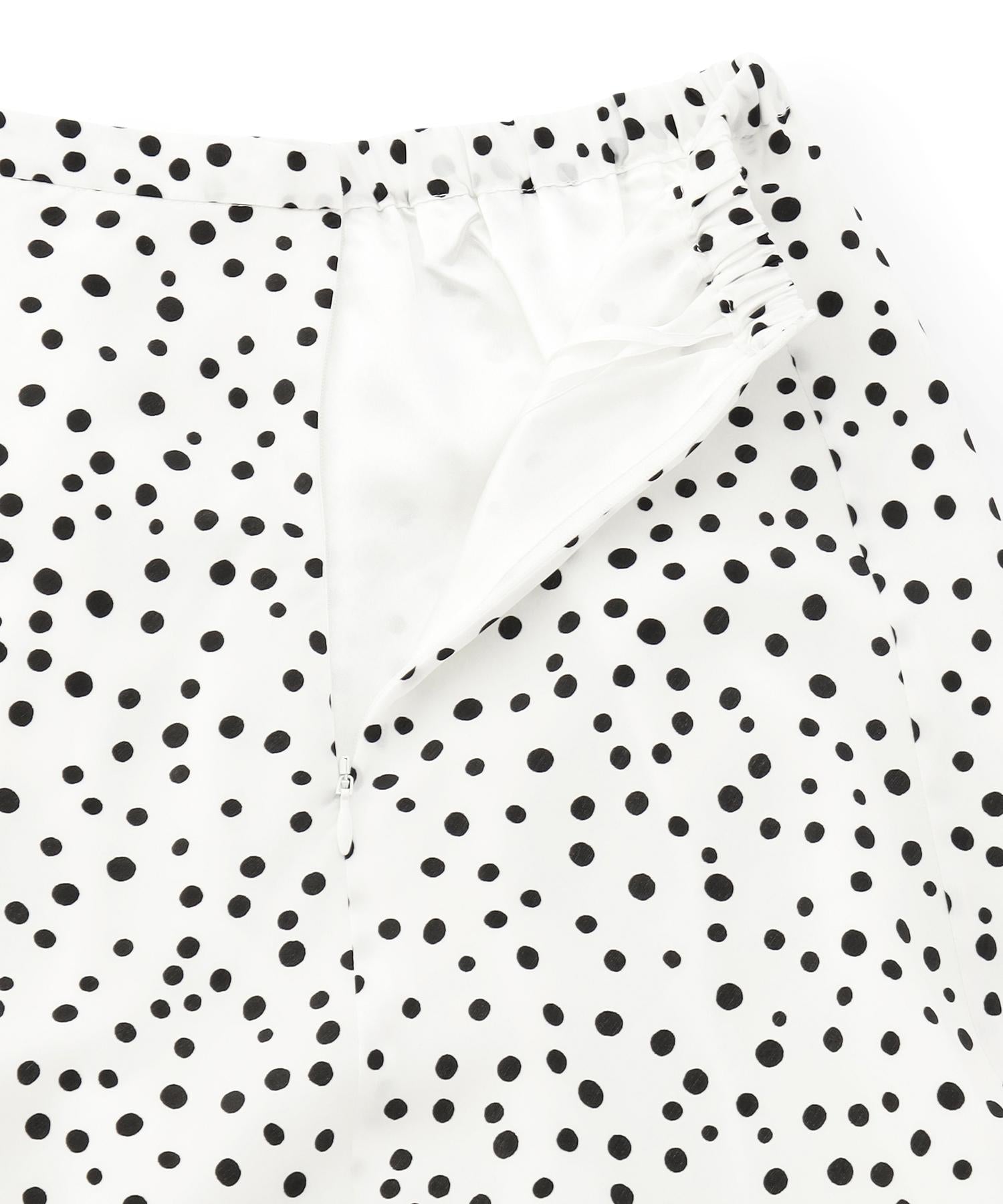 コーディネートのアクセントとして活躍するランダムドットのプリントスカート。
