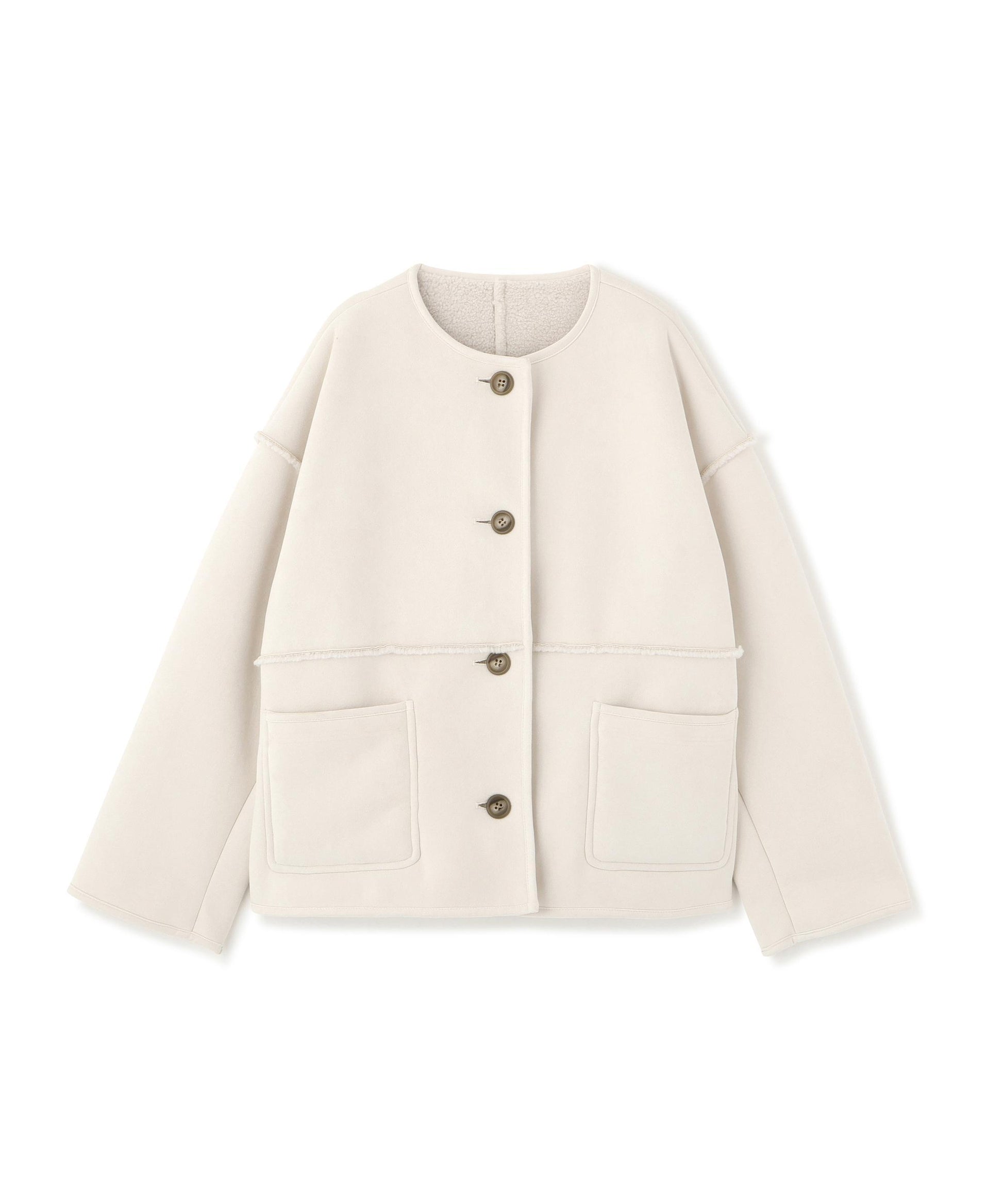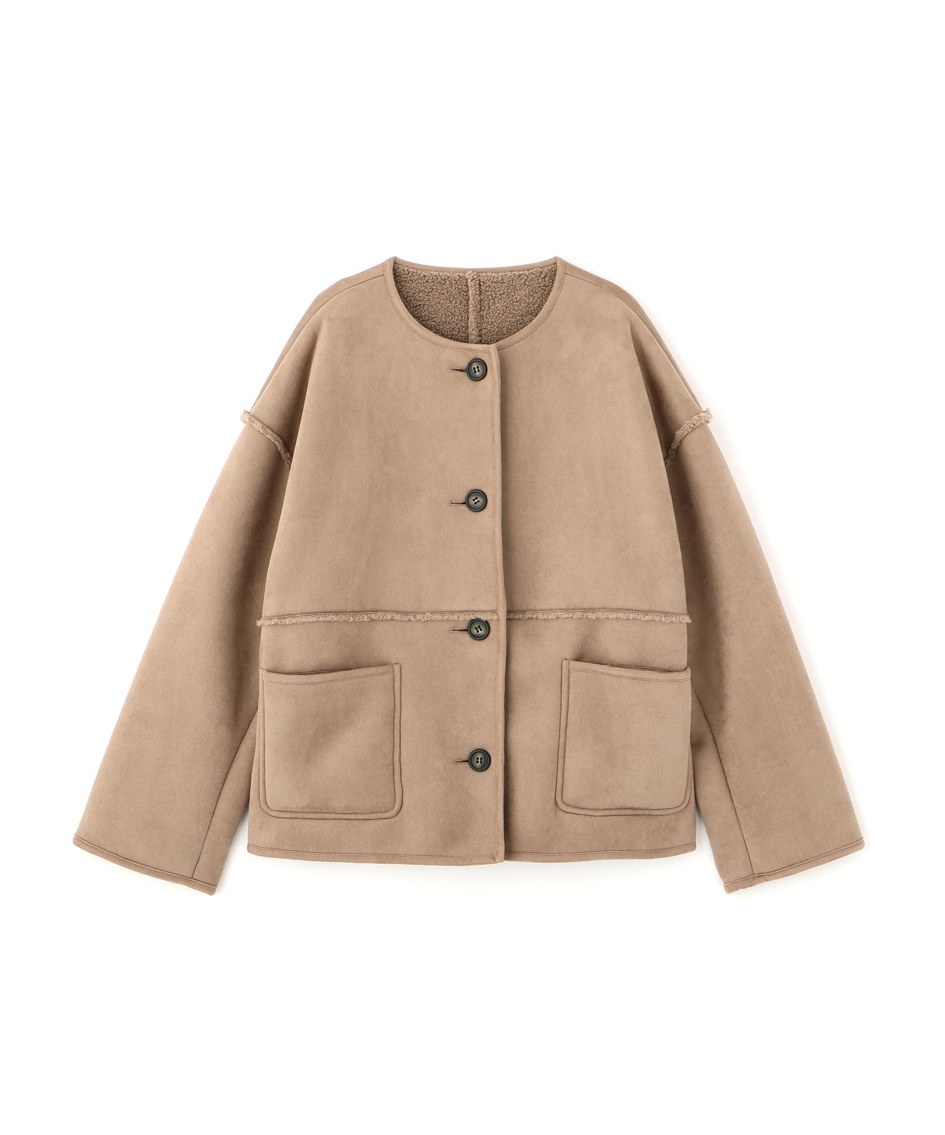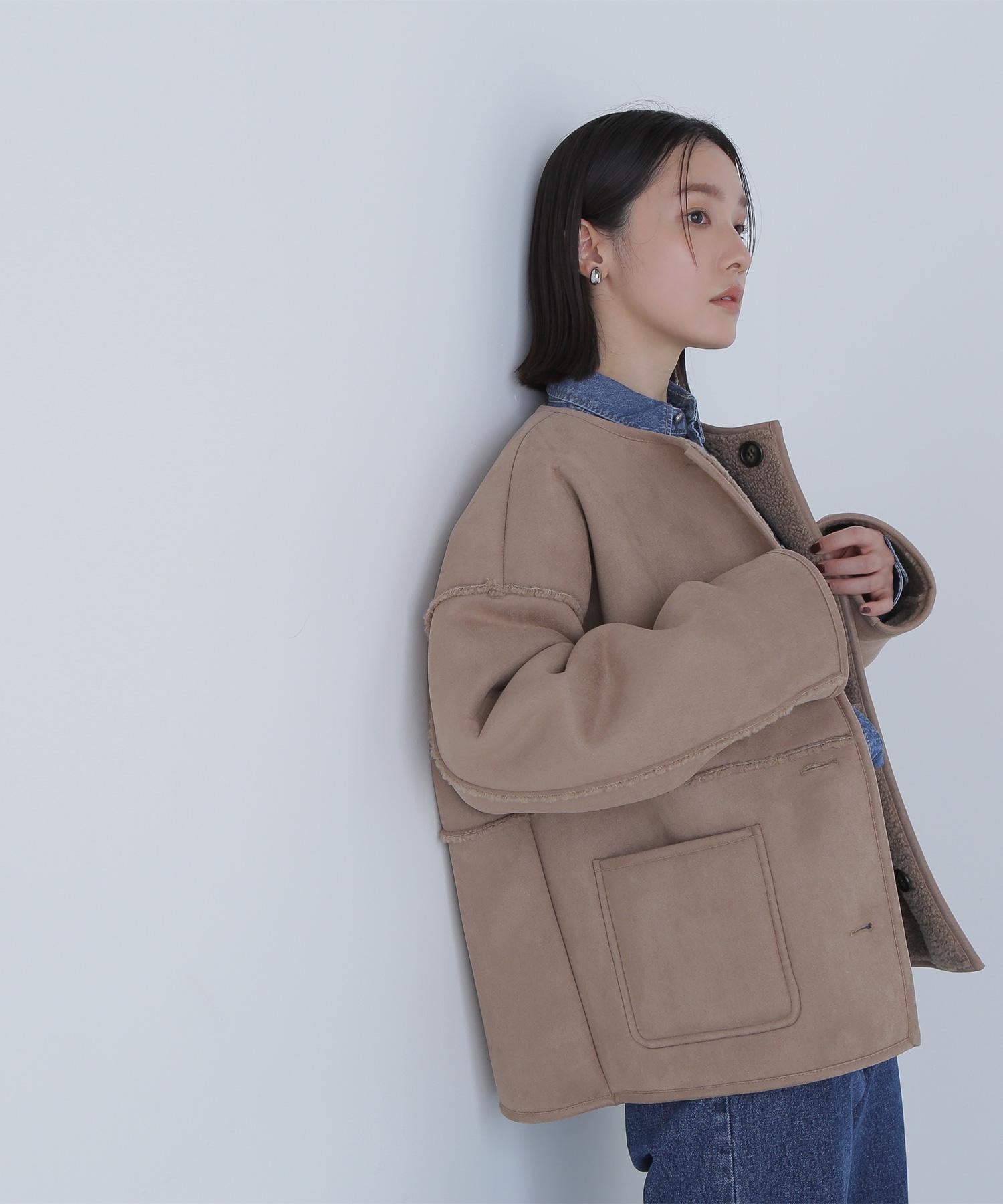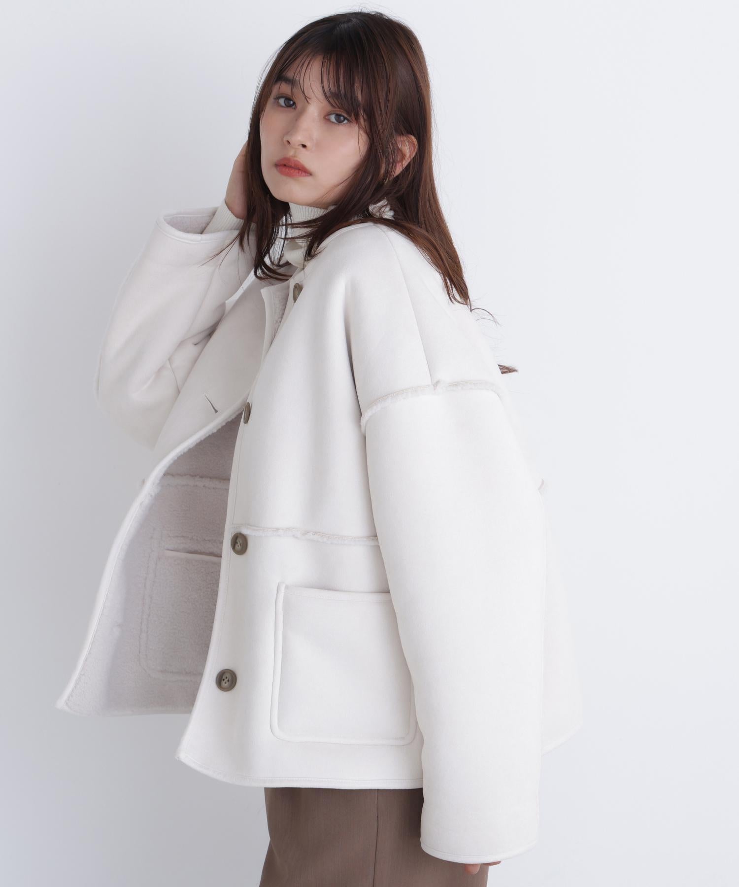 ボアとフェイクスウェードの両方でスタイリングが楽しめるリバーシブルアウター。カジュアルになりすぎないよう挟み出しのディテールに拘ったデザインです。両側からポケットが使えるうれしい仕様。スコッチ系のボタンが優しい印象に見せてくれる1着。ミドル丈なのでボトムスを選ばずに着ていただけます。