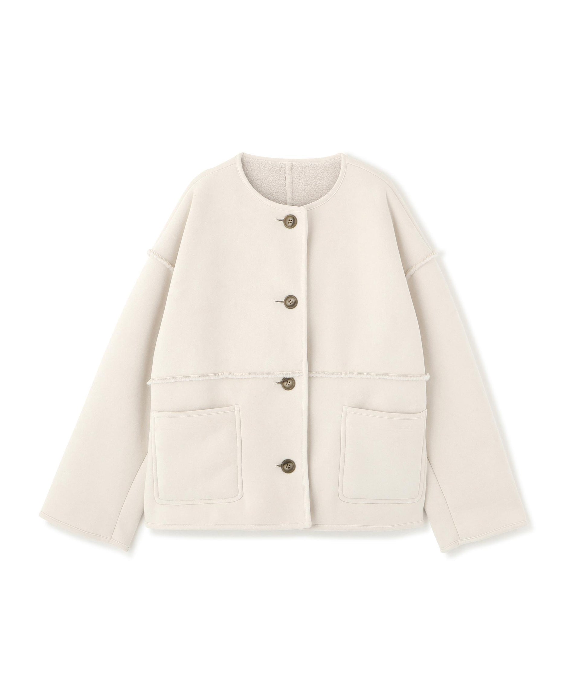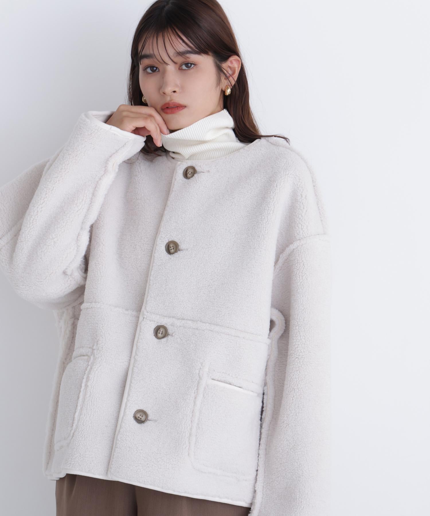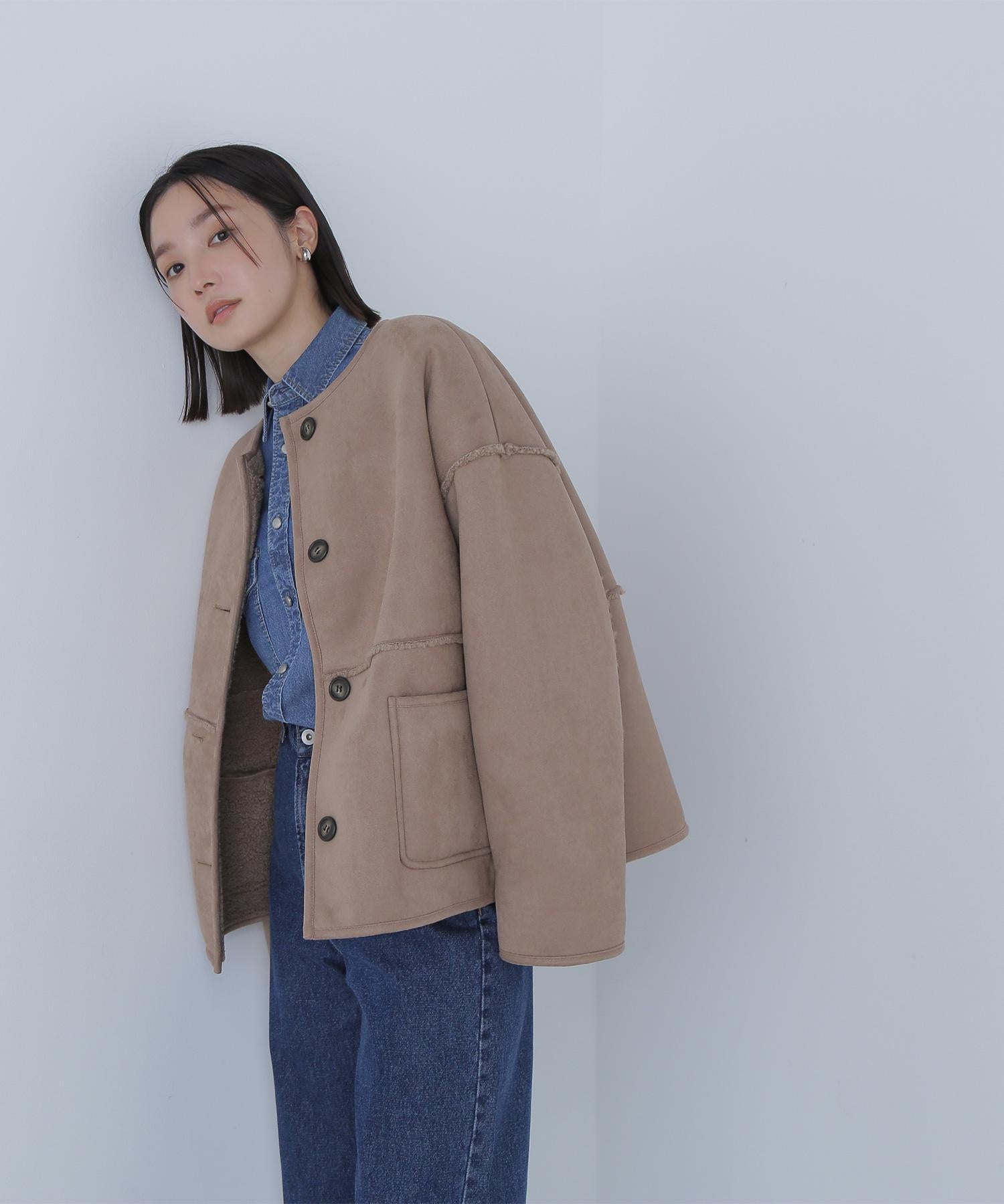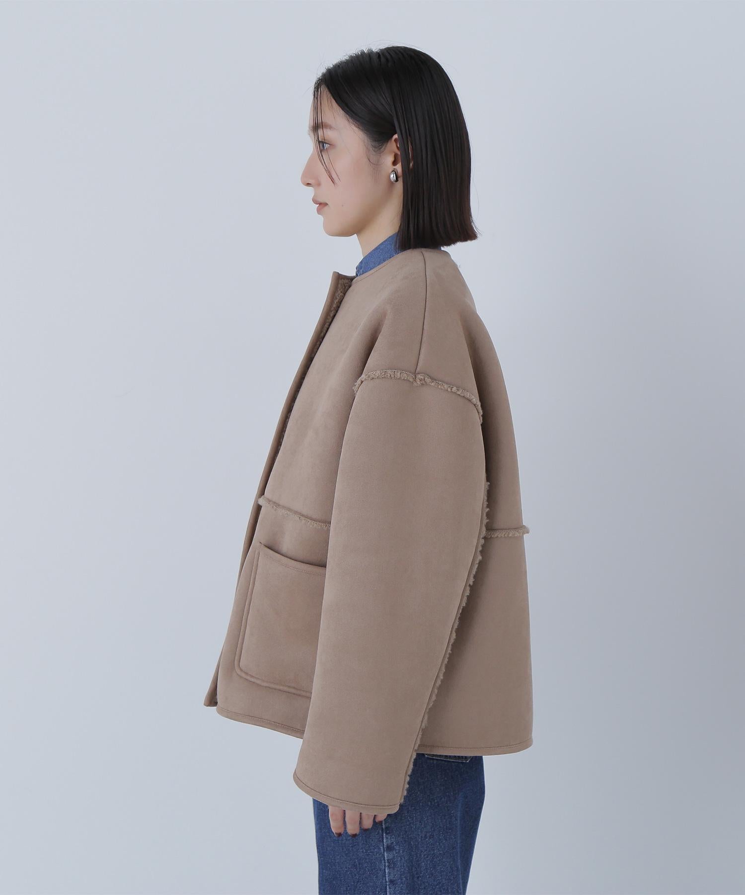 ボアとフェイクスウェードの両方でスタイリングが楽しめるリバーシブルアウター。カジュアルになりすぎないよう挟み出しのディテールに拘ったデザインです。両側からポケットが使えるうれしい仕様。スコッチ系のボタンが優しい印象に見せてくれる1着。ミドル丈なのでボトムスを選ばずに着ていただけます。