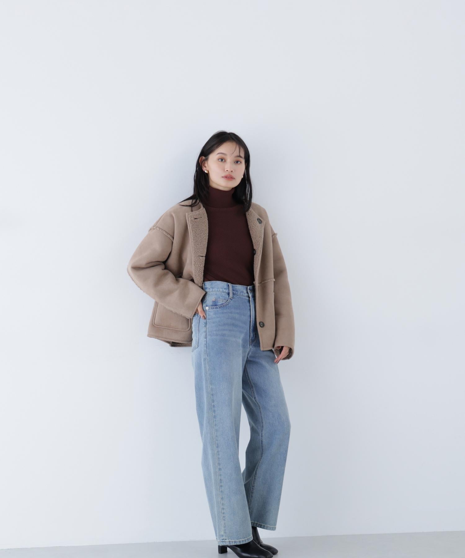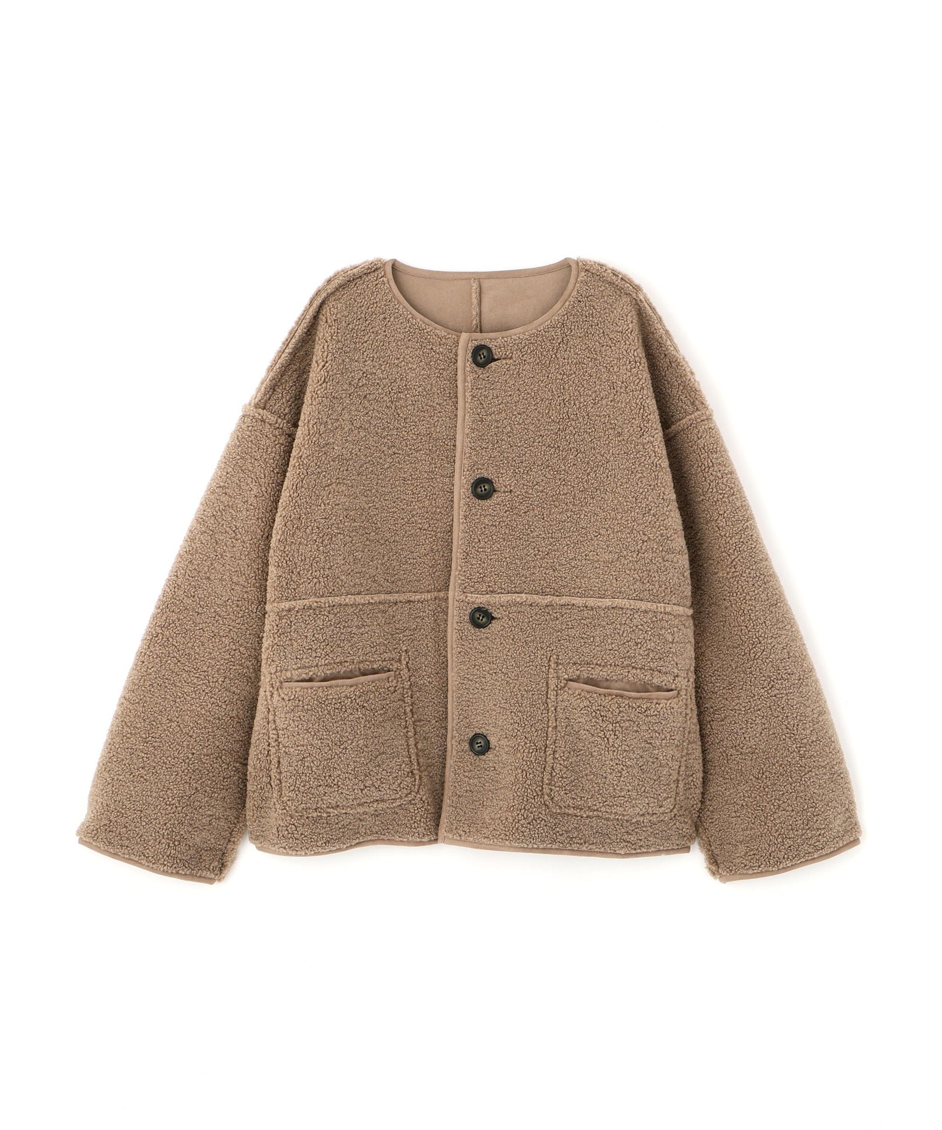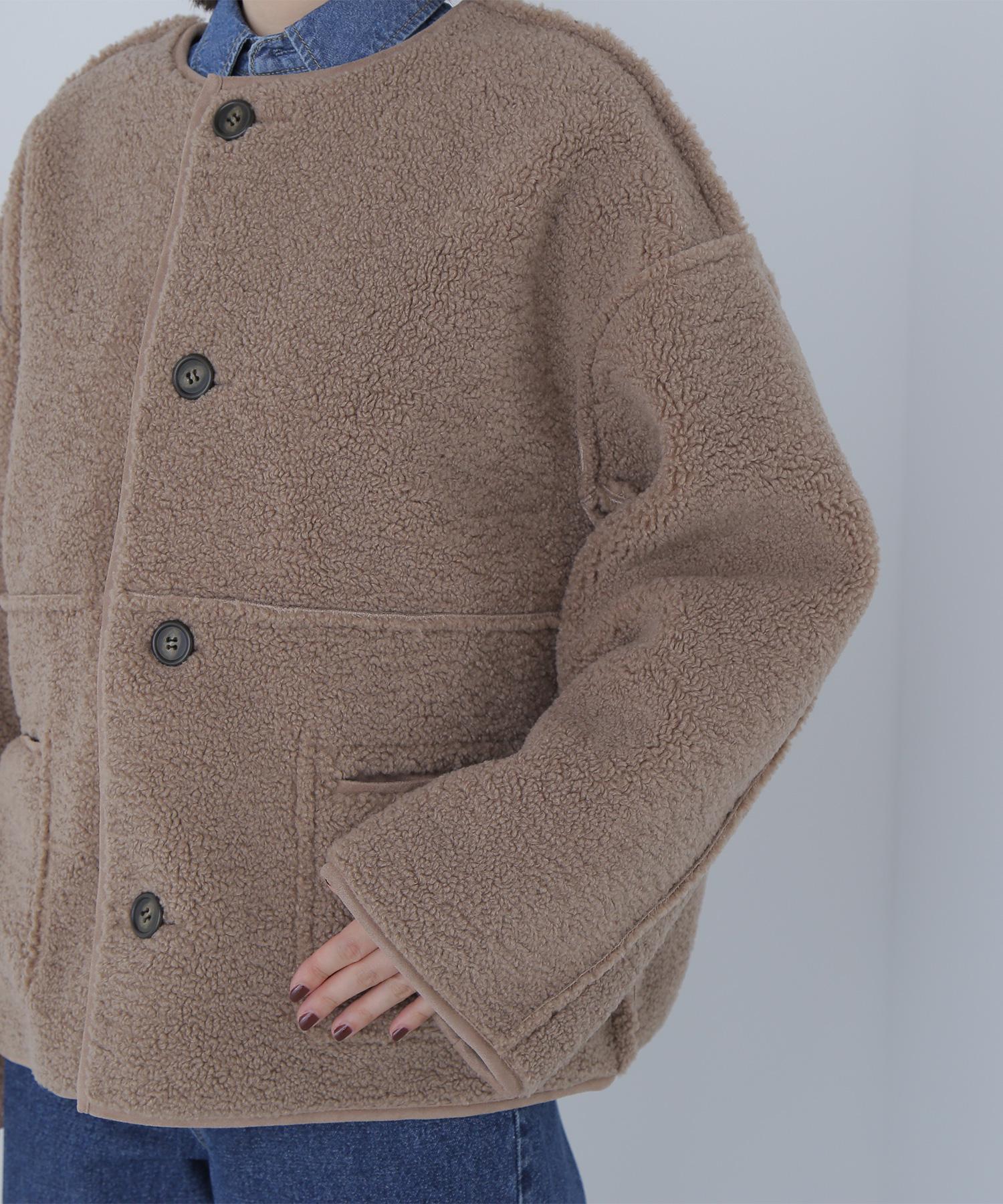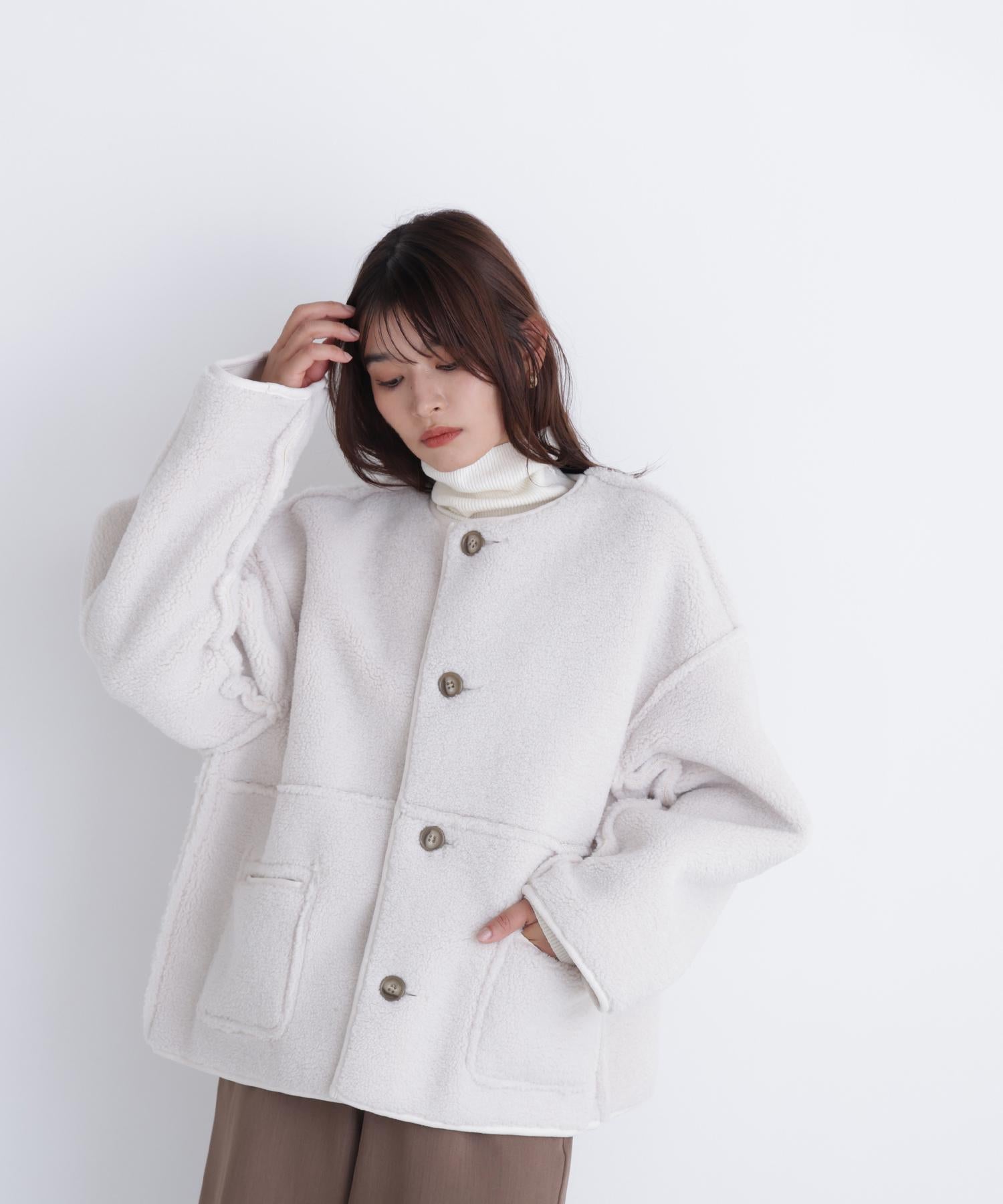 ボアとフェイクスウェードの両方でスタイリングが楽しめるリバーシブルアウター。カジュアルになりすぎないよう挟み出しのディテールに拘ったデザインです。両側からポケットが使えるうれしい仕様。スコッチ系のボタンが優しい印象に見せてくれる1着。ミドル丈なのでボトムスを選ばずに着ていただけます。