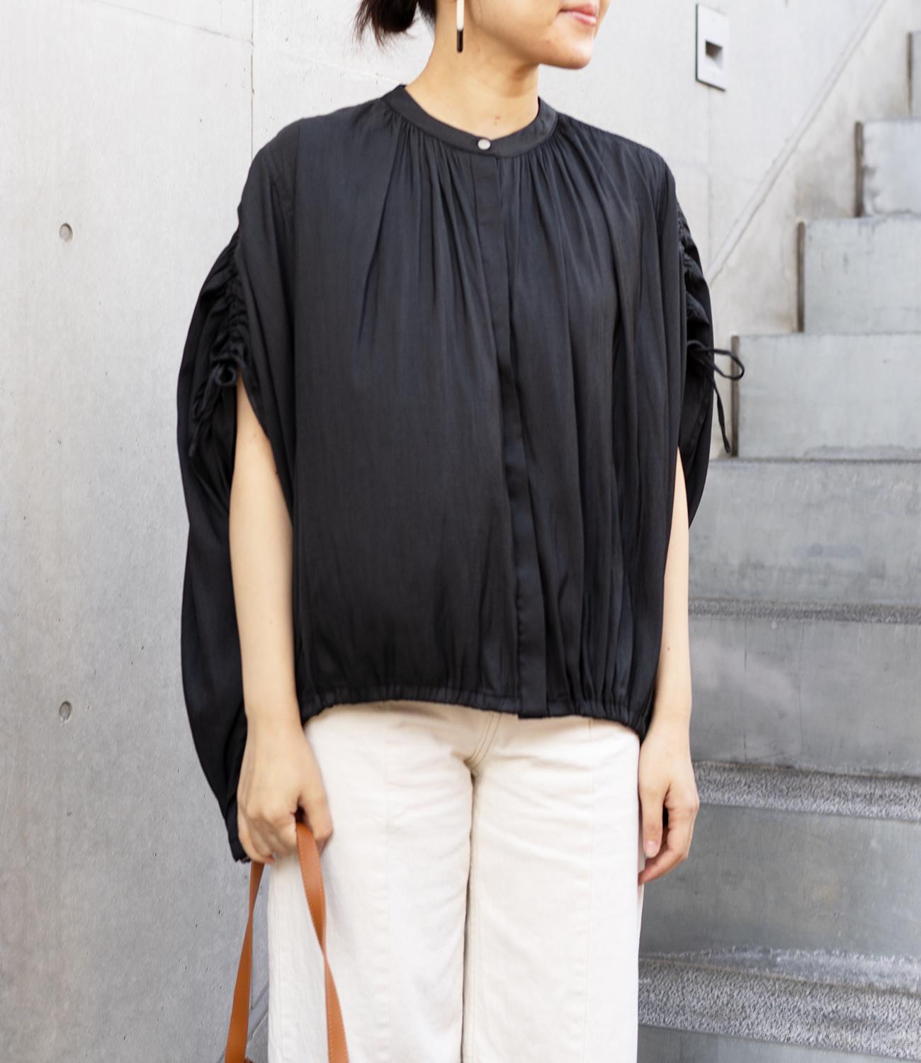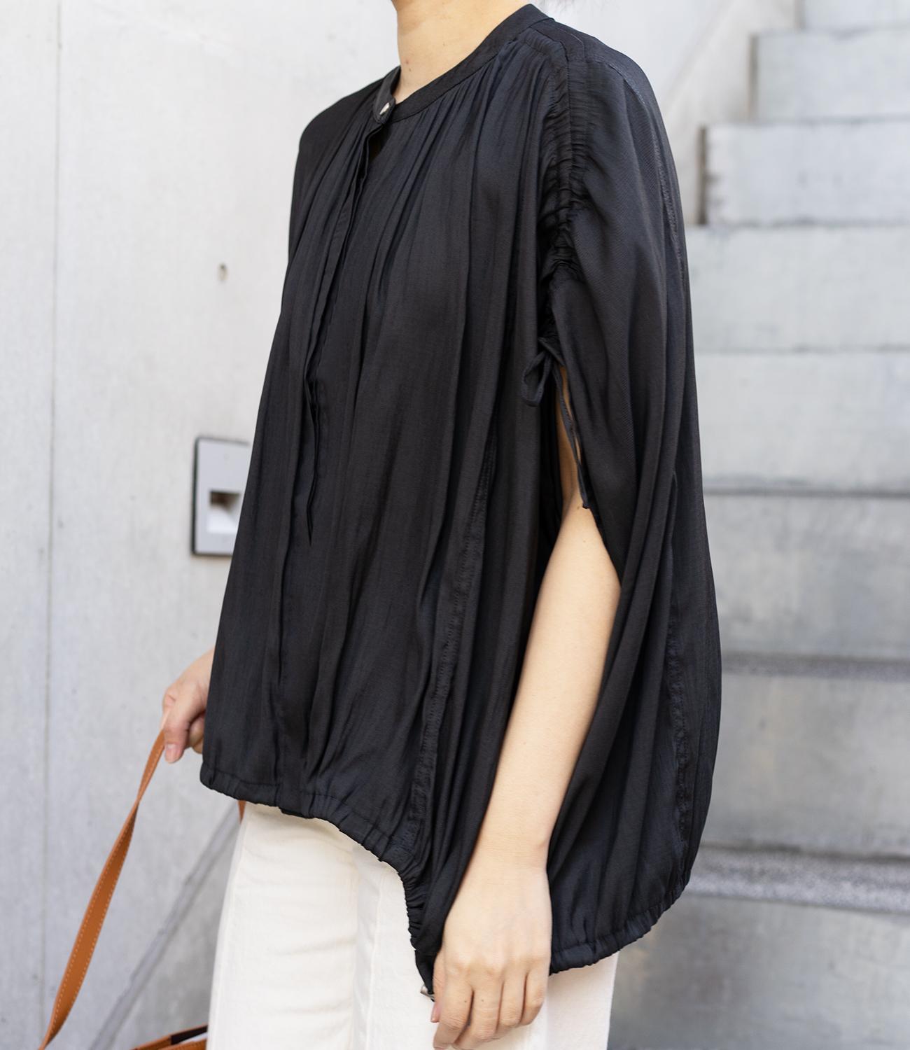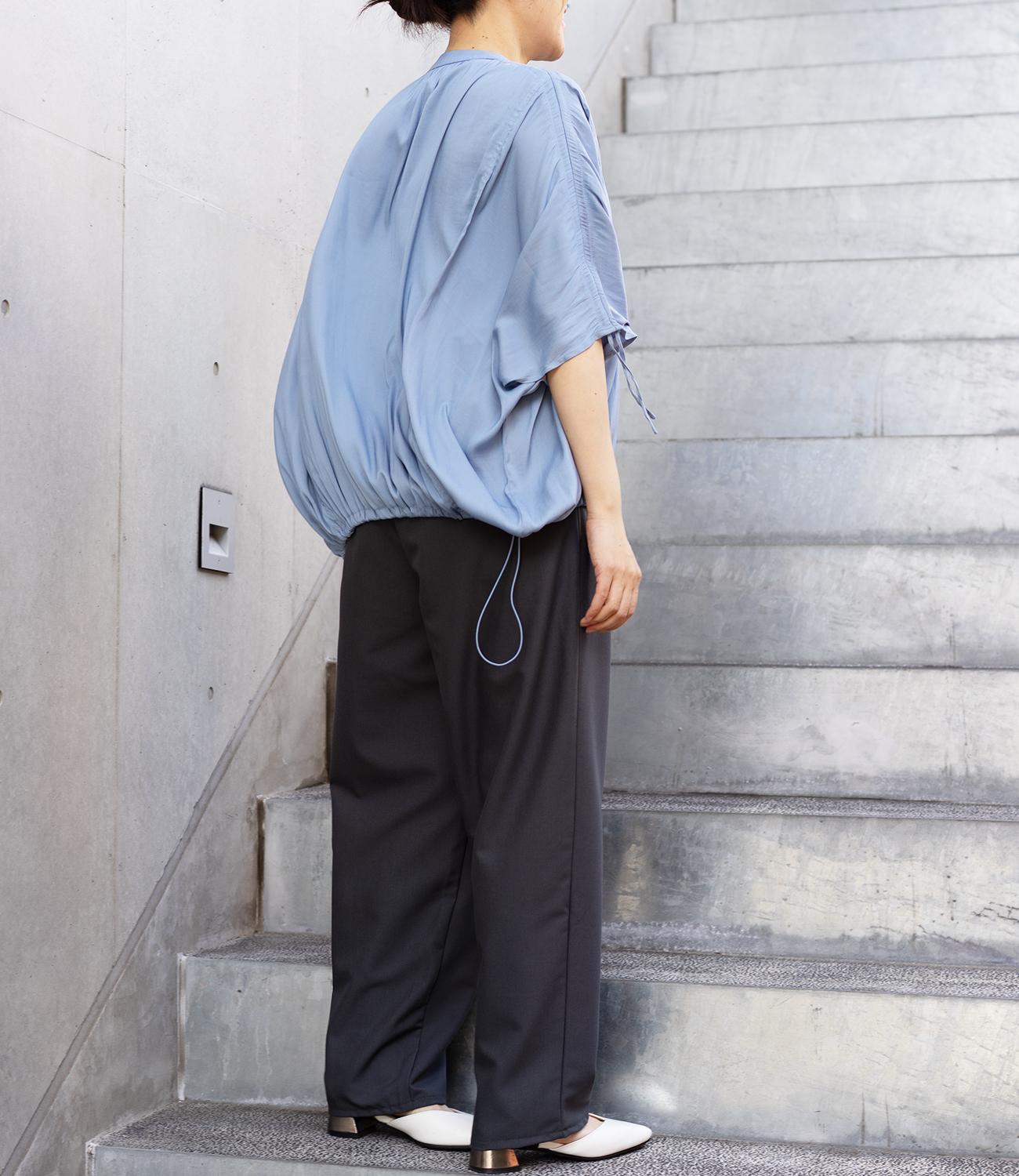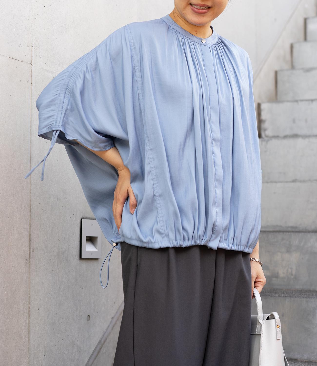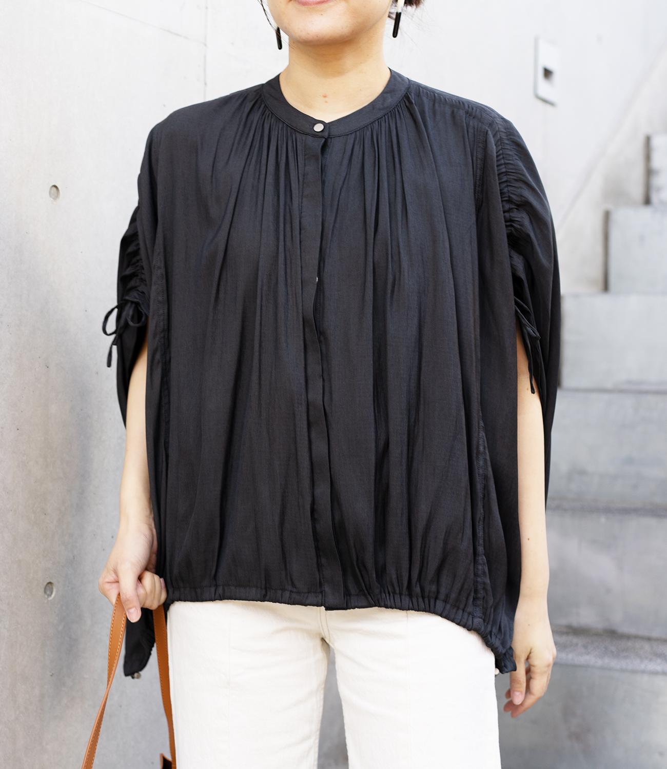 裾にはドロストを採用しボトムスに合わせて調整可能。肩上にあるギャザーリボンを絞ってお好みの袖丈にもできる表情豊かな一枚です。