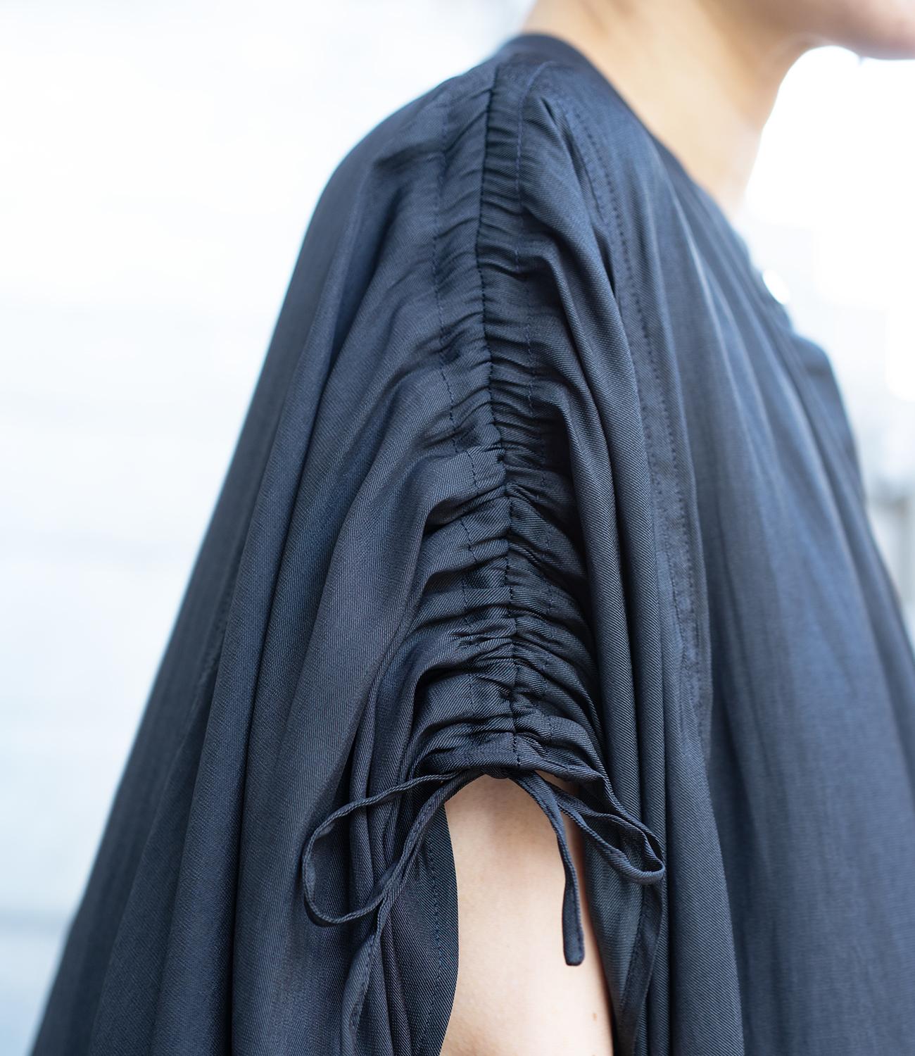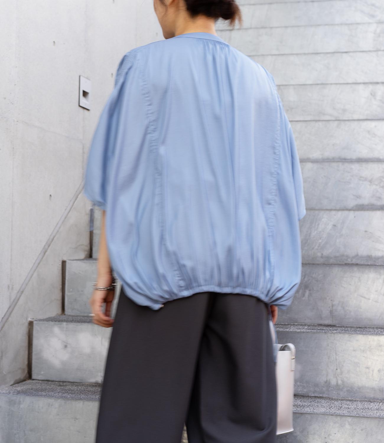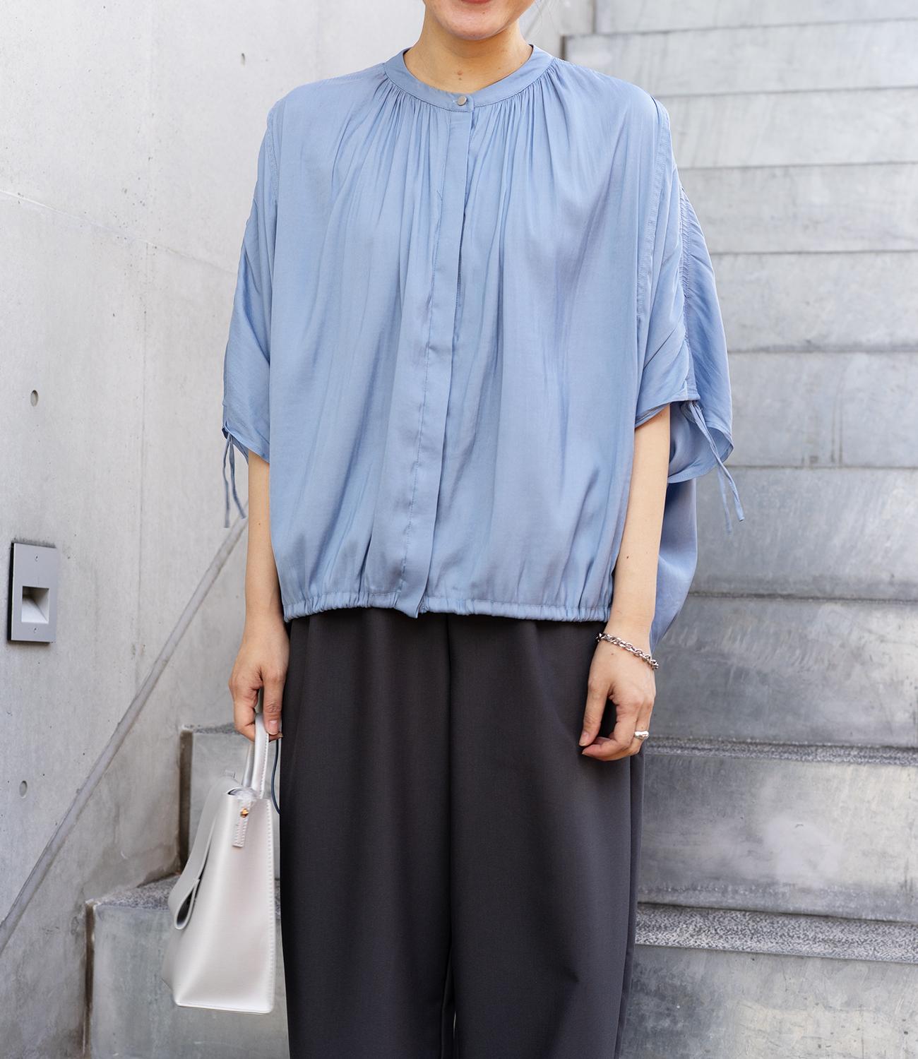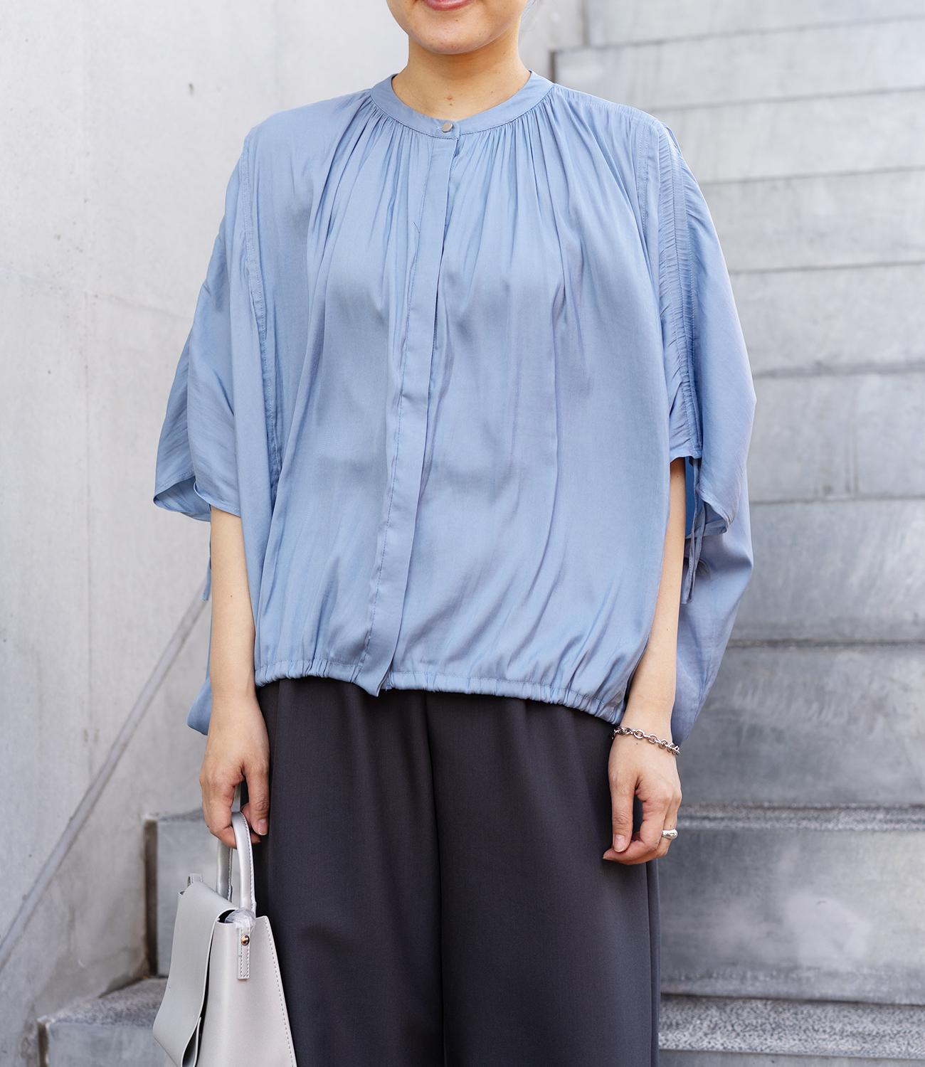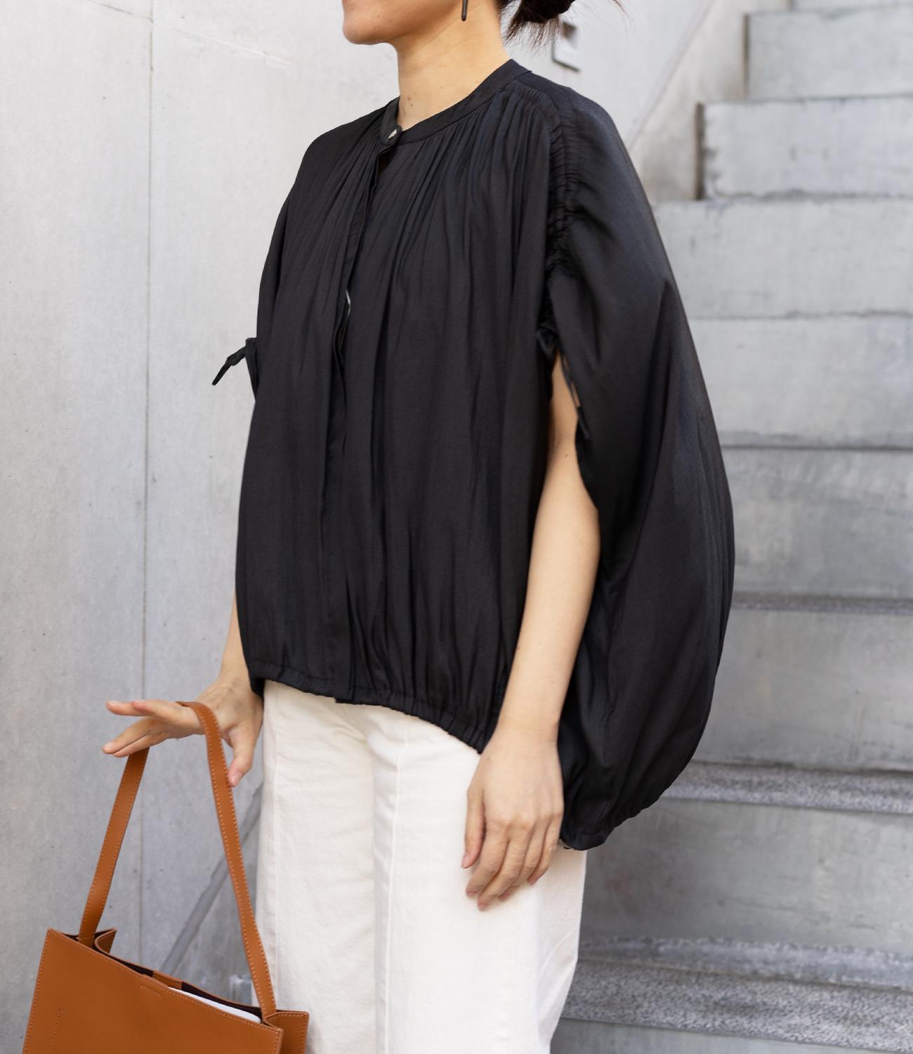 裾にはドロストを採用しボトムスに合わせて調整可能。肩上にあるギャザーリボンを絞ってお好みの袖丈にもできる表情豊かな一枚です。
