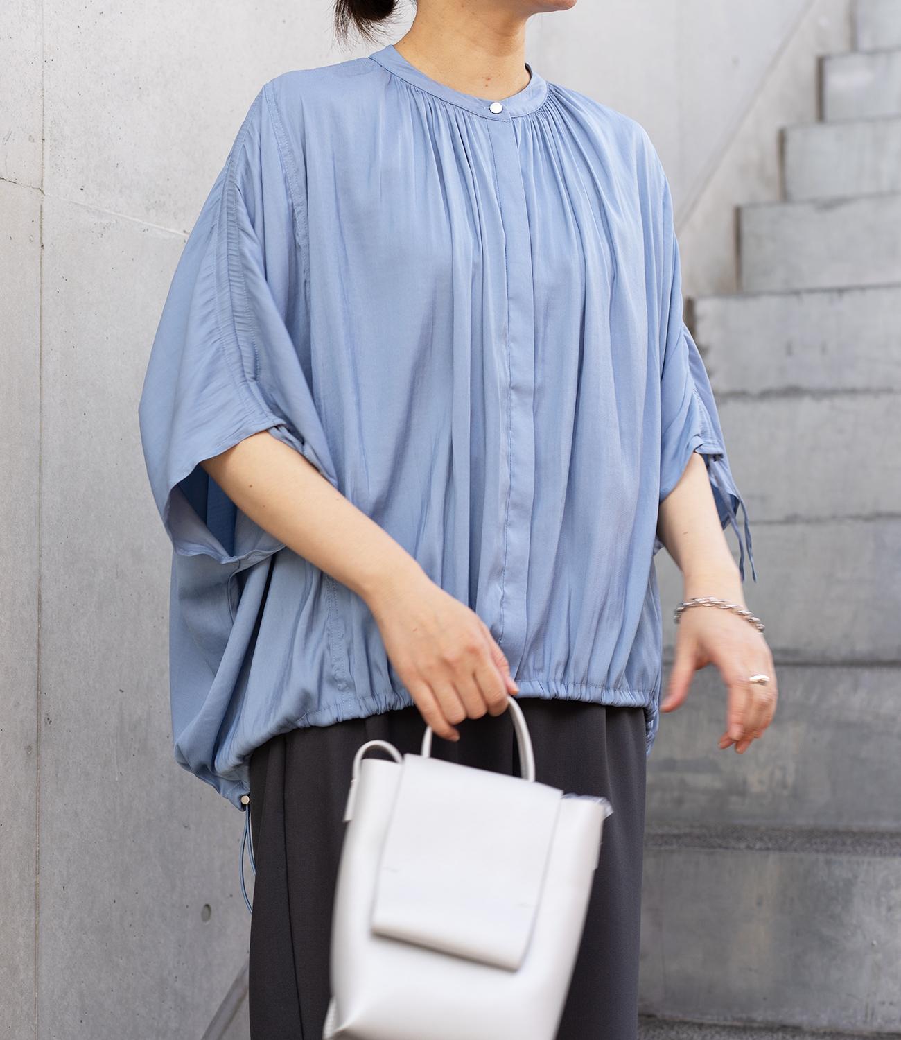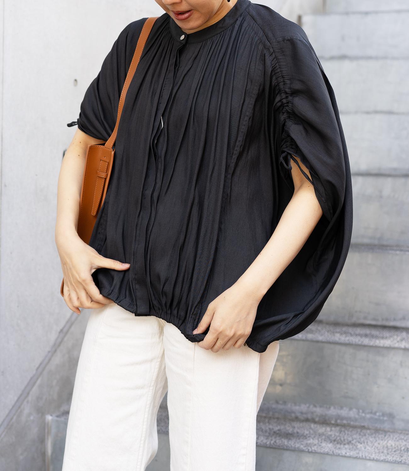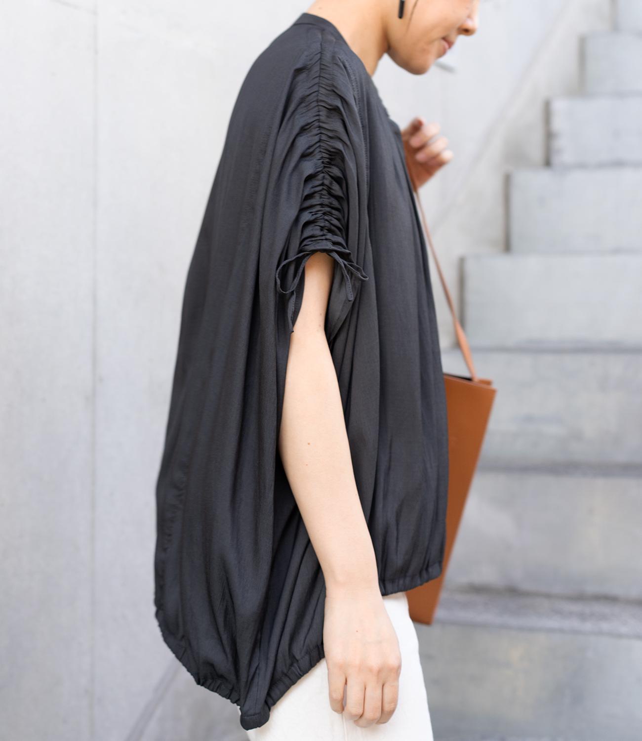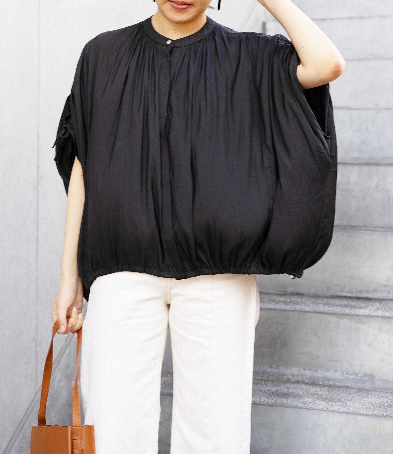 裾にはドロストを採用しボトムスに合わせて調整可能。肩上にあるギャザーリボンを絞ってお好みの袖丈にもできる表情豊かな一枚です。