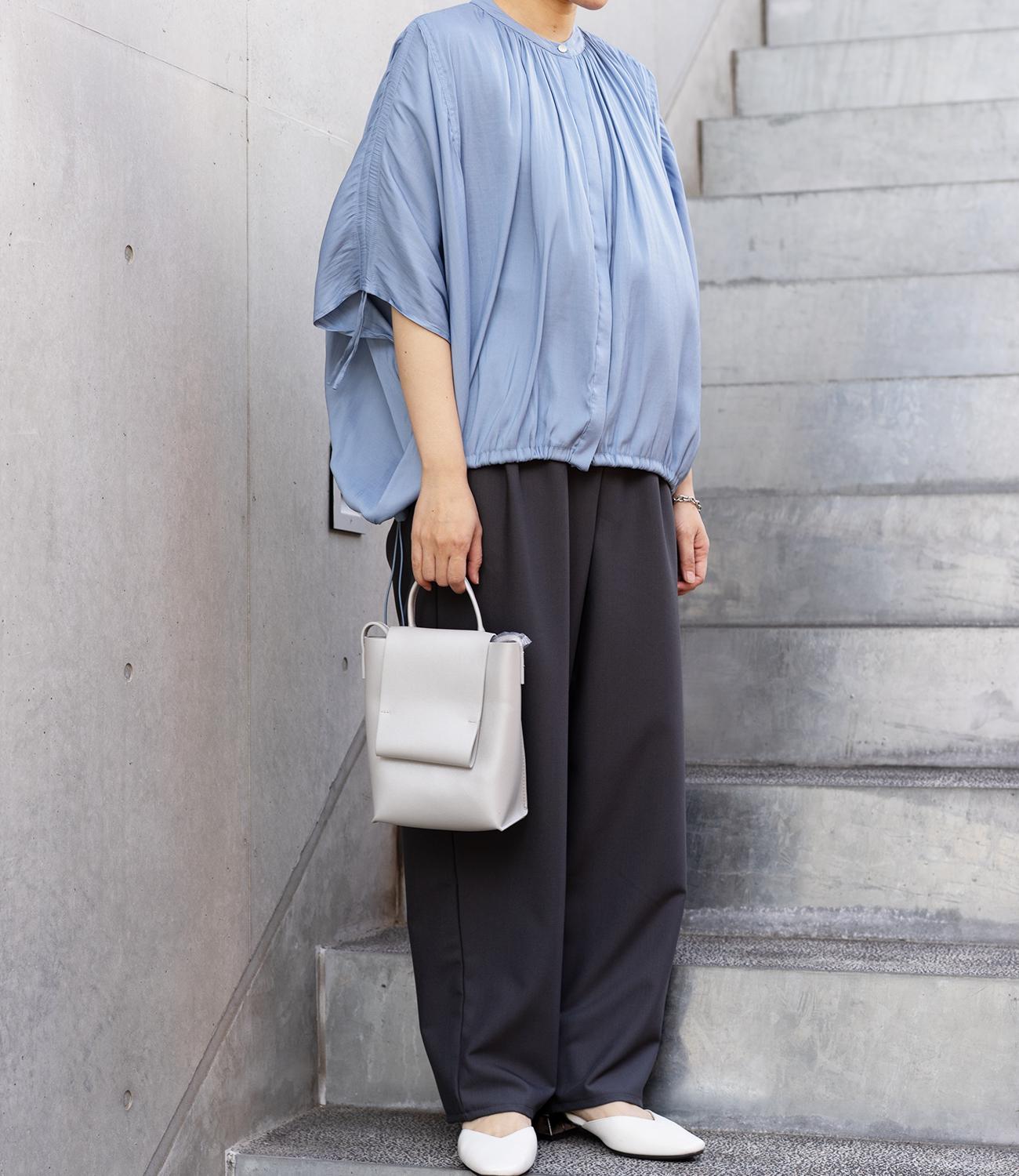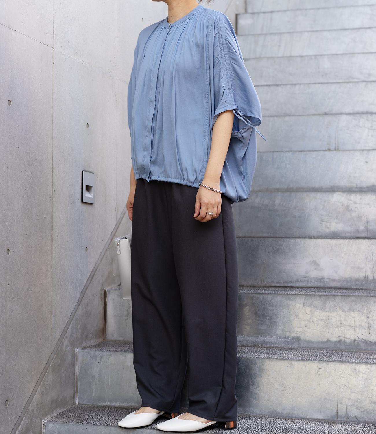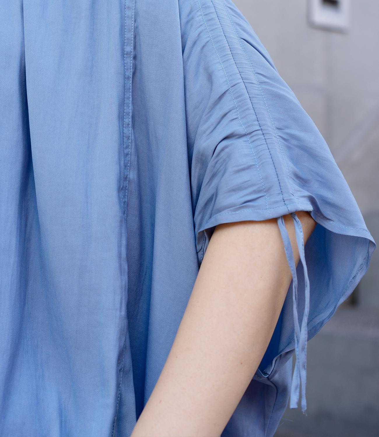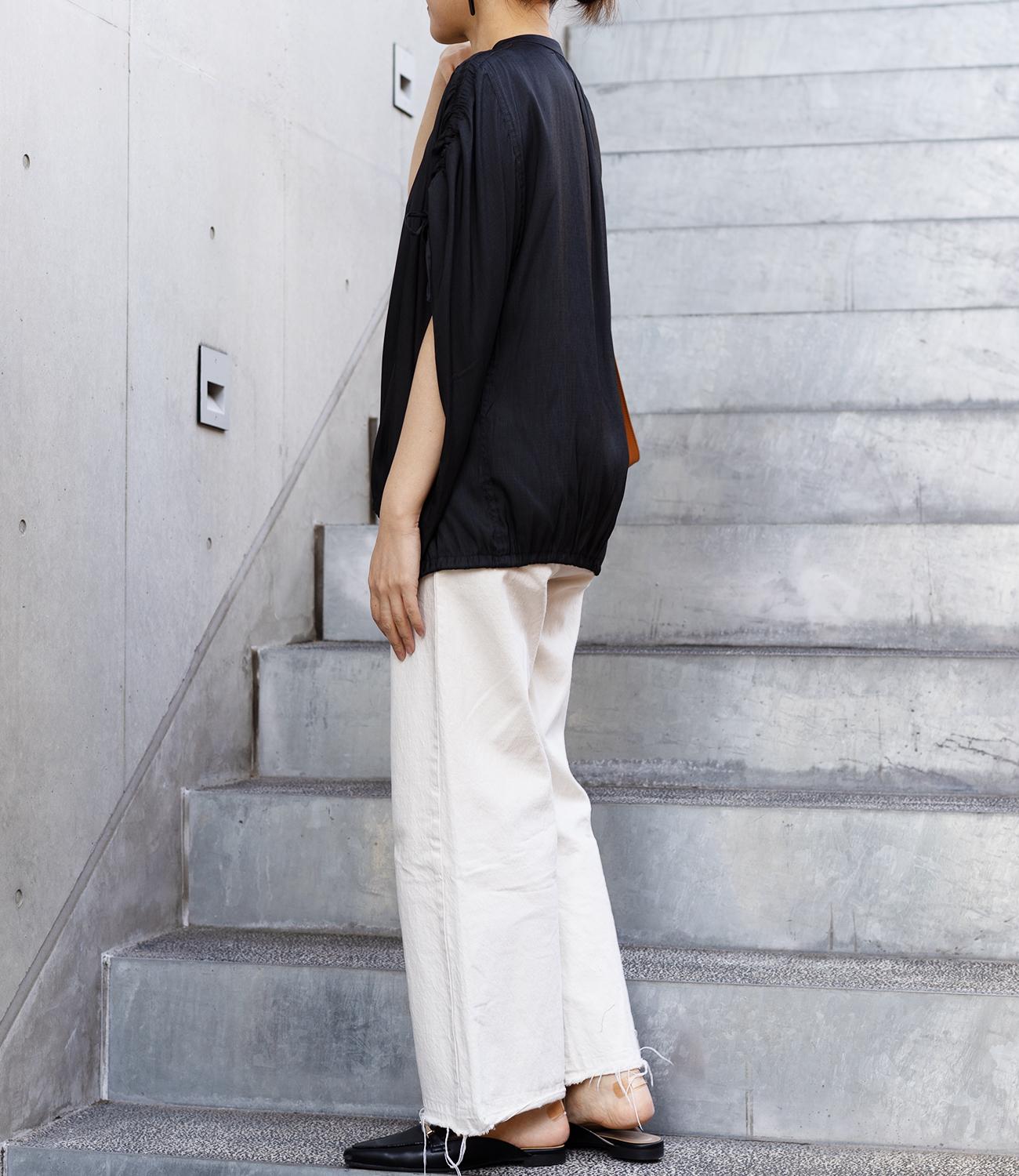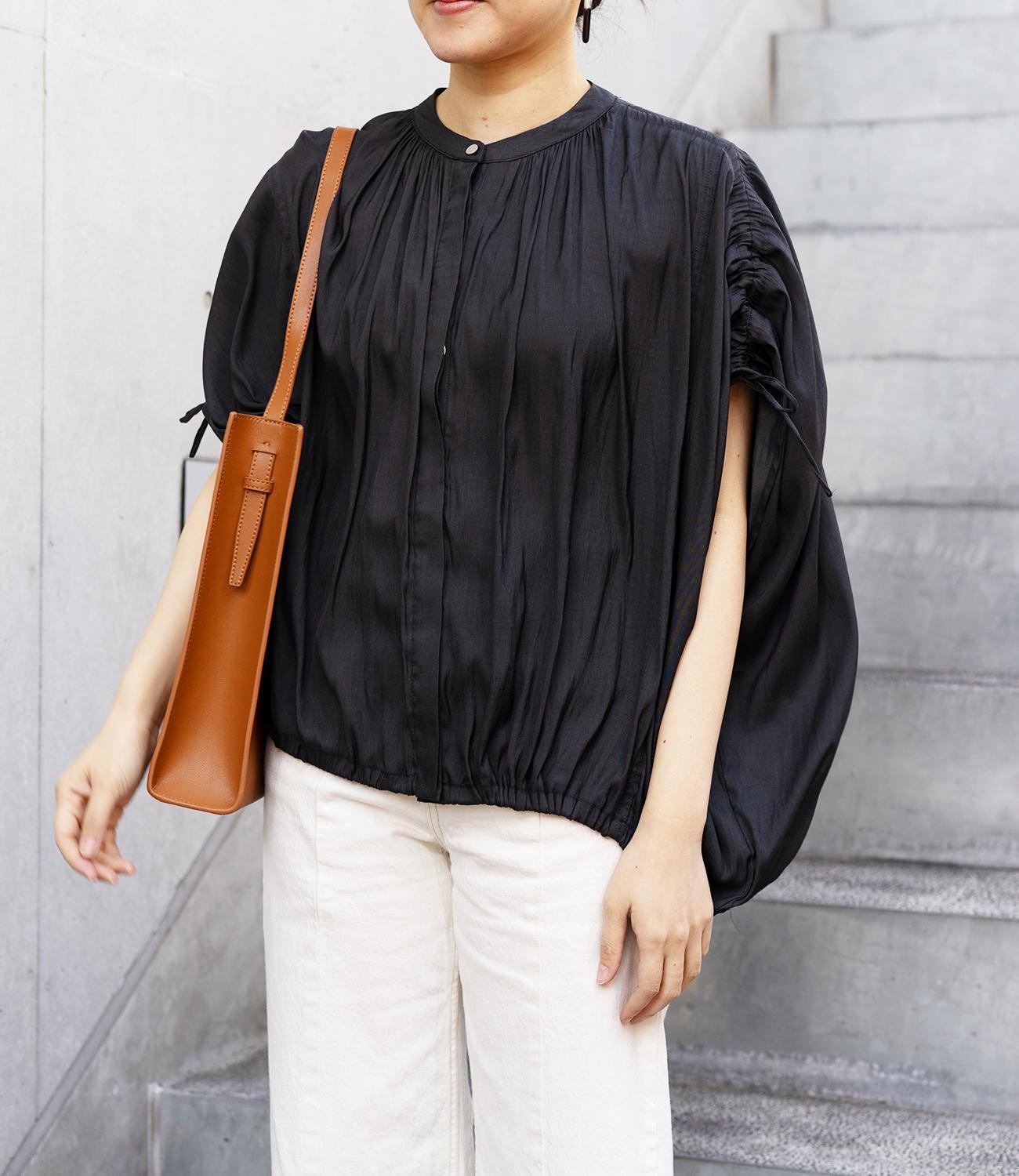 裾にはドロストを採用しボトムスに合わせて調整可能。肩上にあるギャザーリボンを絞ってお好みの袖丈にもできる表情豊かな一枚です。
