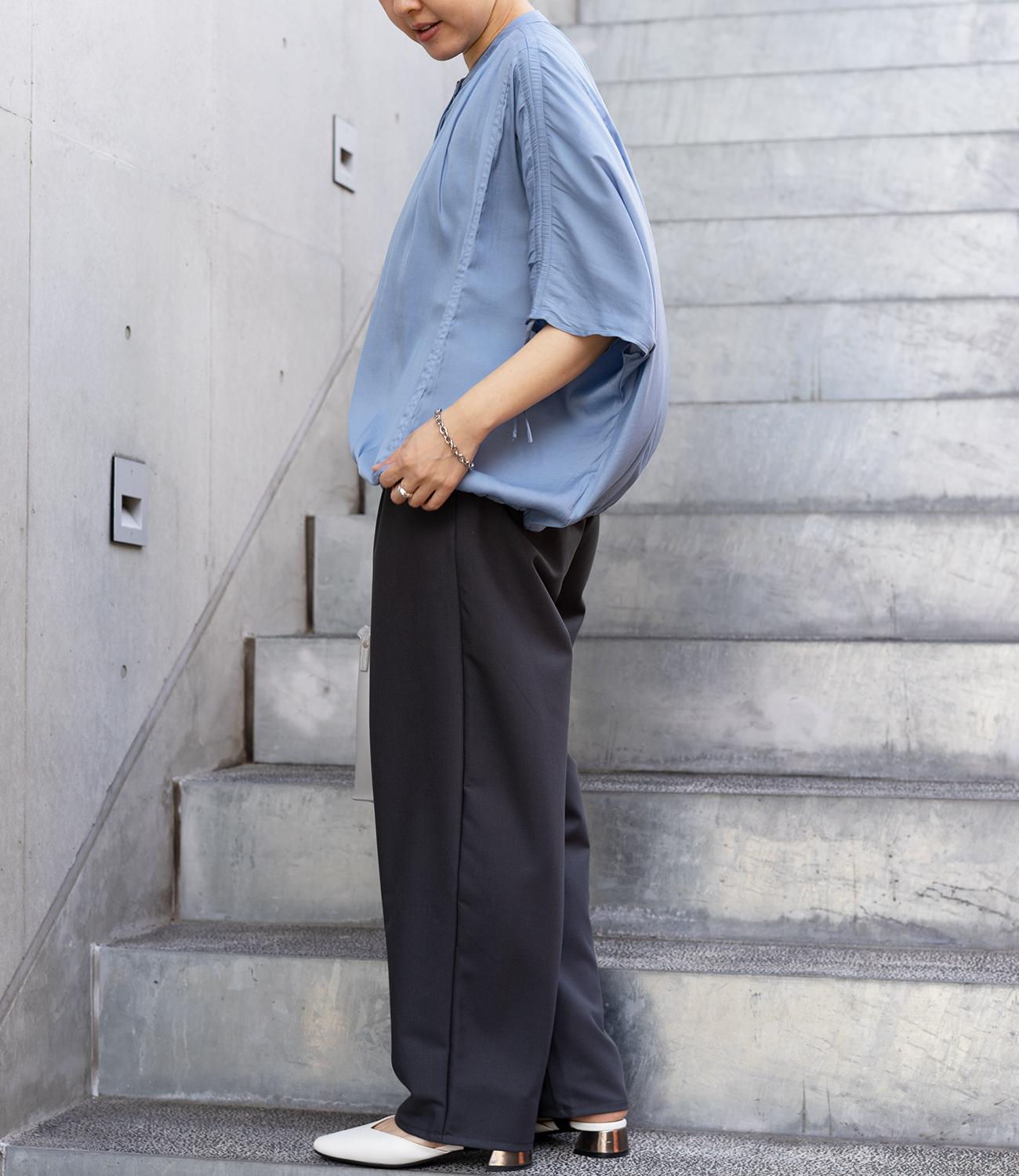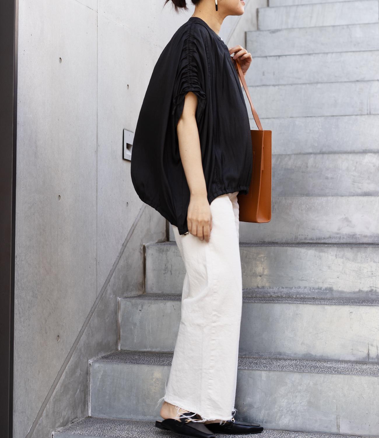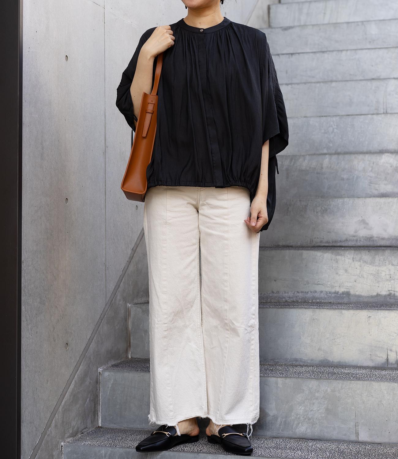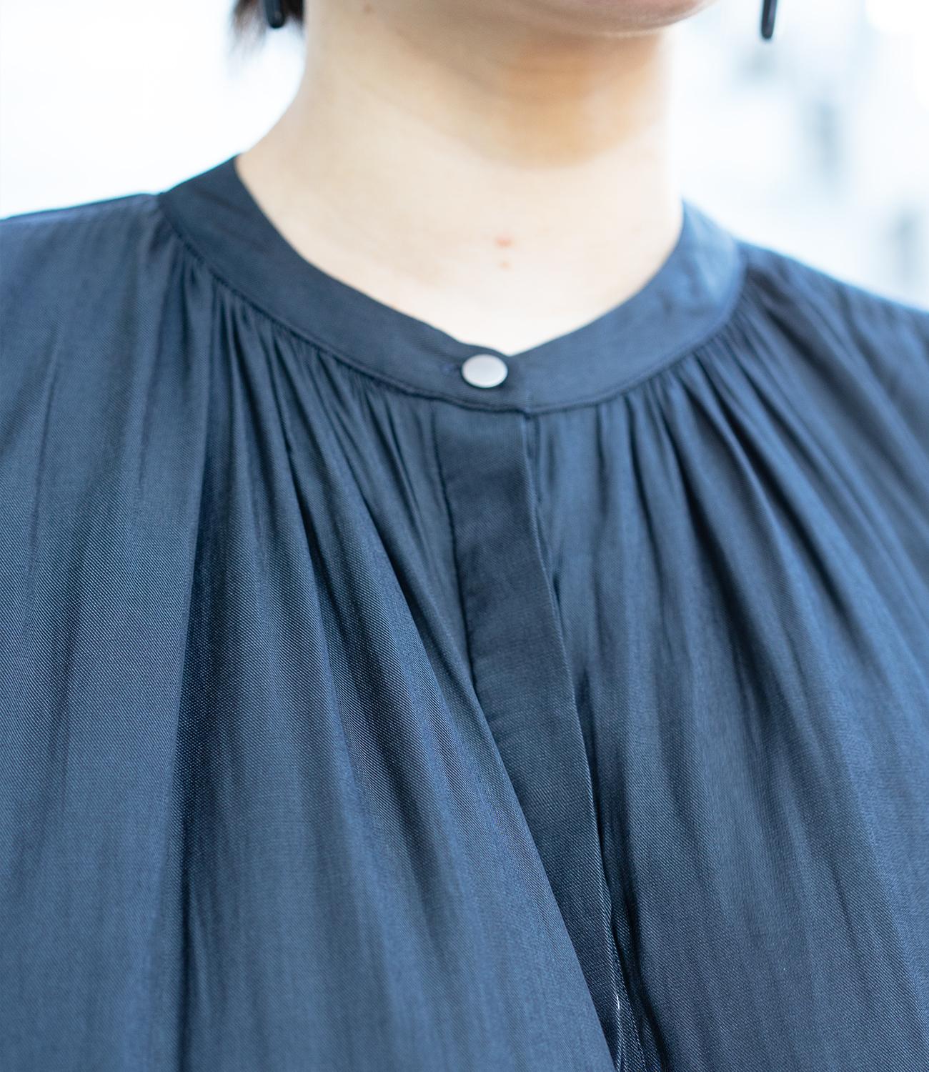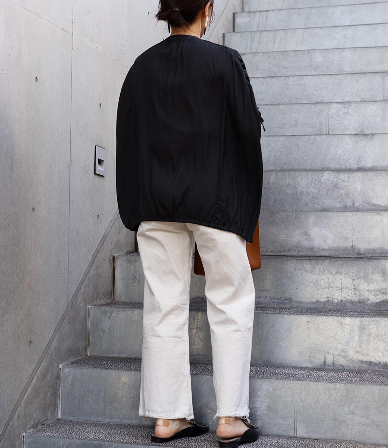 裾にはドロストを採用しボトムスに合わせて調整可能。肩上にあるギャザーリボンを絞ってお好みの袖丈にもできる表情豊かな一枚です。