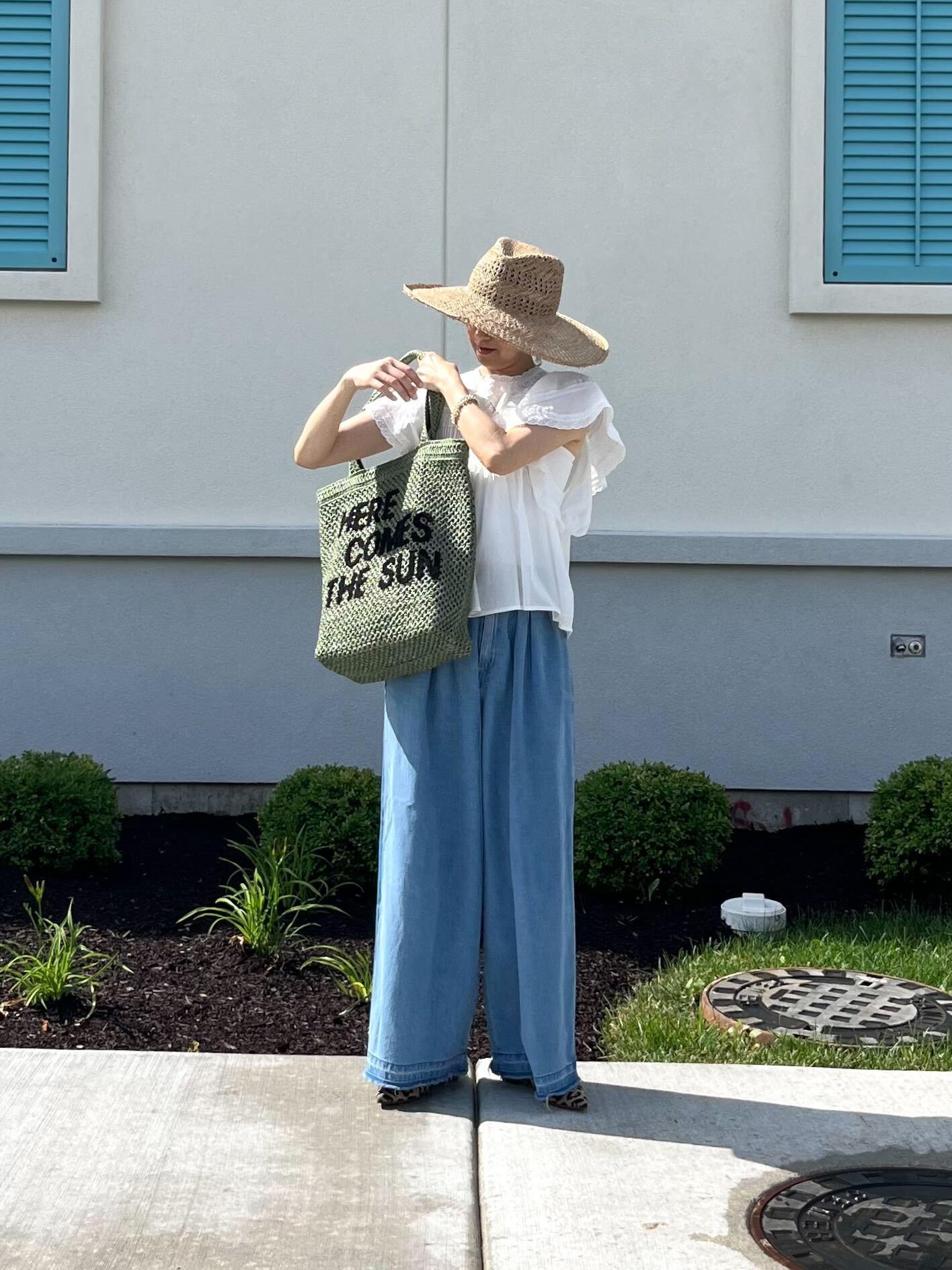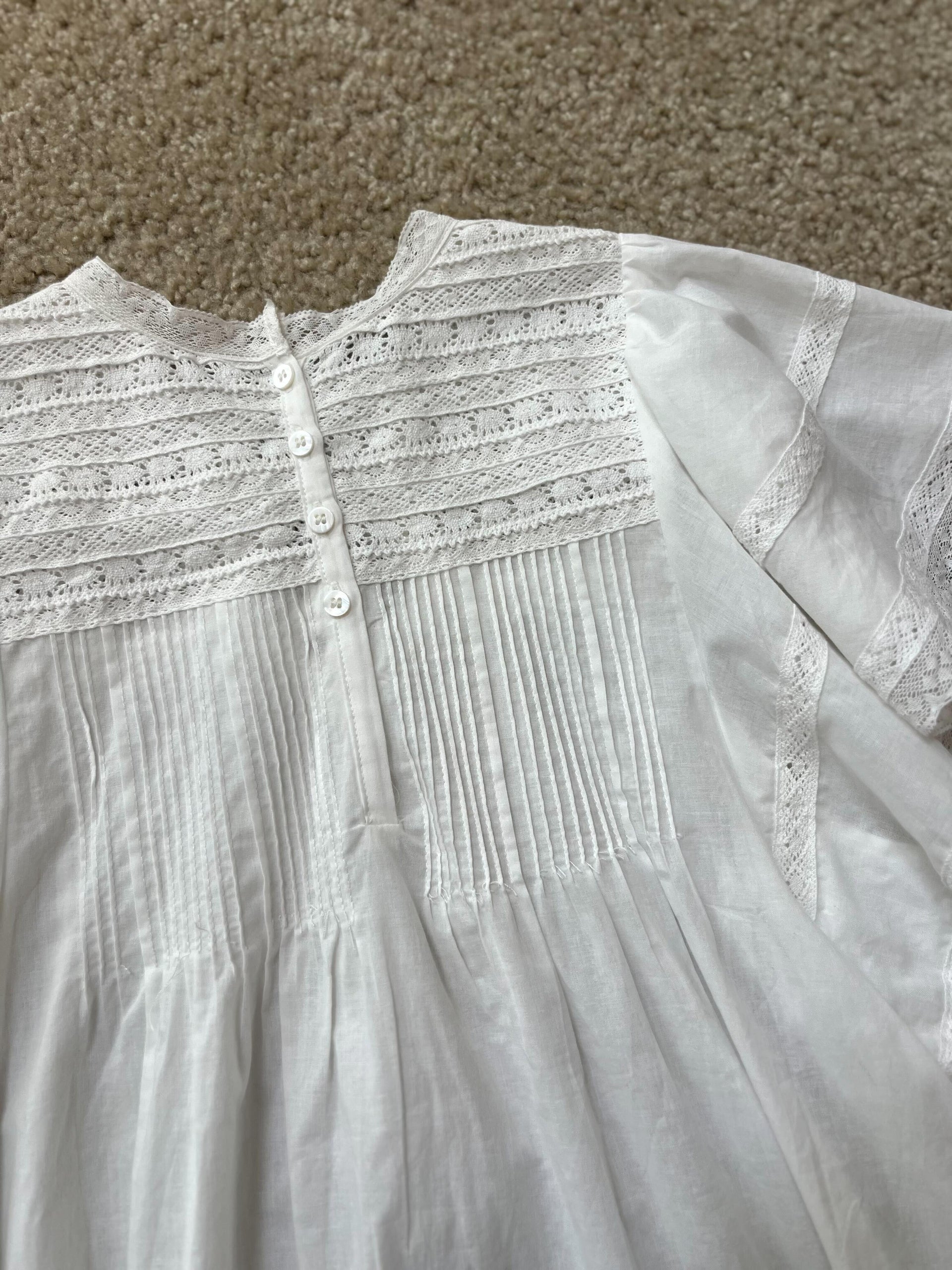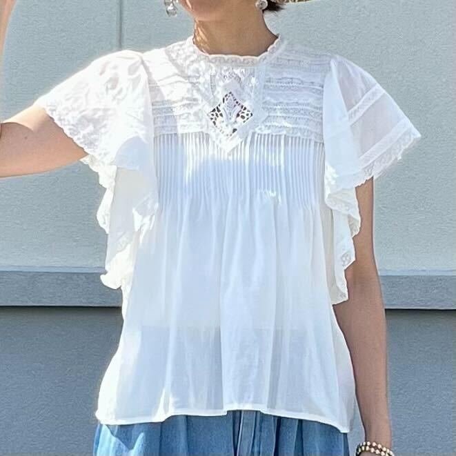 シンプルにデニムや、どんな色のパンツを合わせても清潔感あるフェミニンさをプラスしてくれます。幾重にも重ね縫われた胸元のレースとピンタックで十分華やかなのでノーアクセサリーでもコーディネートが完成します。