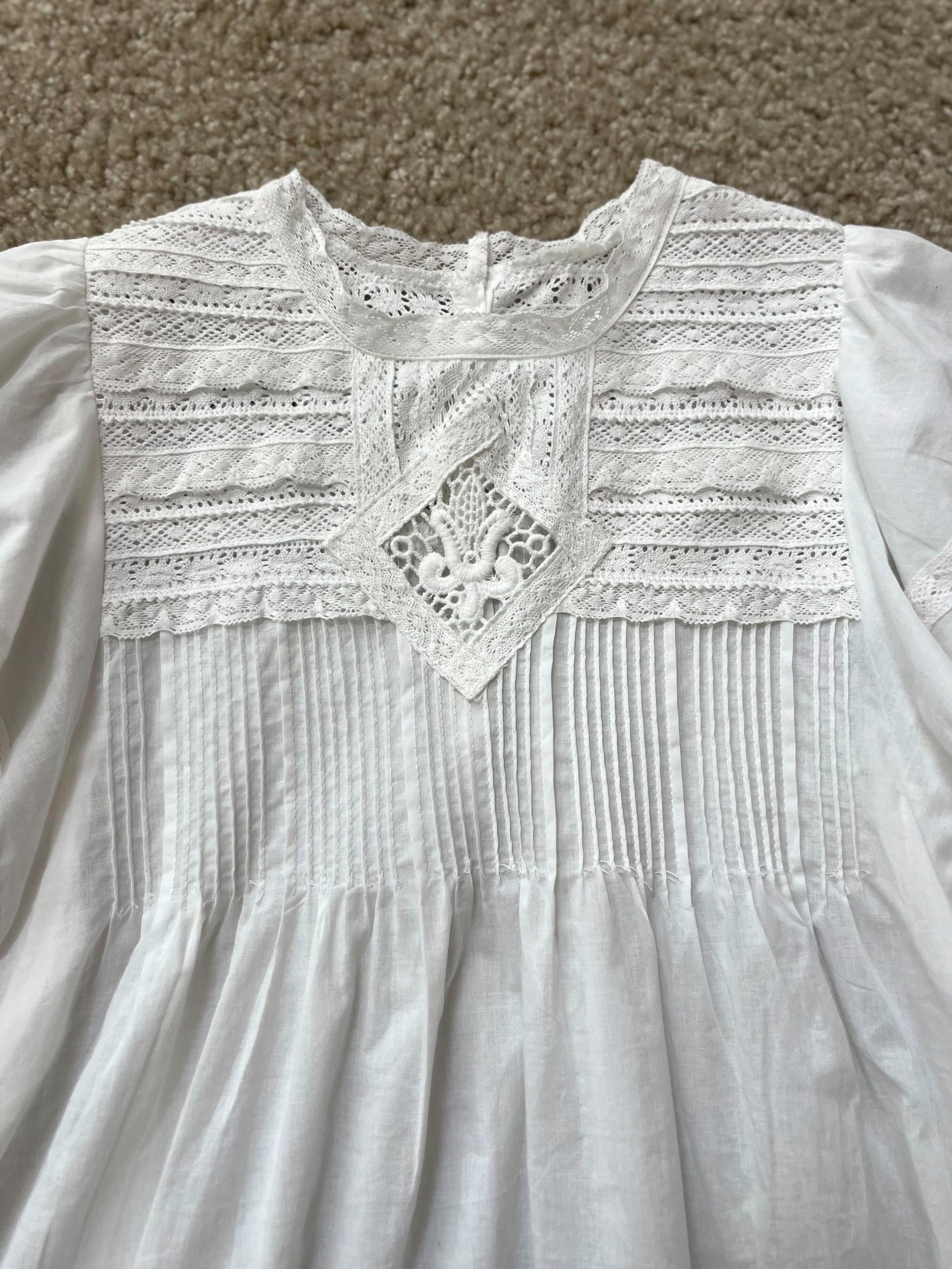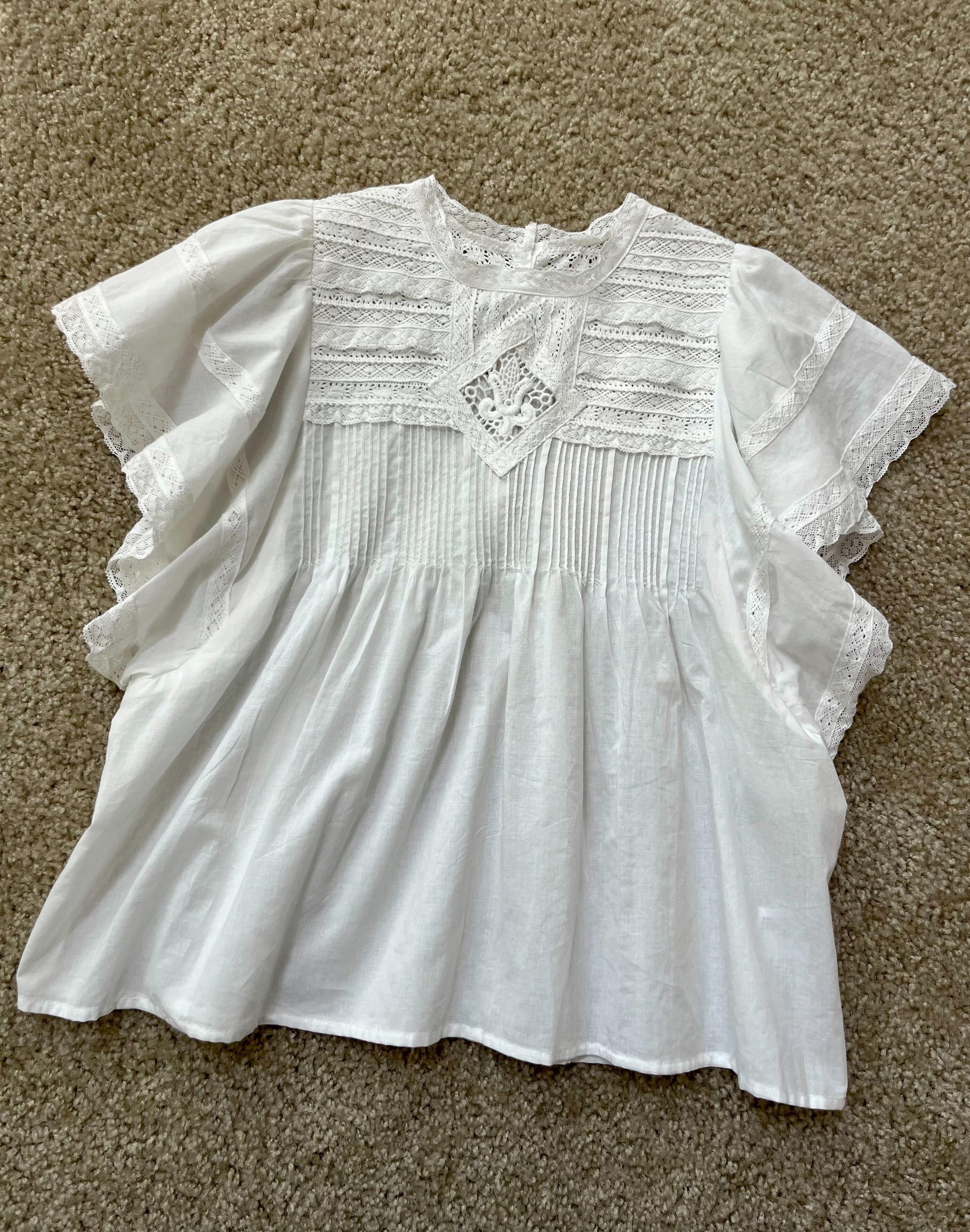 繊細な白糸刺繍と透かし模様のカットワークが後ろまで贅沢にほどこされたレースブラウス。