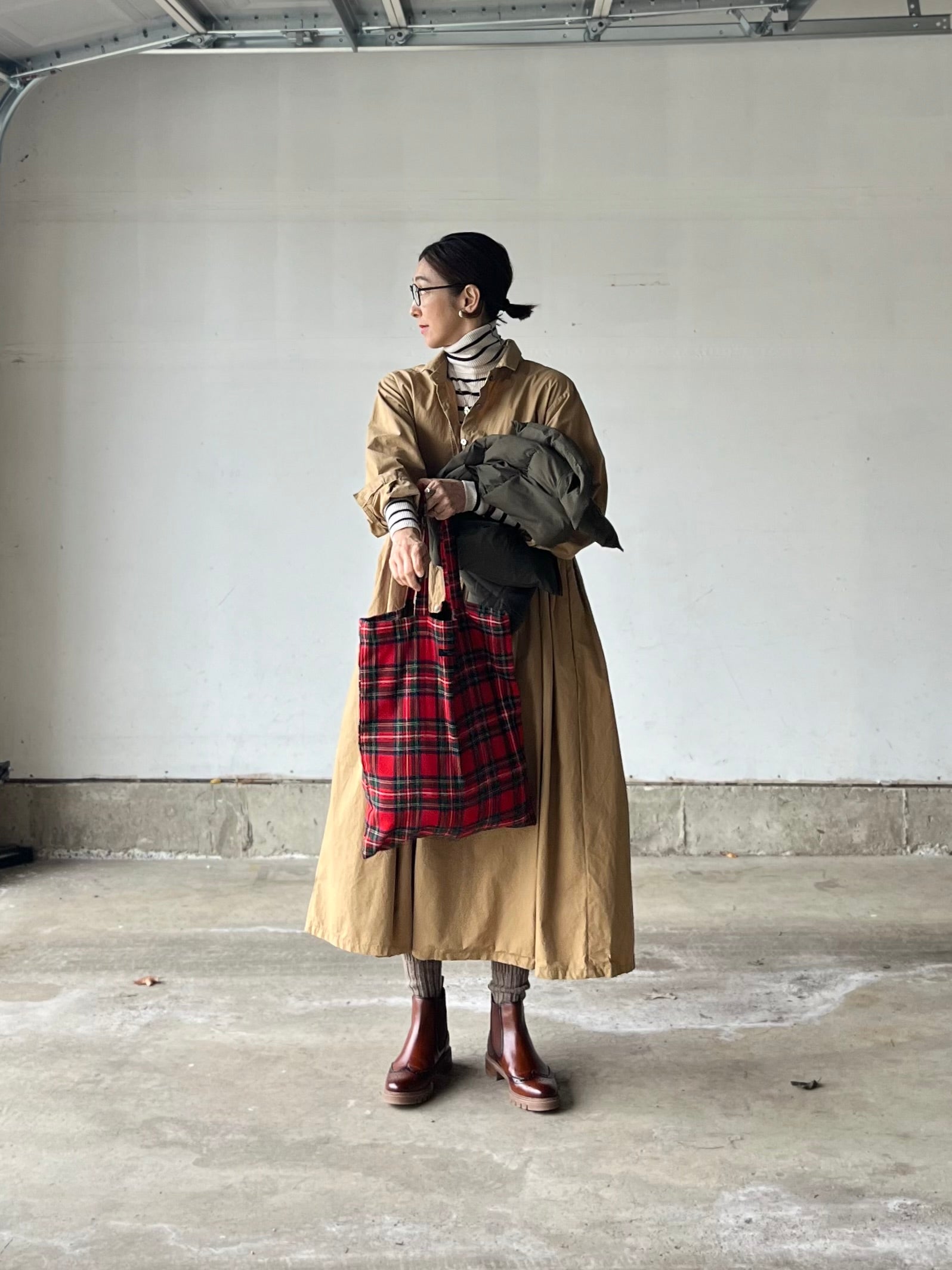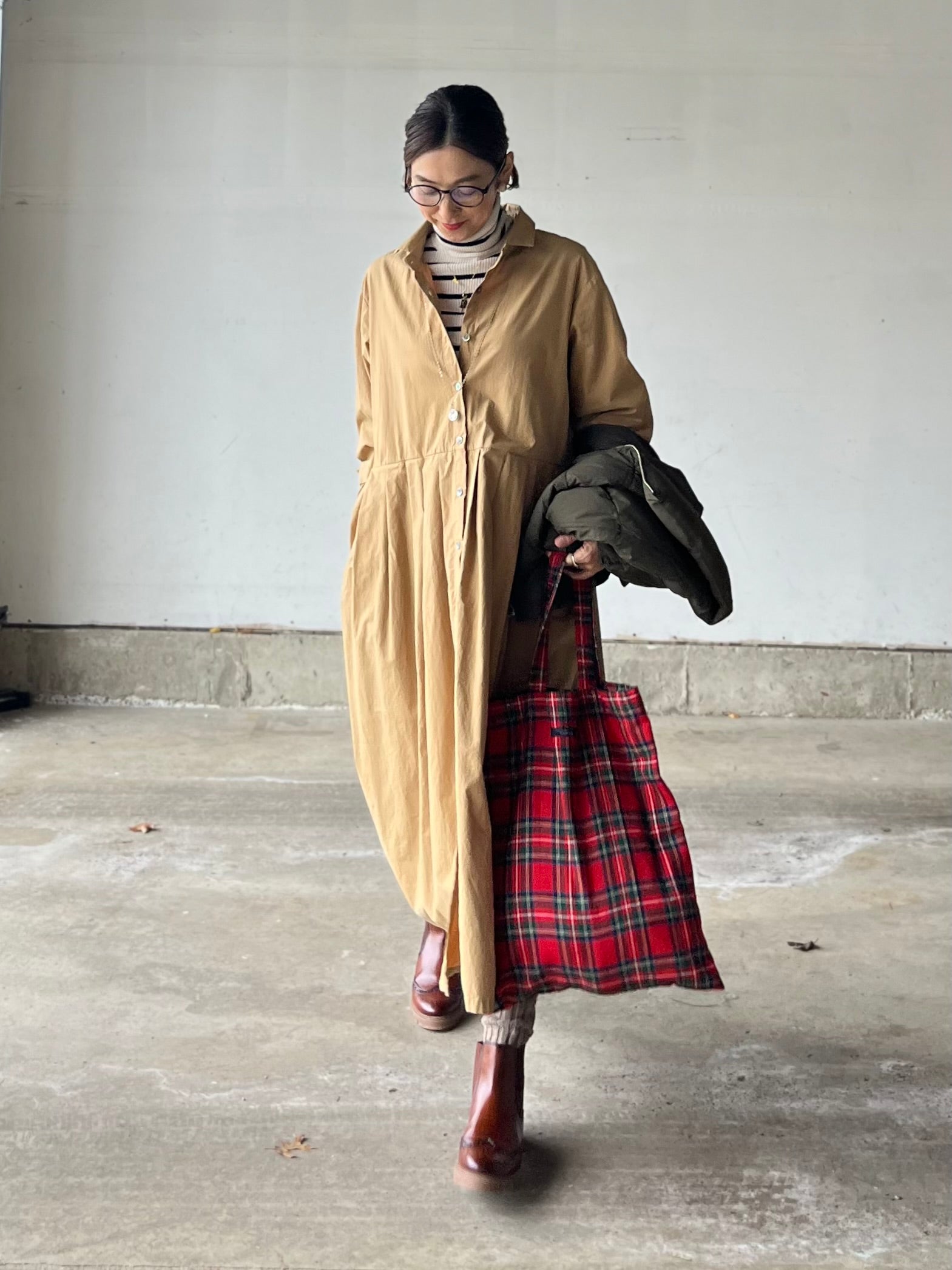 シンプルなシャツワンピースは、今の時期からファージレやダウンベストを組み合わせたり、ブーツやフラットシューズなど合わせる小物次第でいろいろ遊べます。