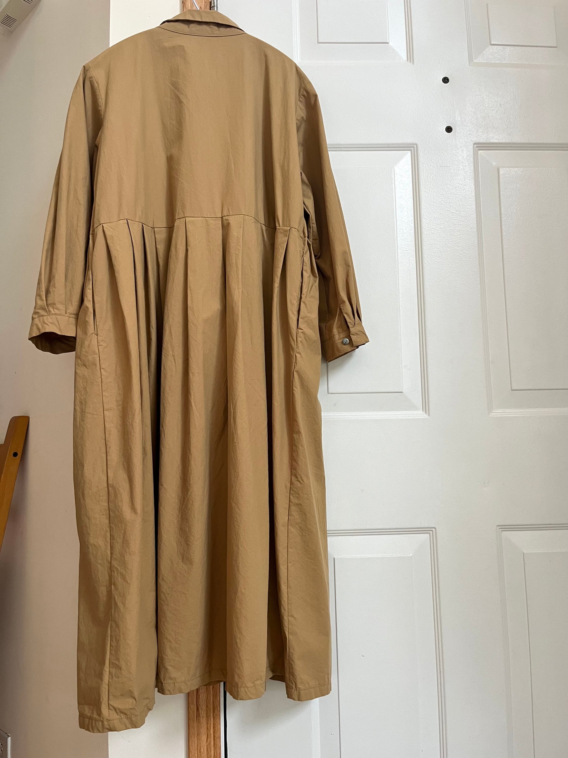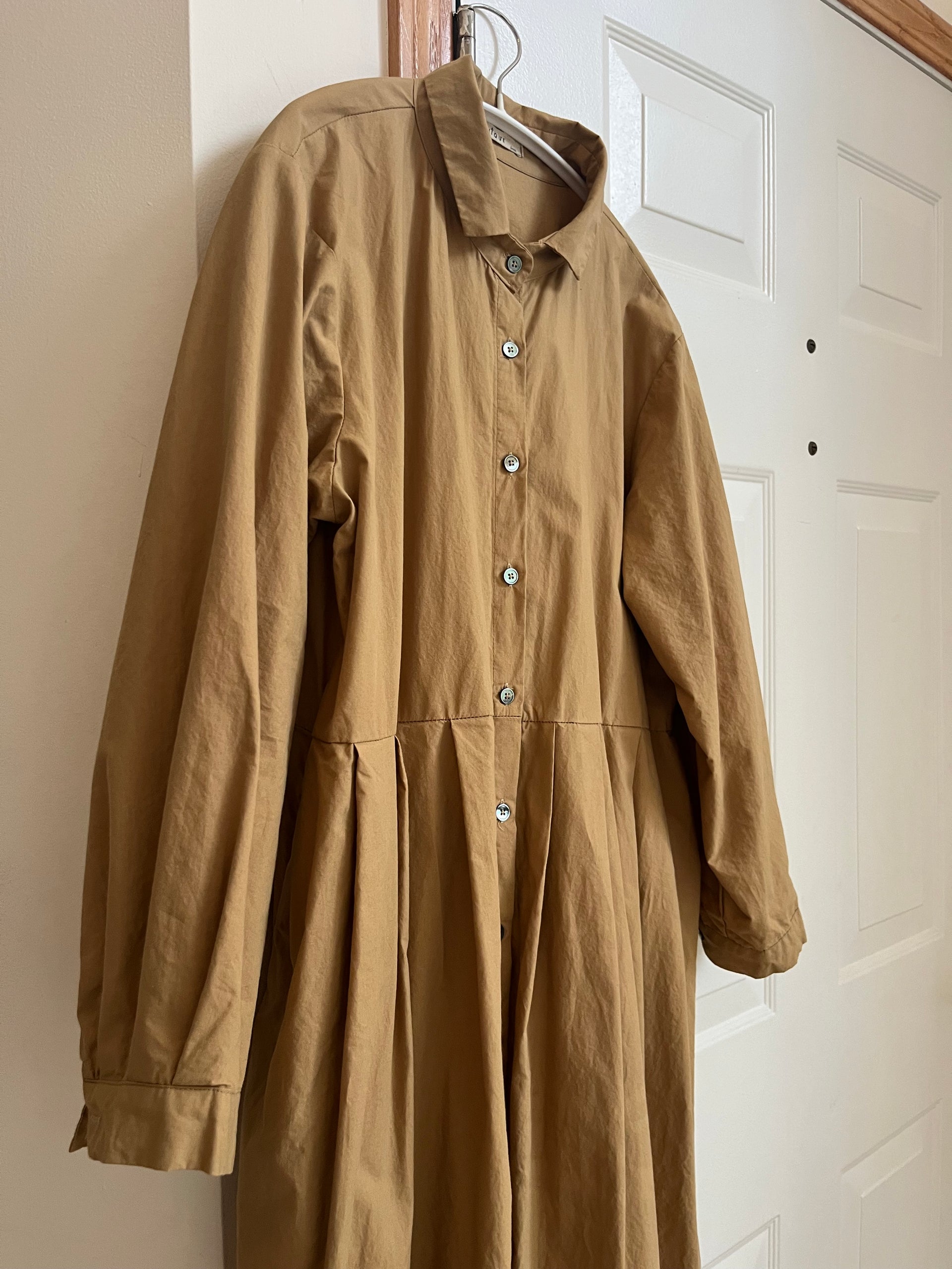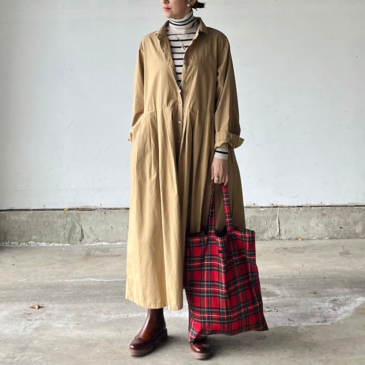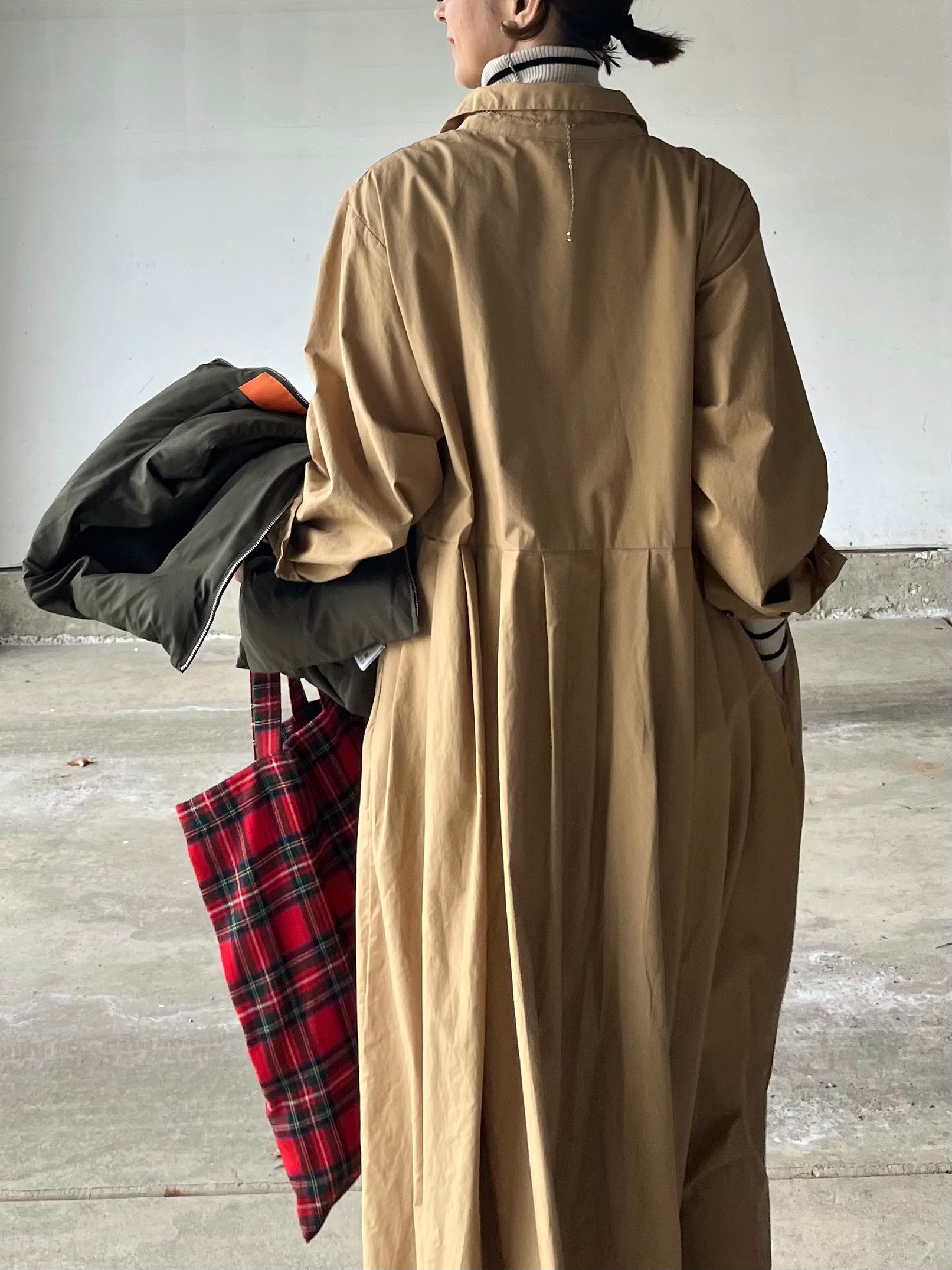程よいハリ感のあるコットン素材を使用した、キャメルベージュのシャツワンピース。