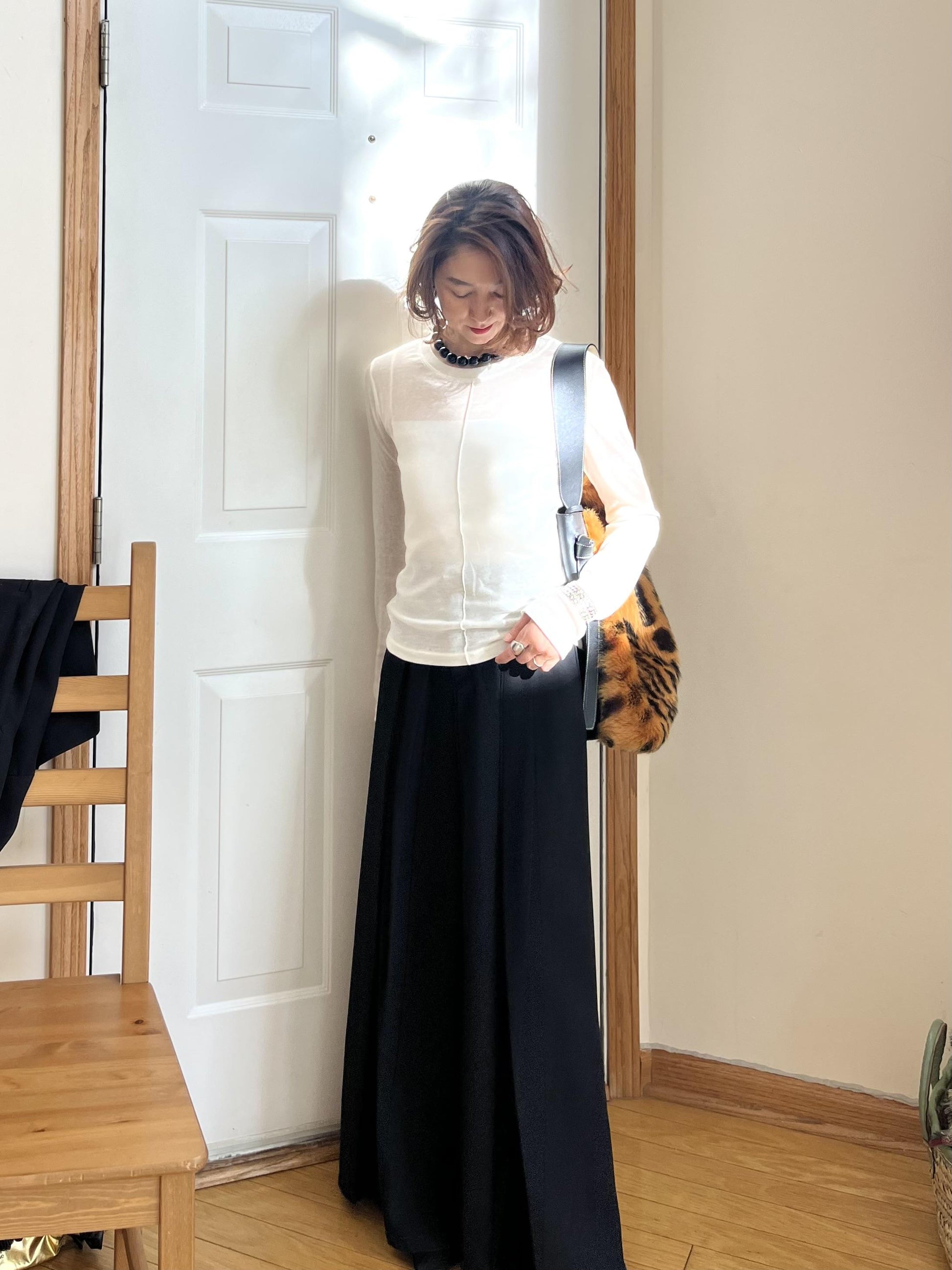 テンセルのなめらかな肌触りと落ち感に、ウールのやさしい温かみがプラスされたシンプルなロンTは、オフホワイト、グレー、ブラックの3色展開。