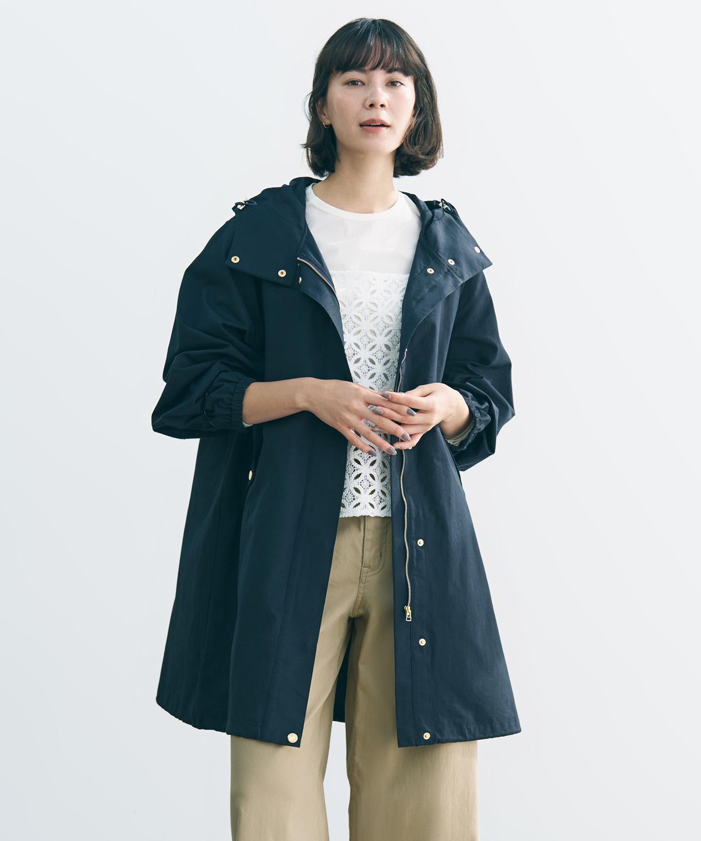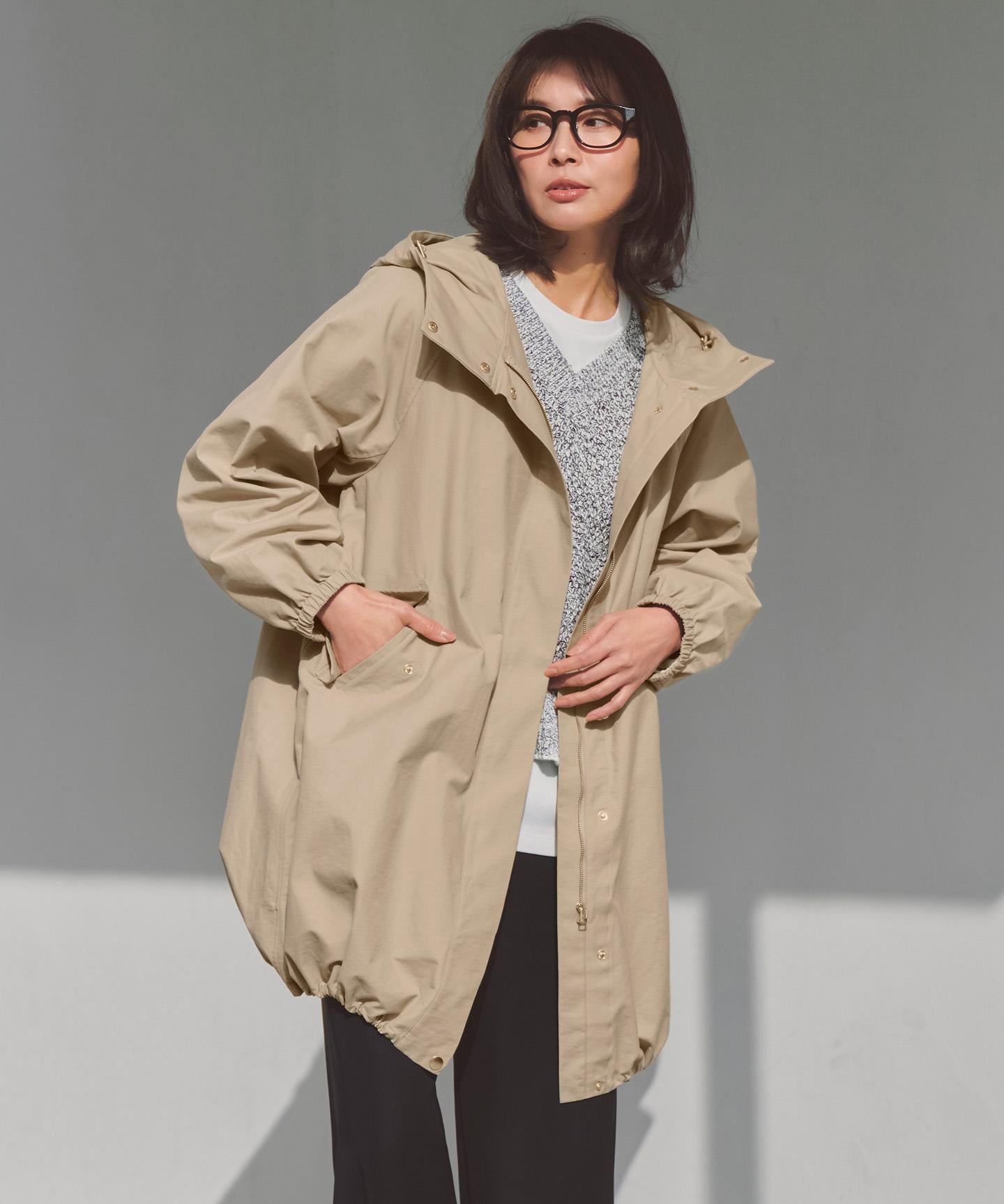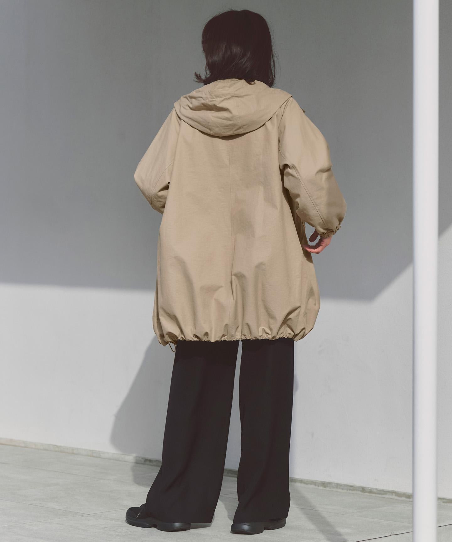 オーバーサイズのAラインシルエットが魅力のフーデッドコート。ミリタリーコートをベースに、緩やかなAラインシルエットやパフスリーブ、メタル釦をプラスして女性らしい印象に仕上げています。ヒップがすっぽり隠れる丈感で、インナーやボトムを選ばず着用いただけるバランスの良さもポイントです。フード口と裾に配したドローストリングをしぼって、シルエットのアレンジを楽しめます。前をあけてラフに羽織ったり、首元の釦をとめてモードな印象にするなど、着こなし方は自由自在です。カジュアルからきれいめまで、様々なシーンで活躍する1枚です。