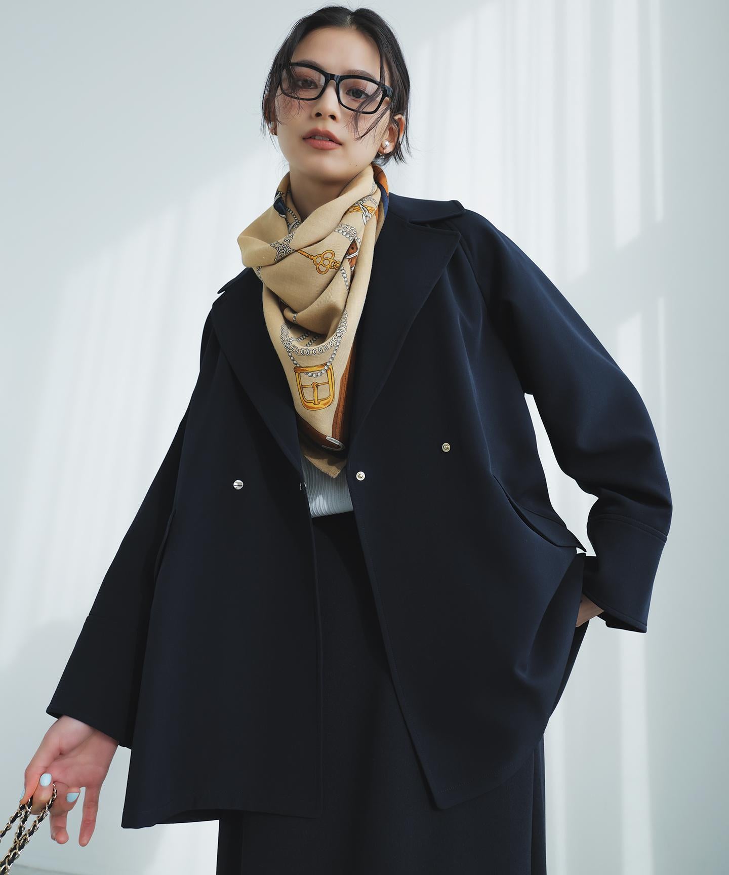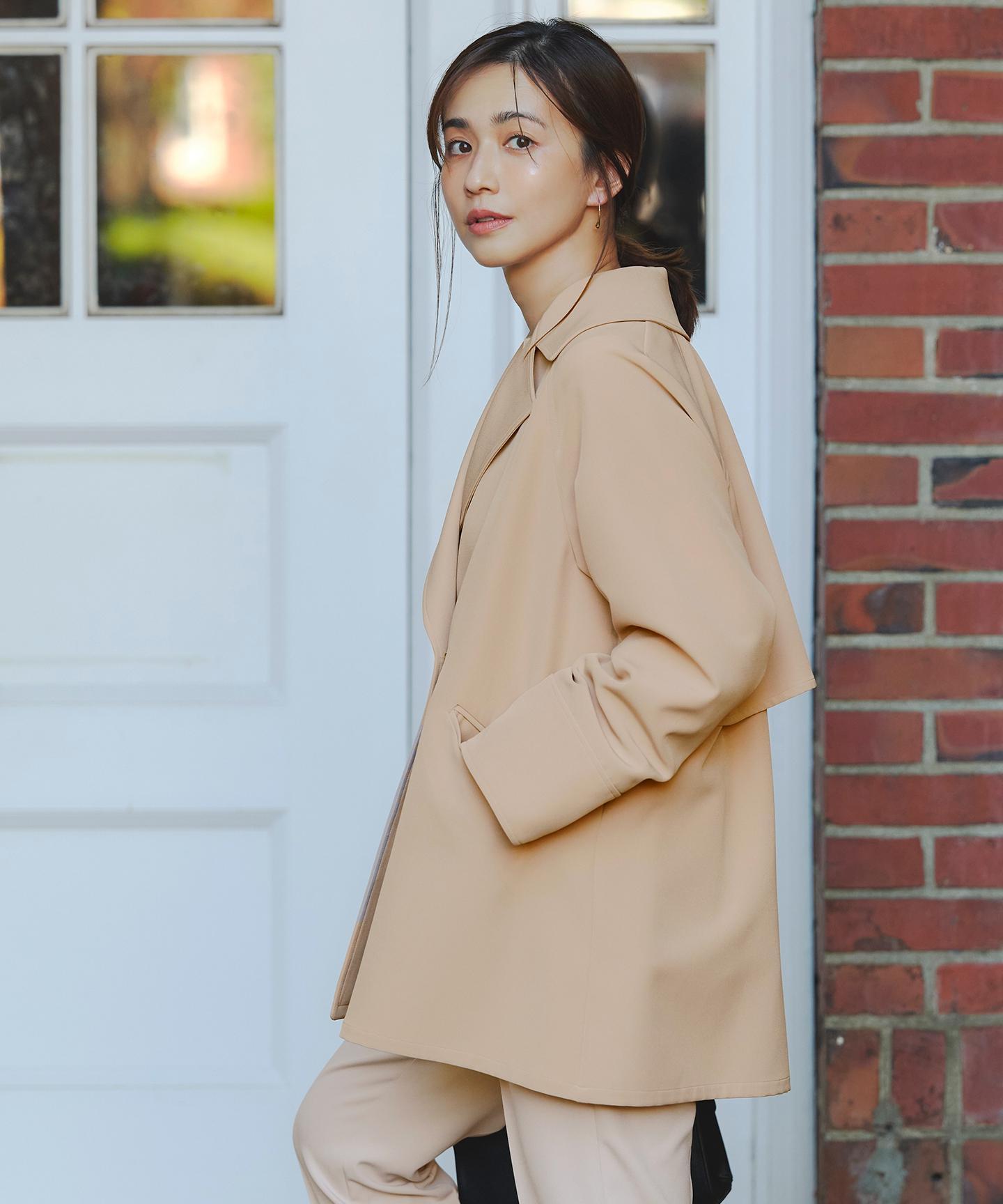 ・腰周りが隠れる丈感で、どんなボトムスともバランスよく合わせられる・厚手のトップスの上からも羽織れるゆとりのあるデザイン・ステンカラーにも出来る襟元2WAY仕様・背面のヨークとタックデザインでバックスタイルも着映える・太めカフスのツヤ感のあるドットボタンが女性らしいポイントに・袖丈が長い場合はドットボタンを開けて折り返して着用することも可能
