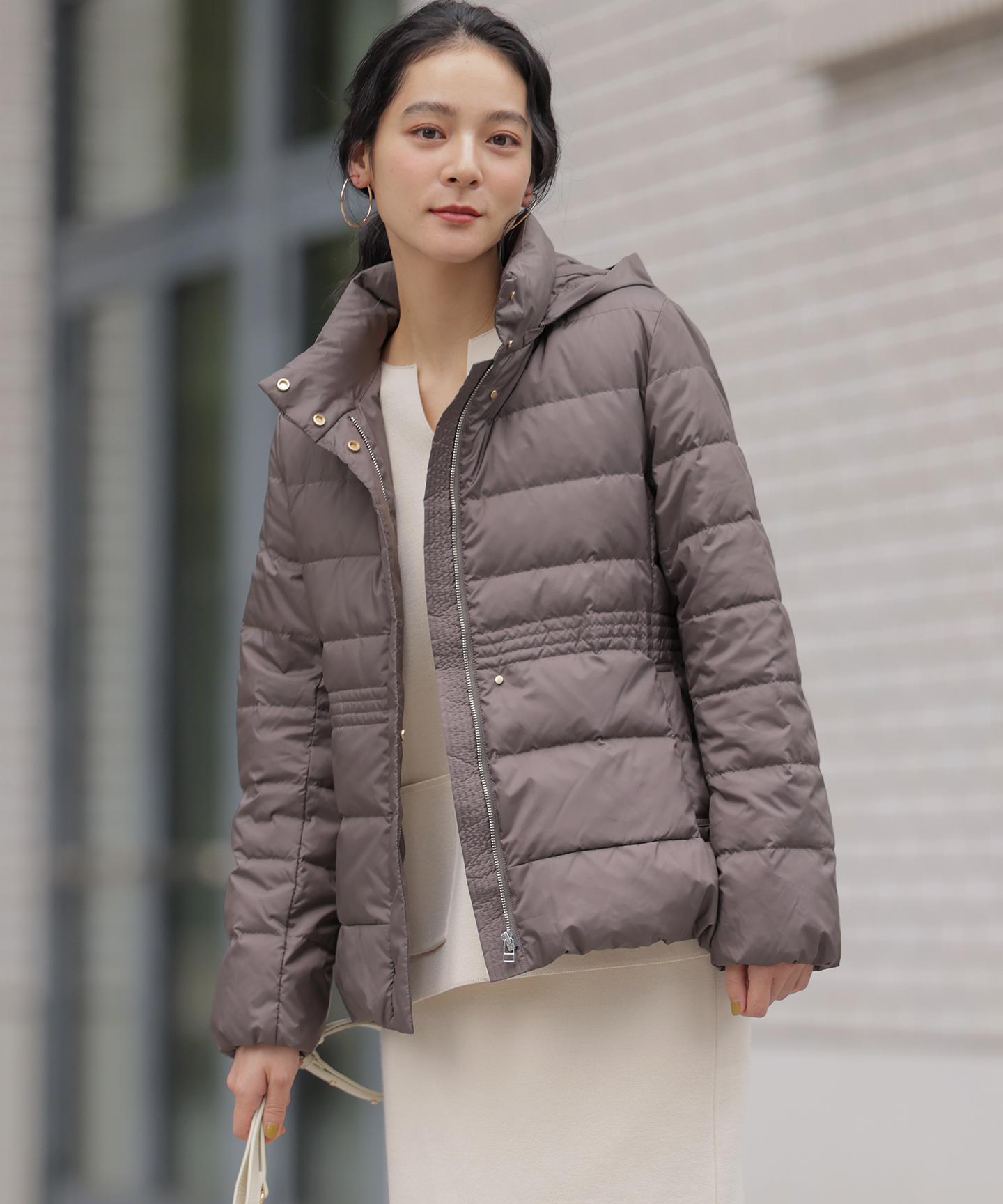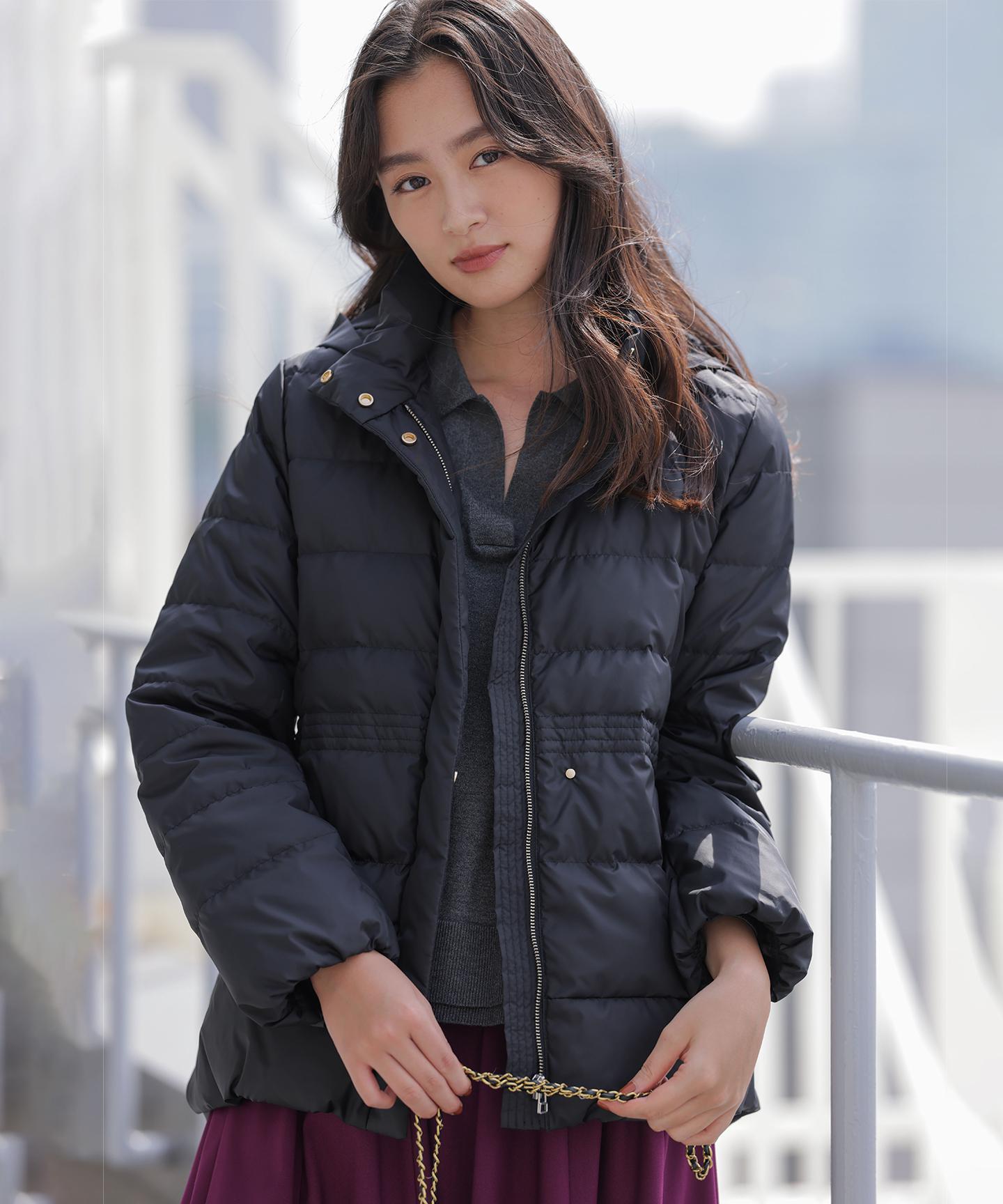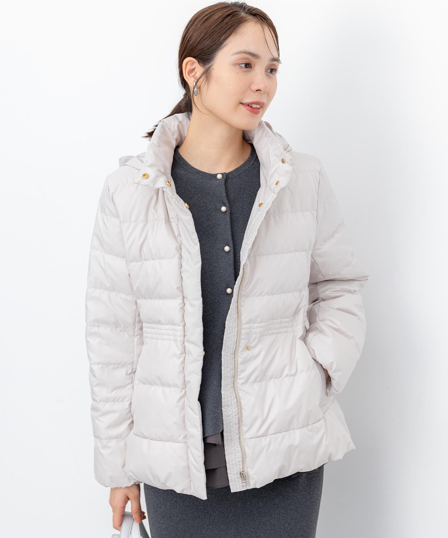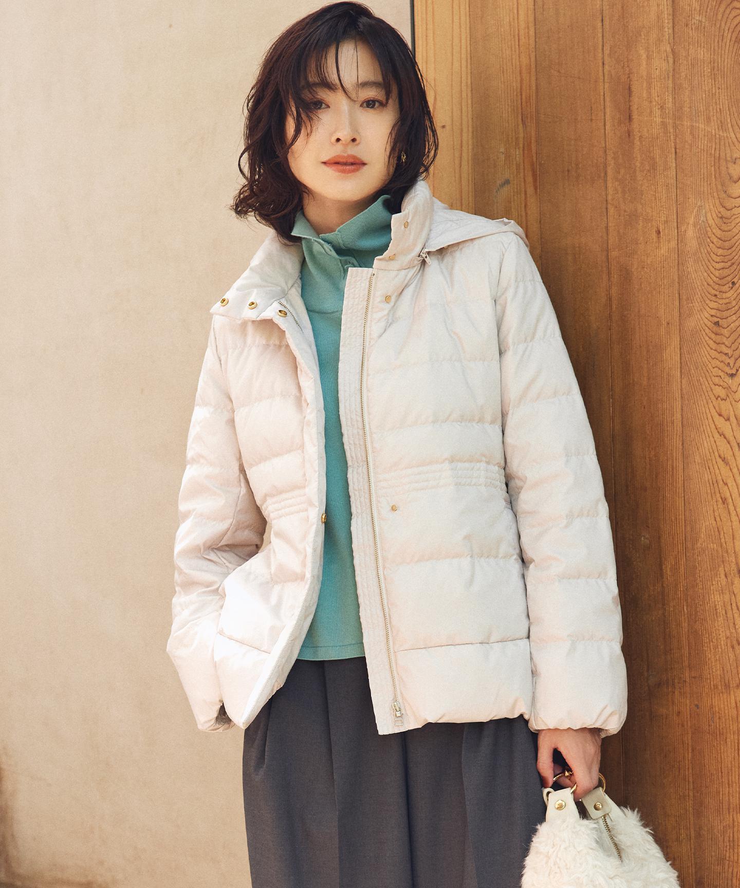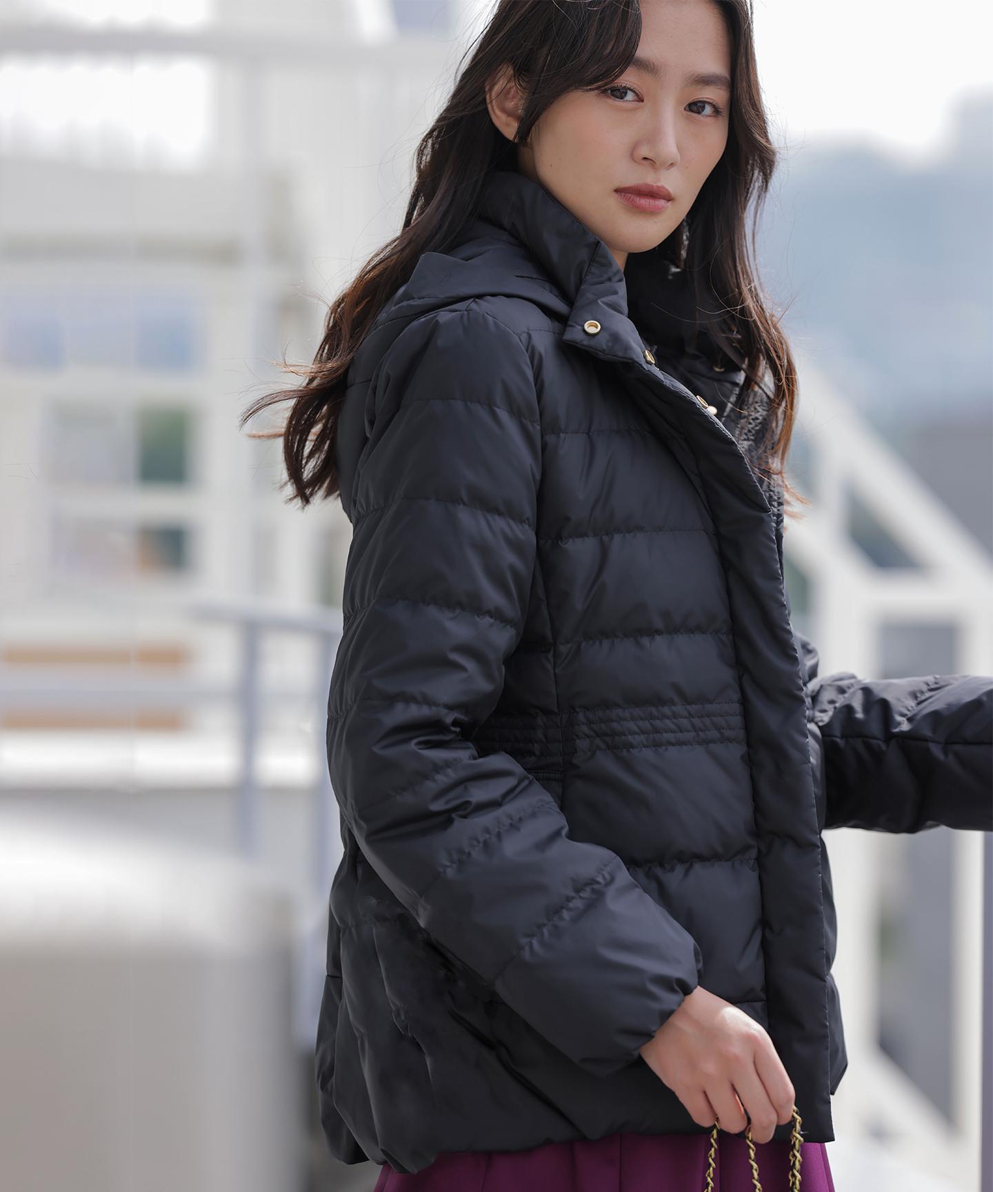■デザイン・シンプルなデザインながら、高めの位置のデザインステッチで着ぶくれせずキレイなシルエットにこだわったショート丈のダウンコート。・程よくゆとり感もあるリラックスした着心地とヒップにかかる後ろ下がりのシルエットで防寒性も抜群。・首元が隠れるスタンドカラーで、取り外し可能なフードは立体感のあるパターンにすることで顔周りにボリュームが出て、すっきり見せてくれます。・身頃に入れたデザインステッチは、ステッチ幅をウエストよりもやや高い位置で間隔をせまくし、裾に向かって間隔を広くすることでさり気なくウエストに''締め''ポイントをつくっています。・スタイリングのバランスがとりやすく、スカートやワイドパンツにも合わせやすいアイテムです。