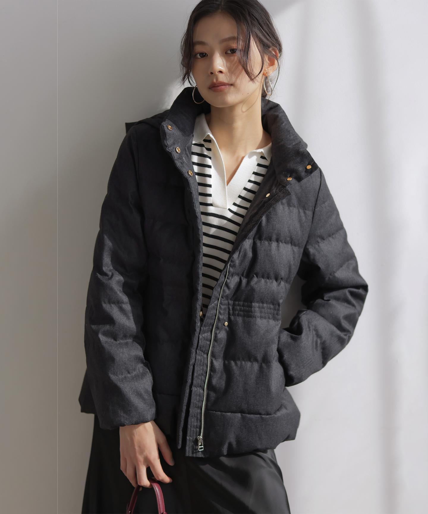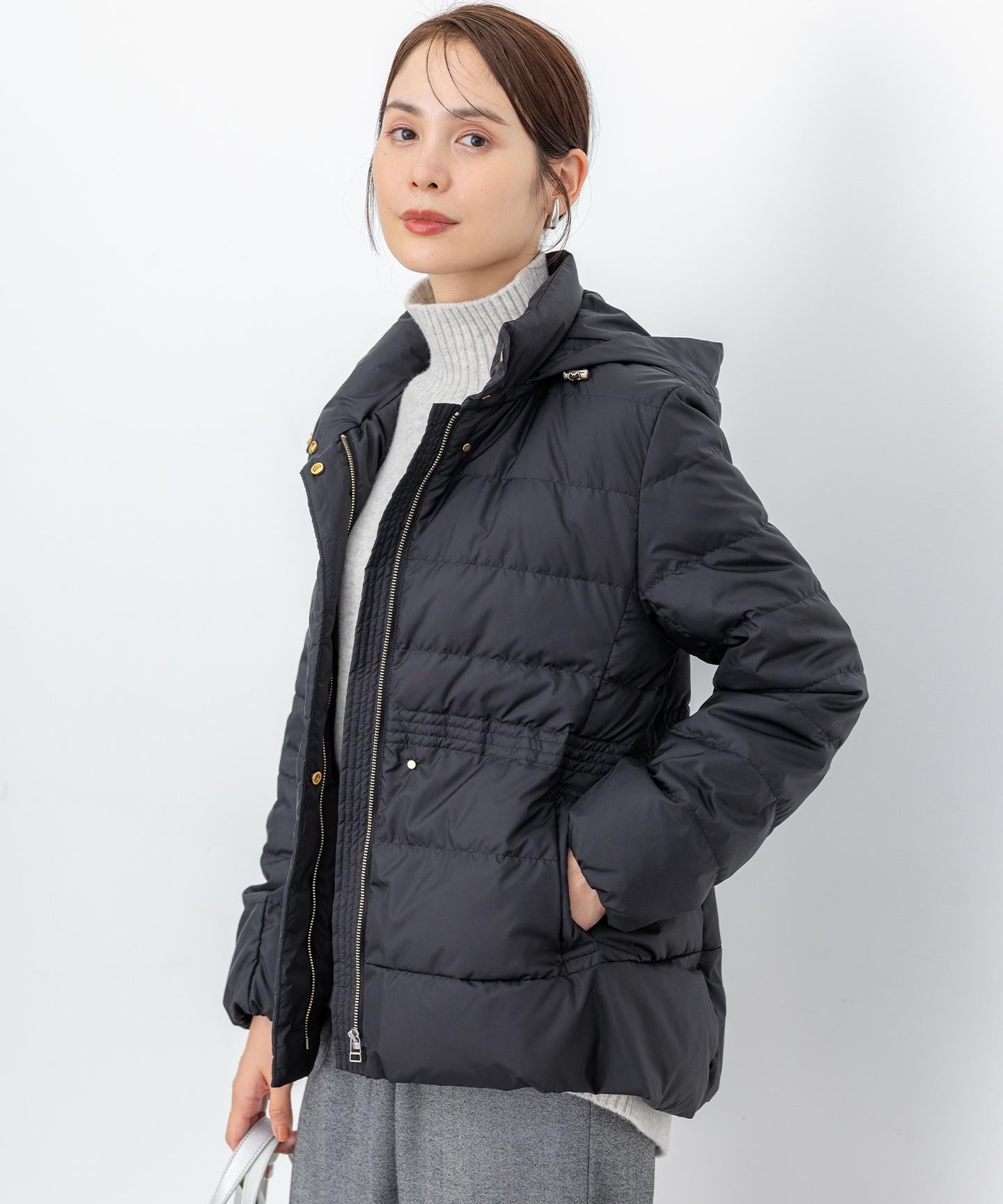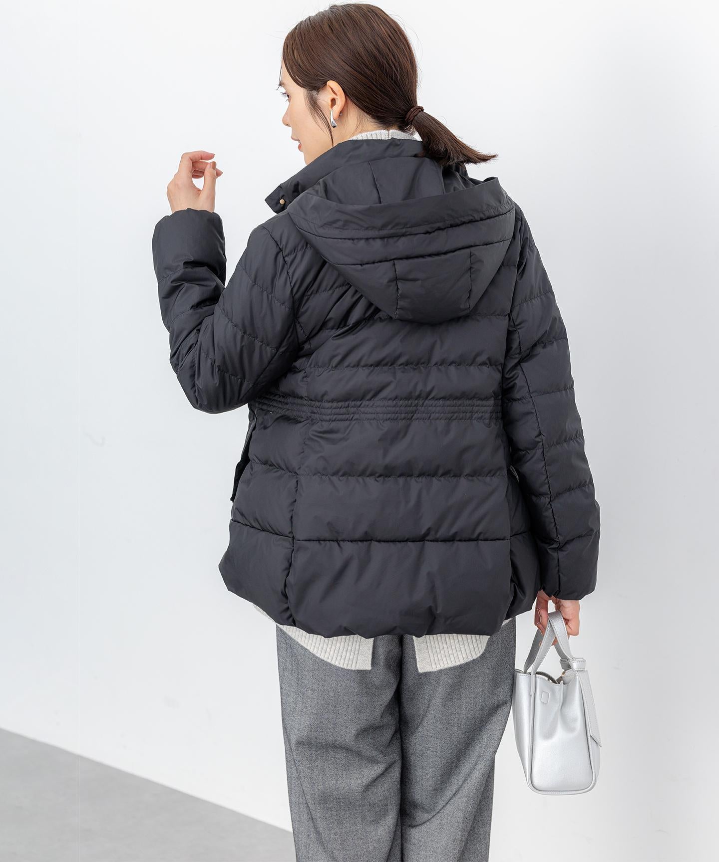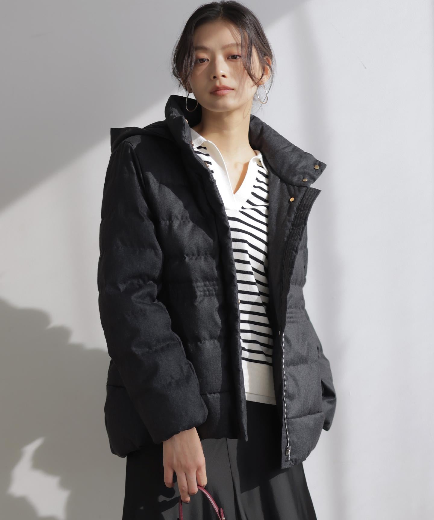 ■デザイン・シンプルなデザインながら、高めの位置のデザインステッチで着ぶくれせずキレイなシルエットにこだわったショート丈のダウンコート。・程よくゆとり感もあるリラックスした着心地とヒップにかかる後ろ下がりのシルエットで防寒性も抜群。・首元が隠れるスタンドカラーで、取り外し可能なフードは立体感のあるパターンにすることで顔周りにボリュームが出て、すっきり見せてくれます。・身頃に入れたデザインステッチは、ステッチ幅をウエストよりもやや高い位置で間隔をせまくし、裾に向かって間隔を広くすることでさり気なくウエストに''締め''ポイントをつくっています。・スタイリングのバランスがとりやすく、スカートやワイドパンツにも合わせやすいアイテムです。