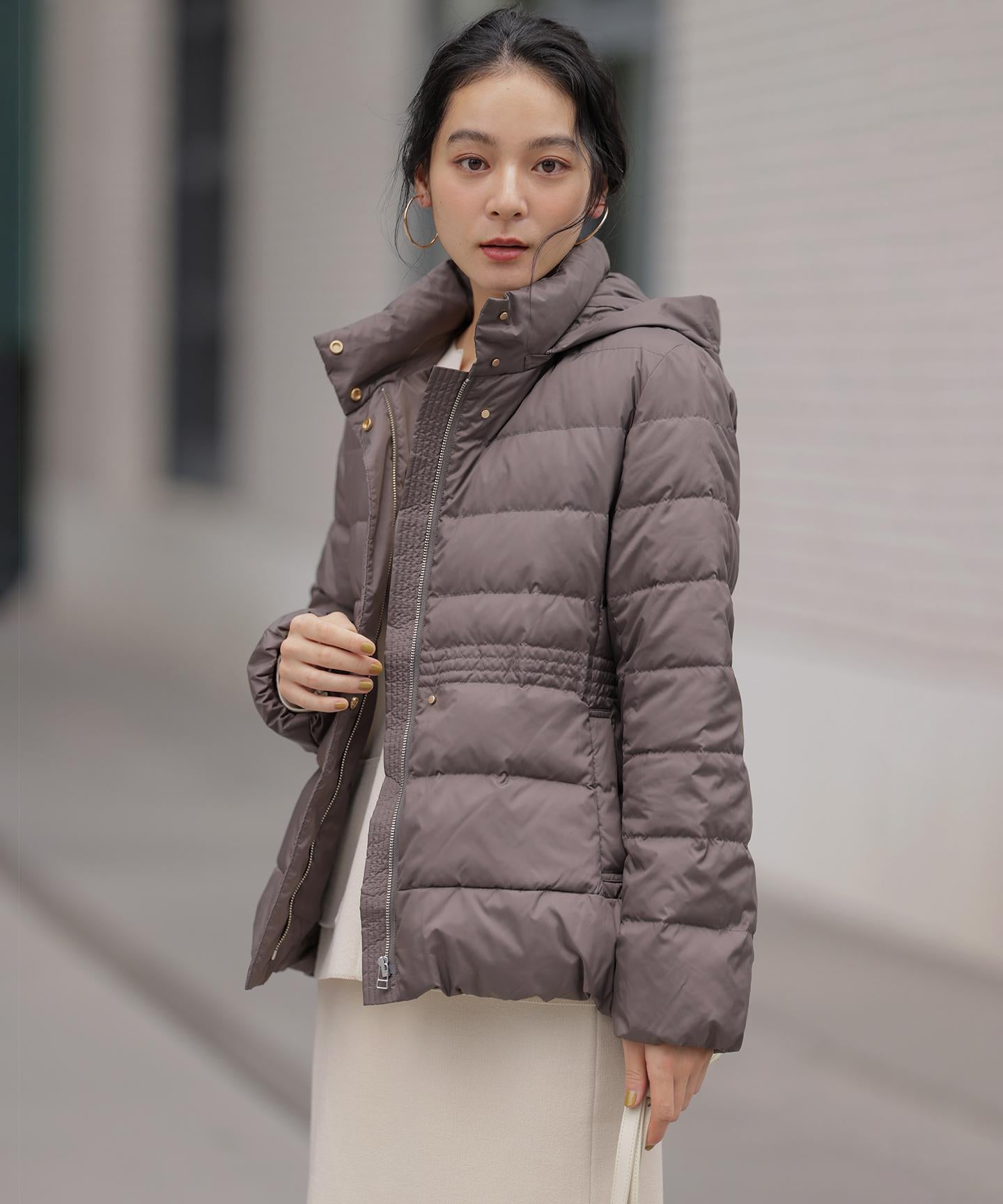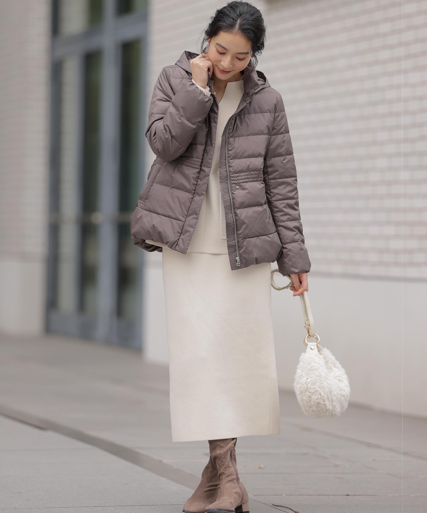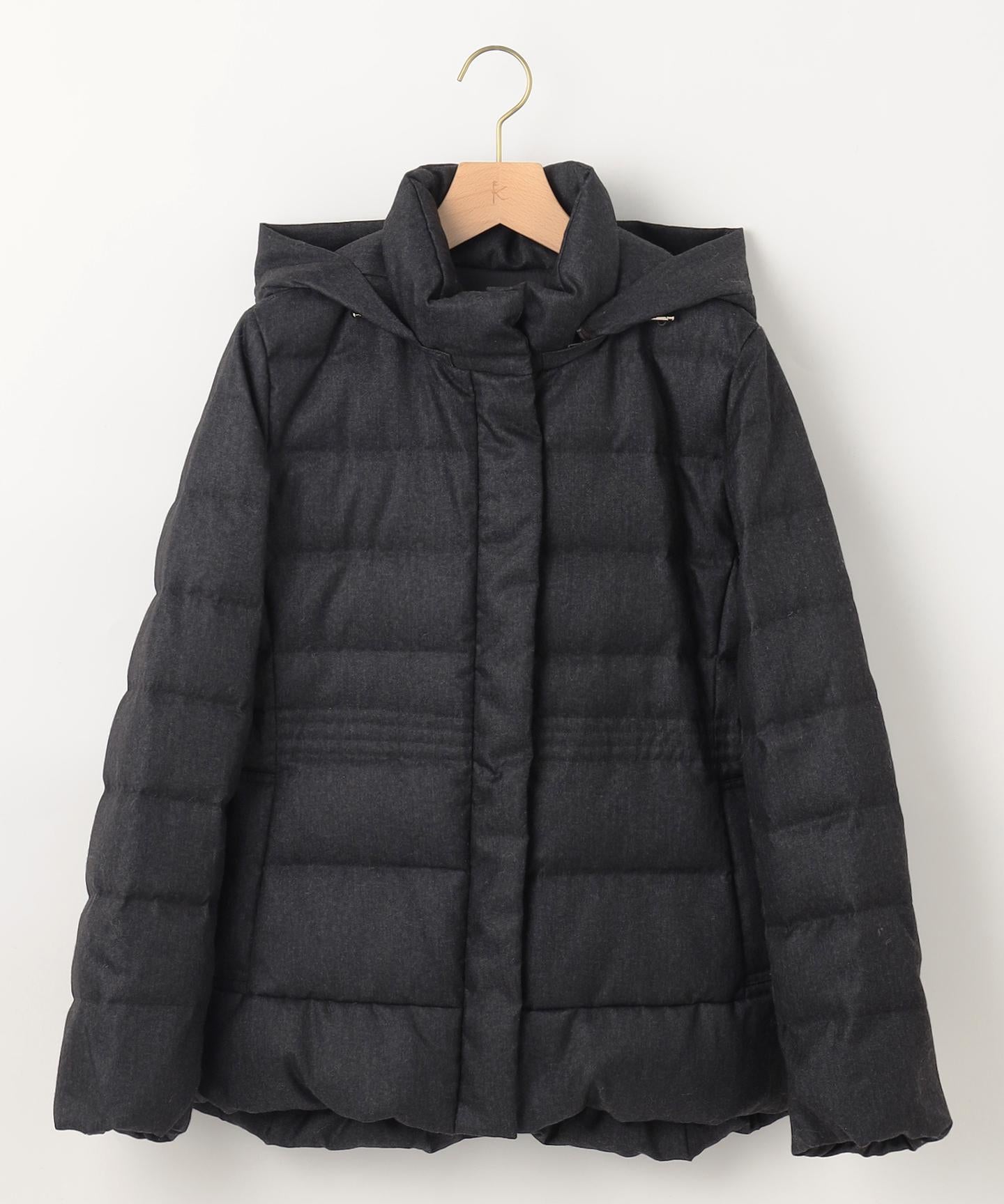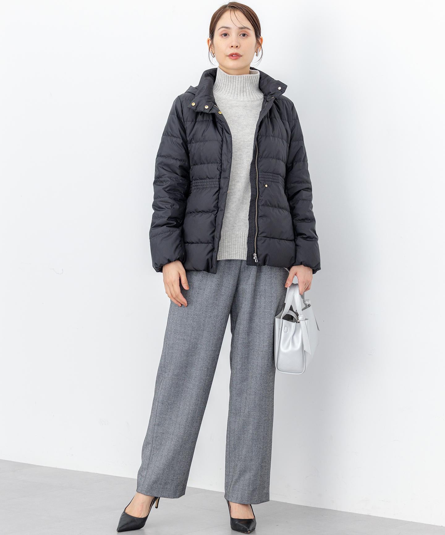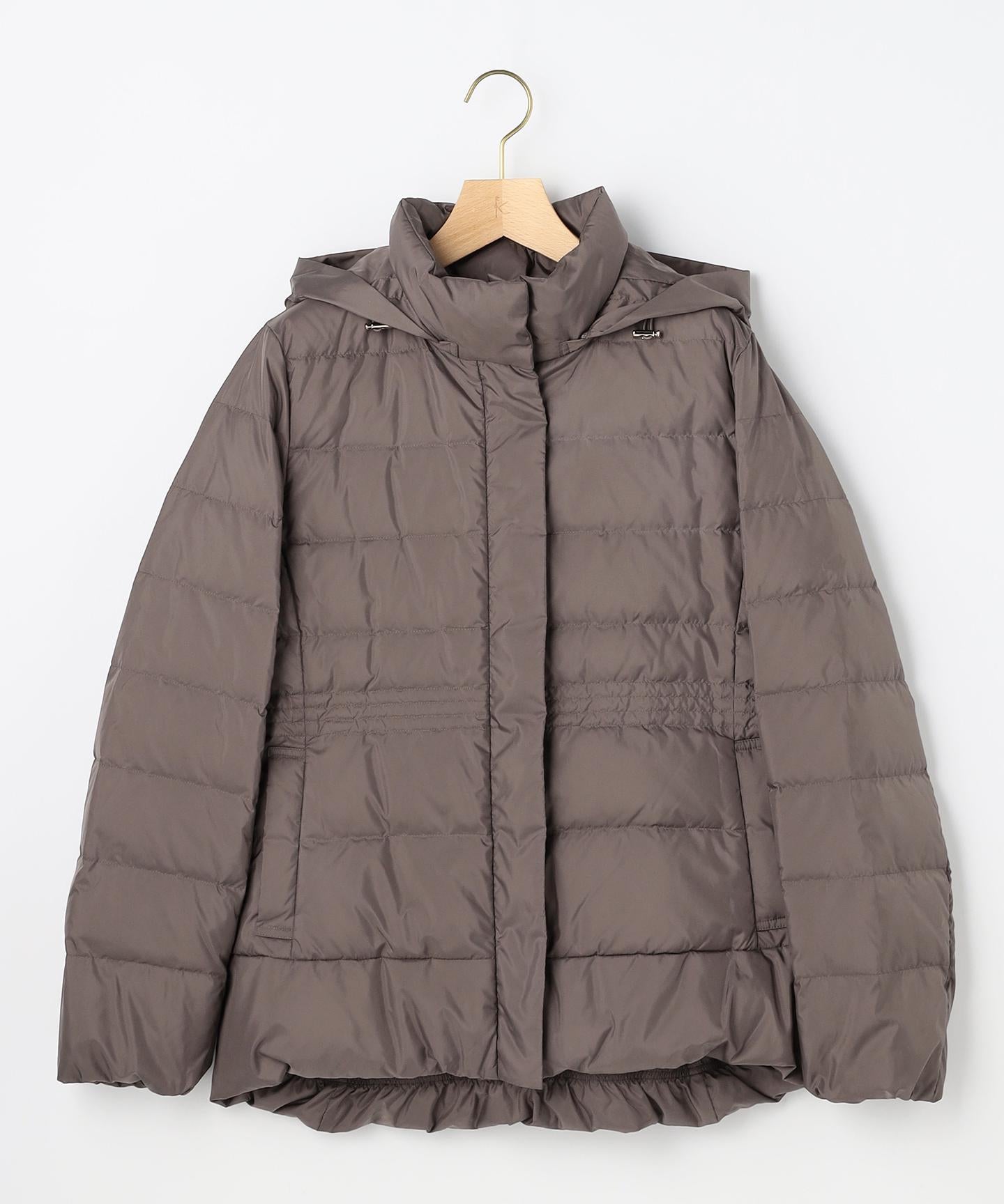■デザイン・シンプルなデザインながら、高めの位置のデザインステッチで着ぶくれせずキレイなシルエットにこだわったショート丈のダウンコート。・程よくゆとり感もあるリラックスした着心地とヒップにかかる後ろ下がりのシルエットで防寒性も抜群。・首元が隠れるスタンドカラーで、取り外し可能なフードは立体感のあるパターンにすることで顔周りにボリュームが出て、すっきり見せてくれます。・身頃に入れたデザインステッチは、ステッチ幅をウエストよりもやや高い位置で間隔をせまくし、裾に向かって間隔を広くすることでさり気なくウエストに''締め''ポイントをつくっています。・スタイリングのバランスがとりやすく、スカートやワイドパンツにも合わせやすいアイテムです。