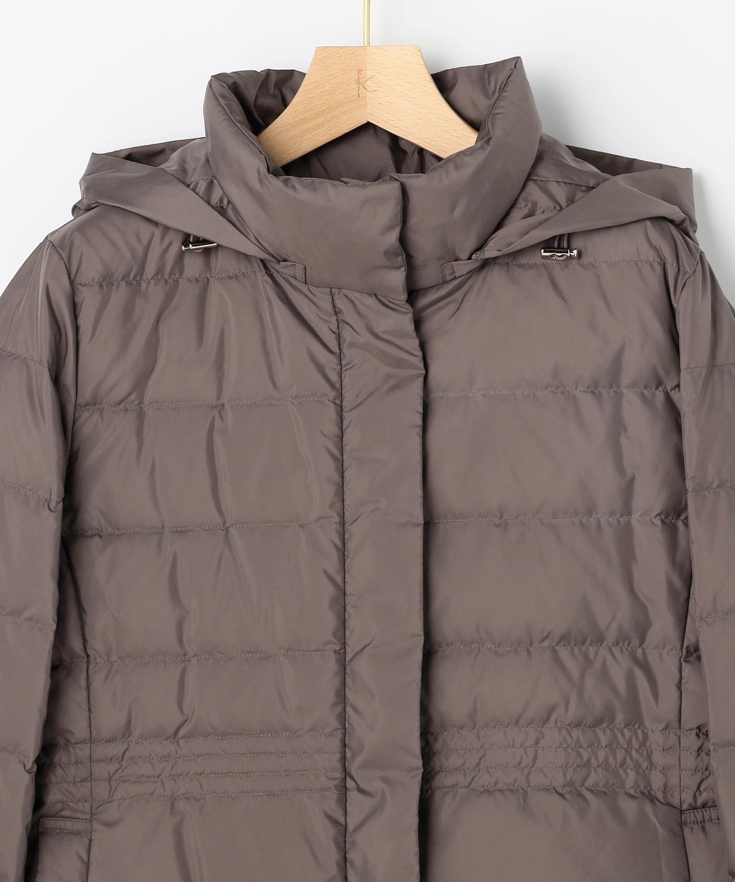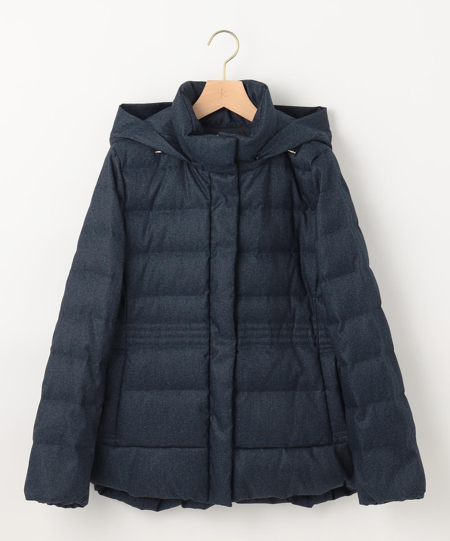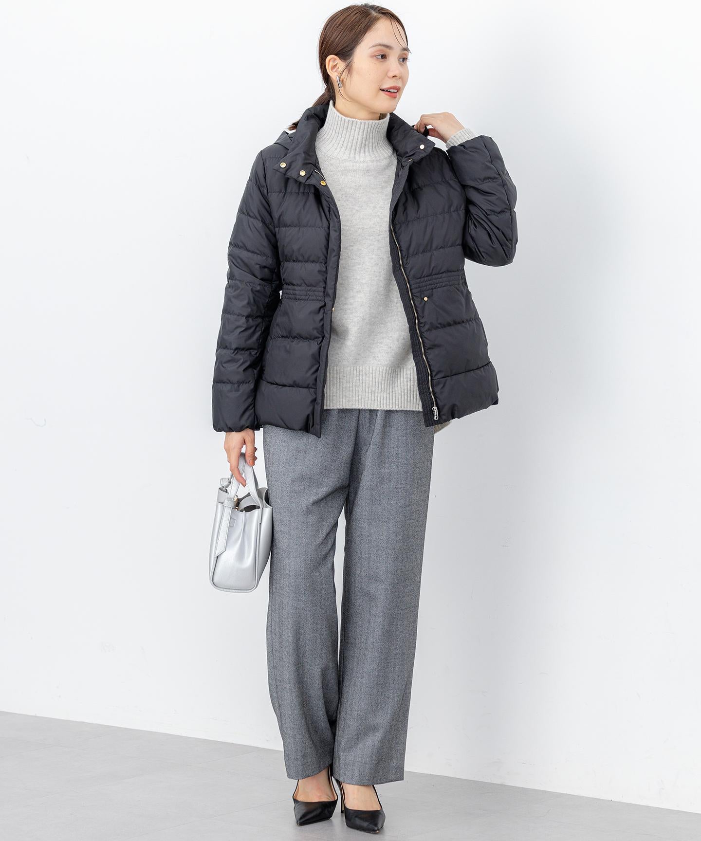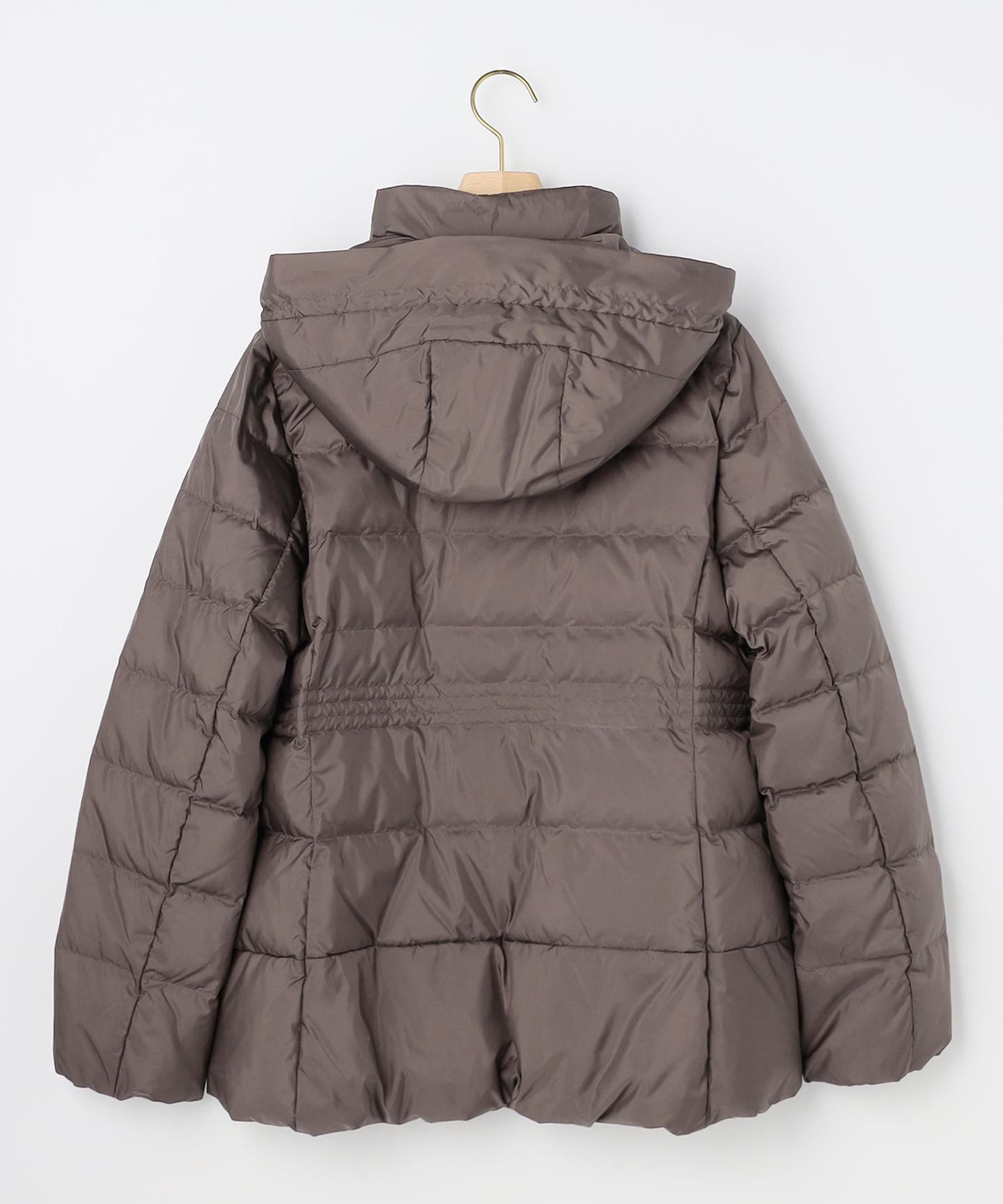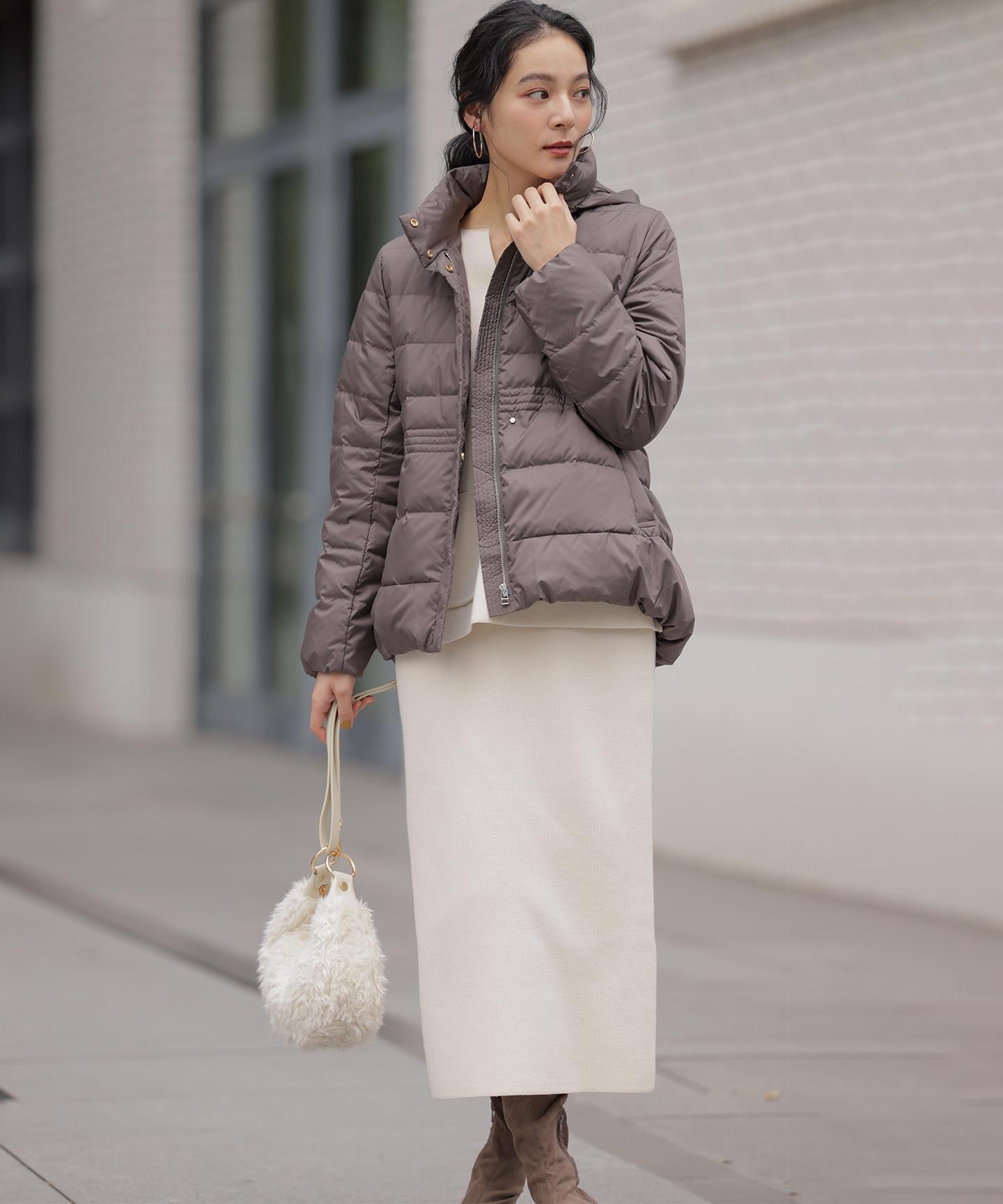 ■デザイン・シンプルなデザインながら、高めの位置のデザインステッチで着ぶくれせずキレイなシルエットにこだわったショート丈のダウンコート。・程よくゆとり感もあるリラックスした着心地とヒップにかかる後ろ下がりのシルエットで防寒性も抜群。・首元が隠れるスタンドカラーで、取り外し可能なフードは立体感のあるパターンにすることで顔周りにボリュームが出て、すっきり見せてくれます。・身頃に入れたデザインステッチは、ステッチ幅をウエストよりもやや高い位置で間隔をせまくし、裾に向かって間隔を広くすることでさり気なくウエストに''締め''ポイントをつくっています。・スタイリングのバランスがとりやすく、スカートやワイドパンツにも合わせやすいアイテムです。