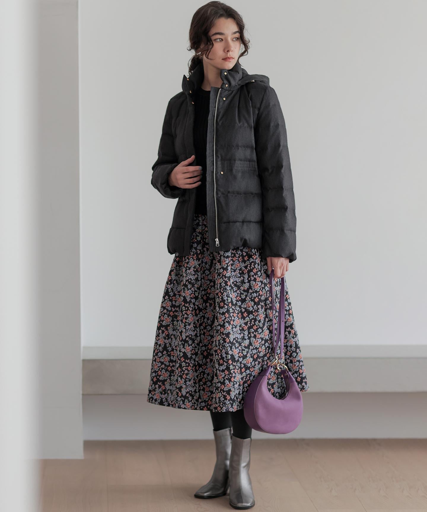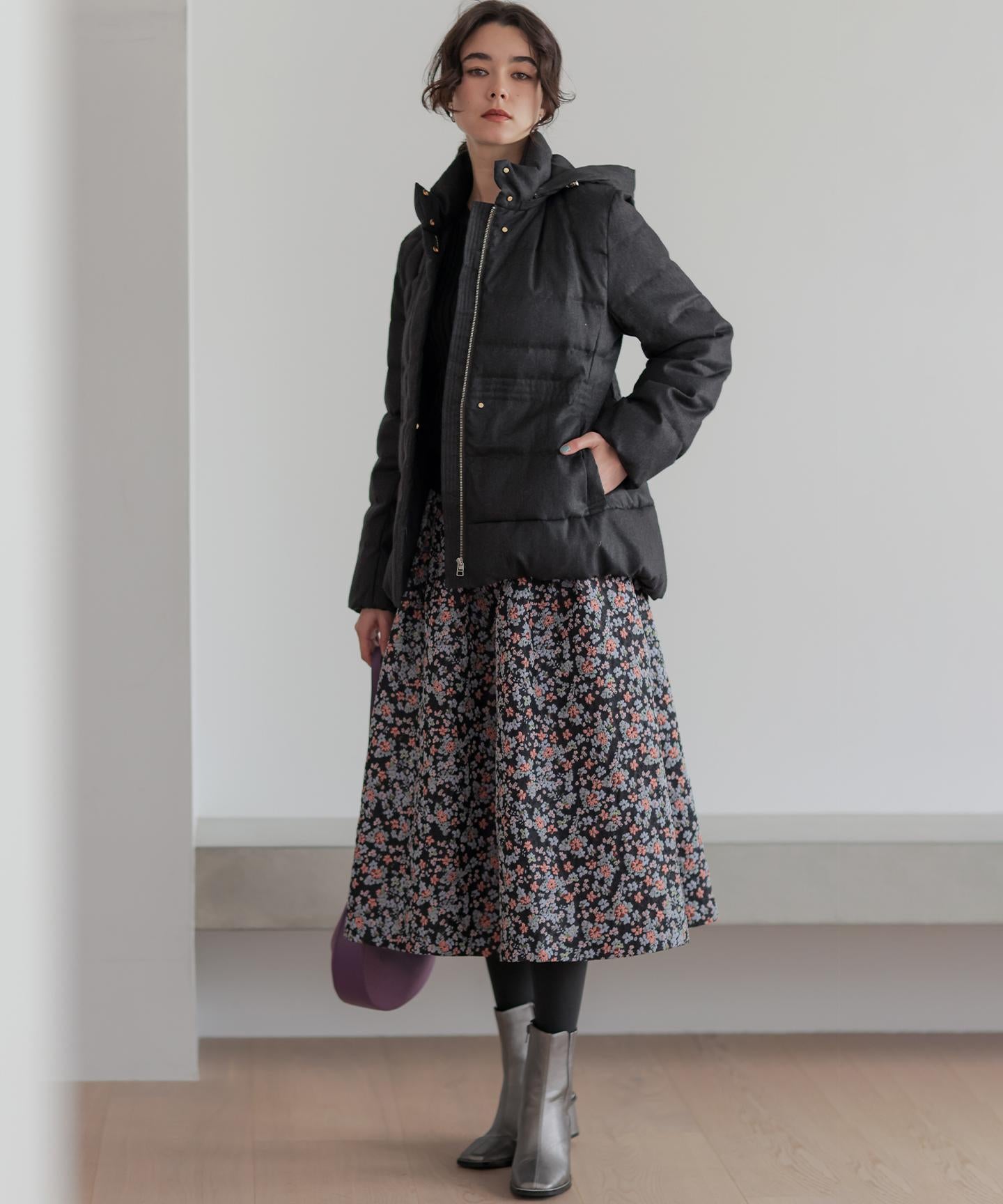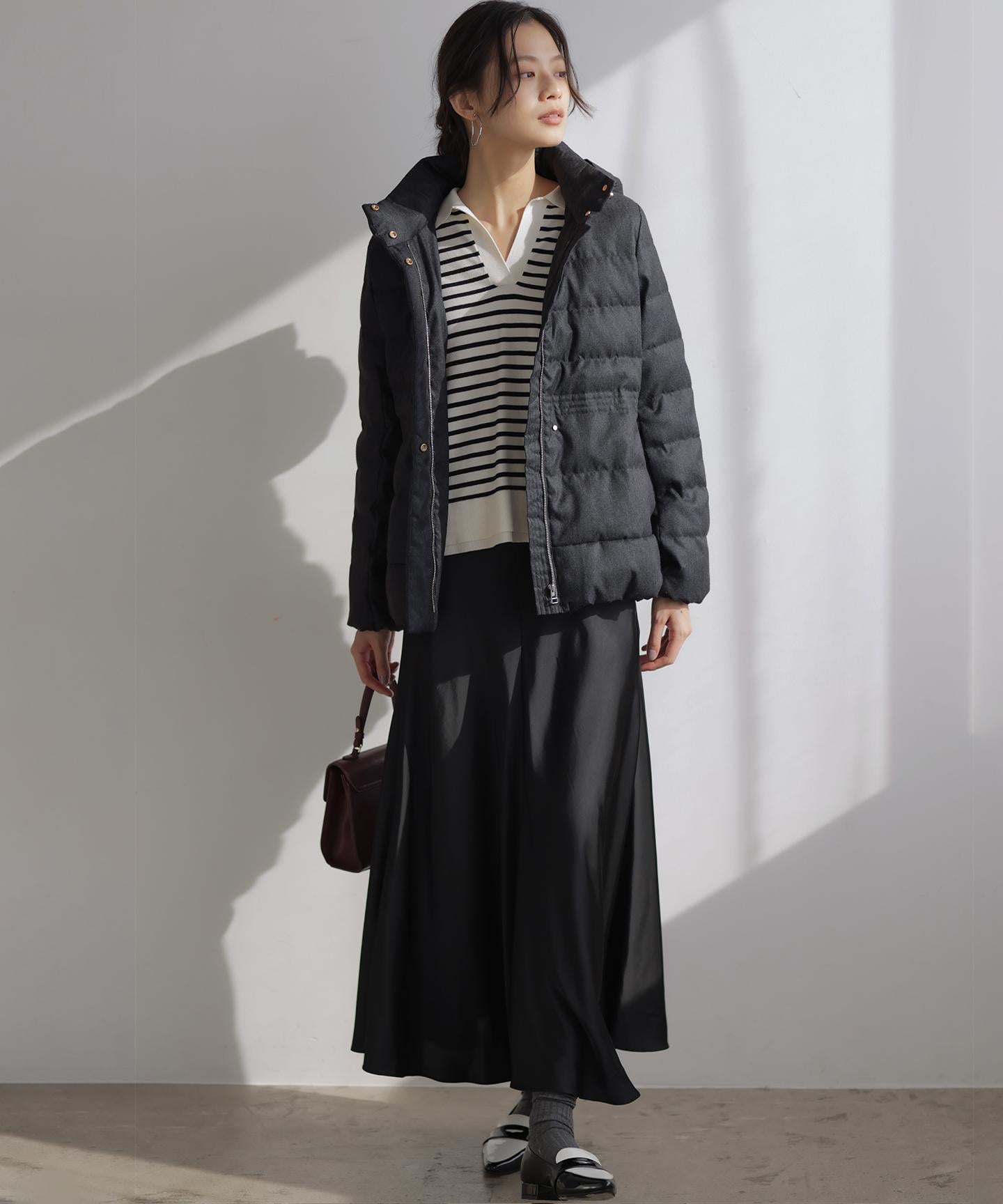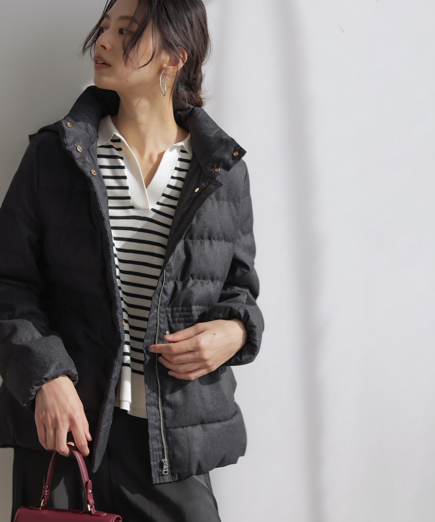 ■デザイン・シンプルなデザインながら、高めの位置のデザインステッチで着ぶくれせずキレイなシルエットにこだわったショート丈のダウンコート。・程よくゆとり感もあるリラックスした着心地とヒップにかかる後ろ下がりのシルエットで防寒性も抜群。・首元が隠れるスタンドカラーで、取り外し可能なフードは立体感のあるパターンにすることで顔周りにボリュームが出て、すっきり見せてくれます。・身頃に入れたデザインステッチは、ステッチ幅をウエストよりもやや高い位置で間隔をせまくし、裾に向かって間隔を広くすることでさり気なくウエストに''締め''ポイントをつくっています。・スタイリングのバランスがとりやすく、スカートやワイドパンツにも合わせやすいアイテムです。