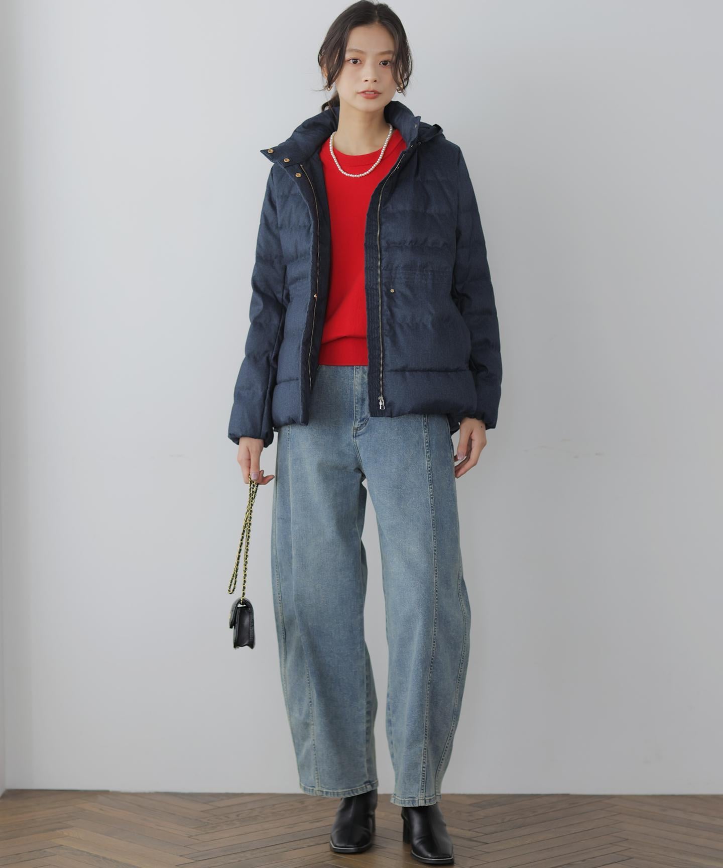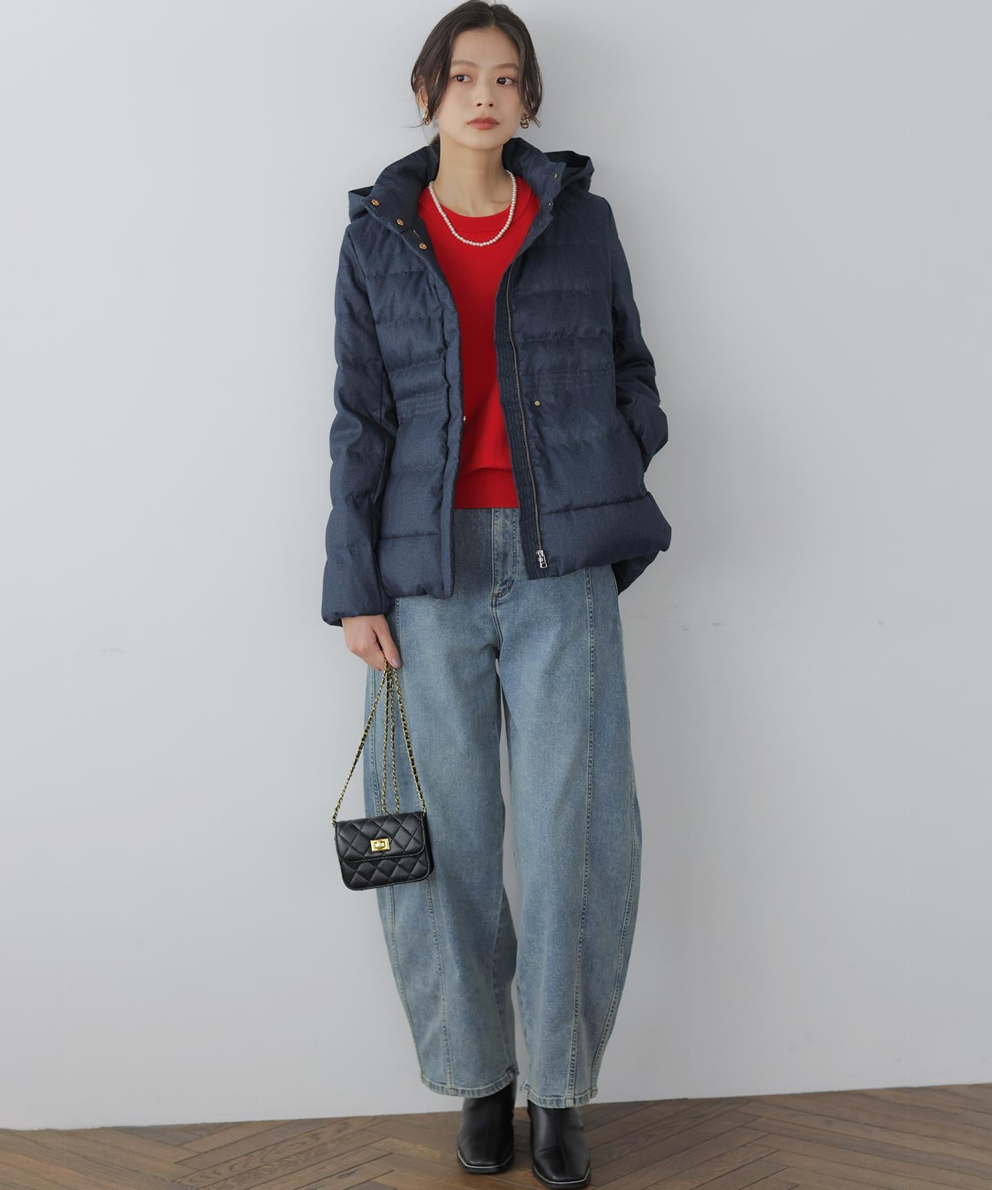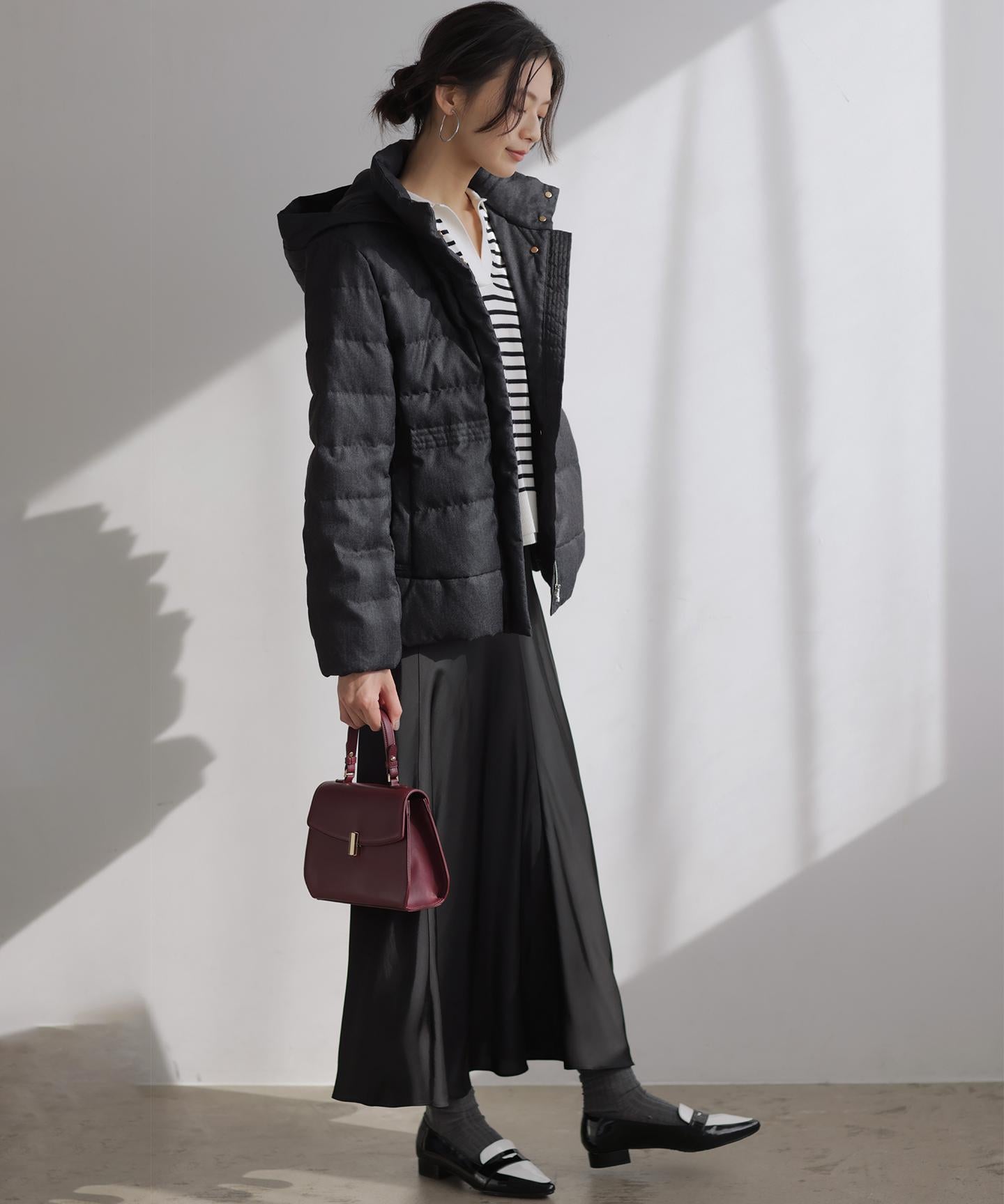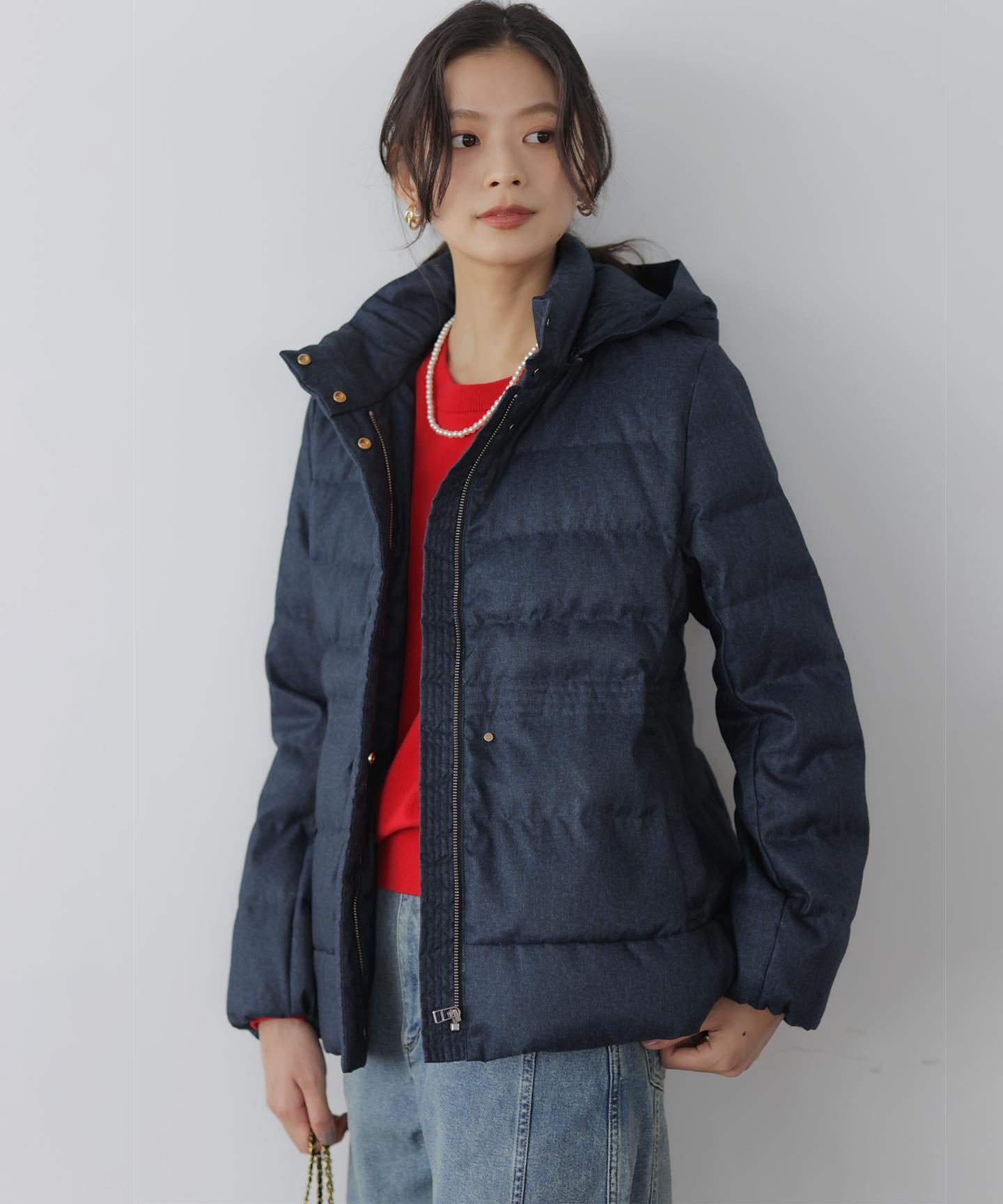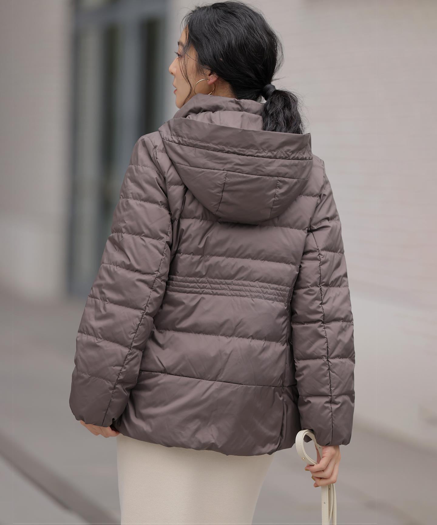 ■デザイン・シンプルなデザインながら、高めの位置のデザインステッチで着ぶくれせずキレイなシルエットにこだわったショート丈のダウンコート。・程よくゆとり感もあるリラックスした着心地とヒップにかかる後ろ下がりのシルエットで防寒性も抜群。・首元が隠れるスタンドカラーで、取り外し可能なフードは立体感のあるパターンにすることで顔周りにボリュームが出て、すっきり見せてくれます。・身頃に入れたデザインステッチは、ステッチ幅をウエストよりもやや高い位置で間隔をせまくし、裾に向かって間隔を広くすることでさり気なくウエストに''締め''ポイントをつくっています。・スタイリングのバランスがとりやすく、スカートやワイドパンツにも合わせやすいアイテムです。
