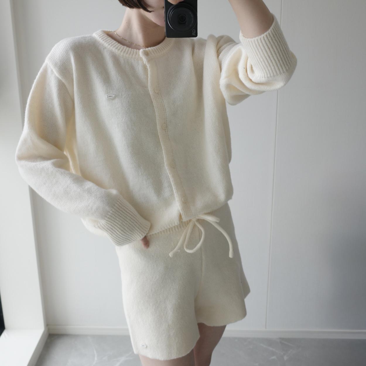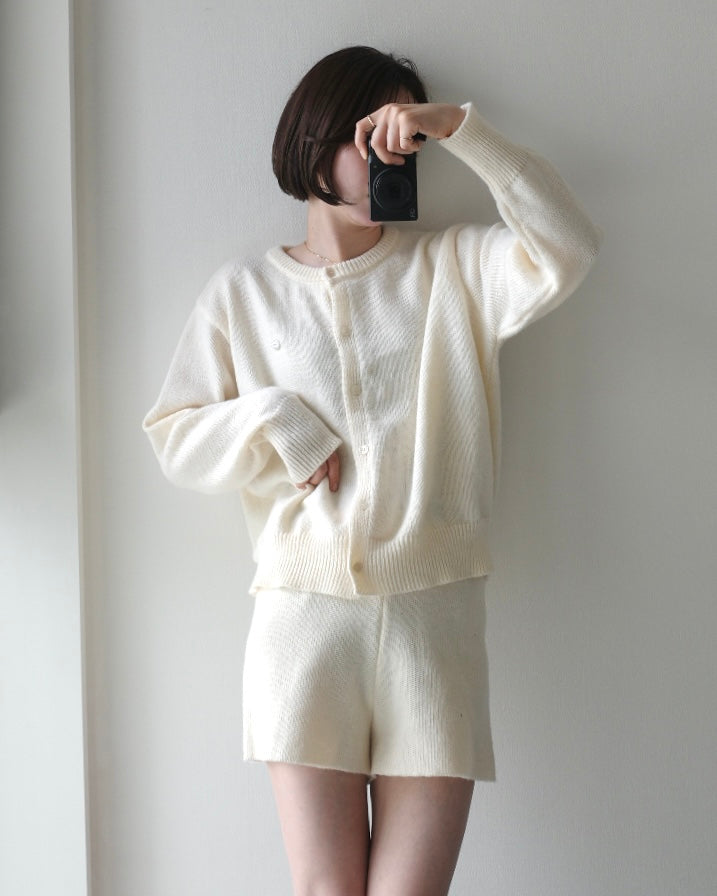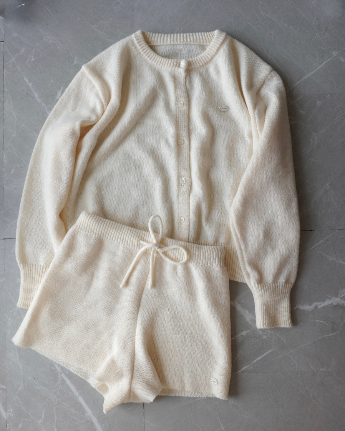 やわらかな風合いが魅力の、ニットカーディガンとショートパンツのセットアップ。