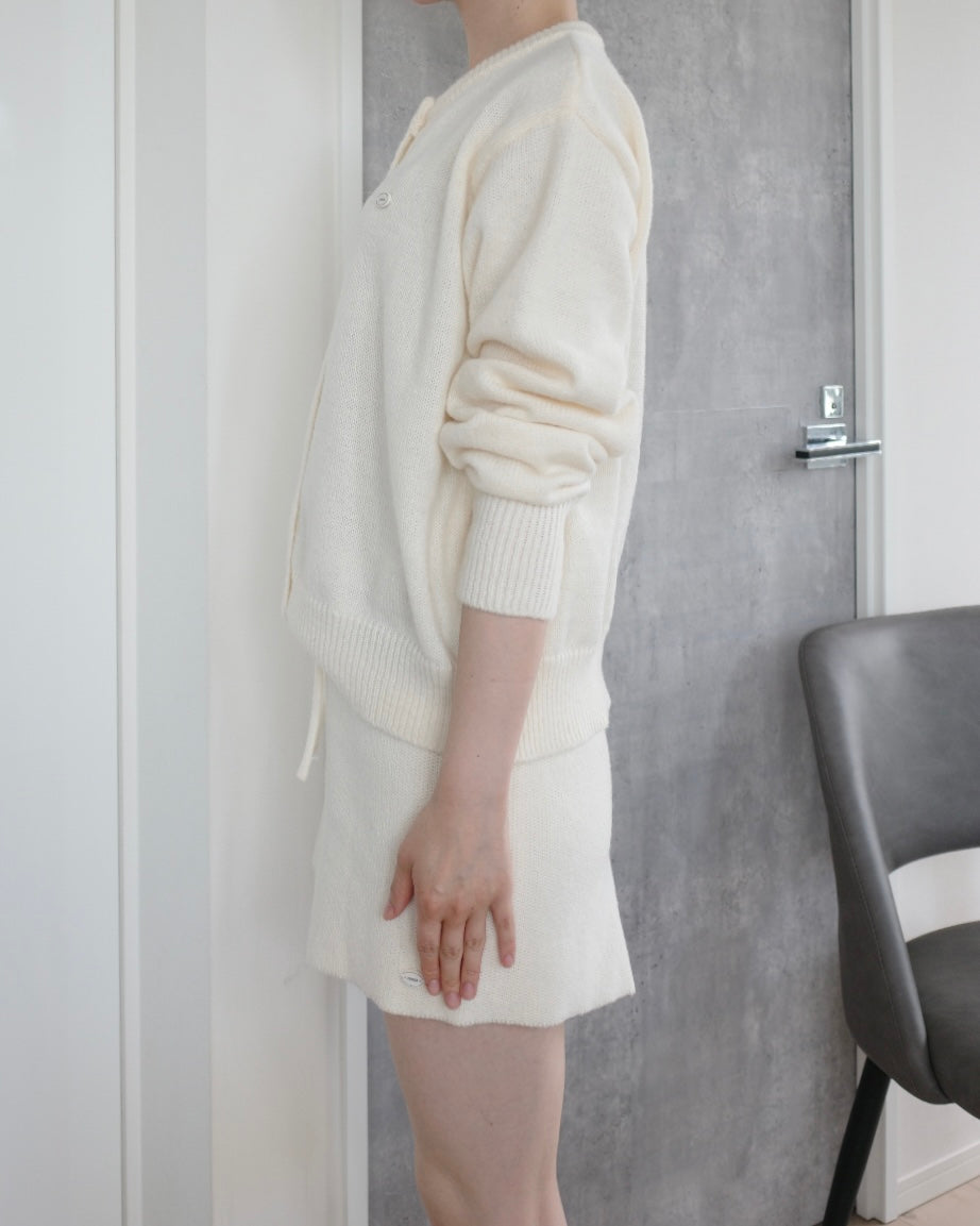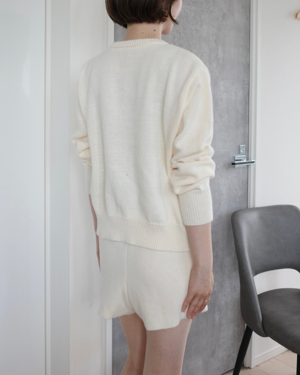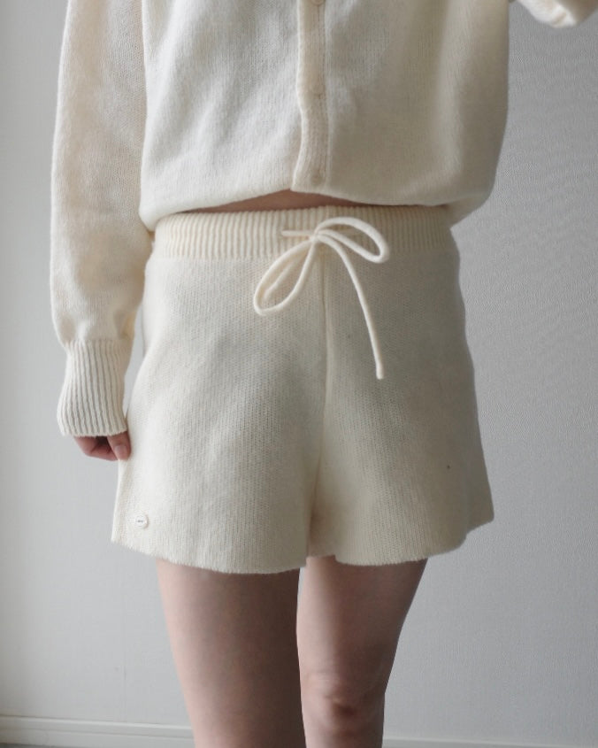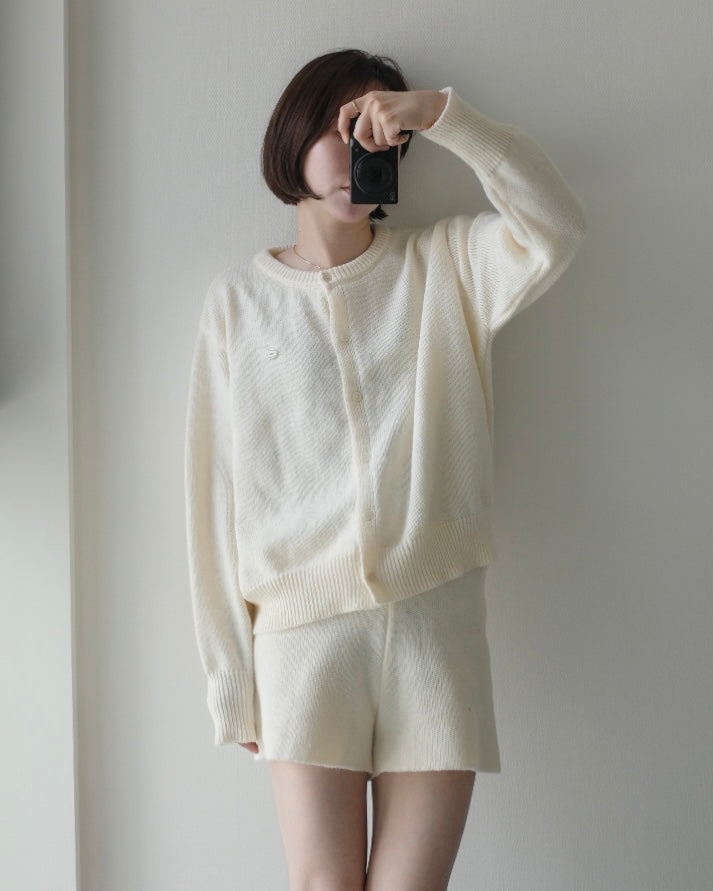 やわらかな風合いが魅力の、ニットカーディガンとショートパンツのセットアップ。