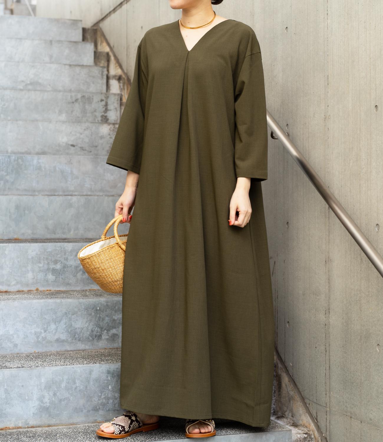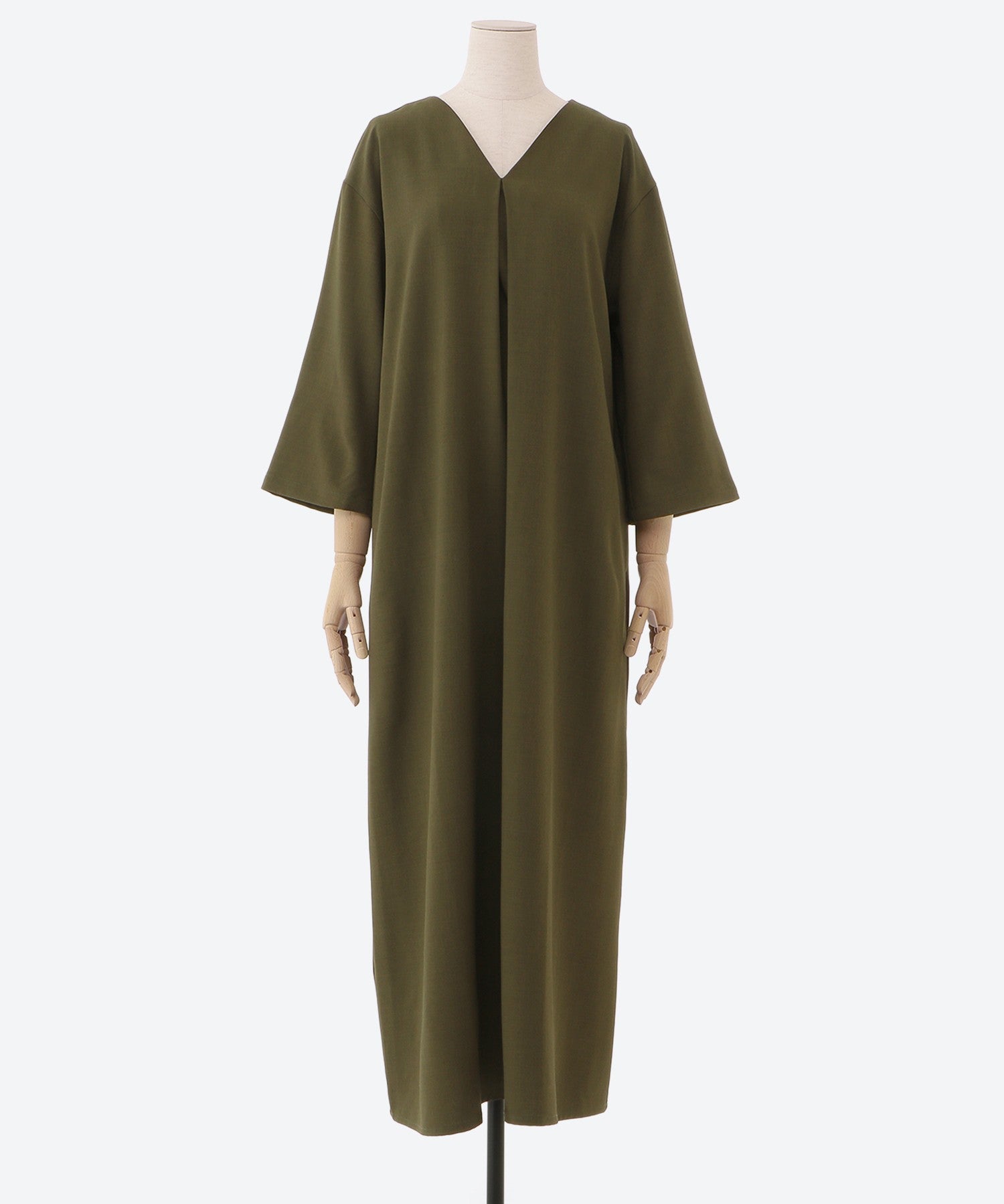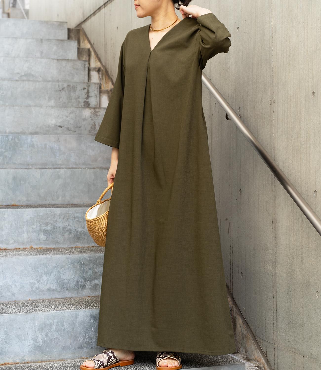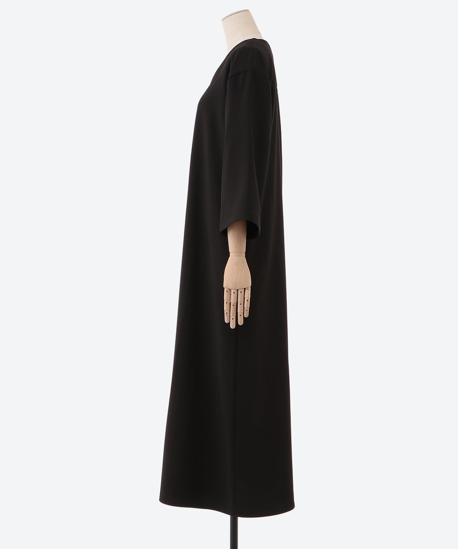 生地に程よいストレッチ感を持たせたワンピースです。顔まわりをすっきりと演出するVネック。胸元の中心にタックを施すことで、エレガントなドレープを表現しています。ドロップショルダーから続く、やや短めの長袖もポイント。無地のワンカラーで仕上げたボディには、サイドポケット付き。上品なロング丈は、落ち感のあるストレートシルエットでリラクシーな着心地をもたらします。