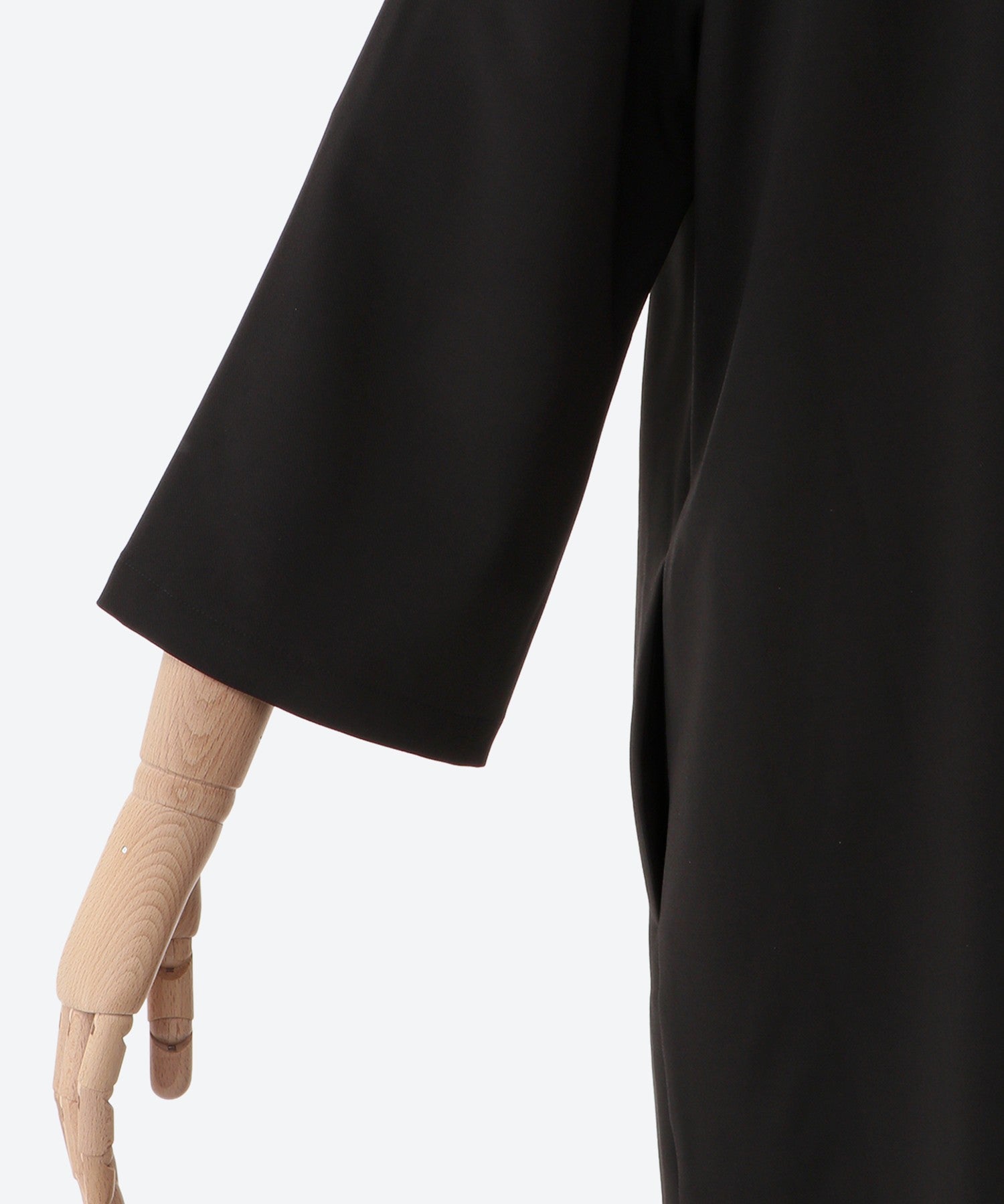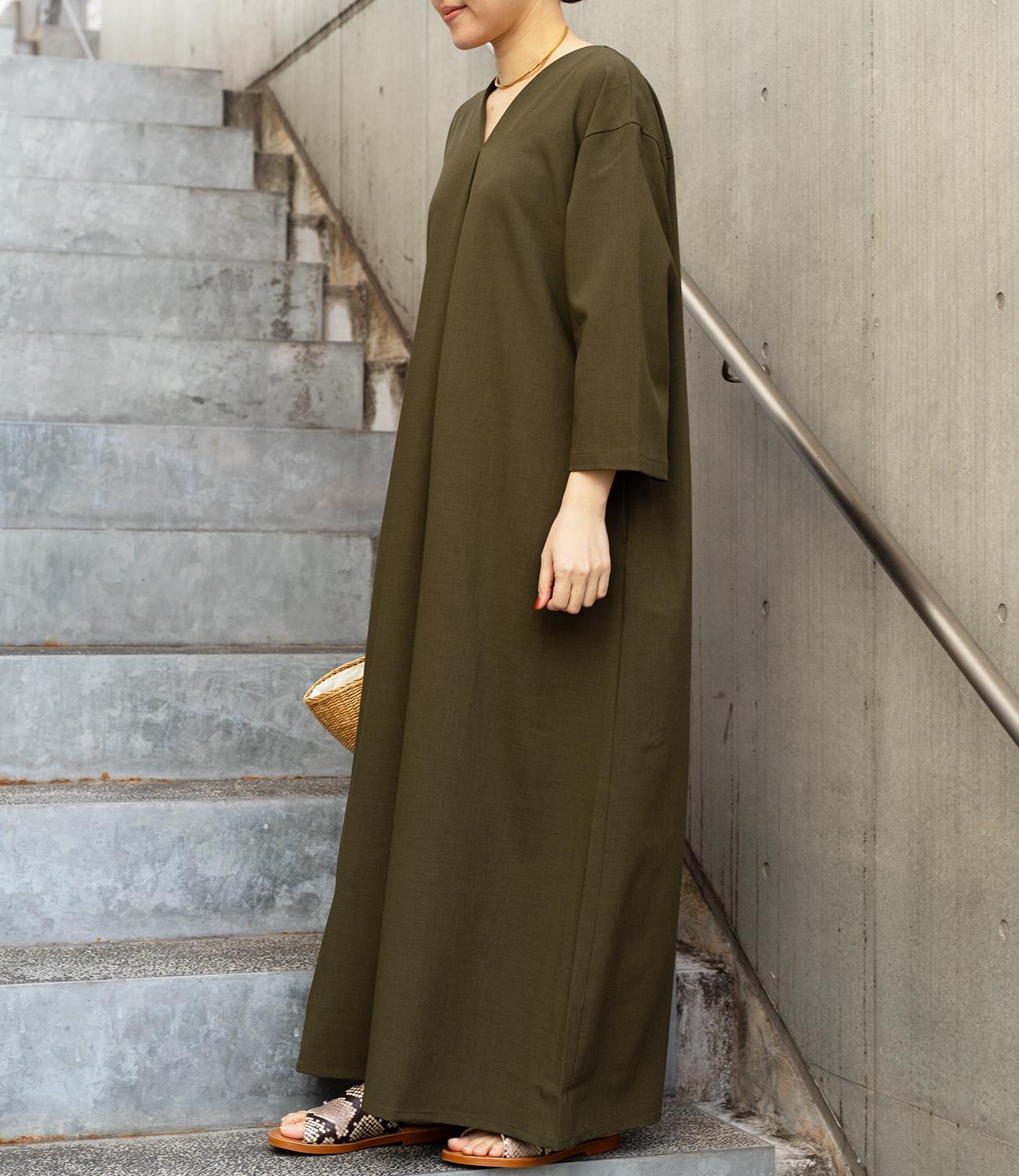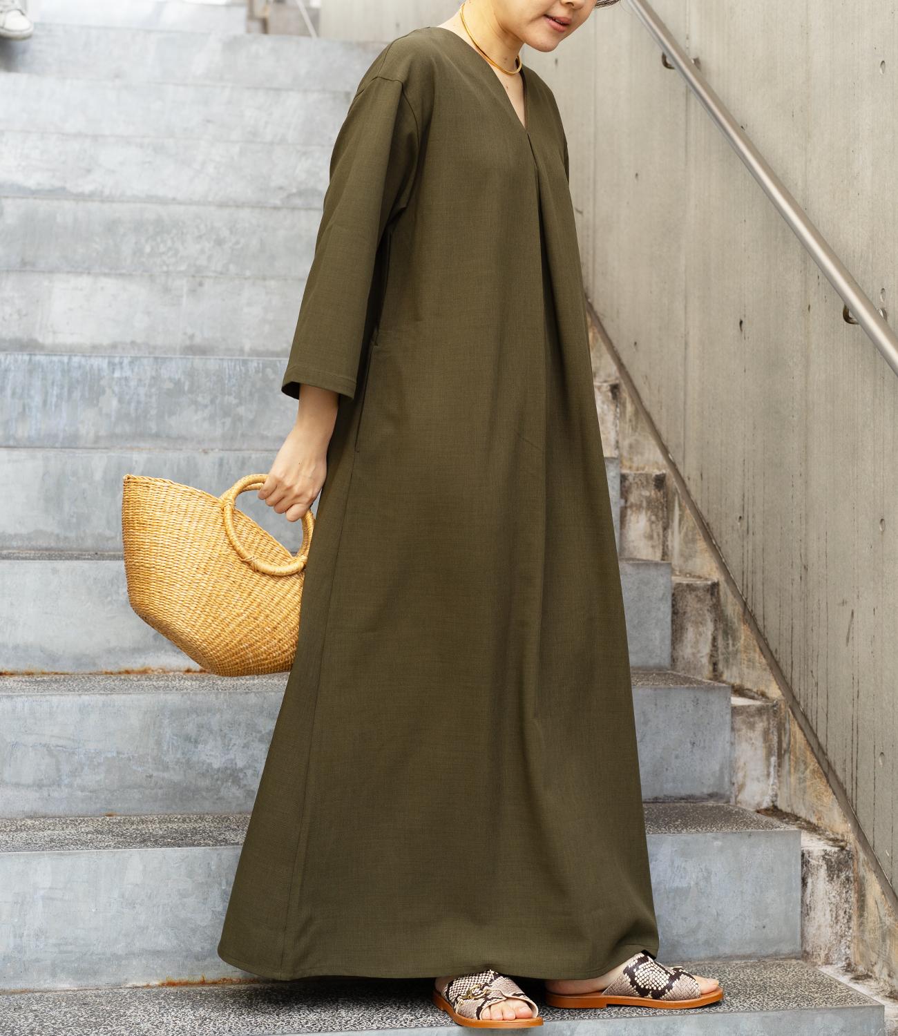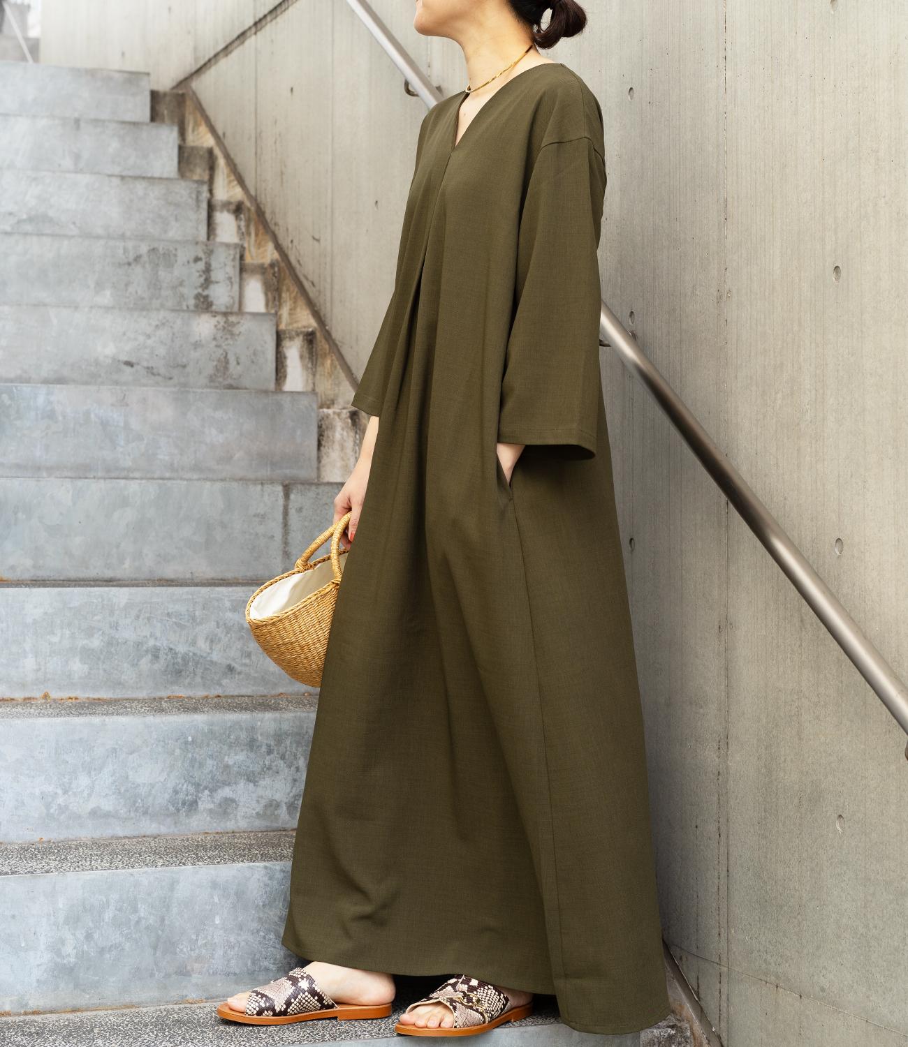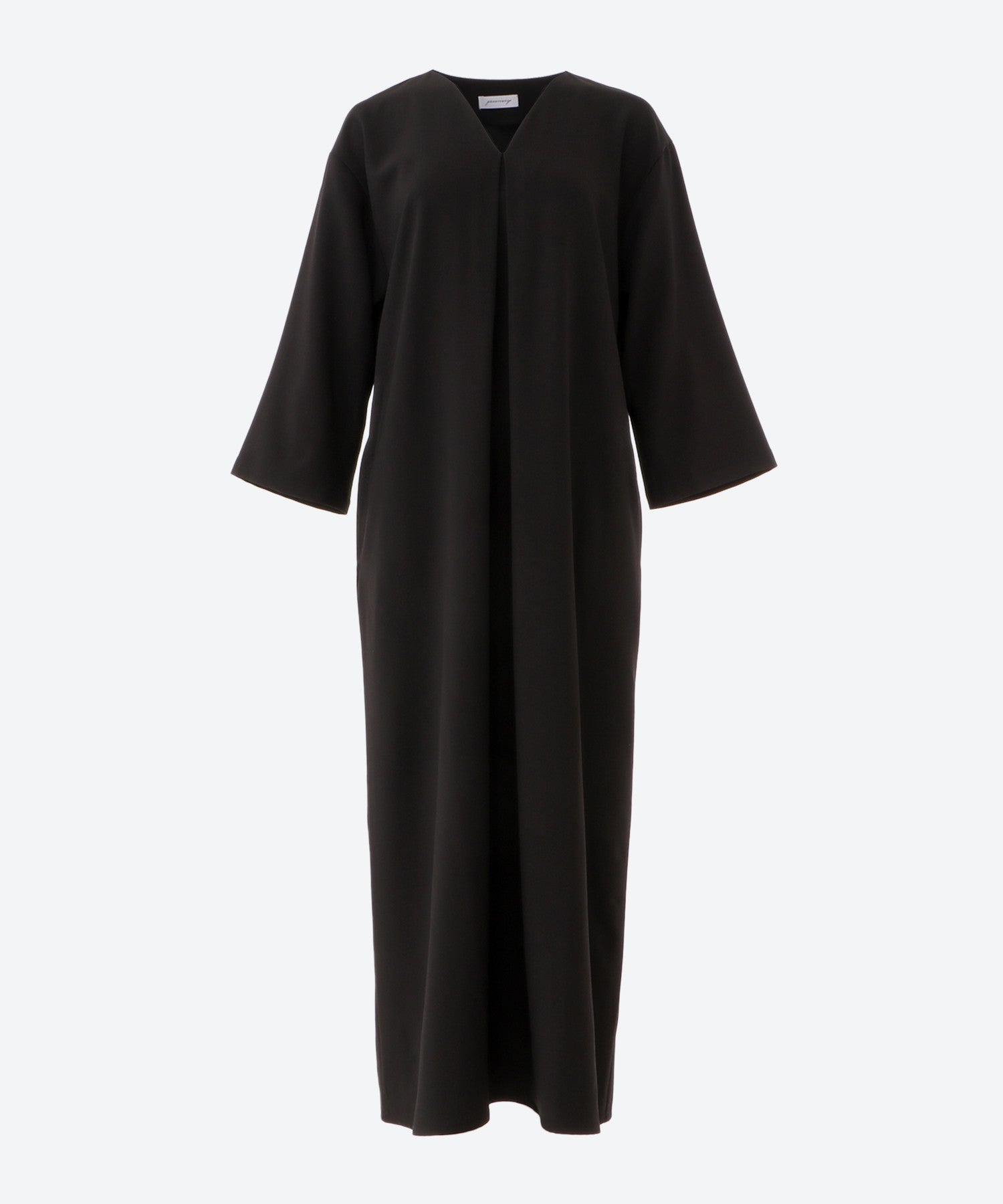 生地に程よいストレッチ感を持たせたワンピースです。顔まわりをすっきりと演出するVネック。胸元の中心にタックを施すことで、エレガントなドレープを表現しています。ドロップショルダーから続く、やや短めの長袖もポイント。無地のワンカラーで仕上げたボディには、サイドポケット付き。上品なロング丈は、落ち感のあるストレートシルエットでリラクシーな着心地をもたらします。