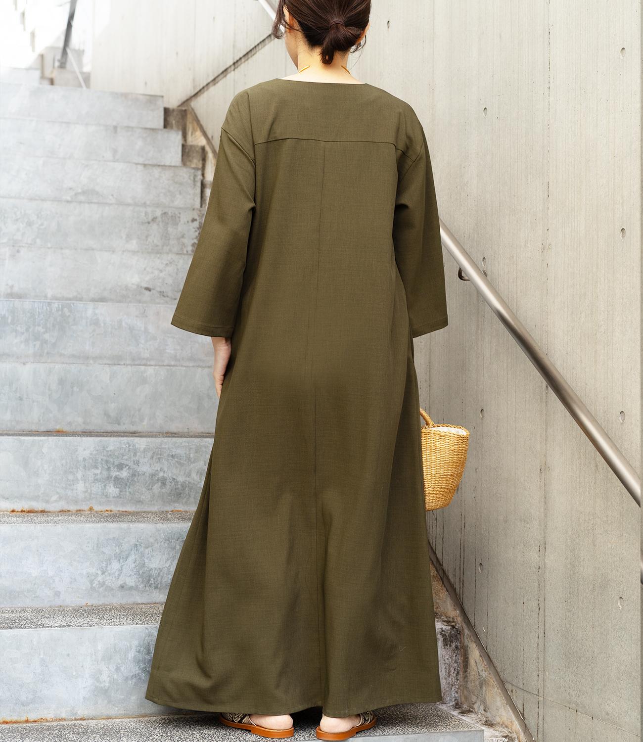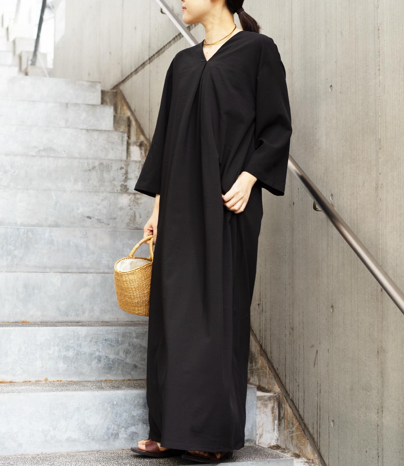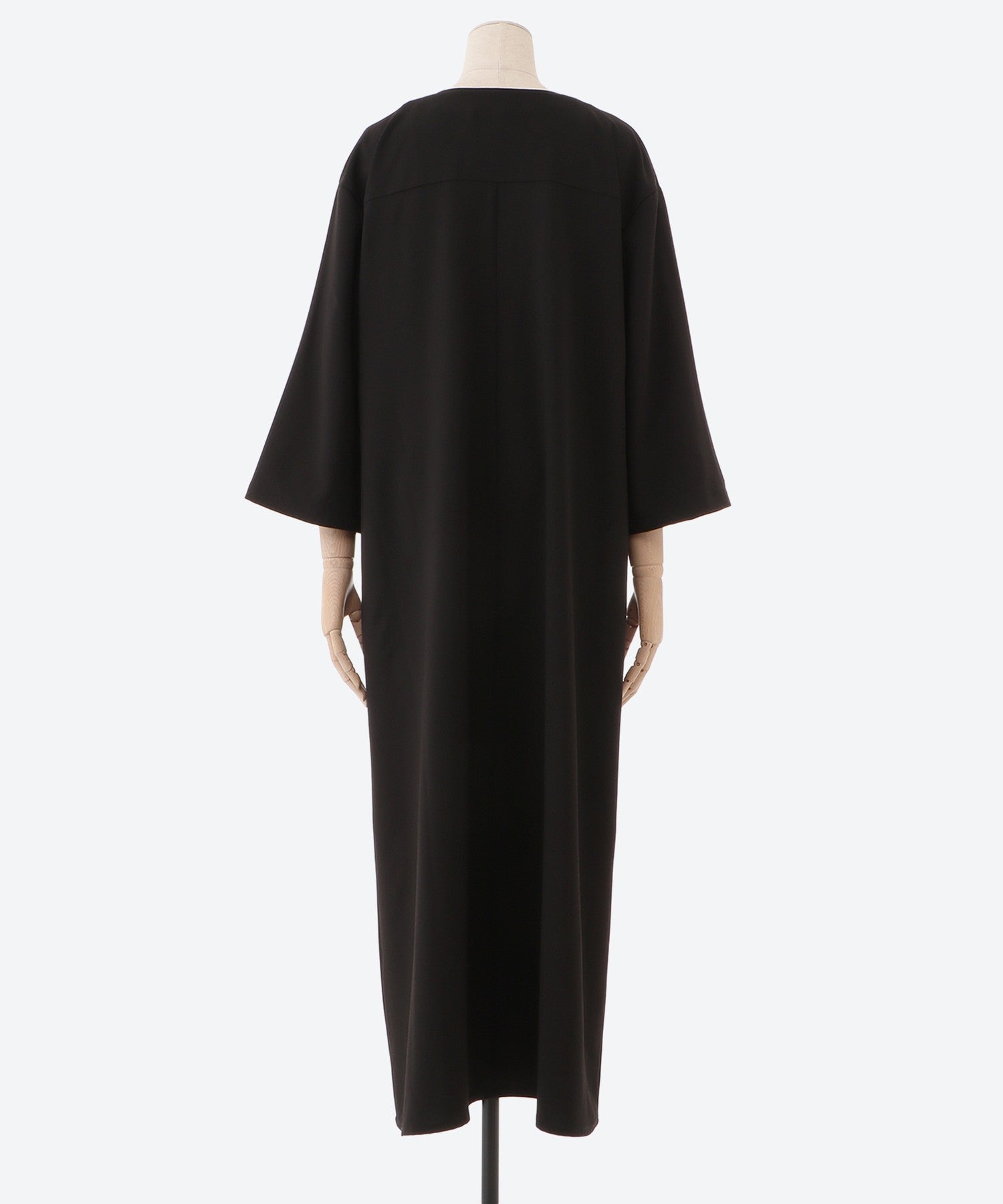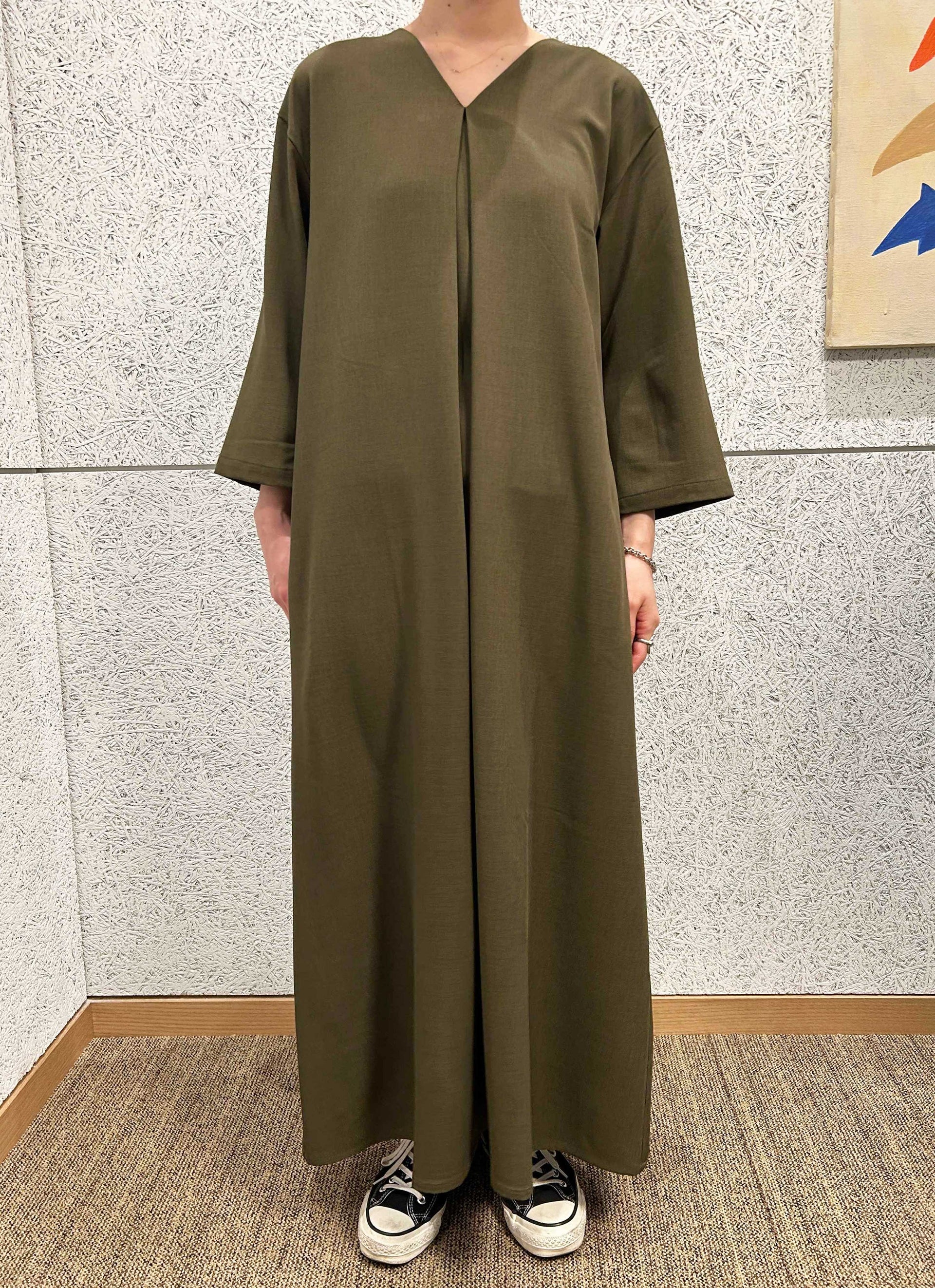 生地に程よいストレッチ感を持たせたワンピースです。顔まわりをすっきりと演出するVネック。胸元の中心にタックを施すことで、エレガントなドレープを表現しています。ドロップショルダーから続く、やや短めの長袖もポイント。無地のワンカラーで仕上げたボディには、サイドポケット付き。上品なロング丈は、落ち感のあるストレートシルエットでリラクシーな着心地をもたらします。