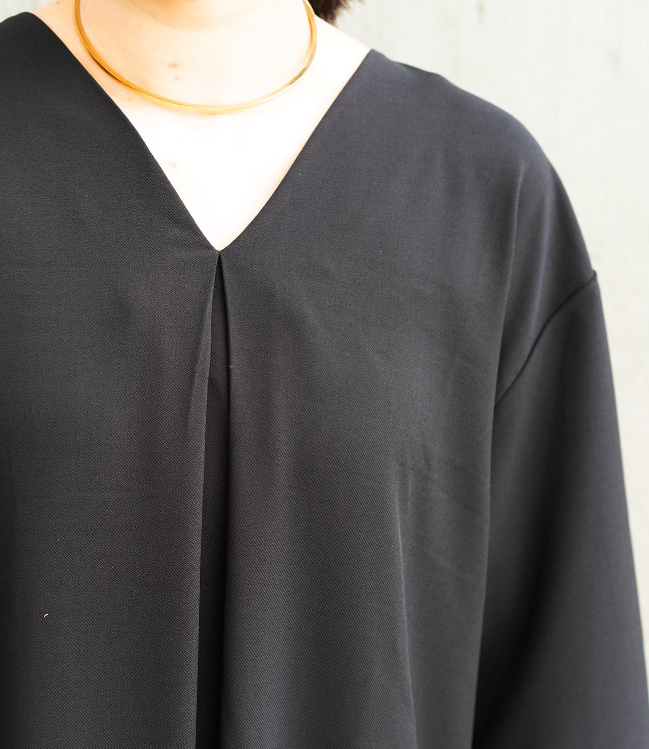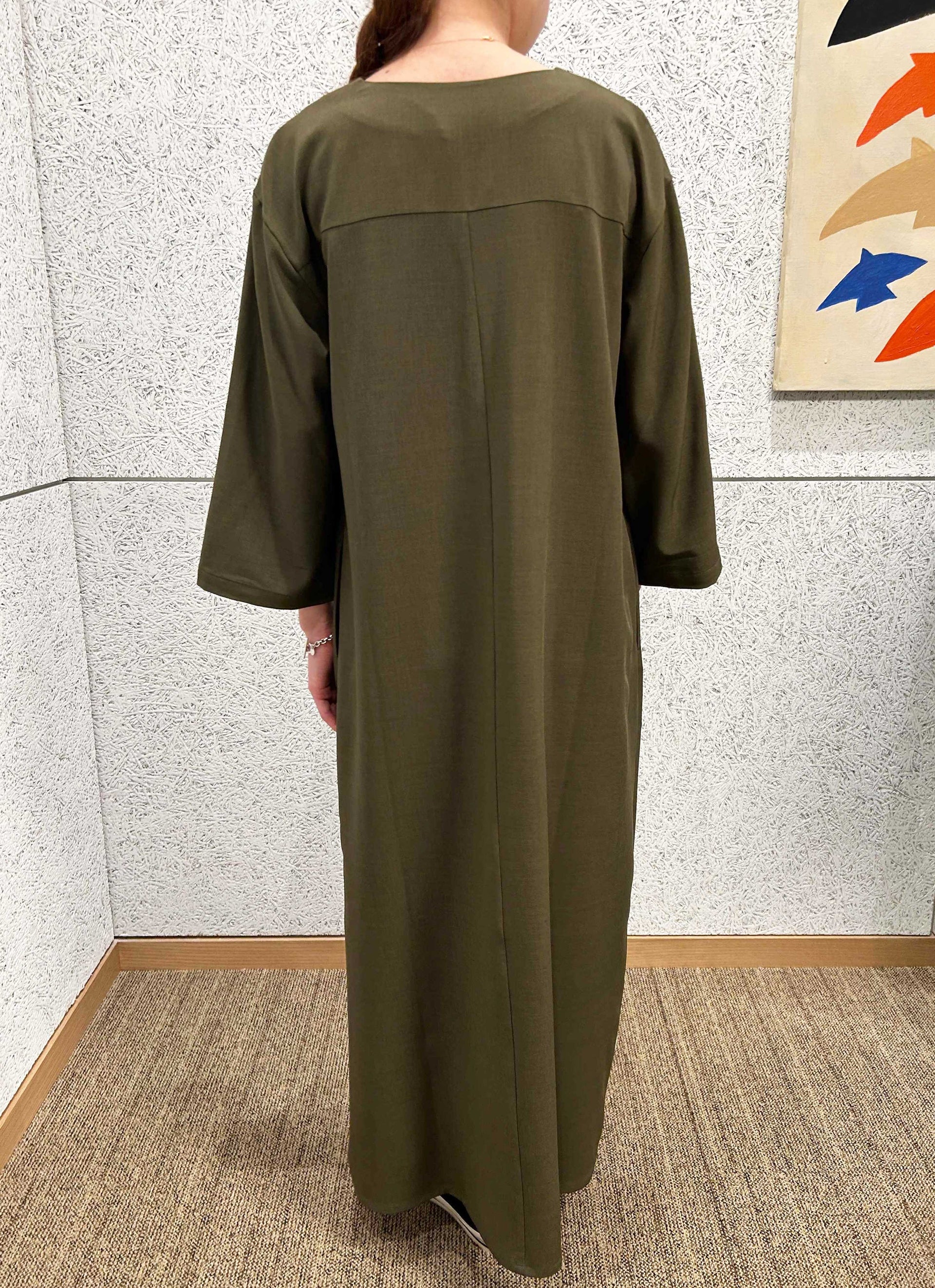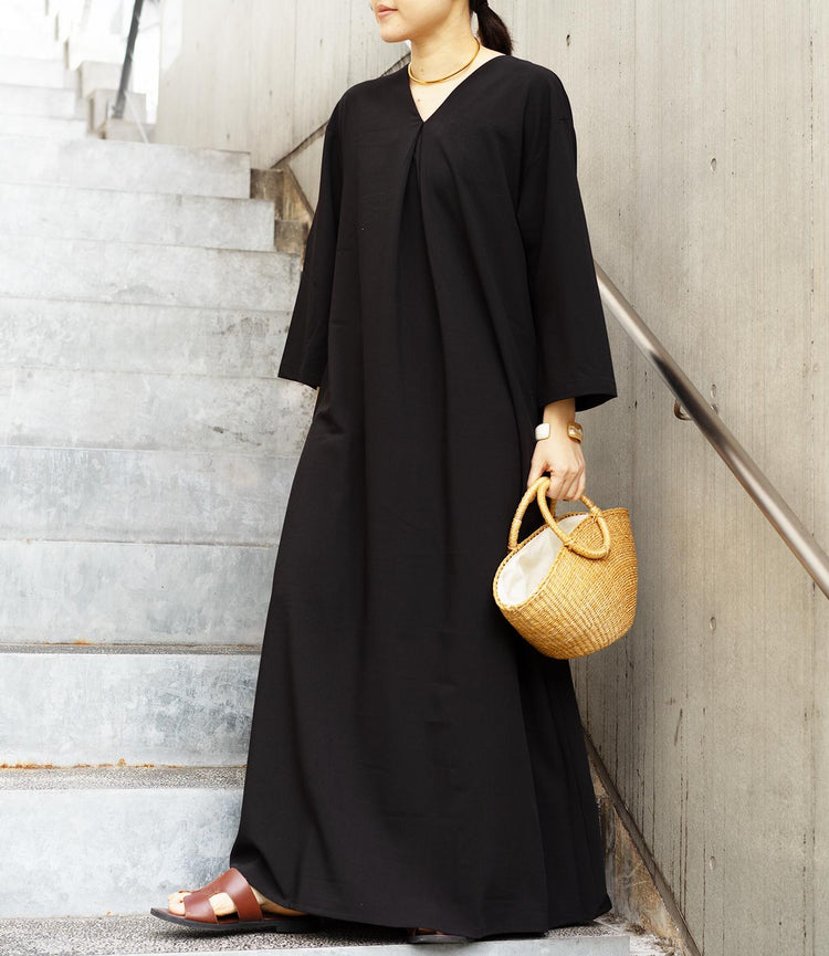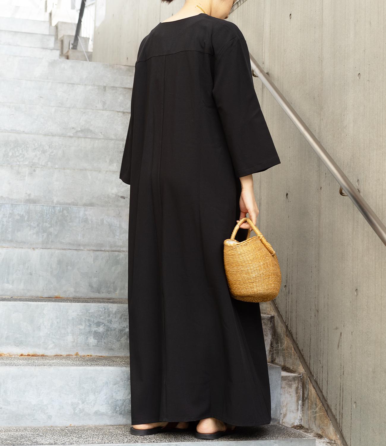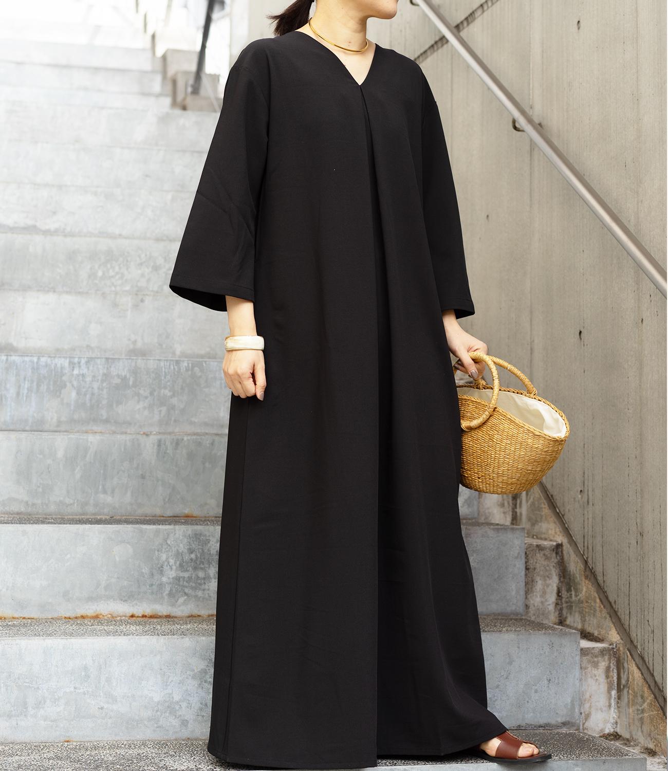 生地に程よいストレッチ感を持たせたワンピースです。顔まわりをすっきりと演出するVネック。胸元の中心にタックを施すことで、エレガントなドレープを表現しています。ドロップショルダーから続く、やや短めの長袖もポイント。無地のワンカラーで仕上げたボディには、サイドポケット付き。上品なロング丈は、落ち感のあるストレートシルエットでリラクシーな着心地をもたらします。