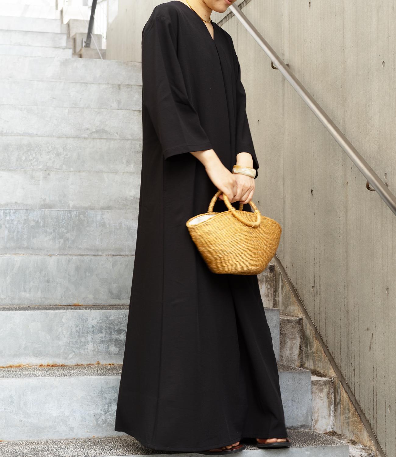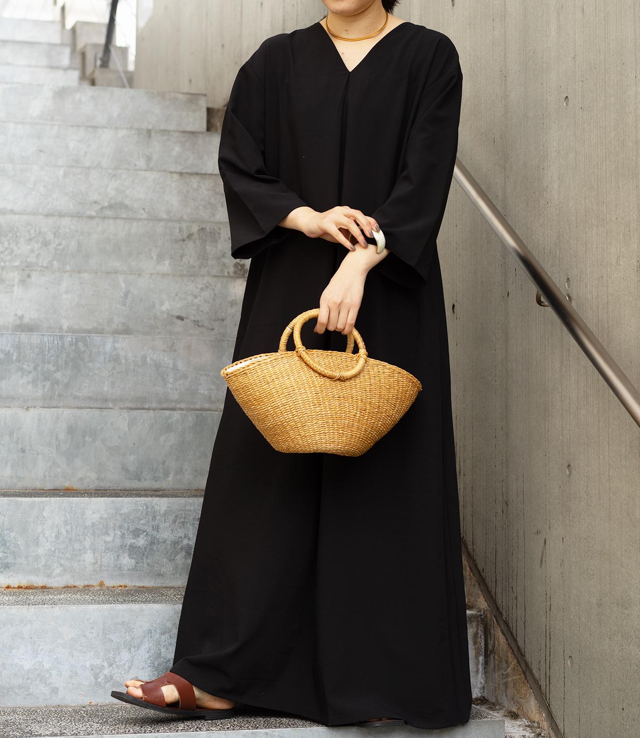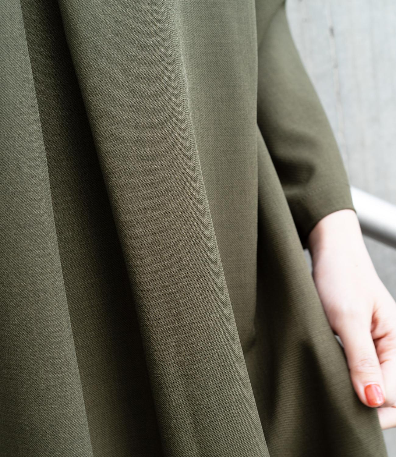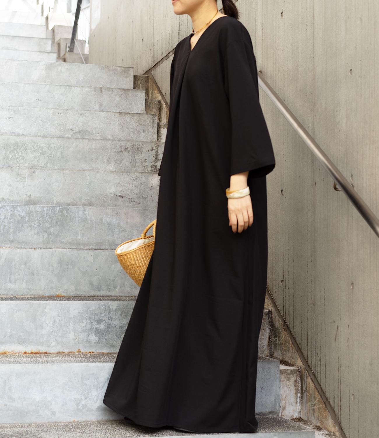 生地に程よいストレッチ感を持たせたワンピースです。顔まわりをすっきりと演出するVネック。胸元の中心にタックを施すことで、エレガントなドレープを表現しています。ドロップショルダーから続く、やや短めの長袖もポイント。無地のワンカラーで仕上げたボディには、サイドポケット付き。上品なロング丈は、落ち感のあるストレートシルエットでリラクシーな着心地をもたらします。