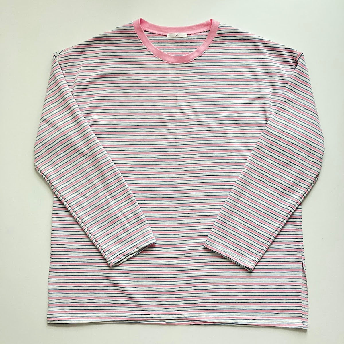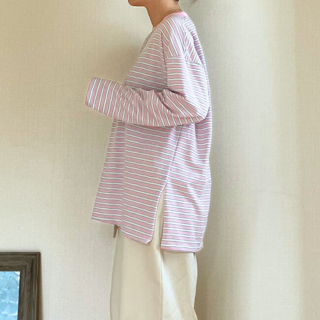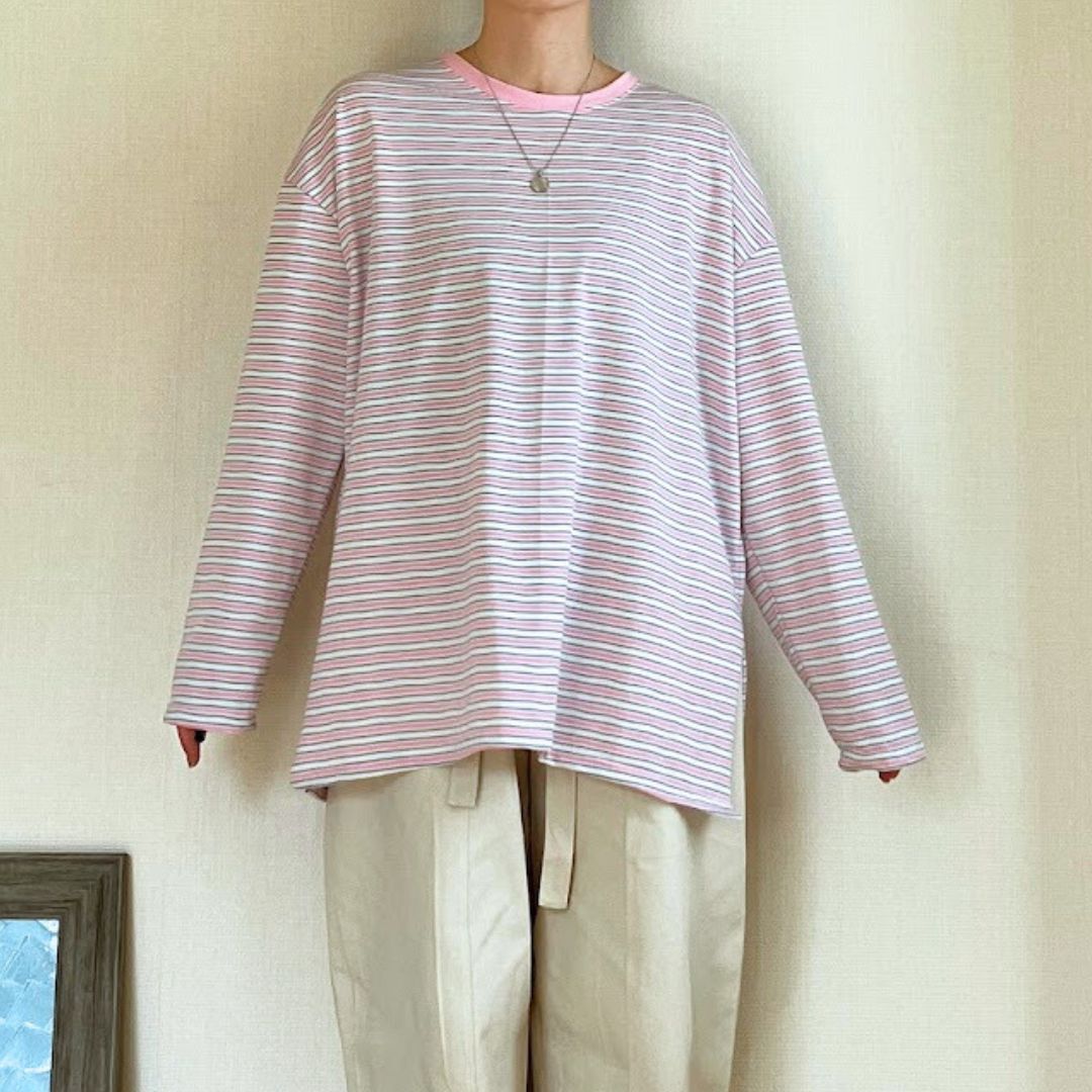 細めのボーダーで主張が強すぎず、大人のカジュアルスタイルにも取り入れやすいのがポイント。ネック部分のリブがさりげないアクセントになり、シンプルながらもこなれた印象に仕上がります。