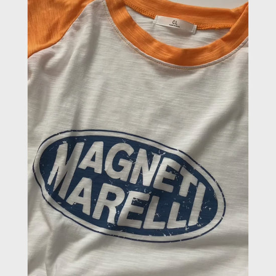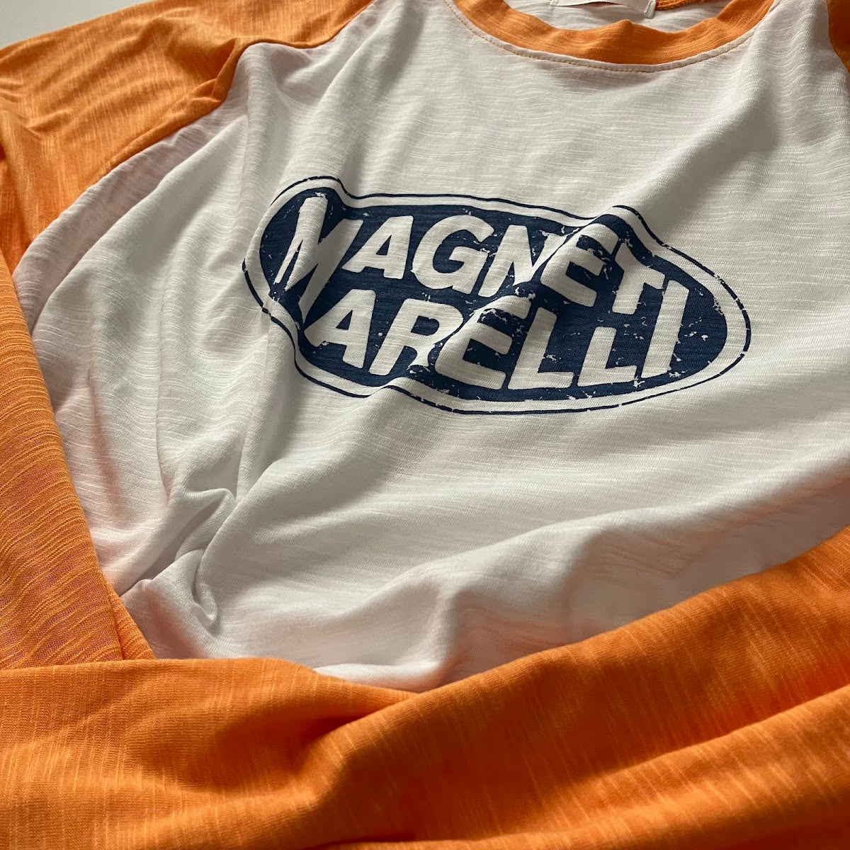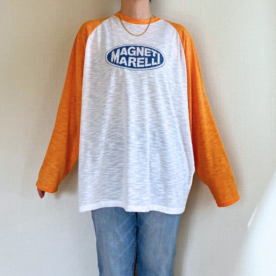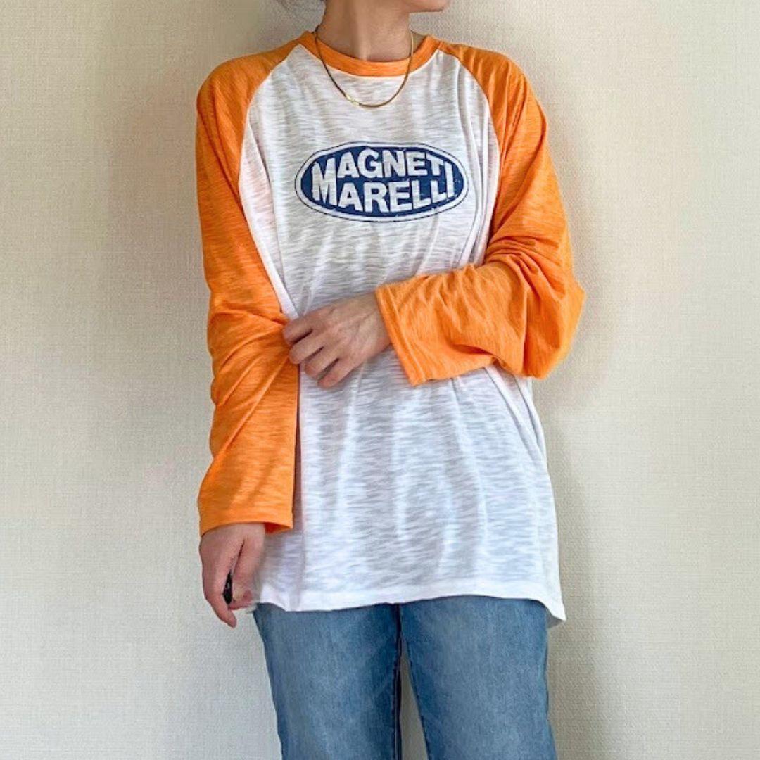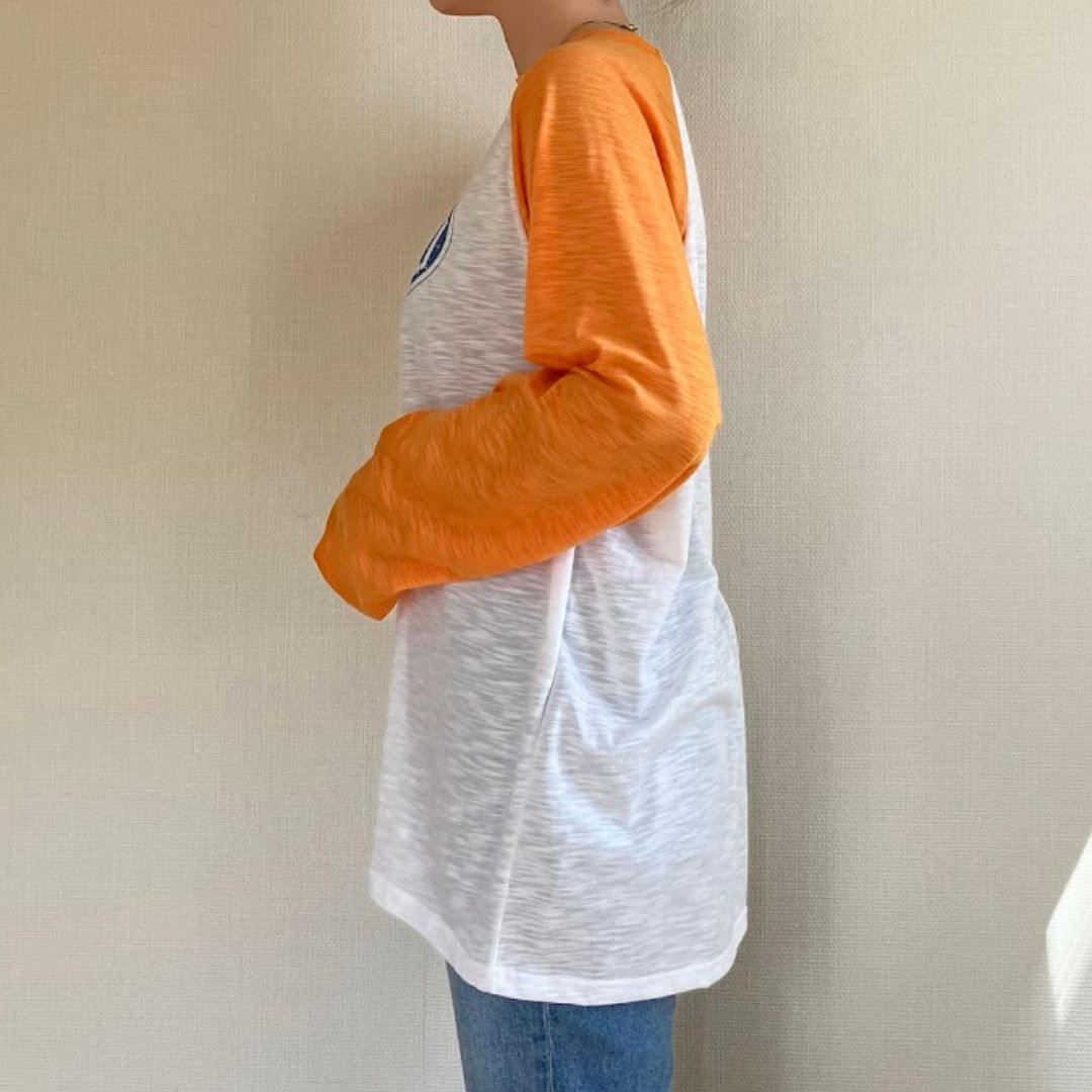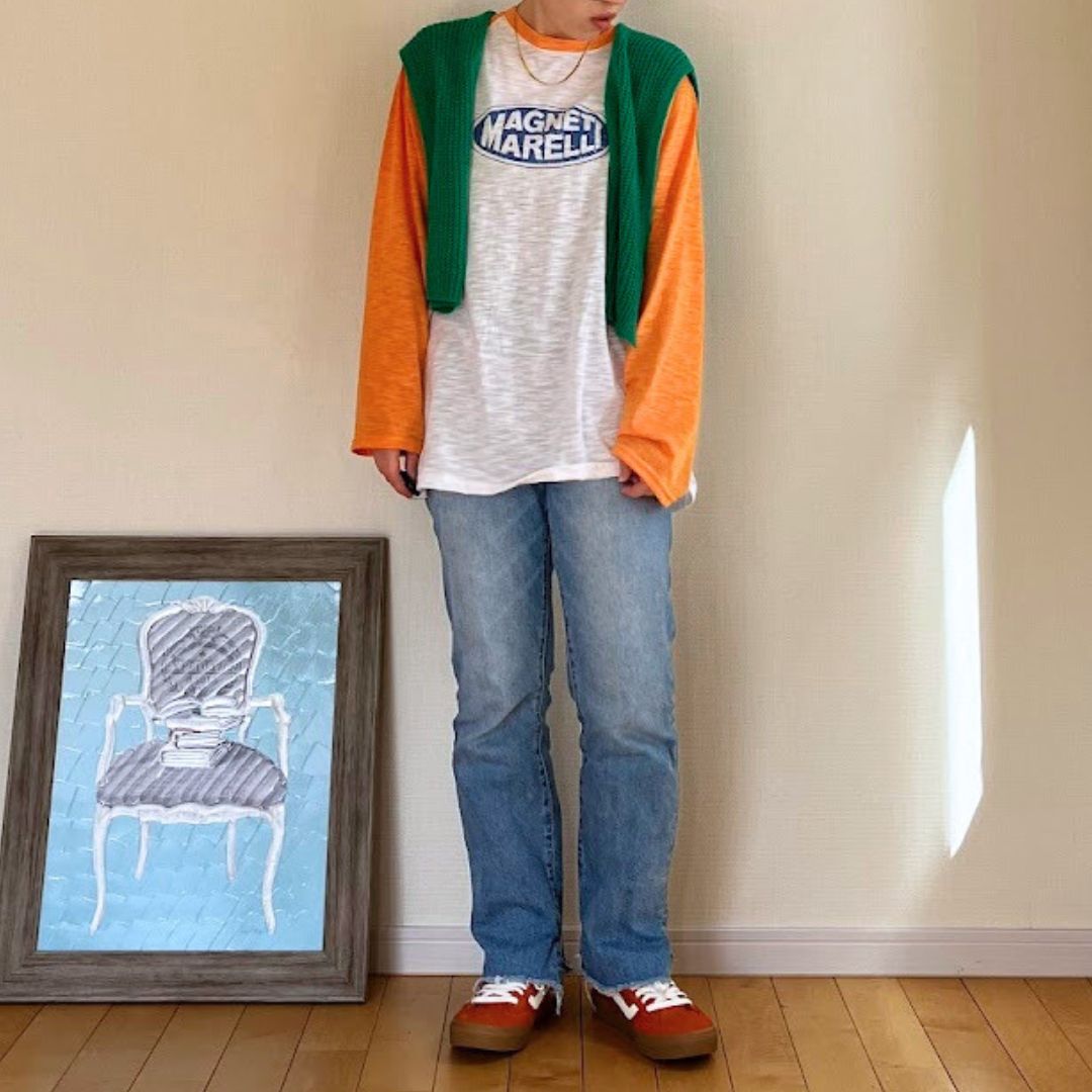 アメカジっぽいオレンジ×ホワイトの配色で、シンプルなデニム合わせでもこなれたカジュアルコーデに。
