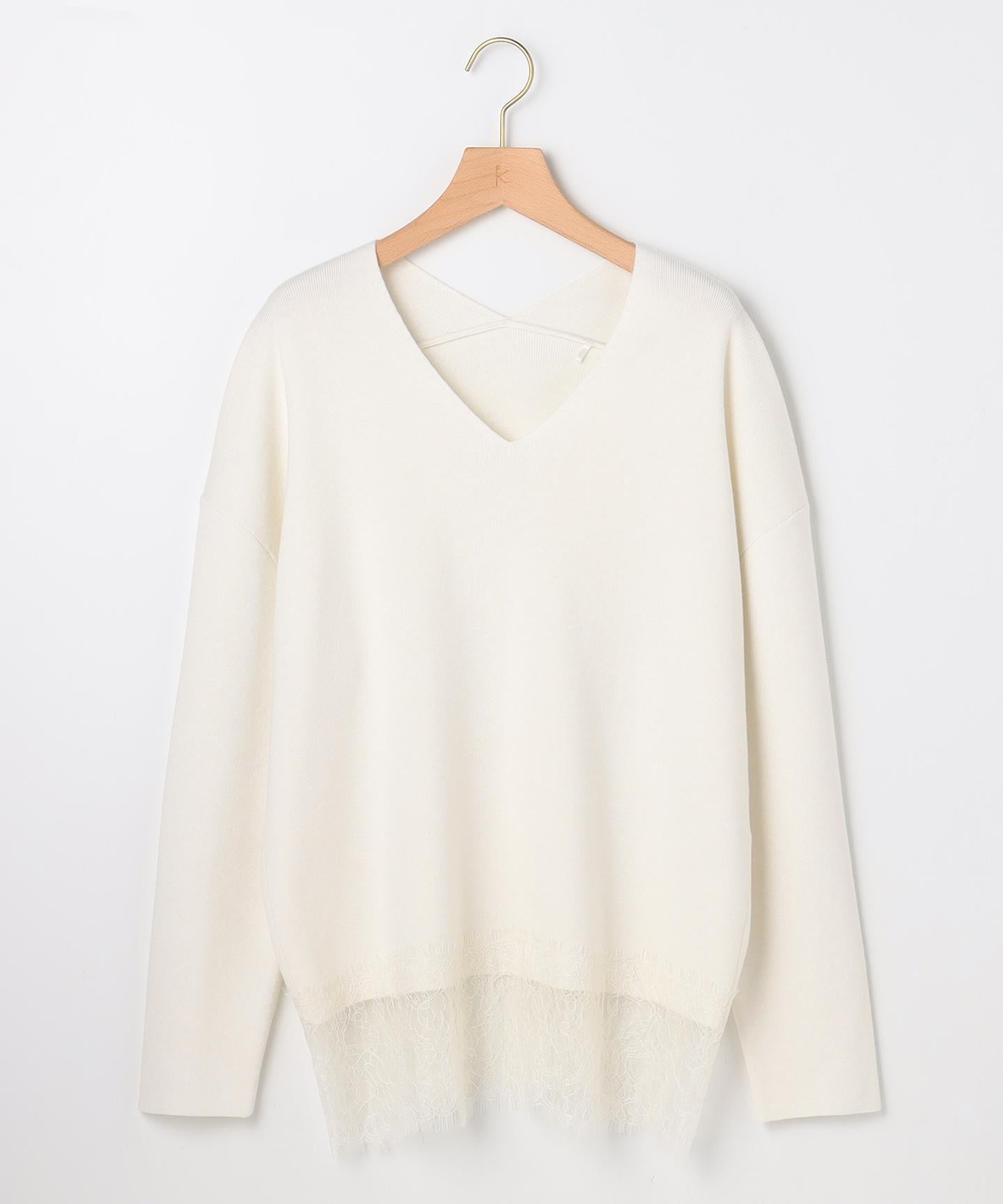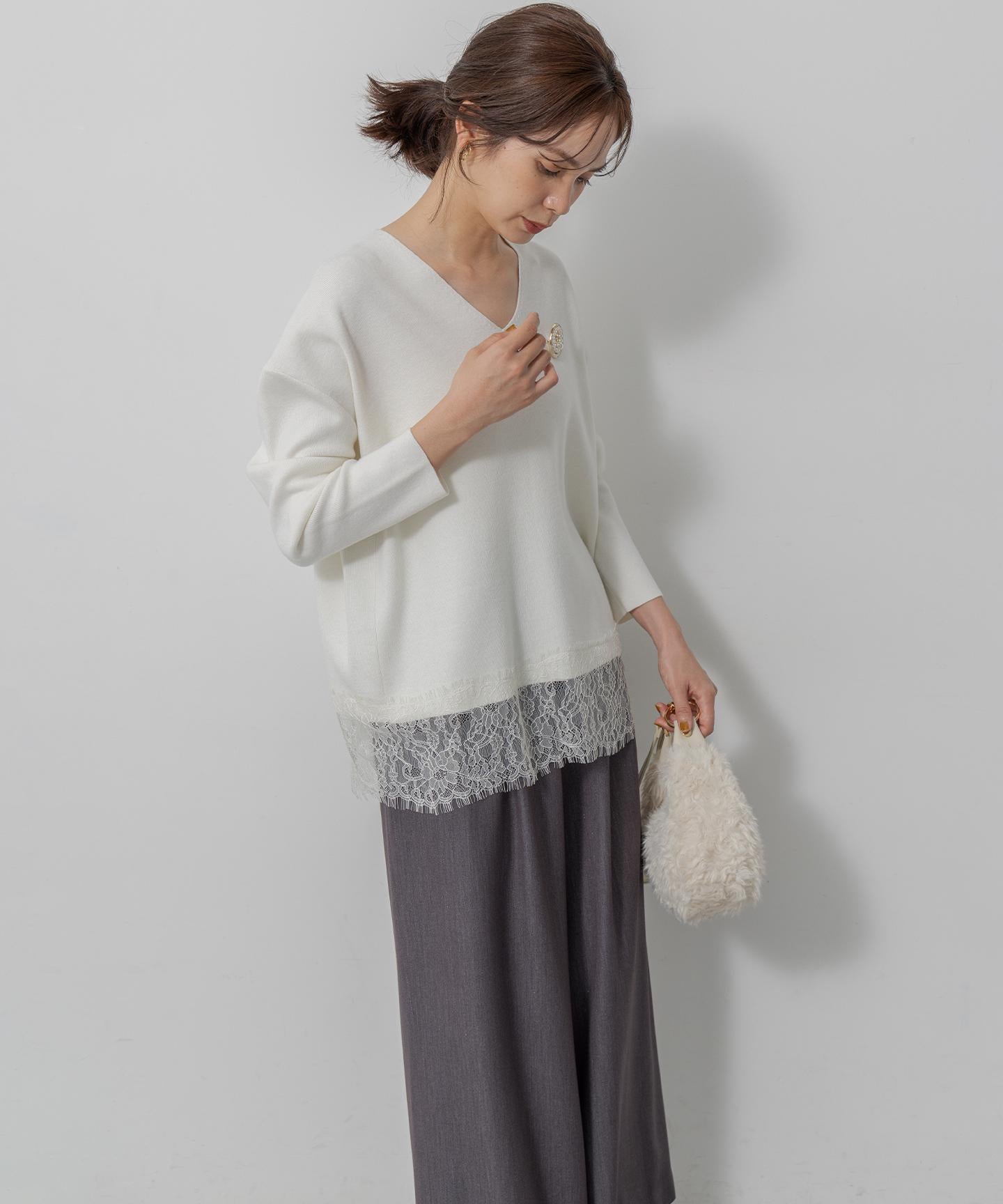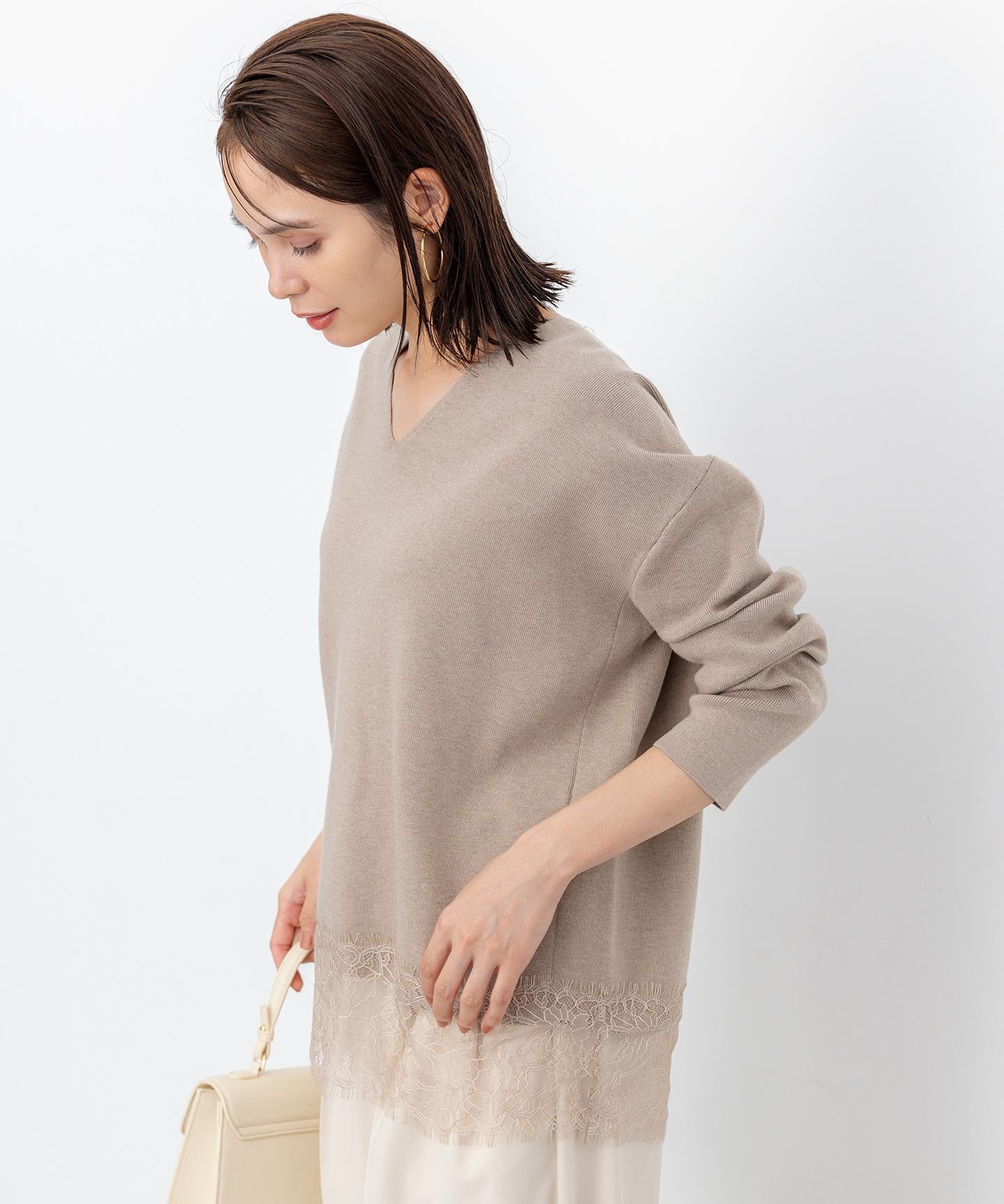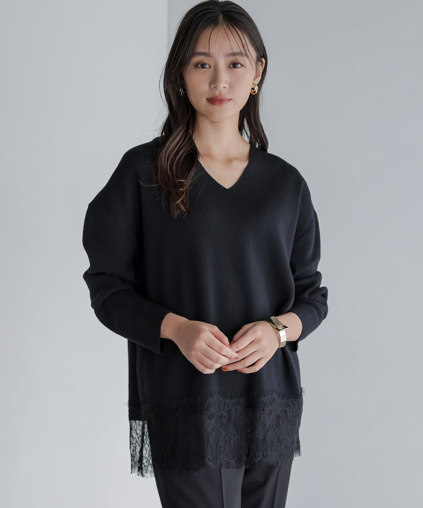 【スタッフコメント】▼身長158cm|着用サイズ2 (通常着用サイズM)トレンドのレース素材をドッキングした女性らしい1枚。シンプルながら丸みのあるシルエットやVネックの開き具合など計算しつくされたアイテムです。