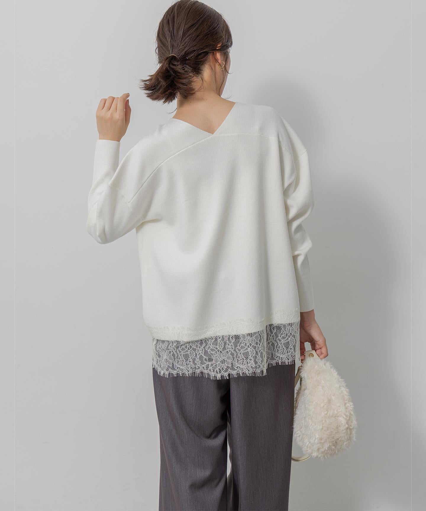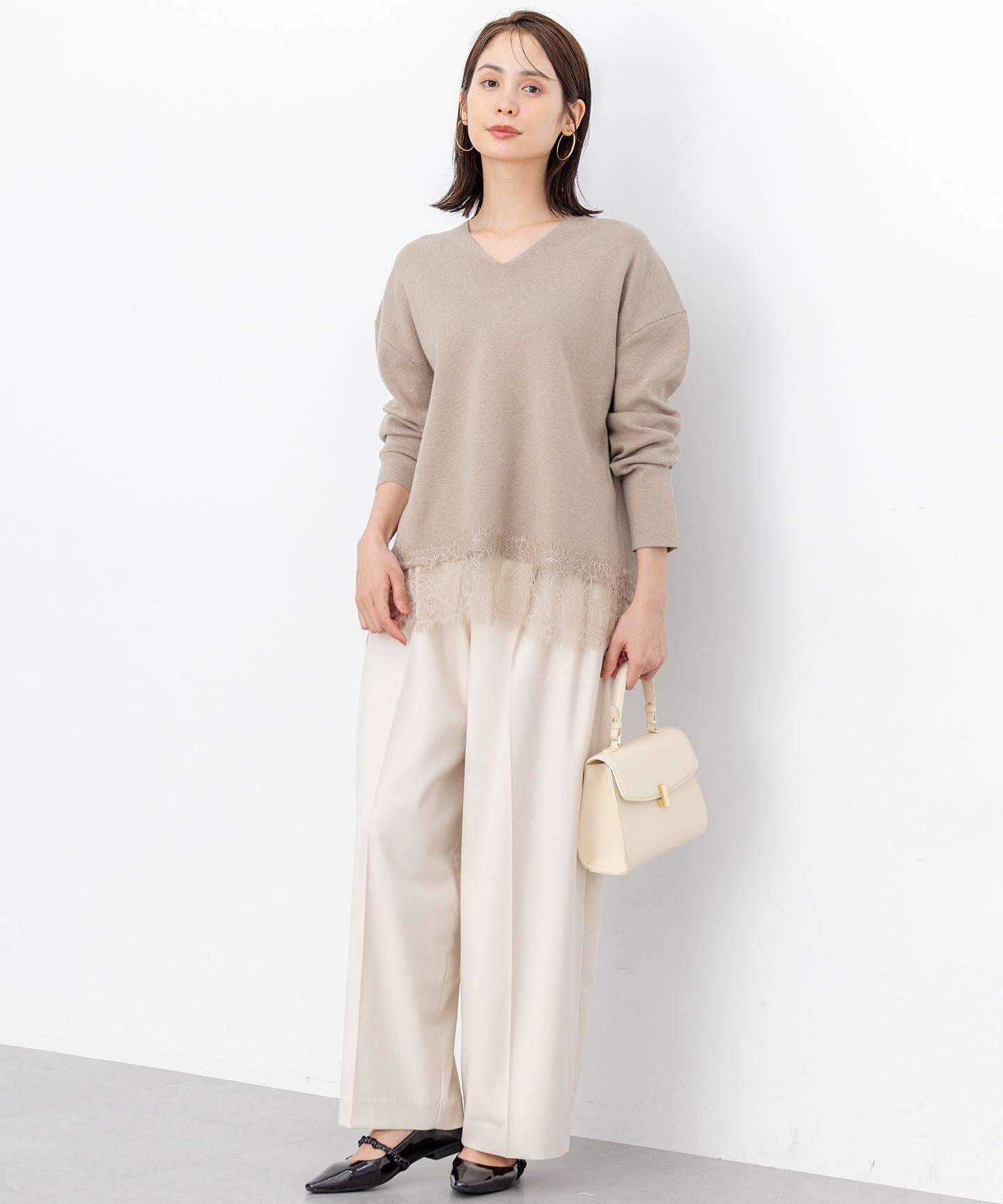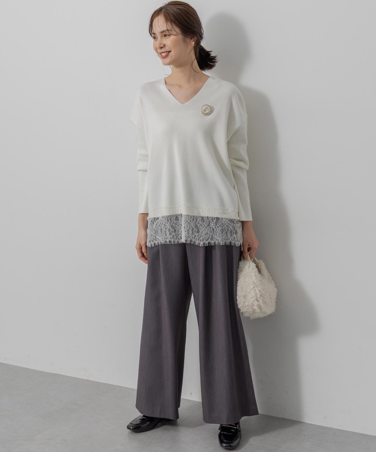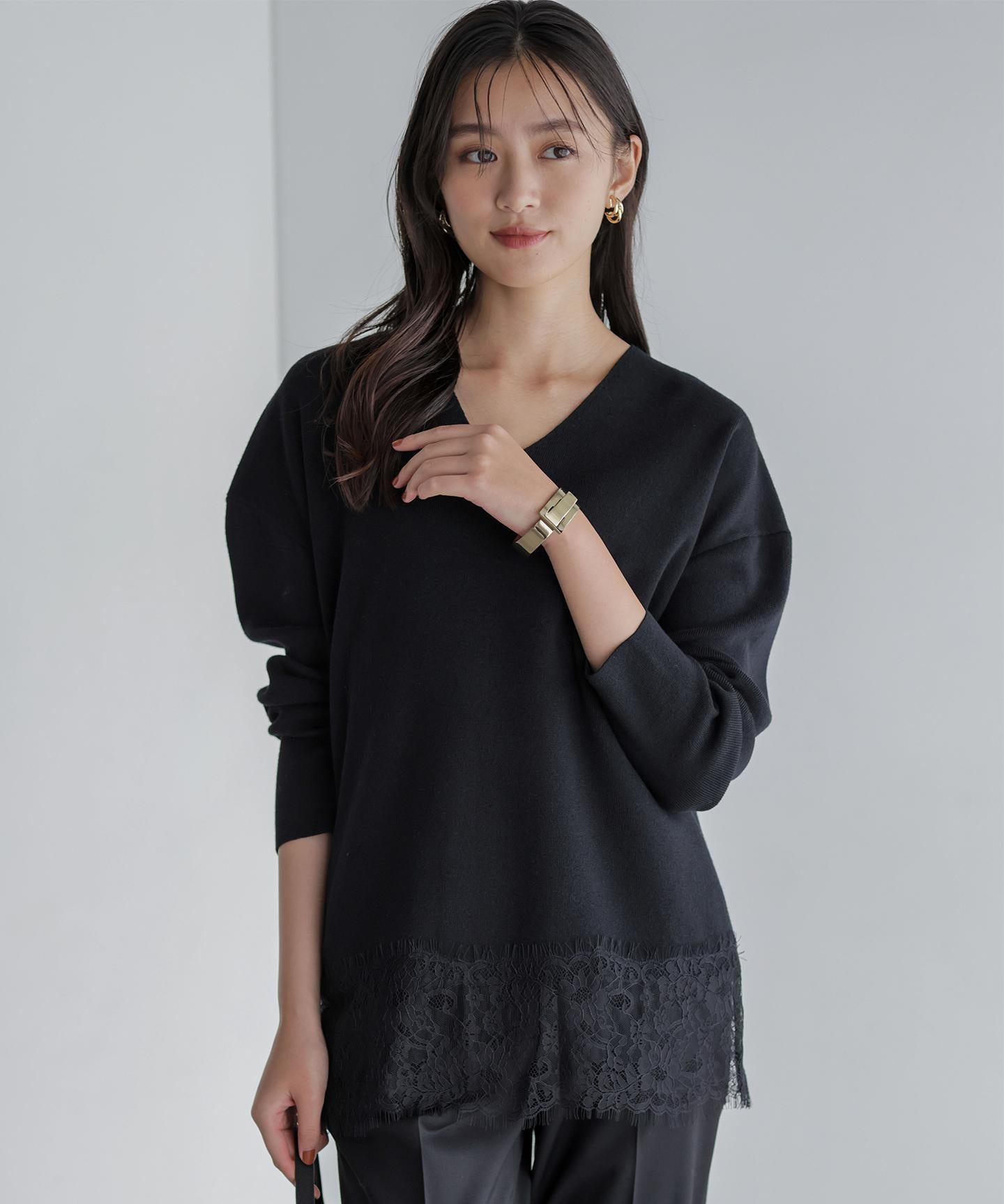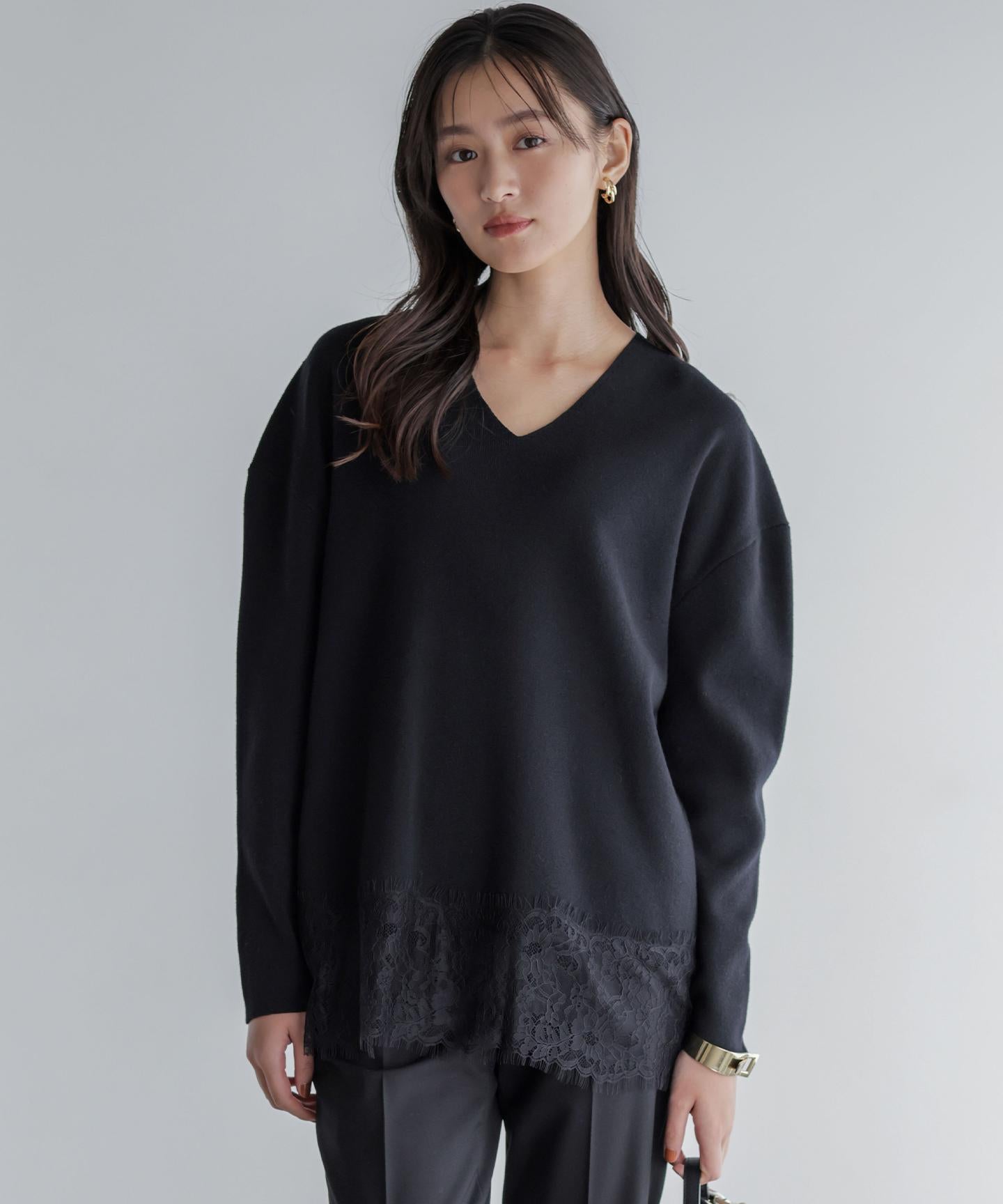 【スタッフコメント】▼身長158cm|着用サイズ2 (通常着用サイズM)トレンドのレース素材をドッキングした女性らしい1枚。シンプルながら丸みのあるシルエットやVネックの開き具合など計算しつくされたアイテムです。
