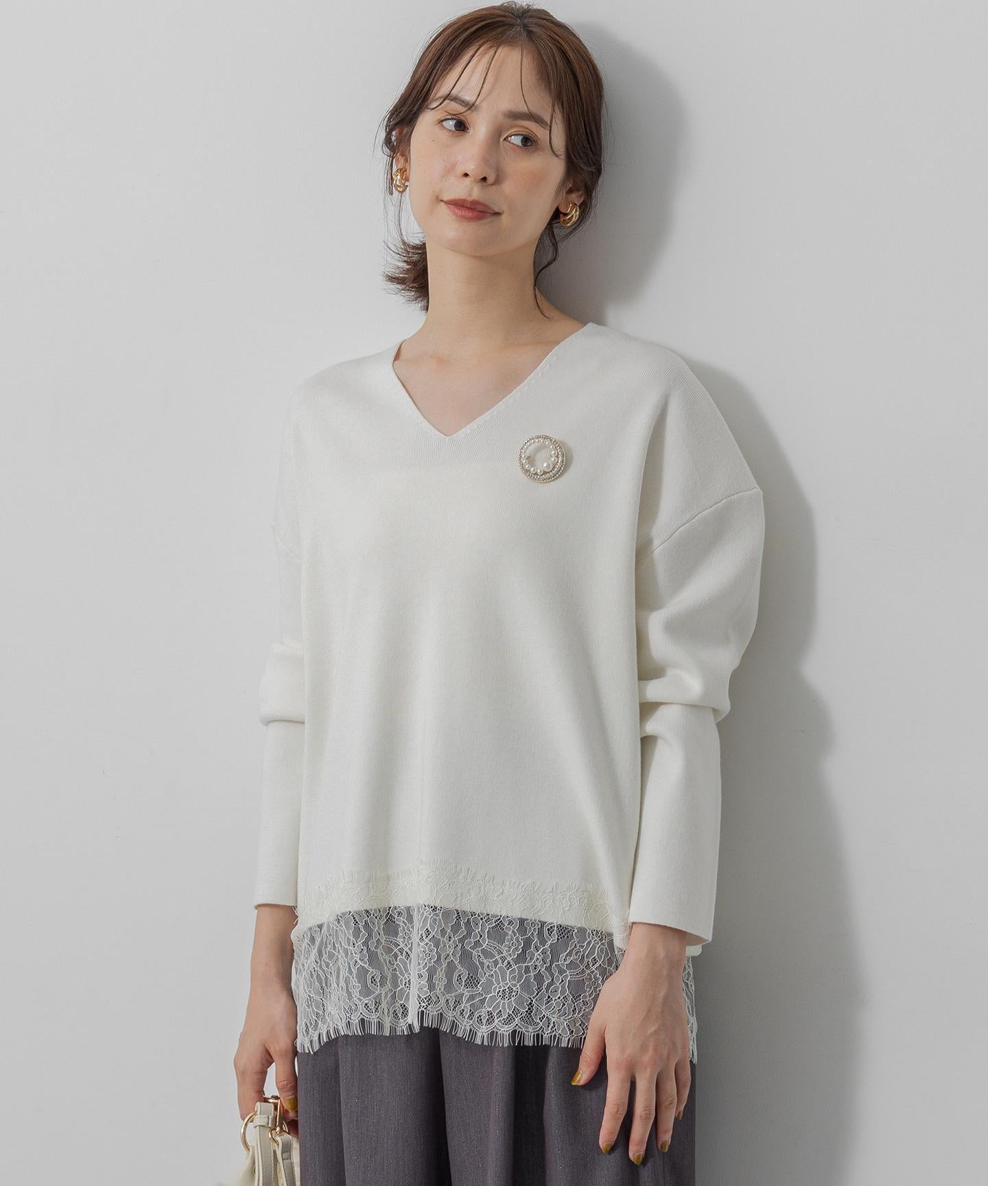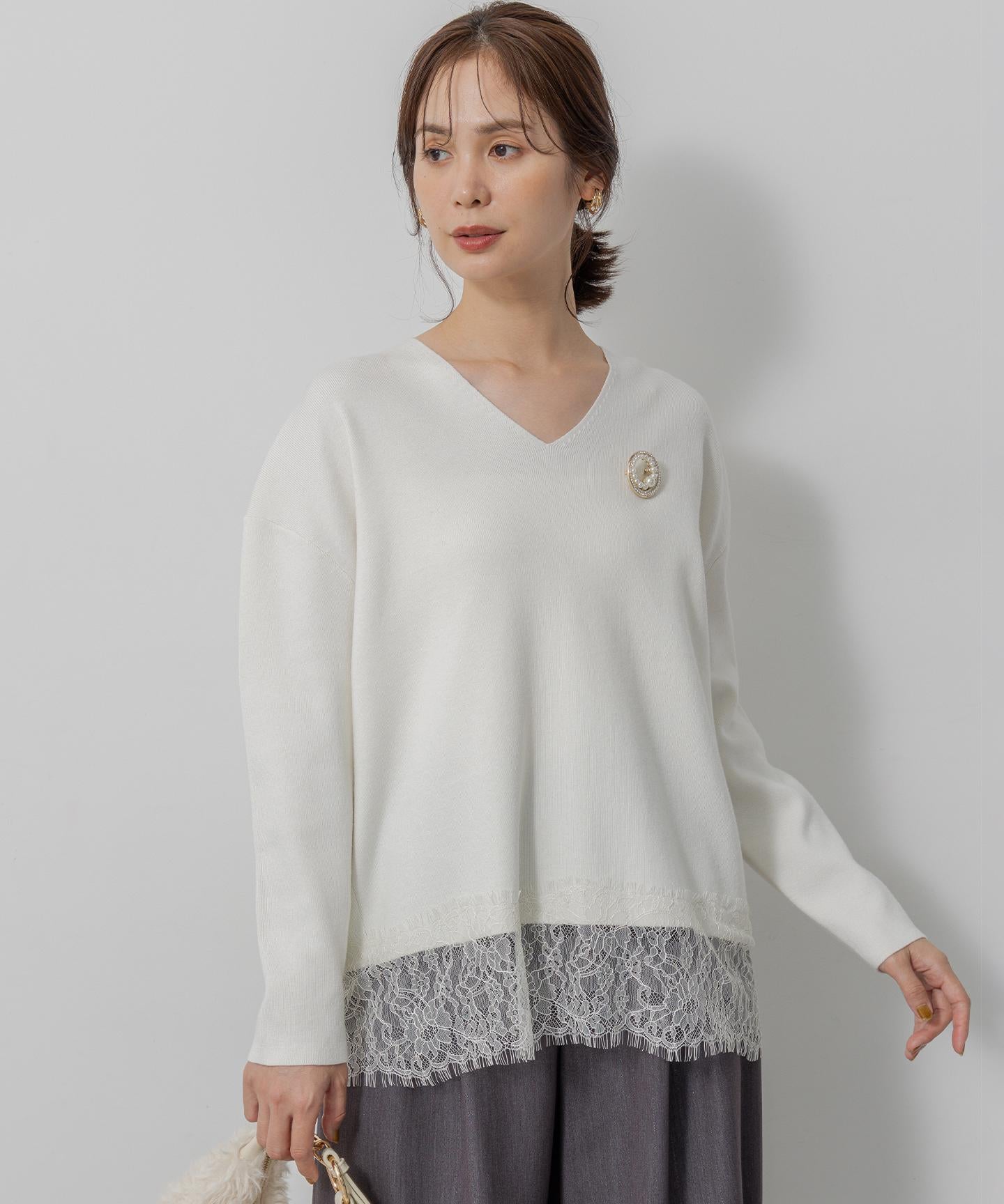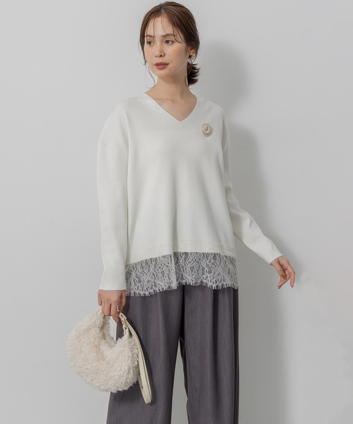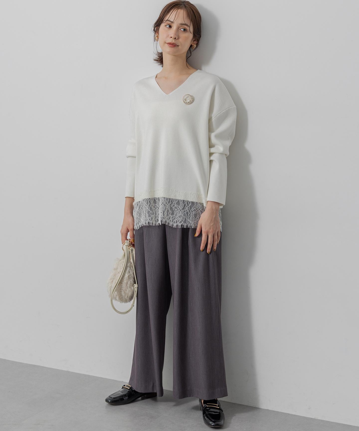 【スタッフコメント】▼身長158cm|着用サイズ2 (通常着用サイズM)トレンドのレース素材をドッキングした女性らしい1枚。シンプルながら丸みのあるシルエットやVネックの開き具合など計算しつくされたアイテムです。