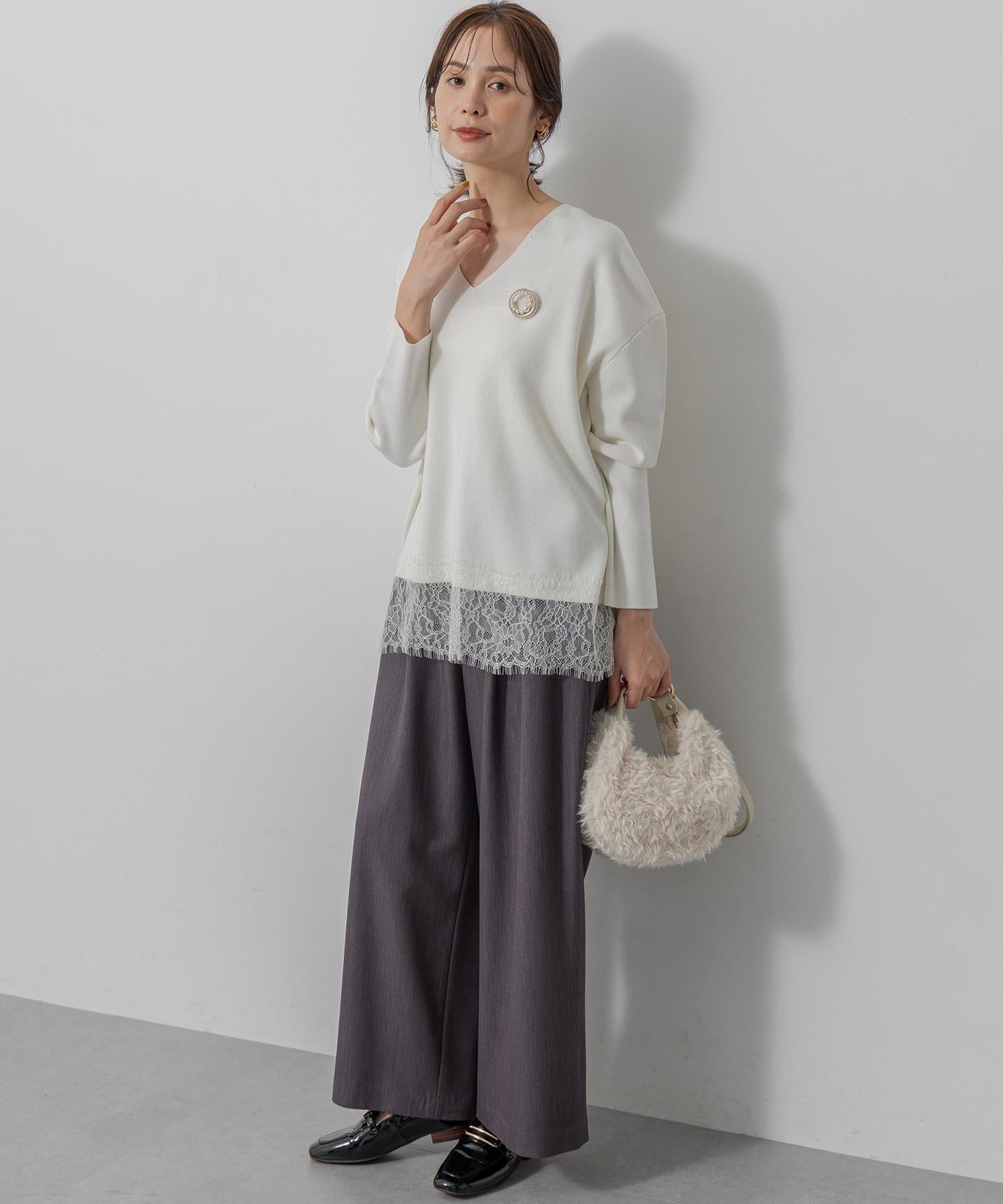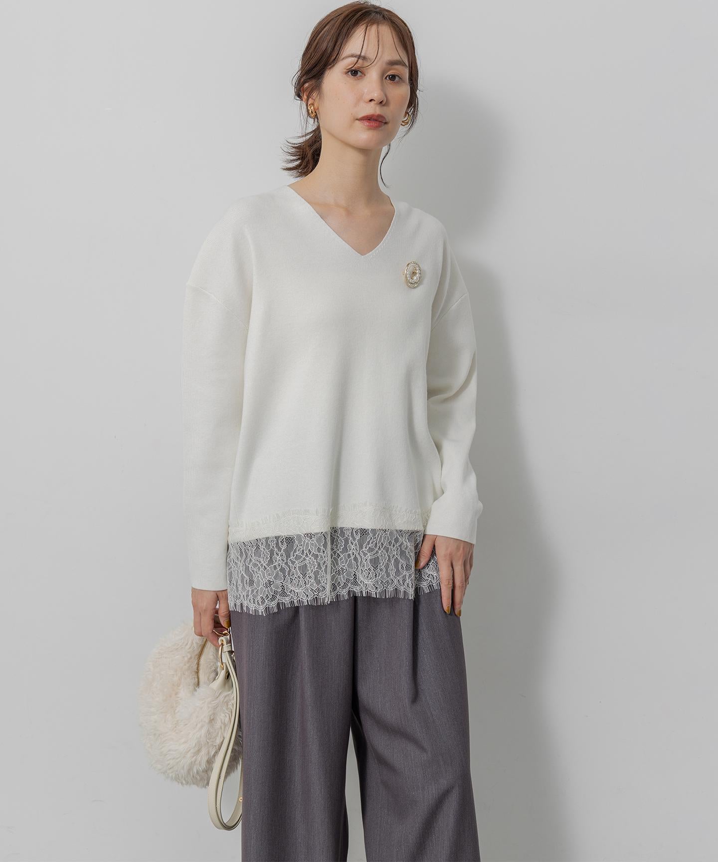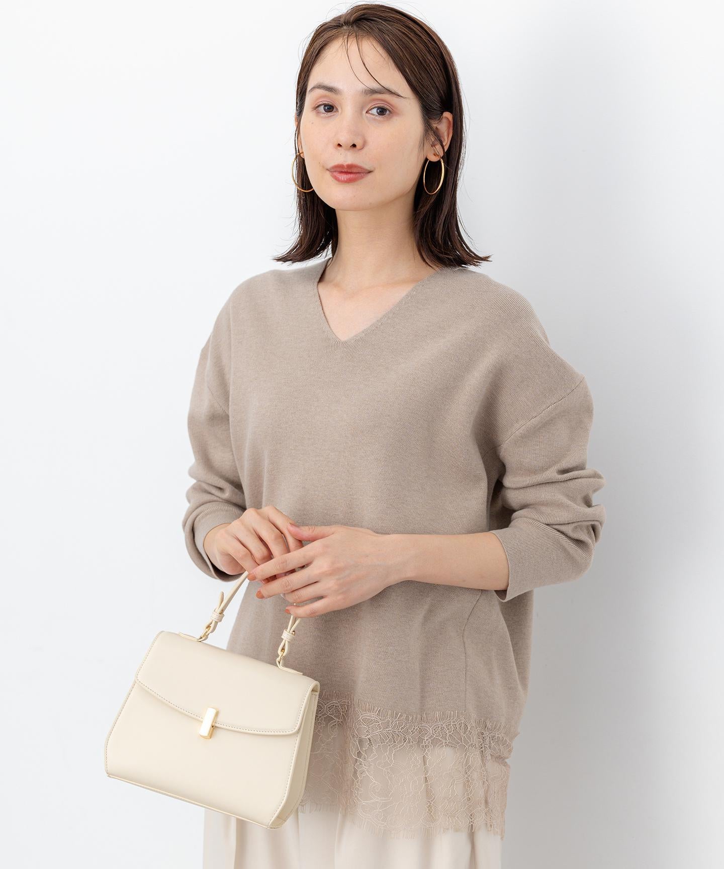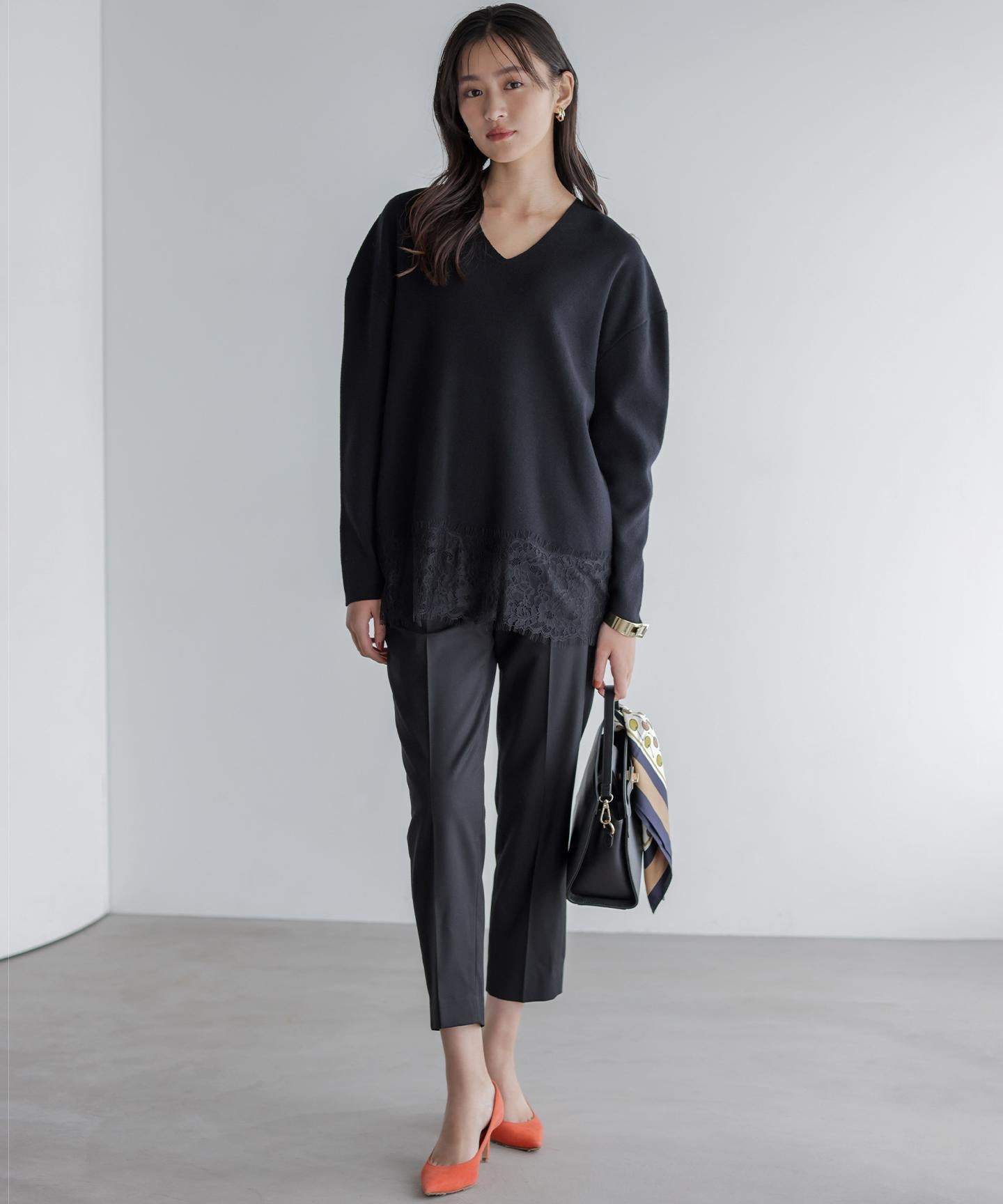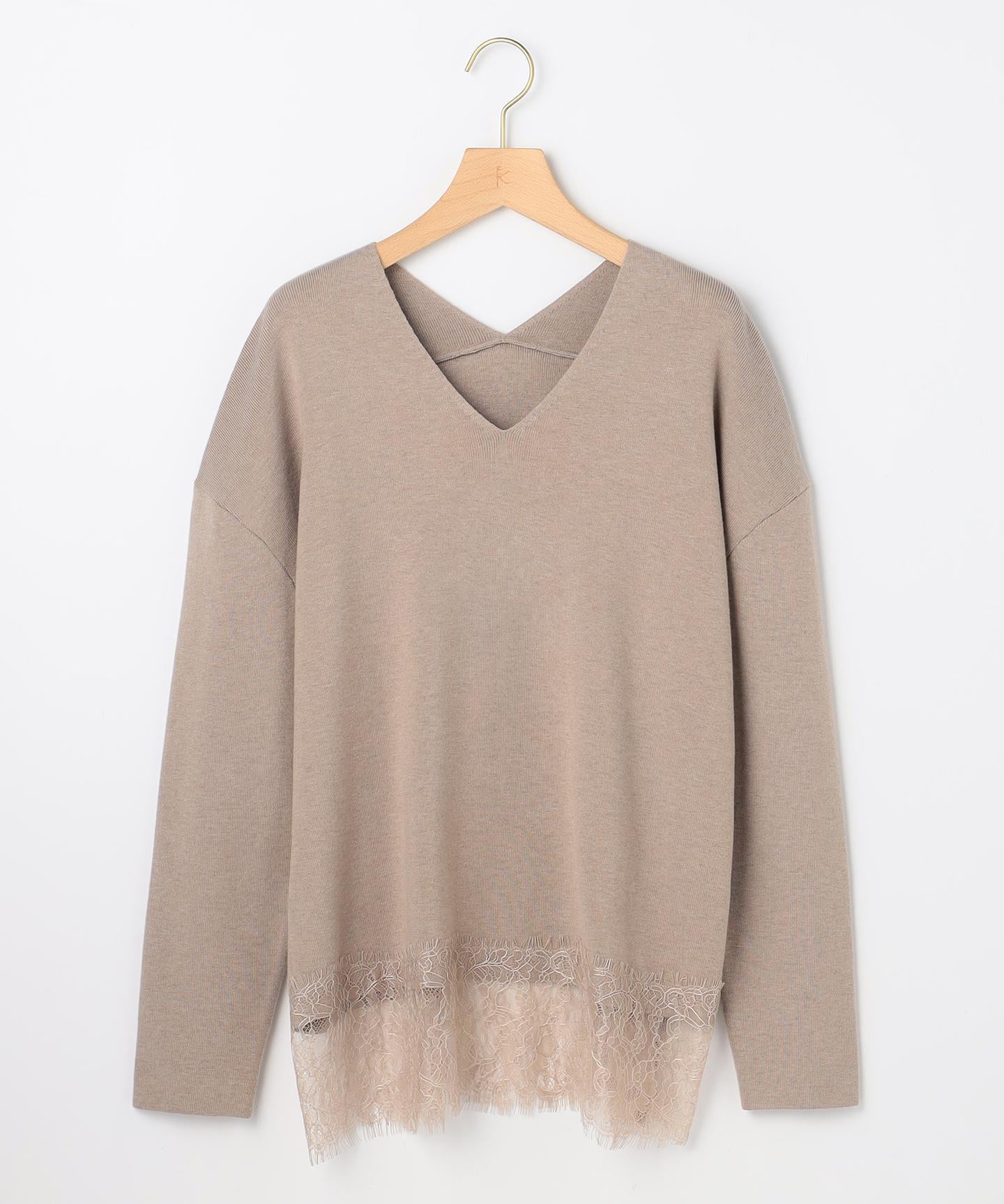 【スタッフコメント】▼身長158cm|着用サイズ2 (通常着用サイズM)トレンドのレース素材をドッキングした女性らしい1枚。シンプルながら丸みのあるシルエットやVネックの開き具合など計算しつくされたアイテムです。