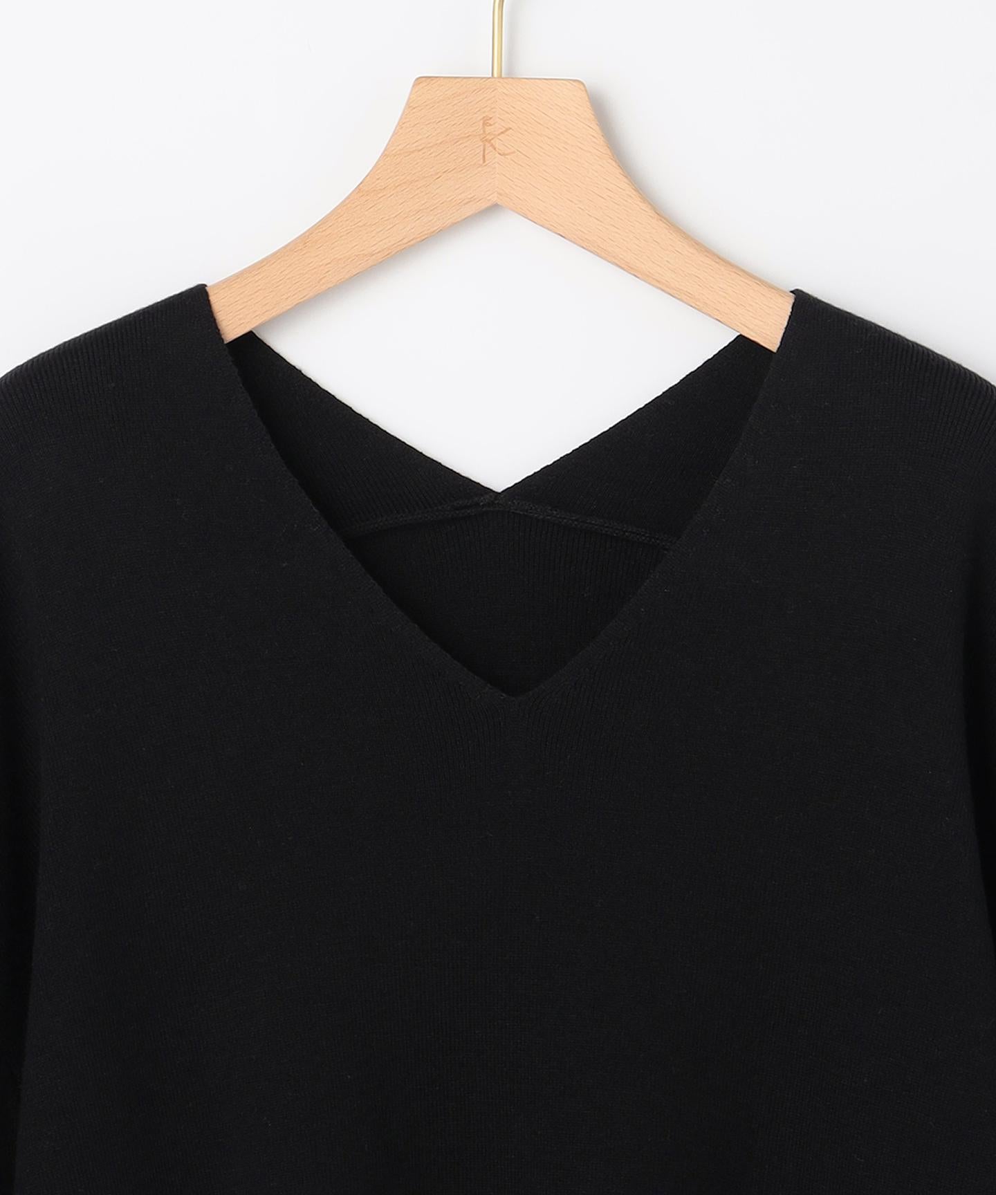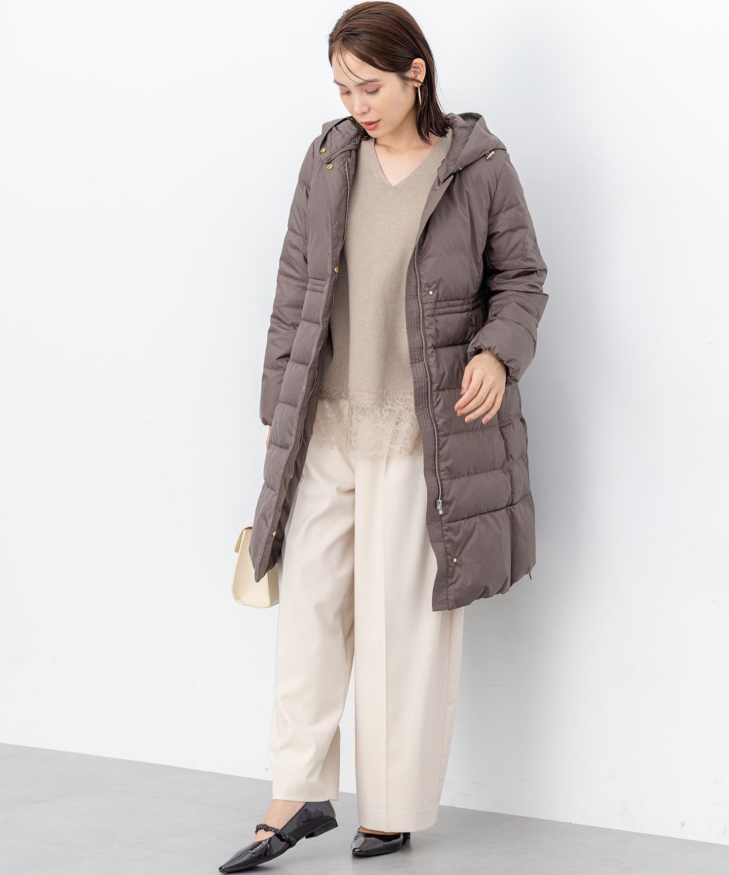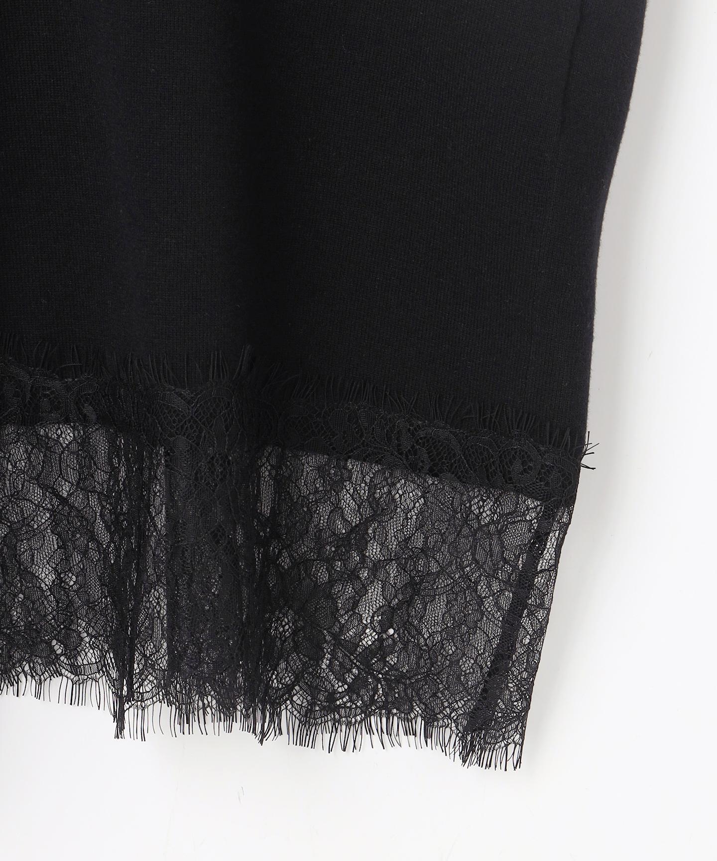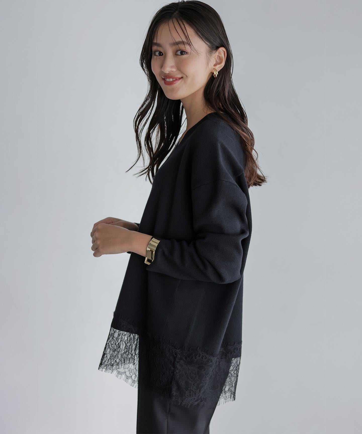 ■デザイン・デコルテがきれいに引き立つVネックと、適度にゆとりのある立体的なコクーンシルエットにこだわりました。・裾には繊細なスカラップレースを贅沢にあしらい、上品で女性らしい抜け感を演出。・長めの着丈ですが、レースの透け感とゆるやかにカーブさせた裾のラインで軽やかさをプラスしています。・立体的なフォルムは体のラインを拾わず、後ろ姿も洗練された印象に仕上がります。