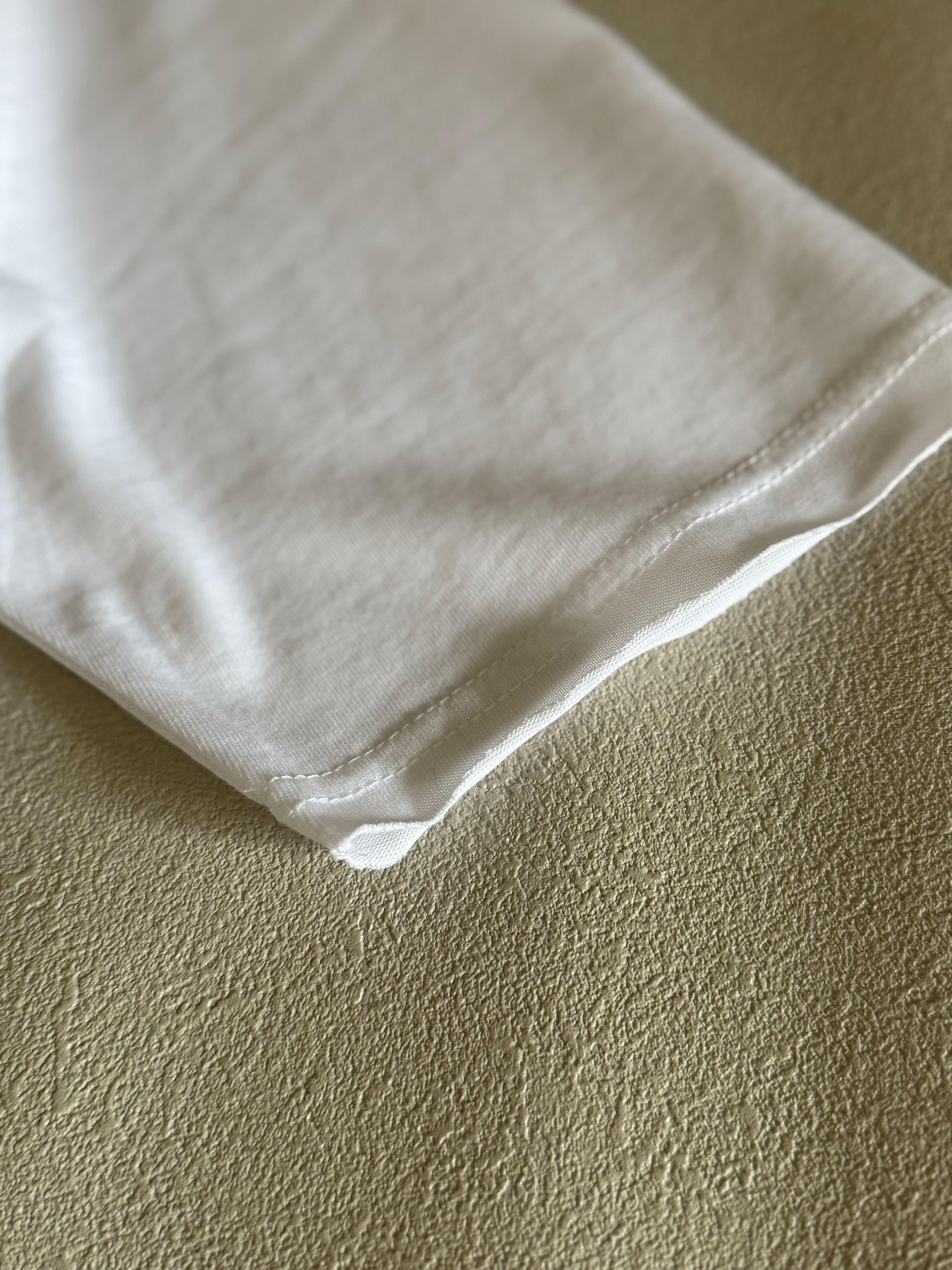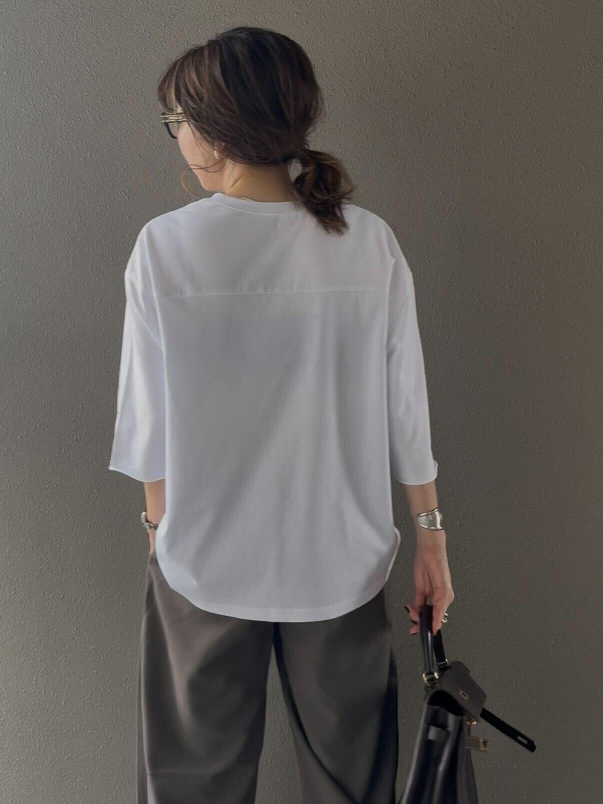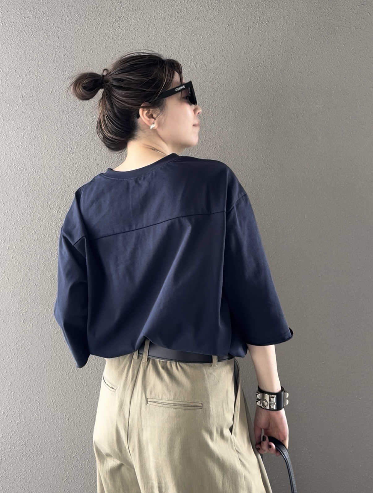 毛羽のない綺麗めな生地を使用し、肩部分の切り返しもバックのみに。カジュアルになりすぎない大人のフットボールTに仕上げました。