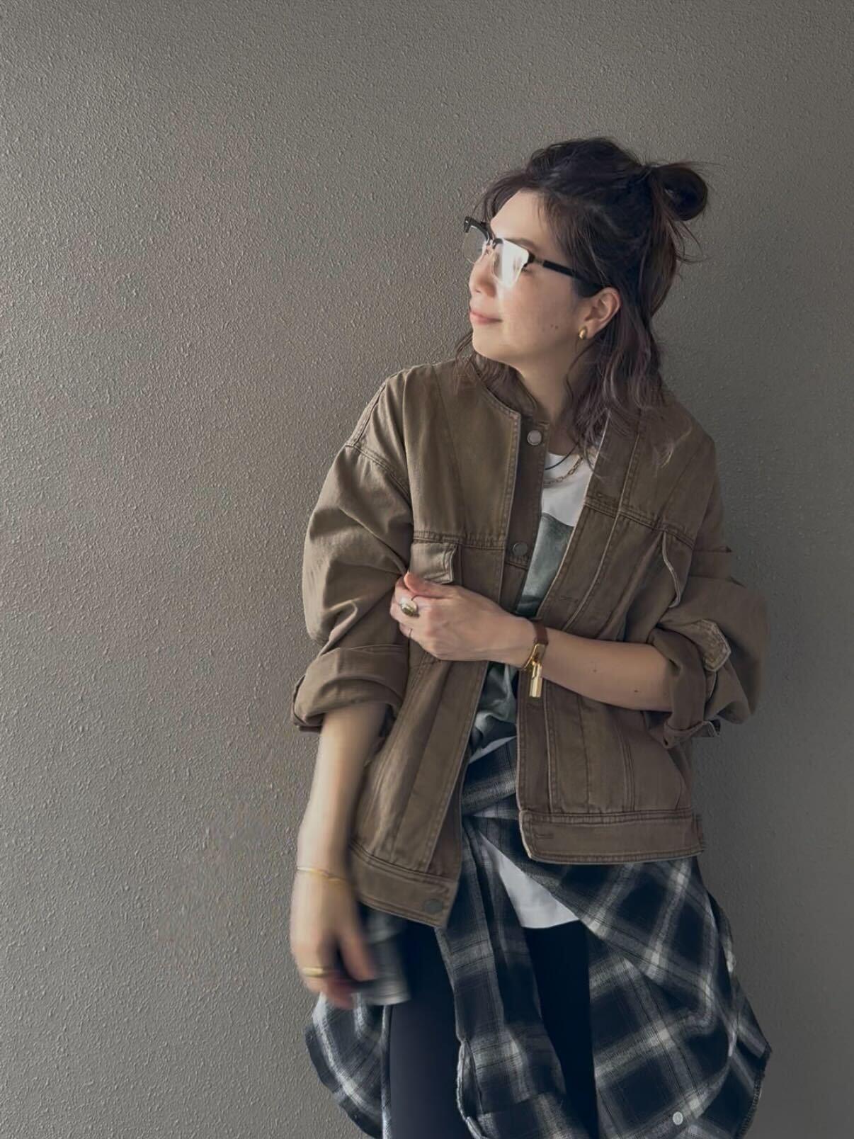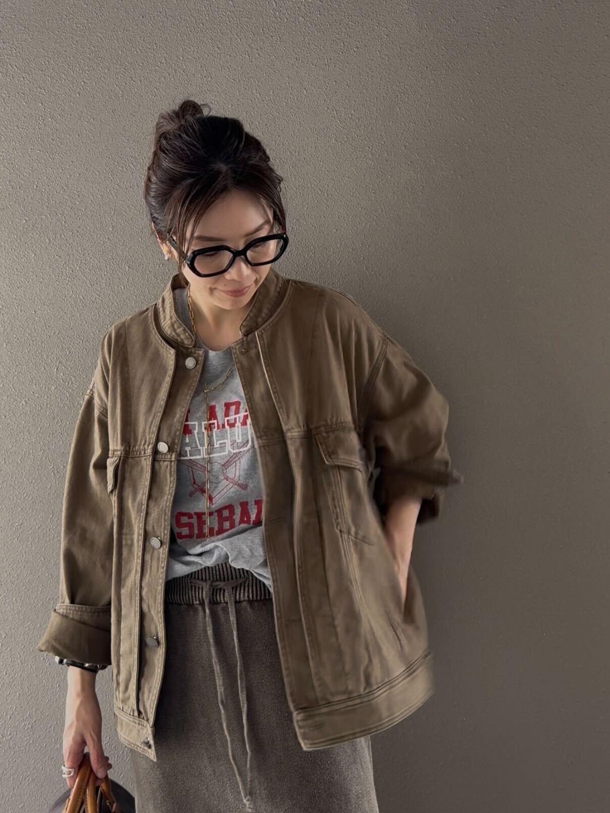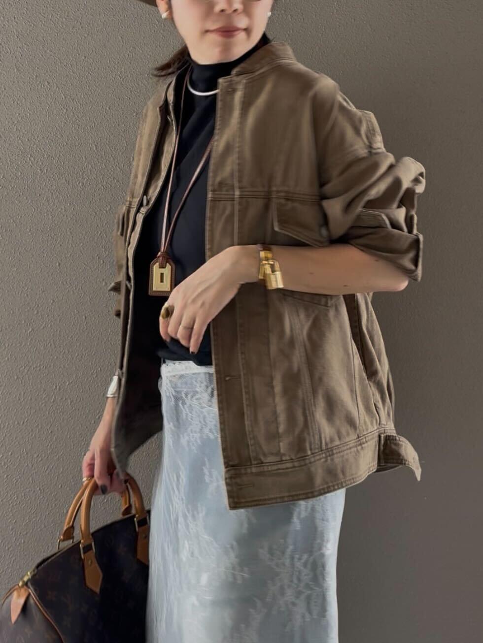 首元をすっきり見せるノーカラーデザインは、ラフなデニムに上品さをプラス。