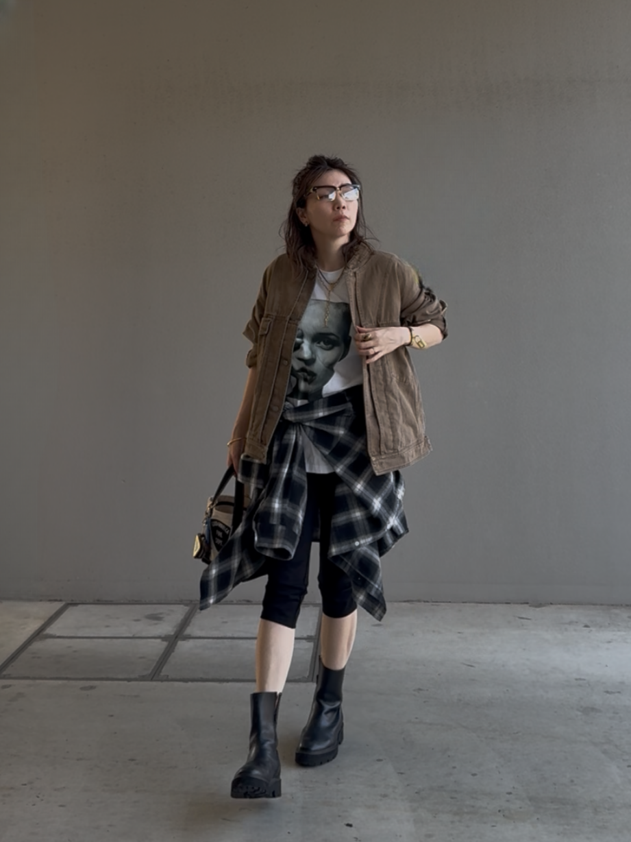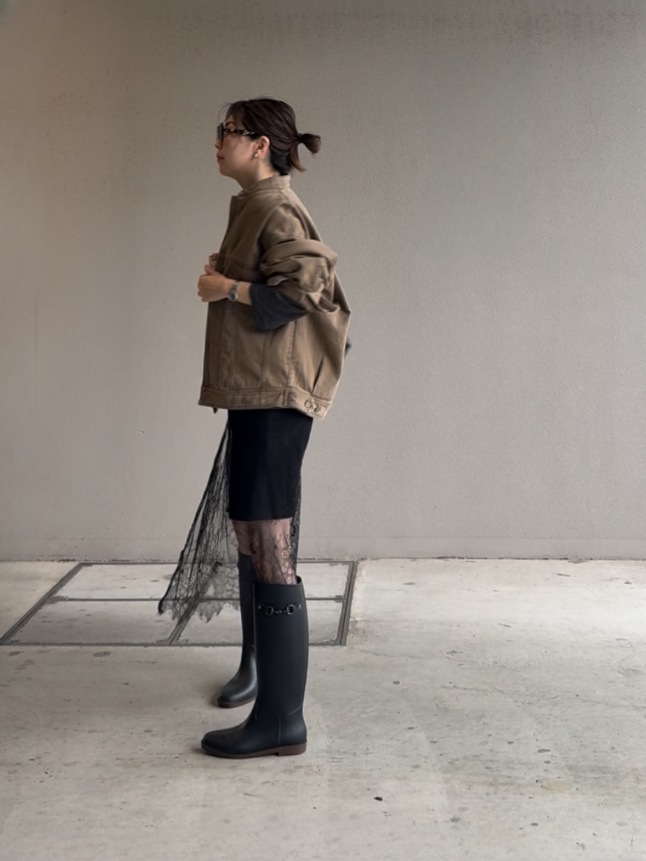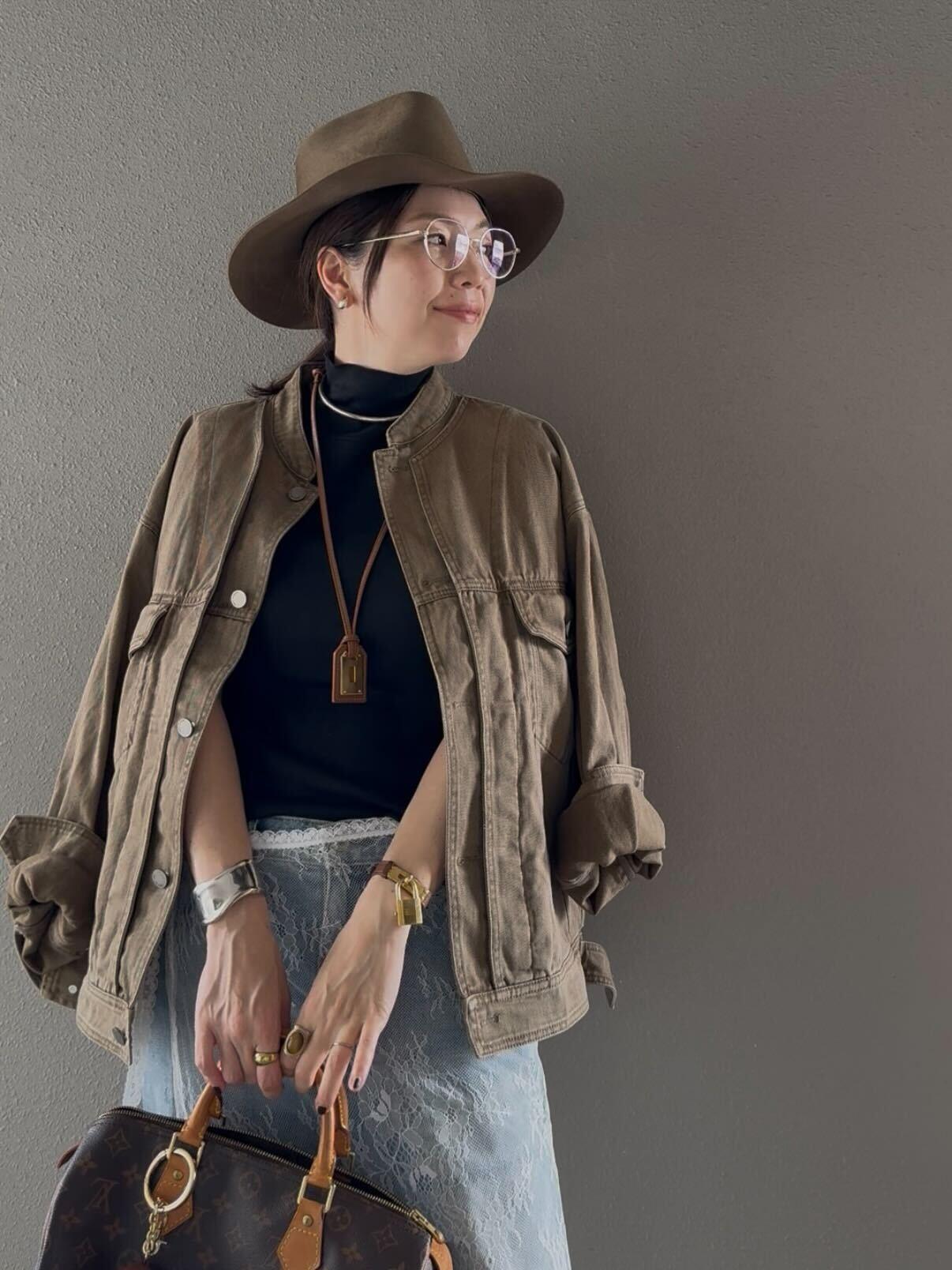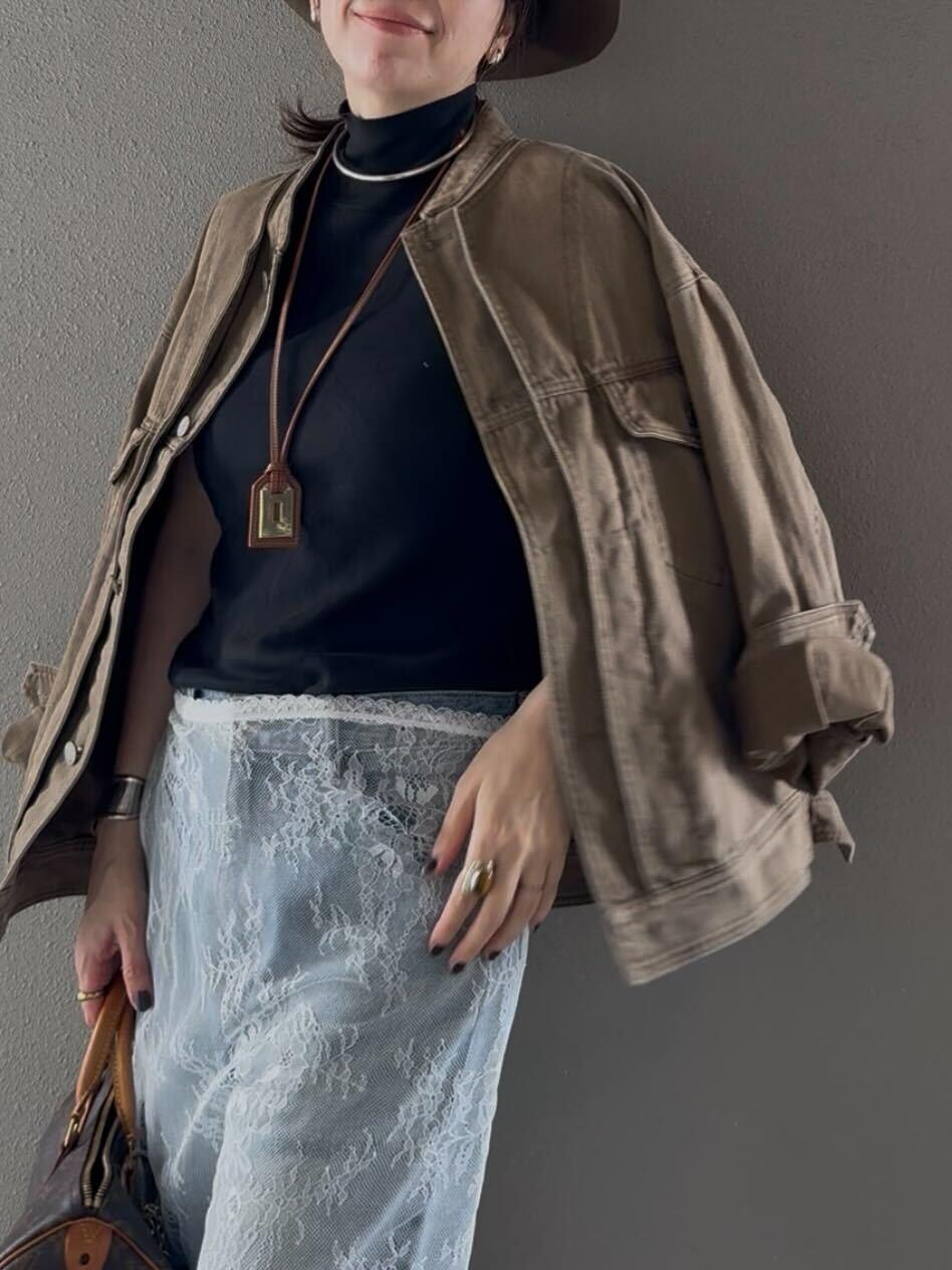 首元をすっきり見せるノーカラーデザインは、ラフなデニムに上品さをプラス。