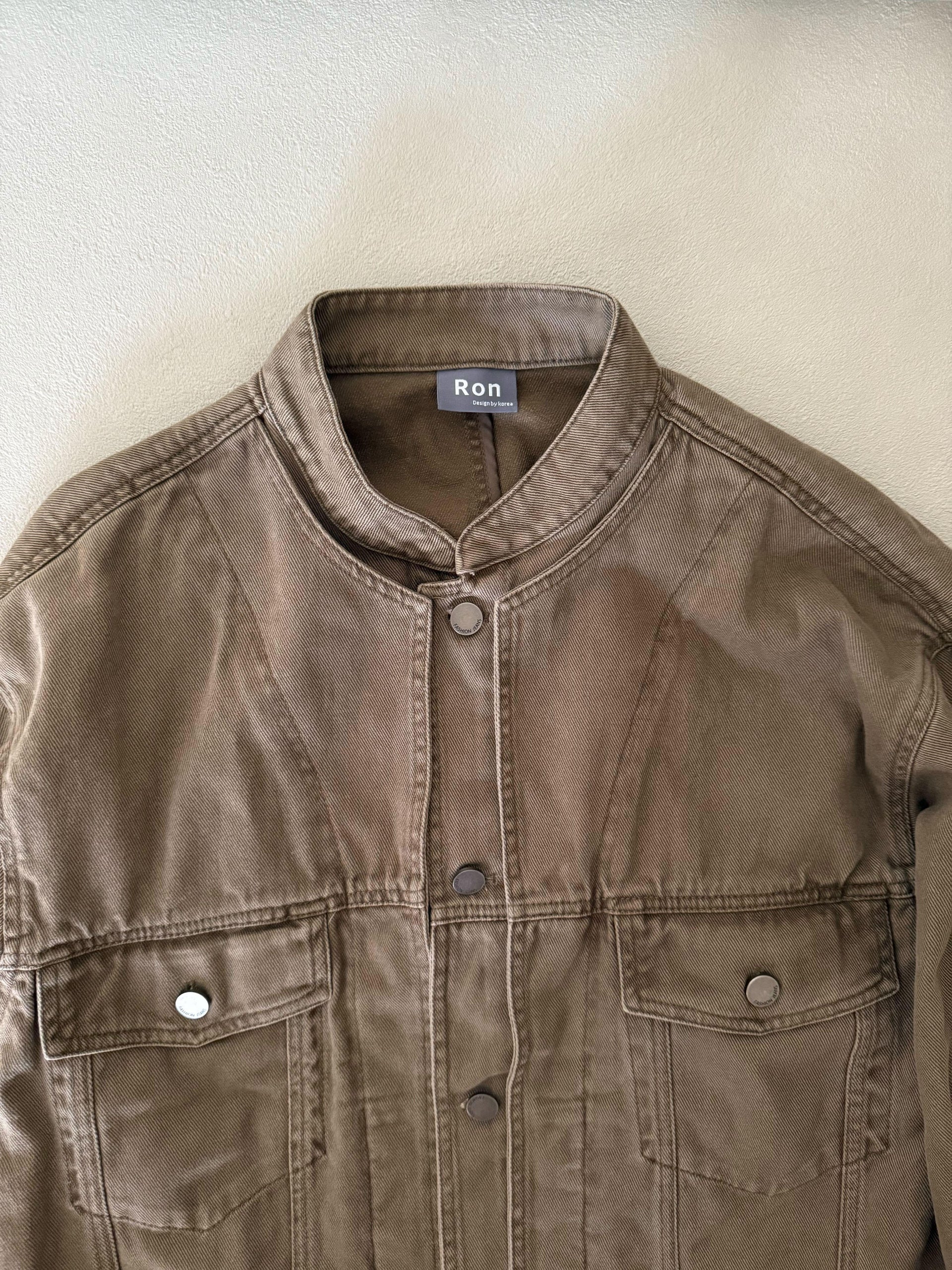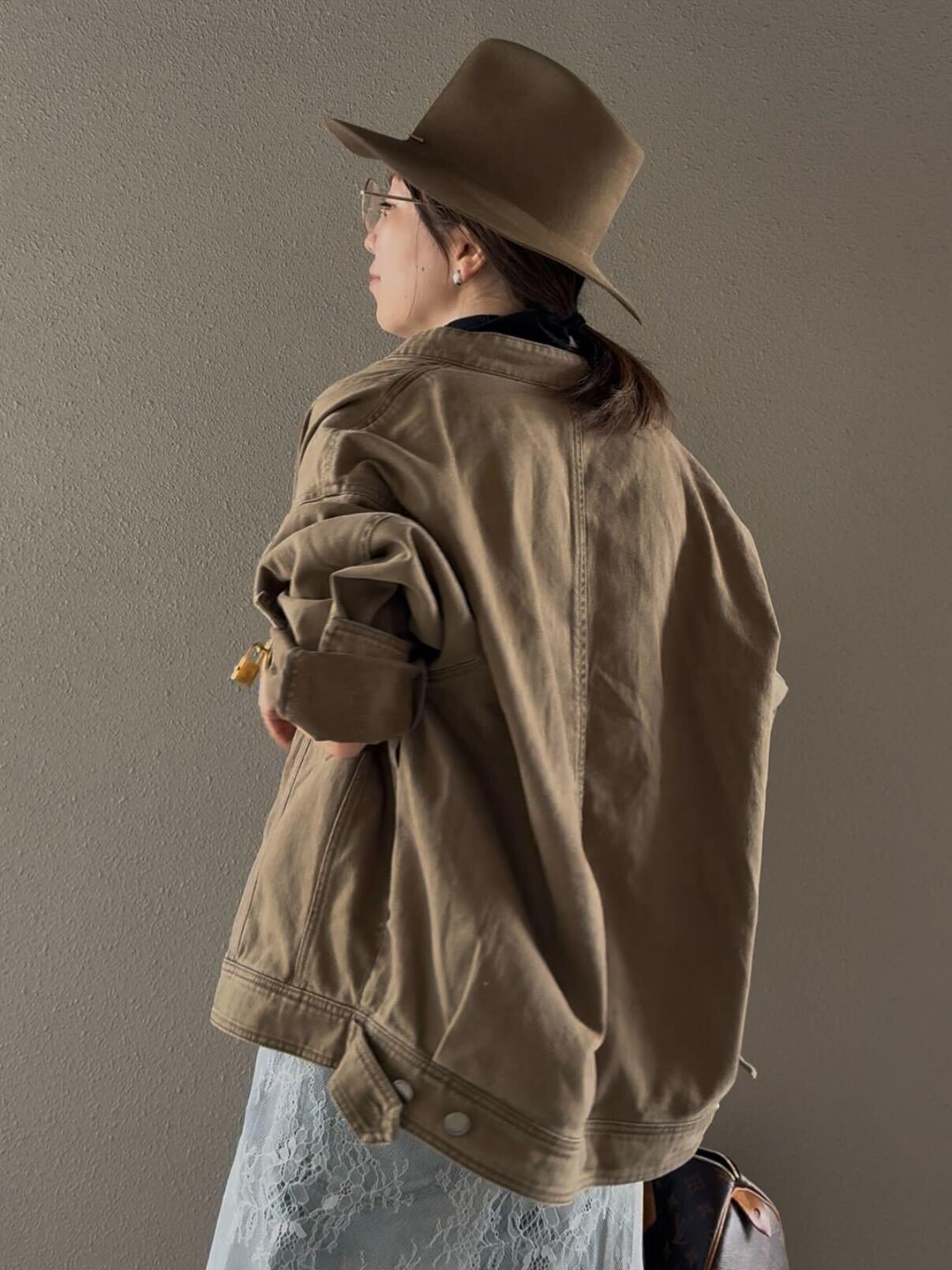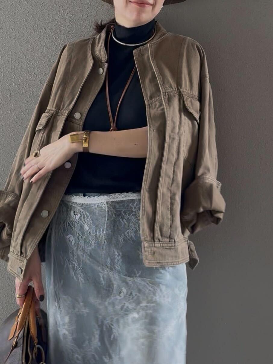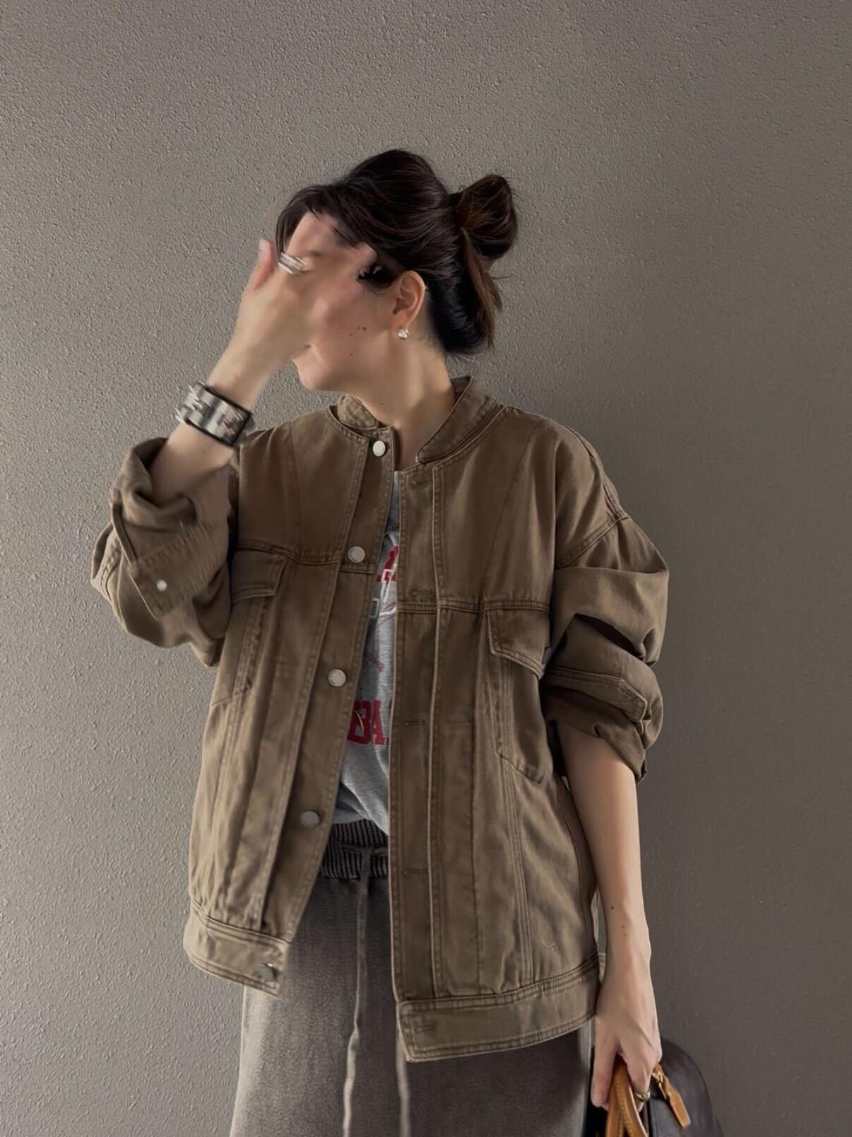 「デニム=ブルー」のイメージを覆す、深キャメルが目を惹くのノーカラーデニムジャケット。